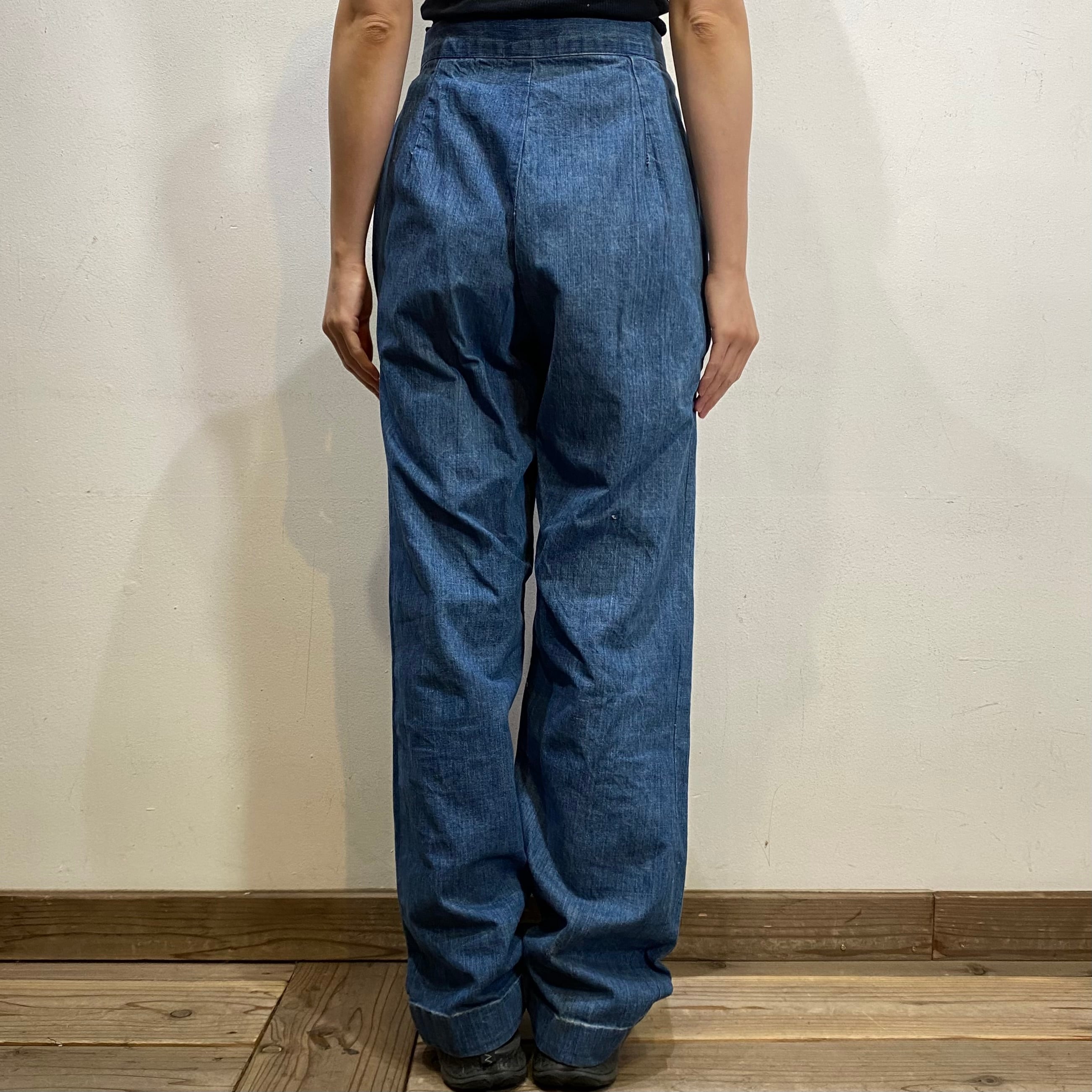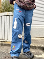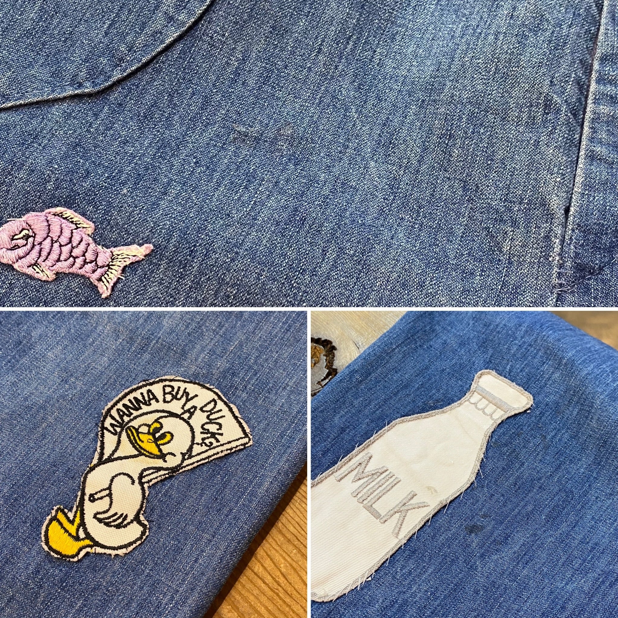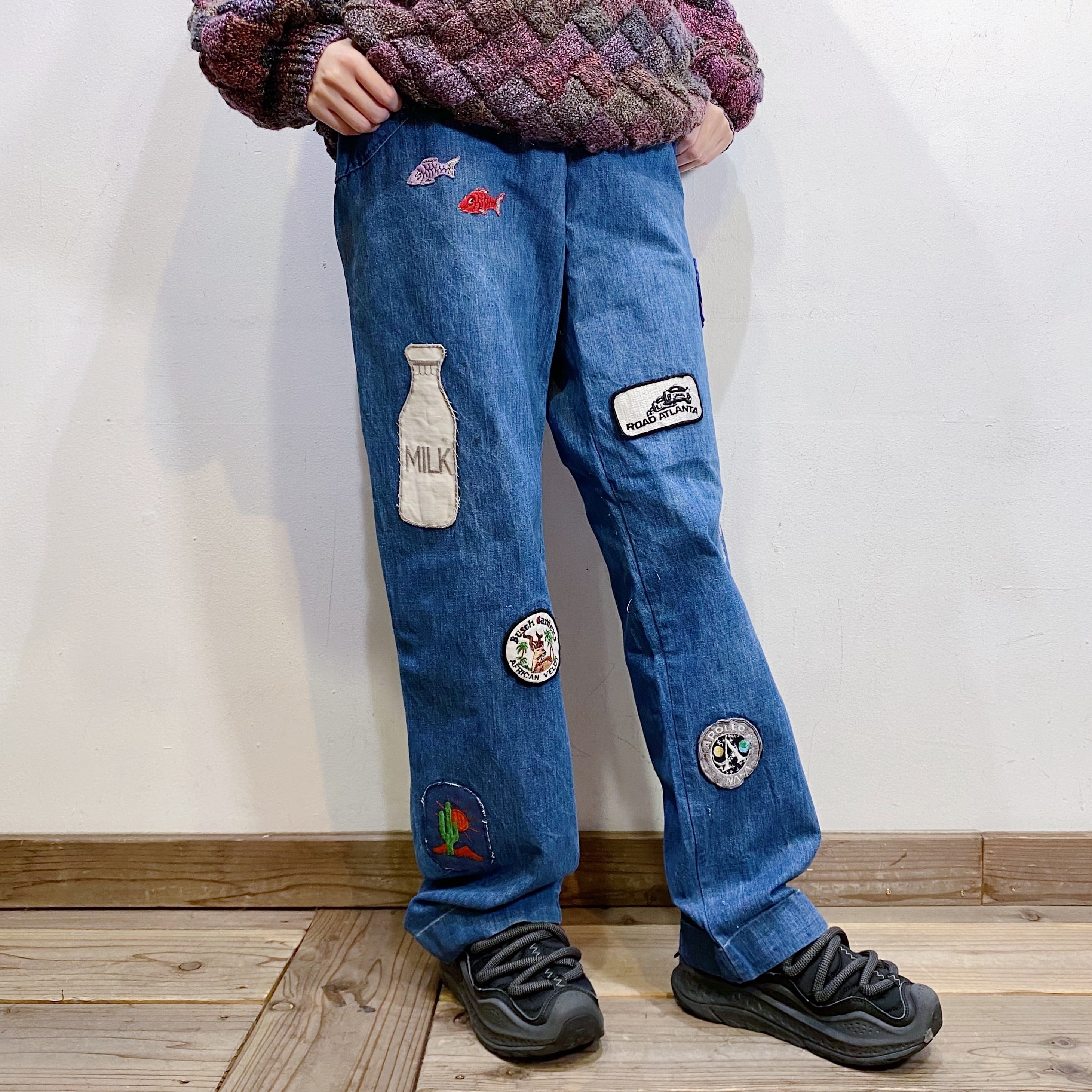魚やミルク瓶、サボテン、アヒルなどのユニークでキュートなワッペンがたくさん付いた、70年代のデニムパンツです。
