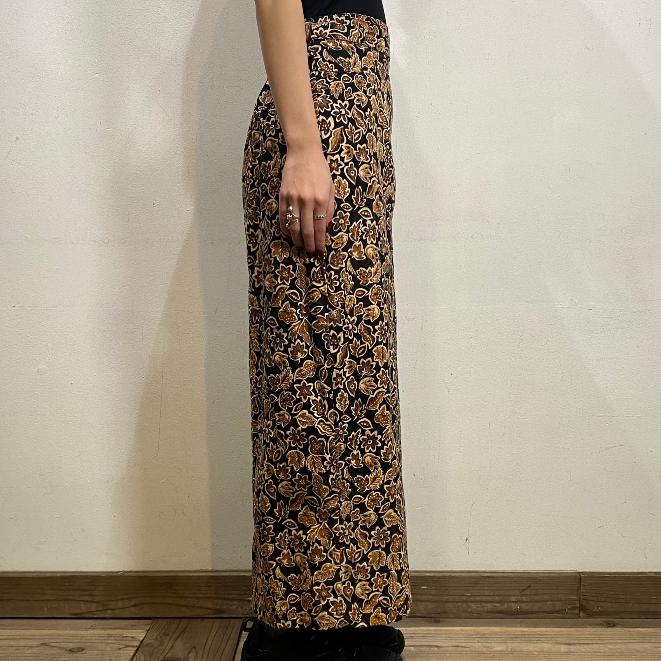 ブラック×ブラウンのボタニカルなテキスタイルが大人可愛い、ロングスカートです。