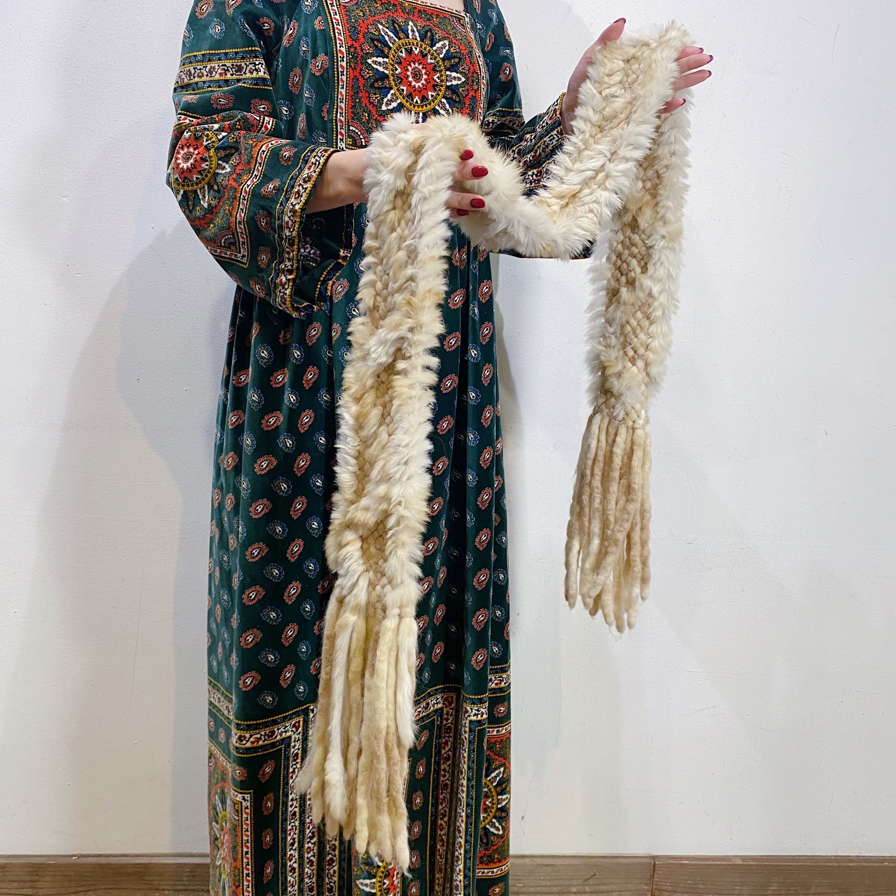こちらは羊毛やアルパカファーでできたような太い毛糸でベースが編まれ、そこからさらにラビットファーのテープを上から編み込んだ、凝ったデザインになっております。