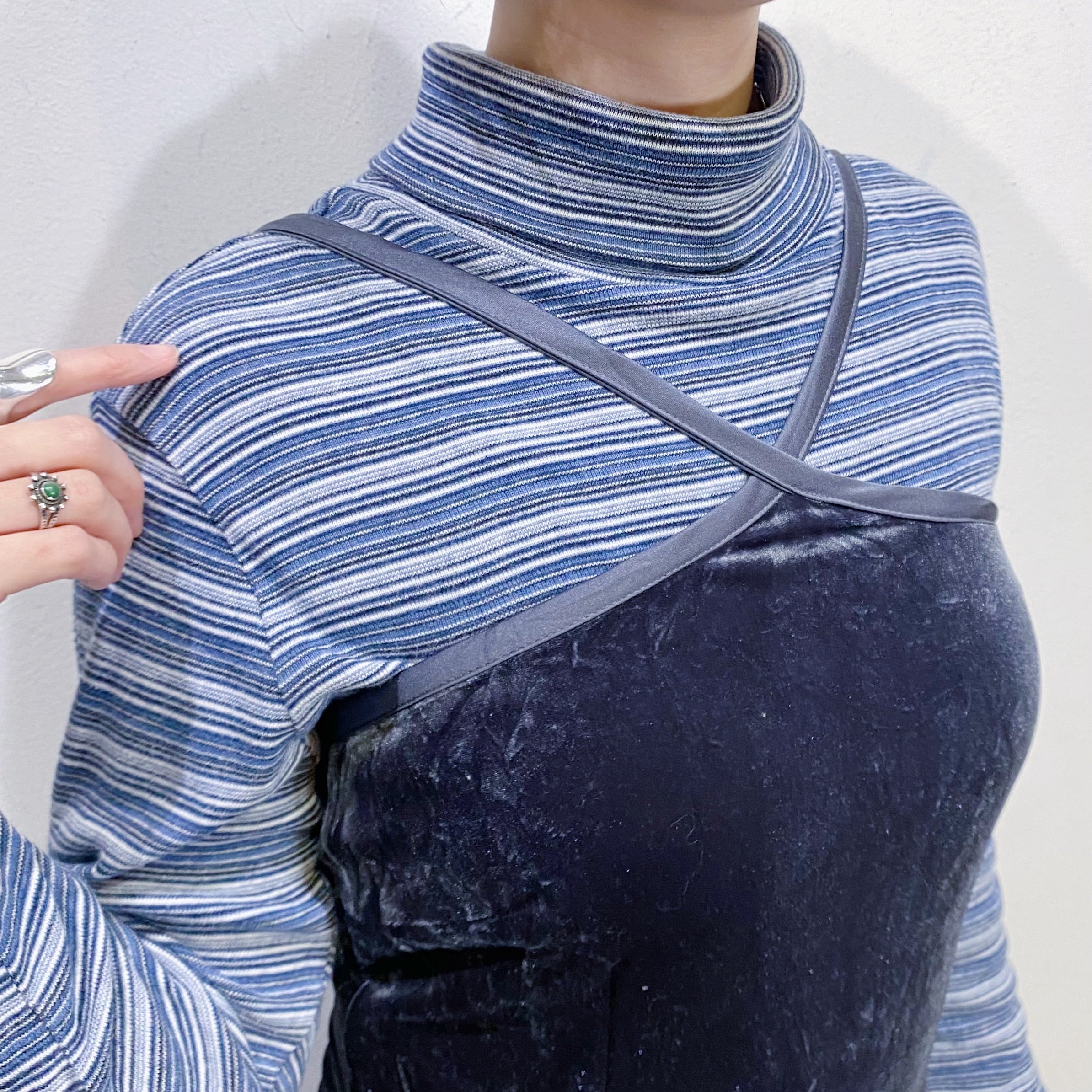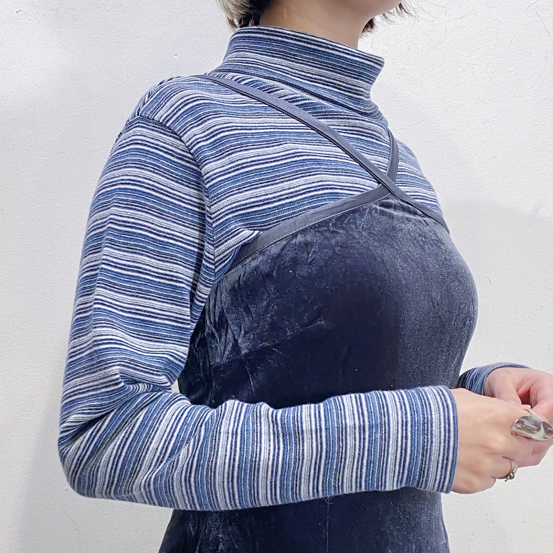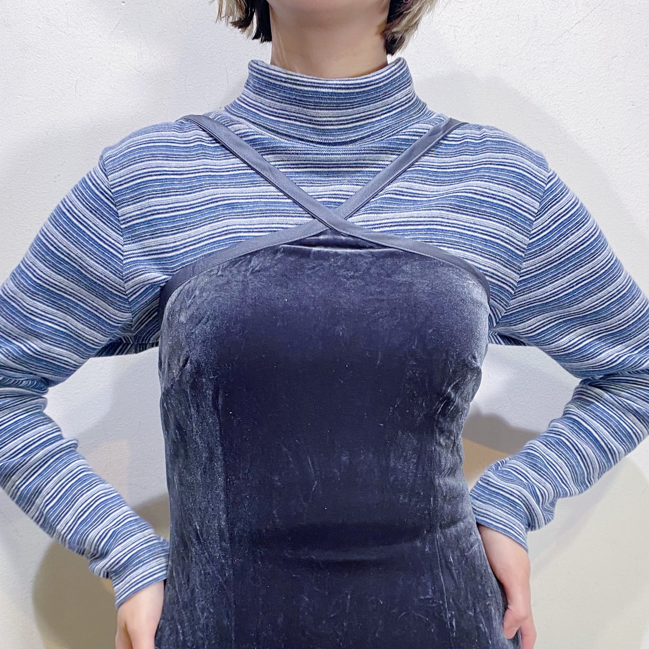 着用写真のようにインナーにハイネックやロンT、ブラウスなどを重ねても、合わせるアイテム次第で印象を変えて楽しめますよ。