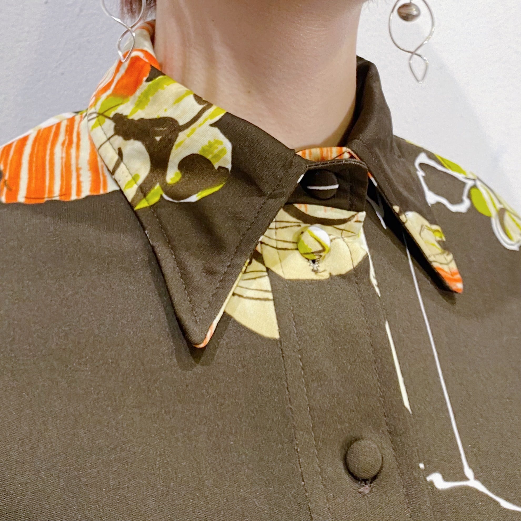 大人っぽい色柄とシルエットが魅力の、70年代シャツワンピースです。