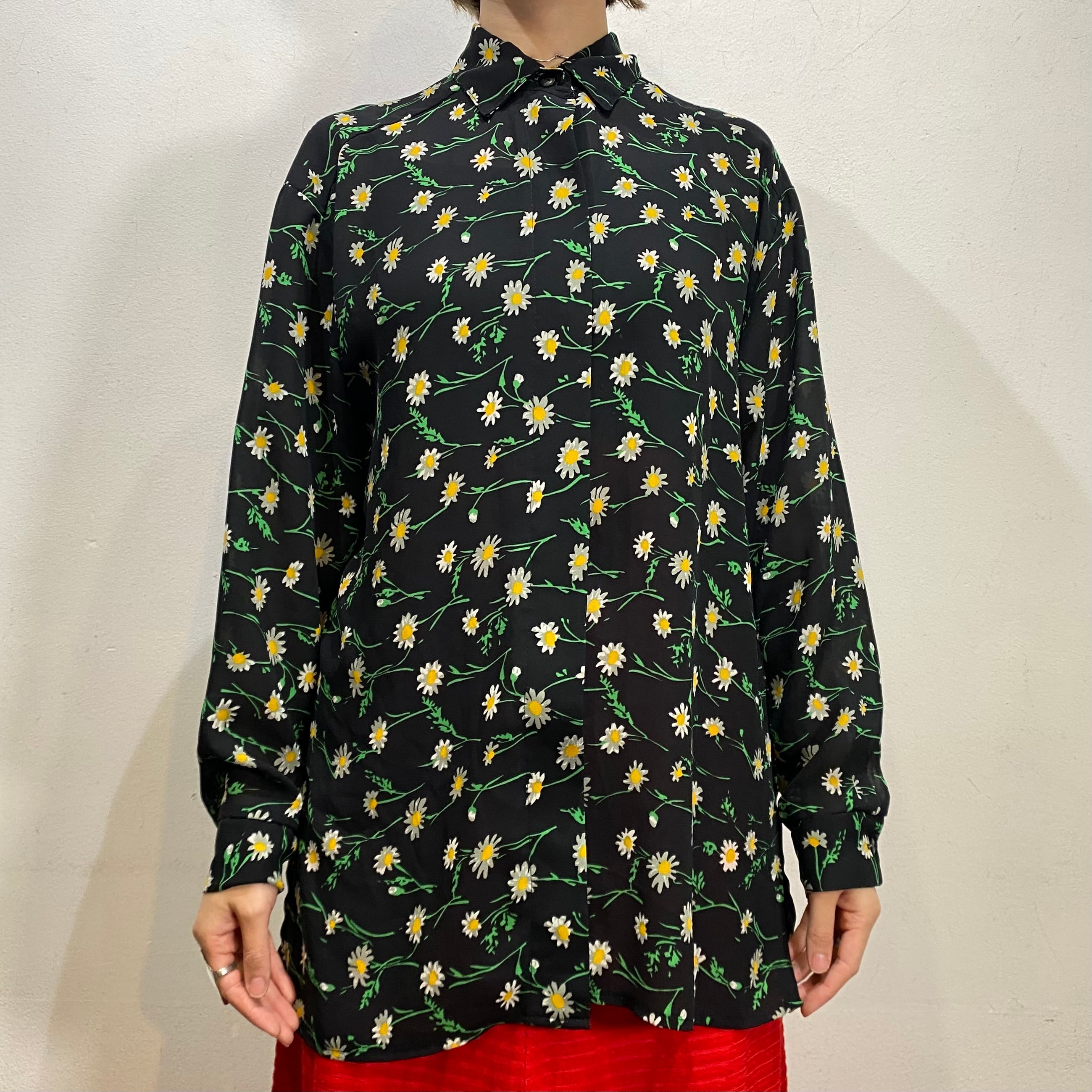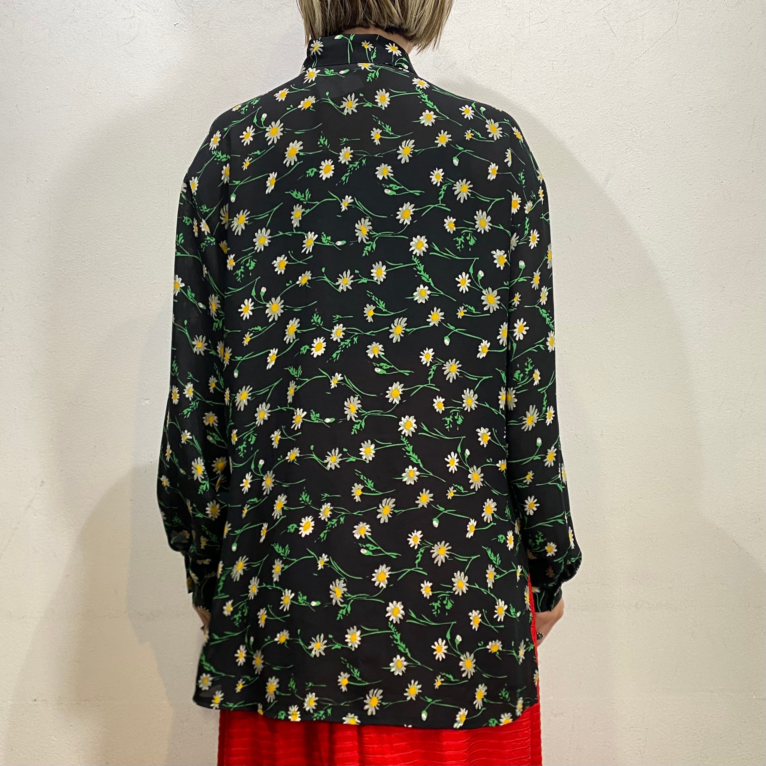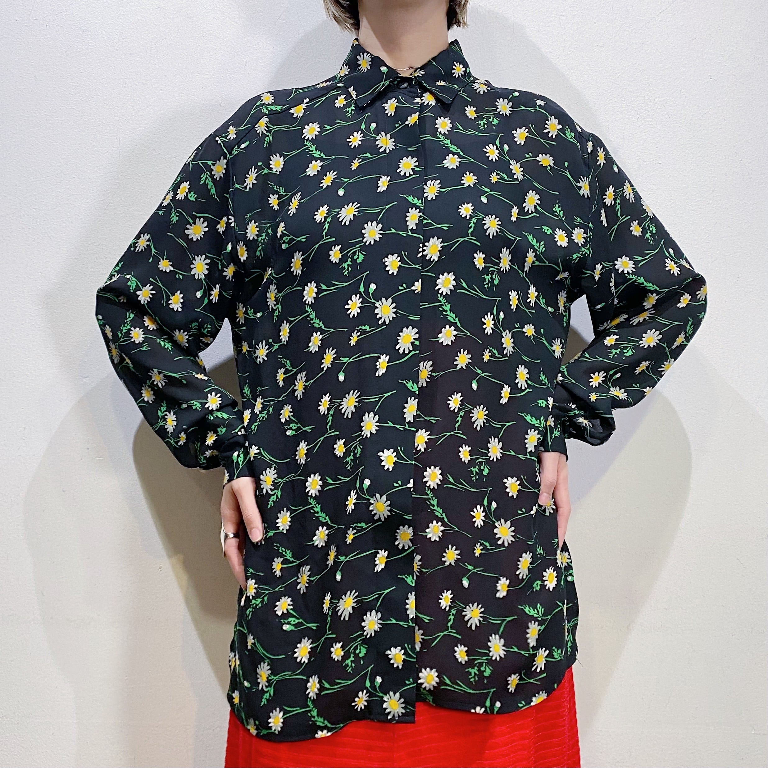 80s black daisy printed sheer shirt【716】