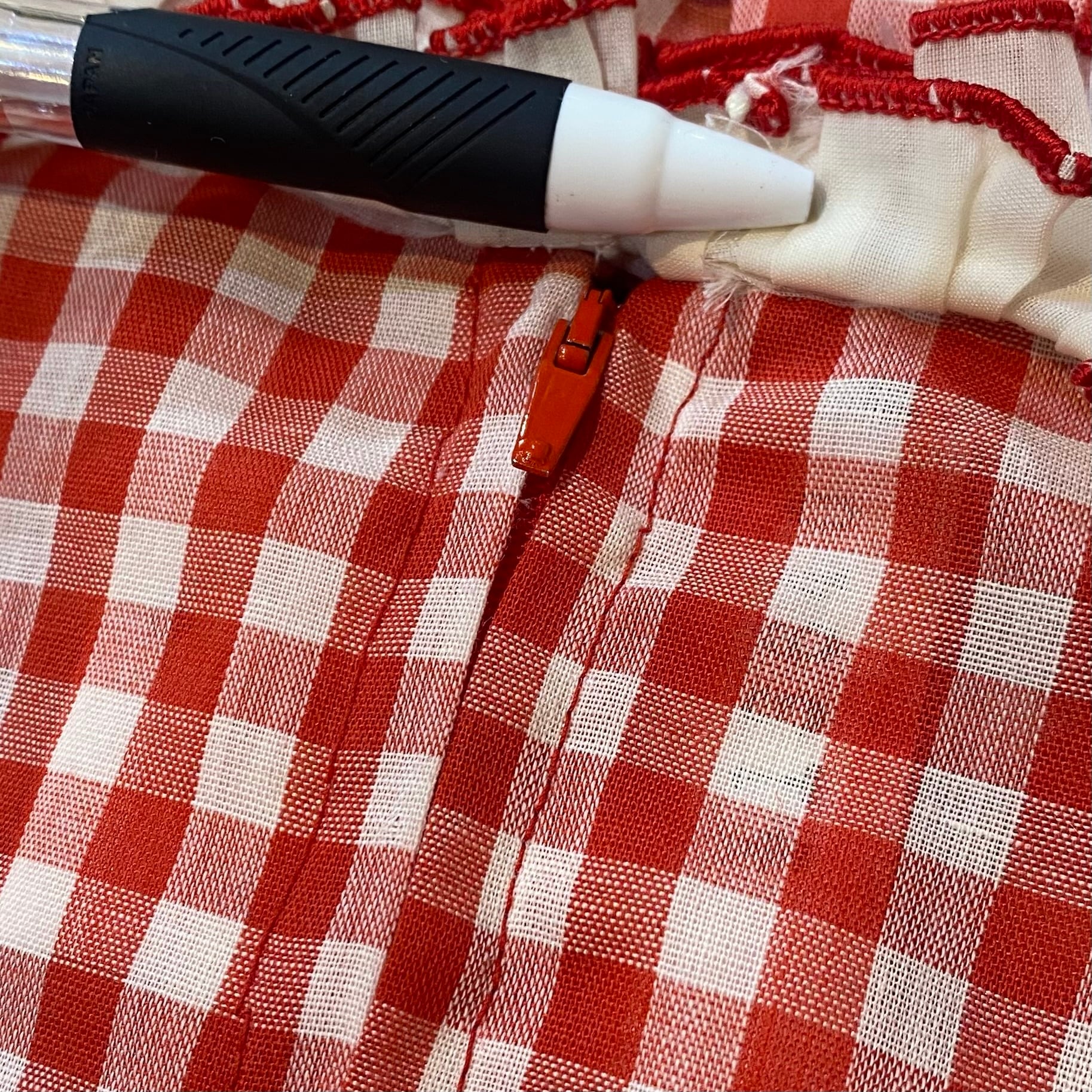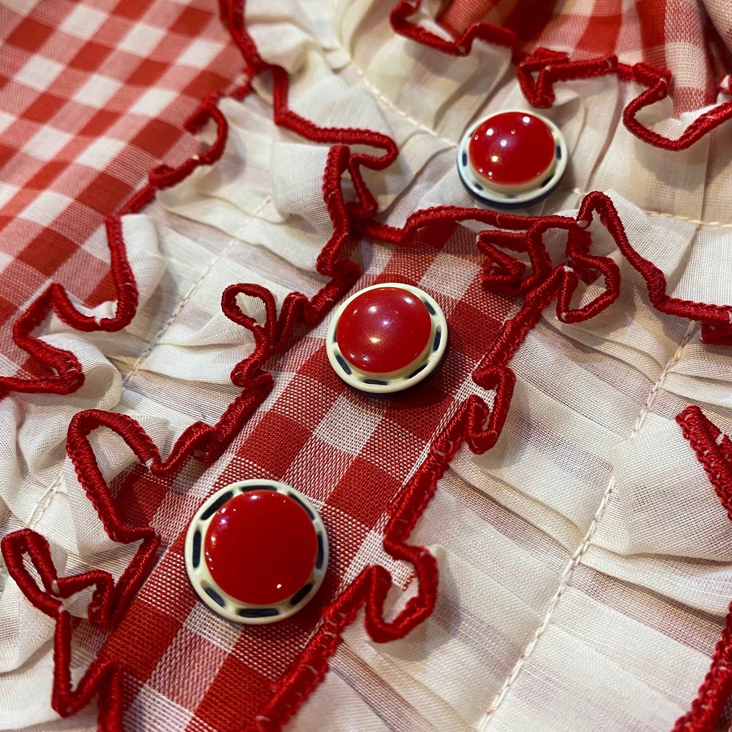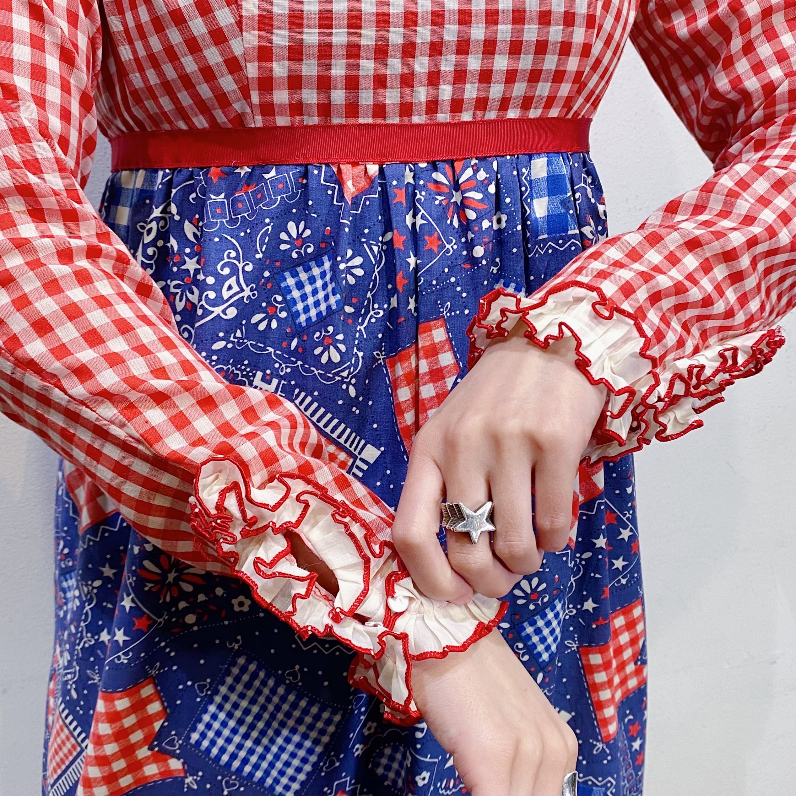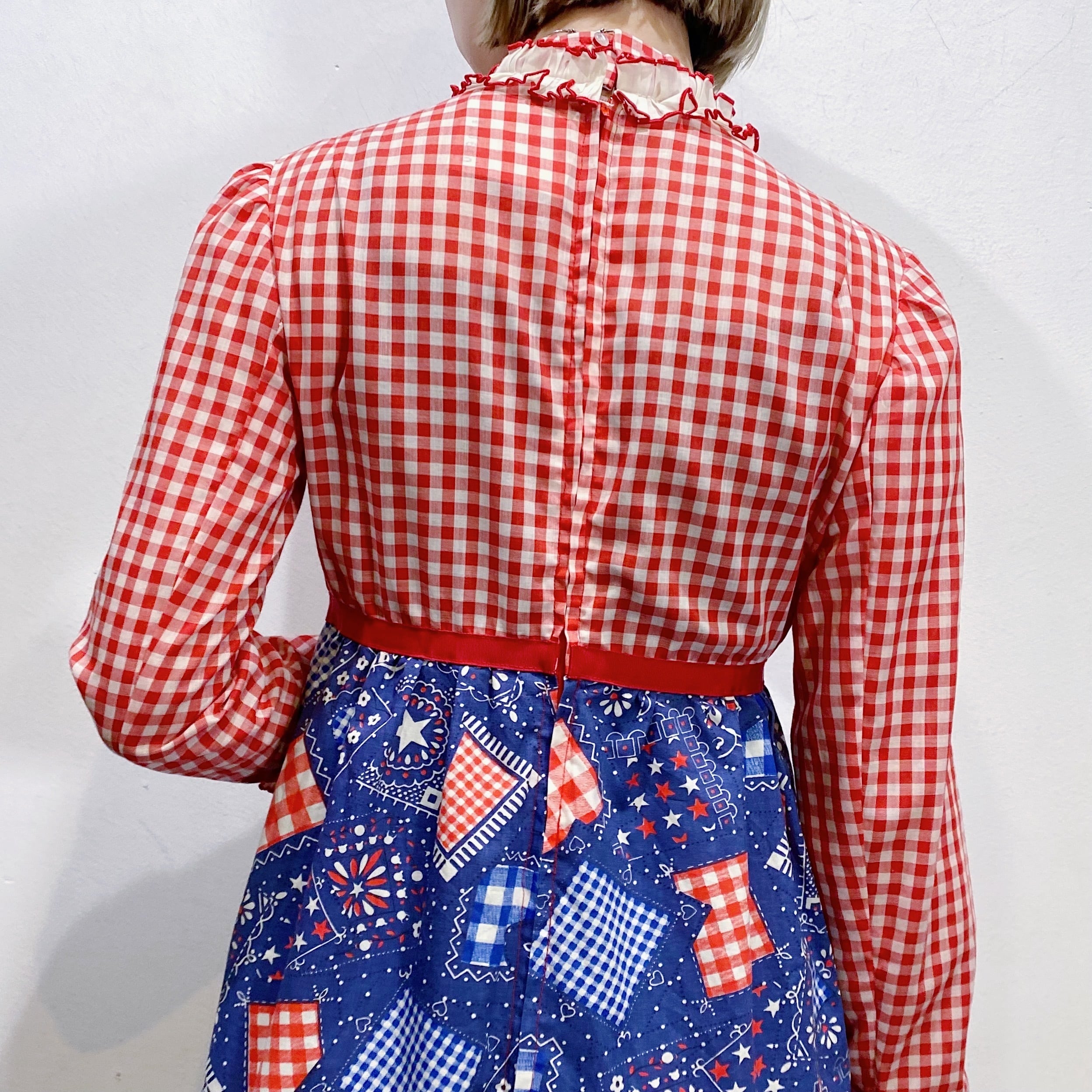 ギンガムチェックとバンダナ柄の切り替えが可愛い、70年代のワンピースです。