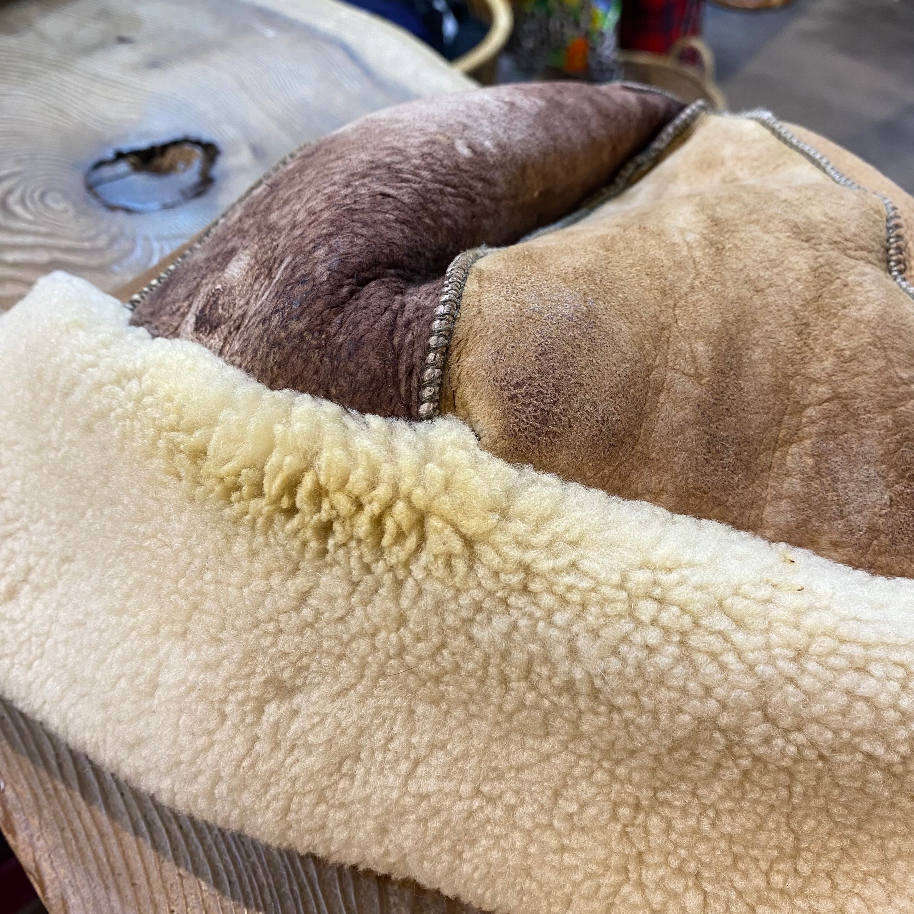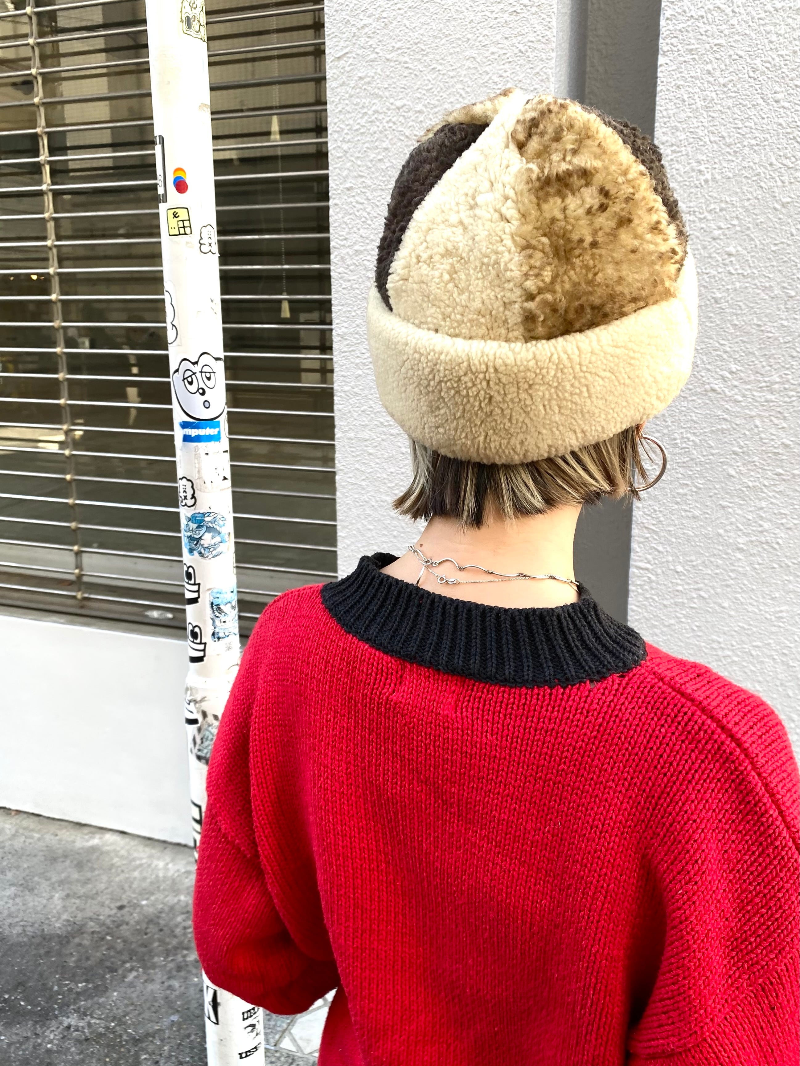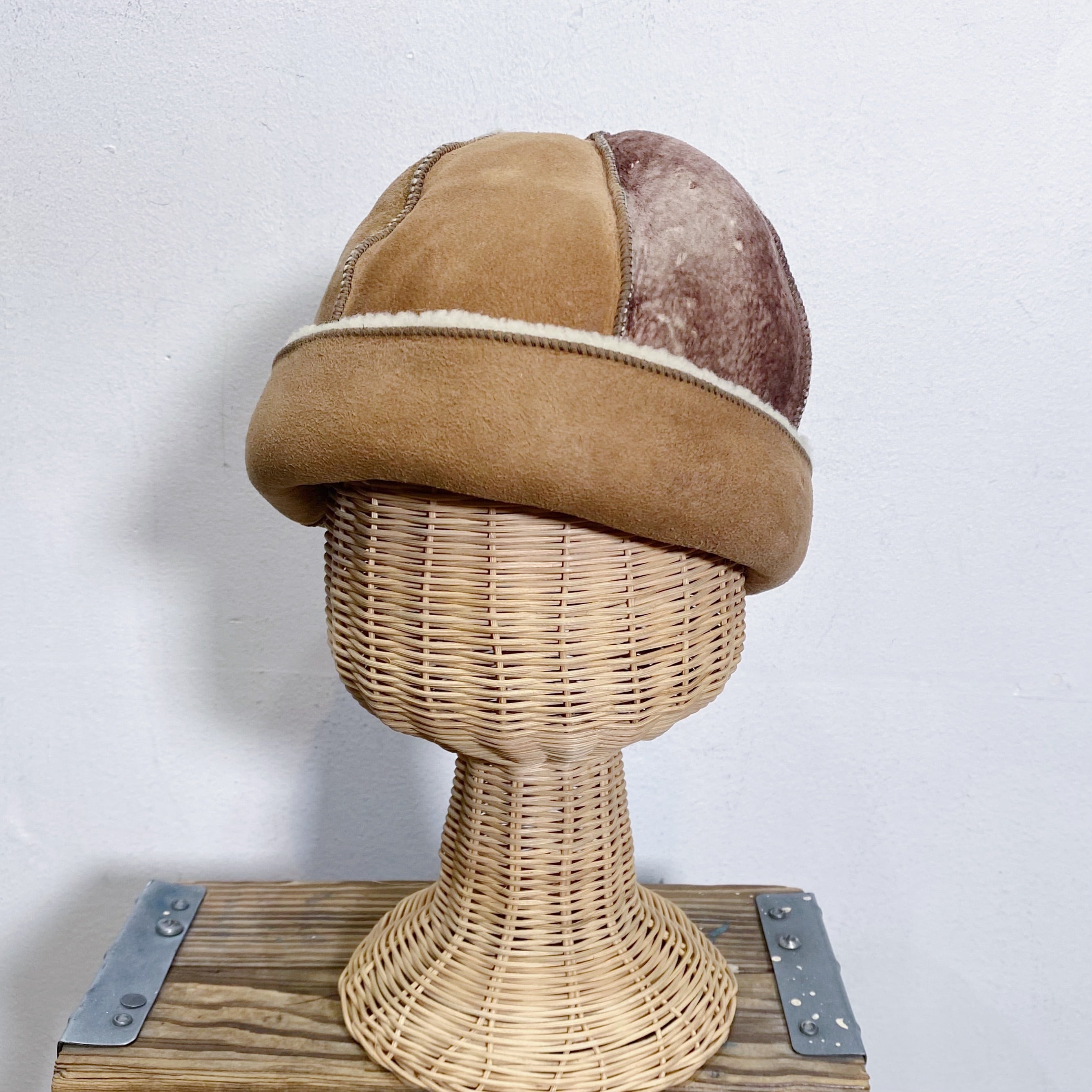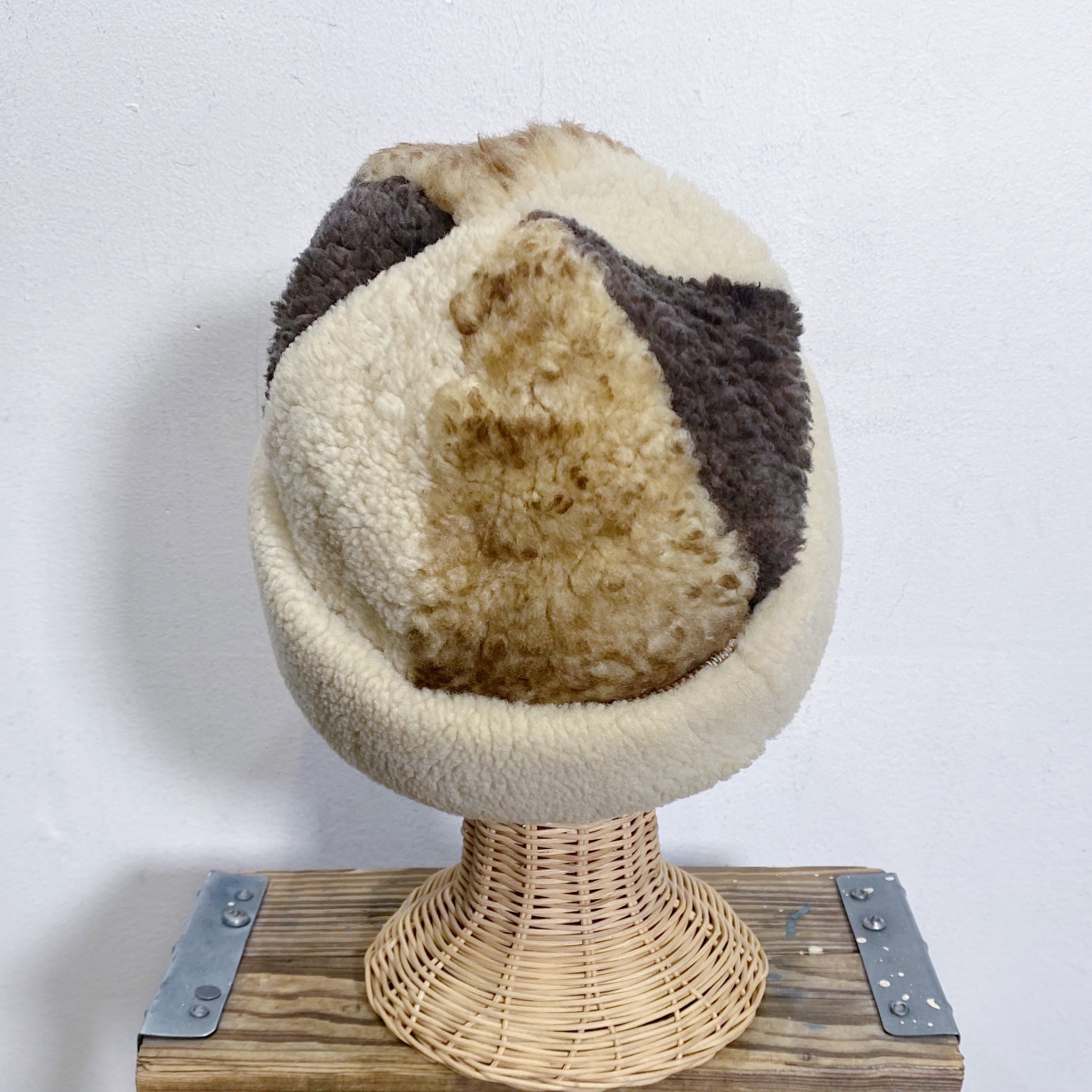 異なった色のムートンを繋ぎ合わせ作られた、70年代の帽子です。