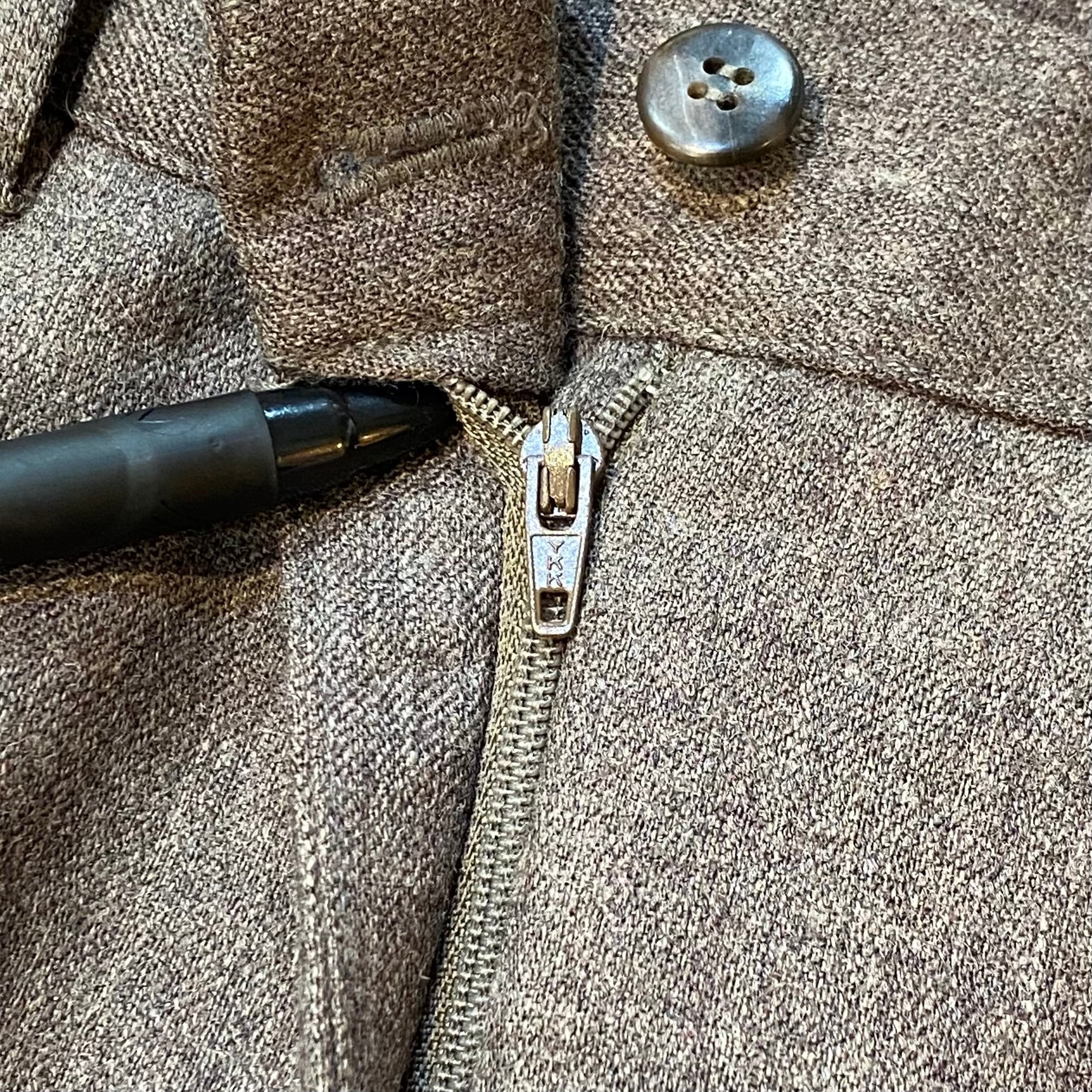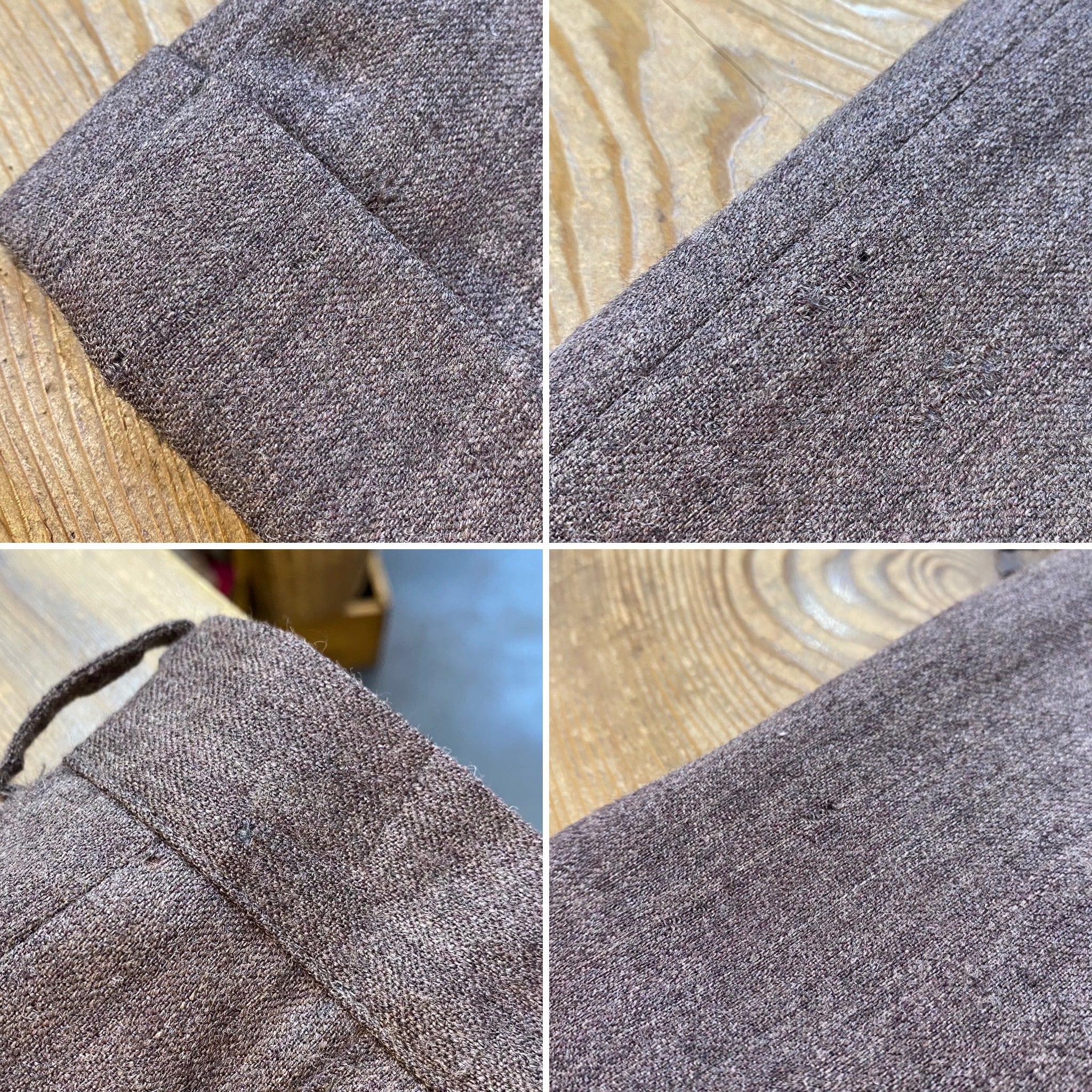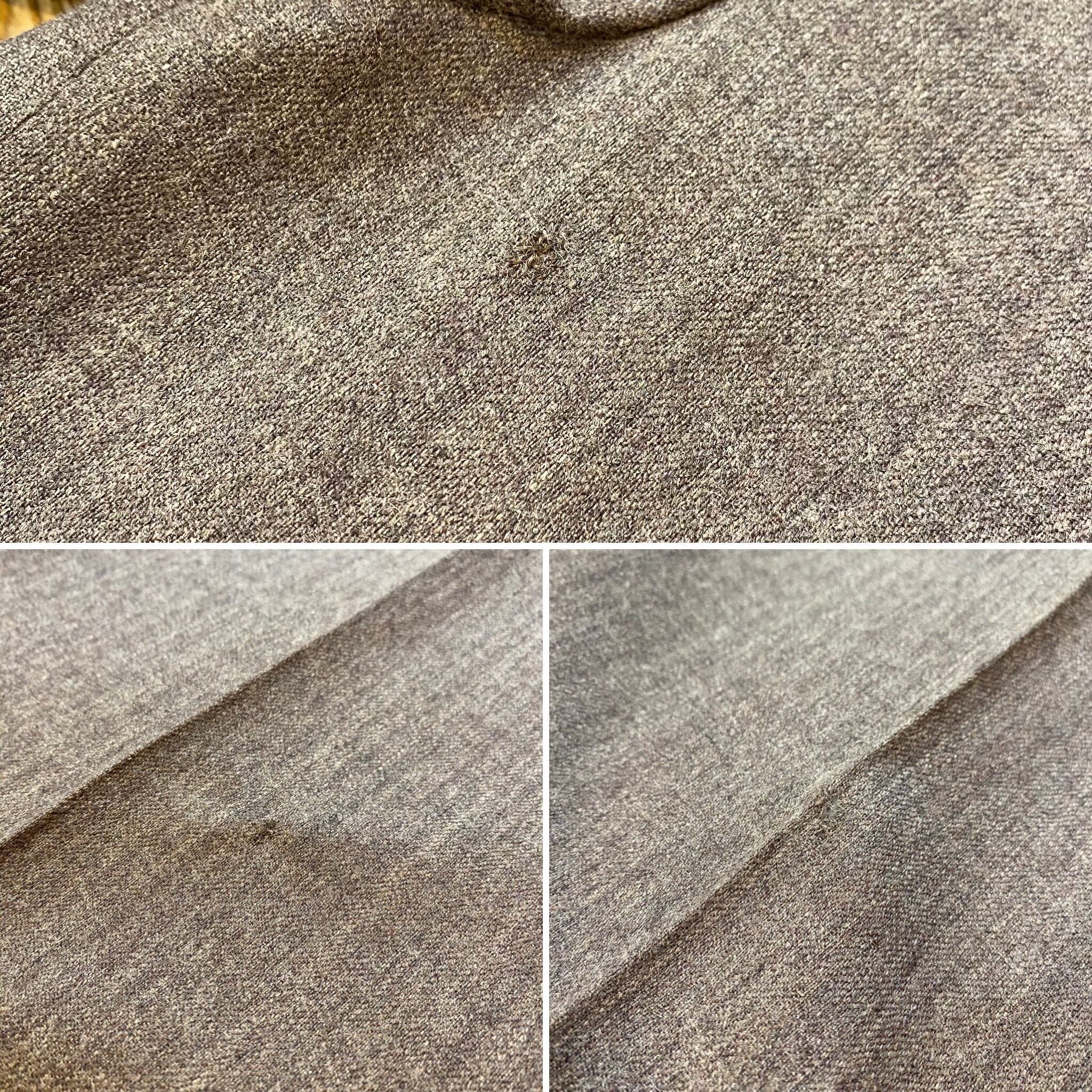ペン先ほどの小さな穴や軽度のキズ、ダメージを裏から接着芯で塞いだ跡、お直し跡が見受けられます。