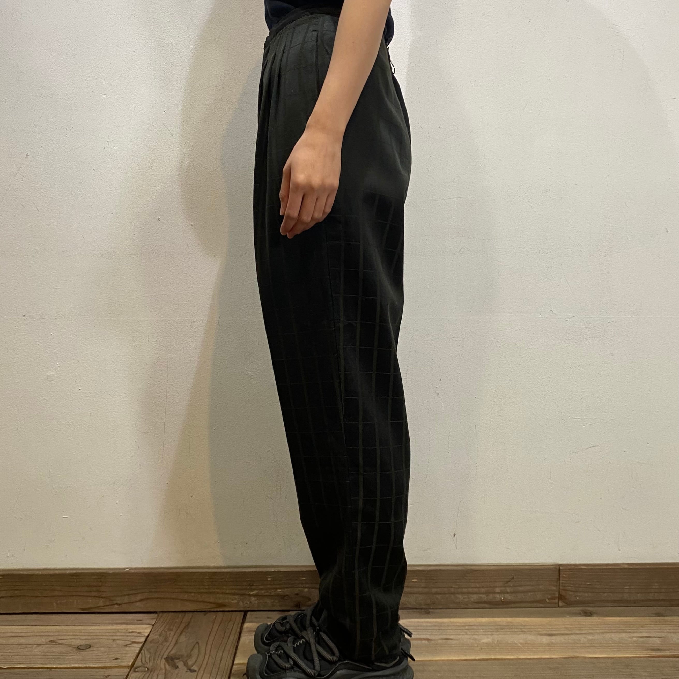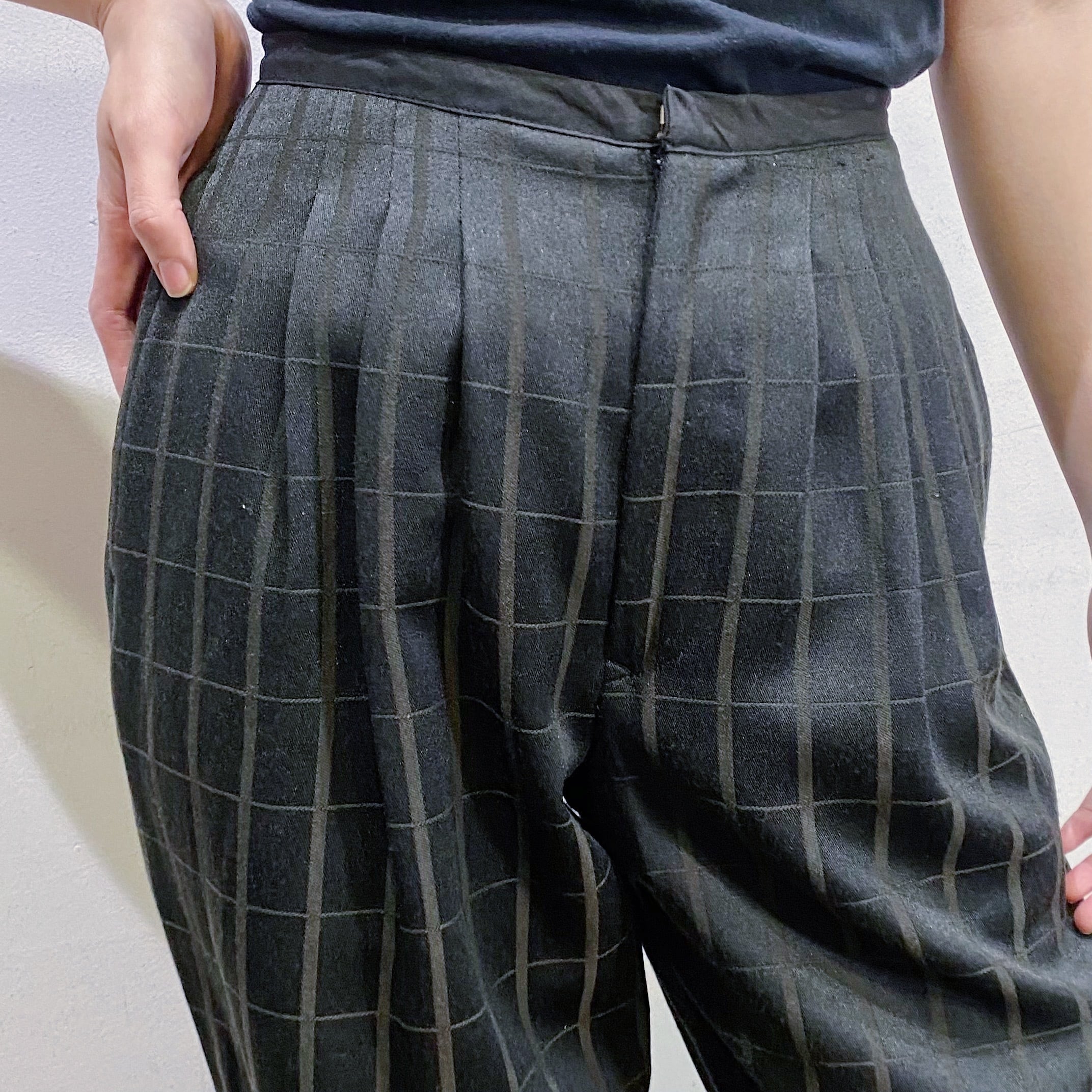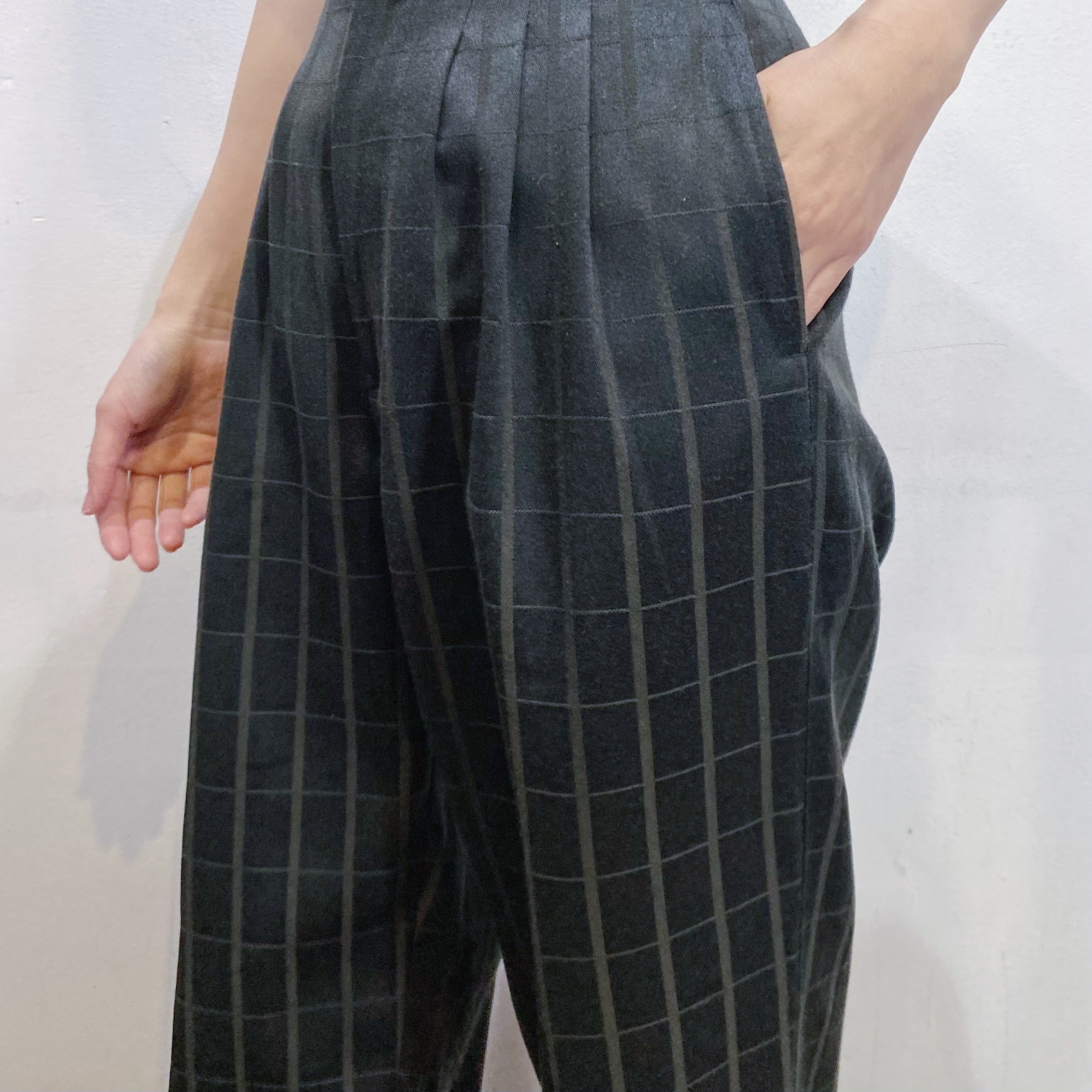 モノトーンカラーのチェックで着こなしやすい、スラックスパンツです。