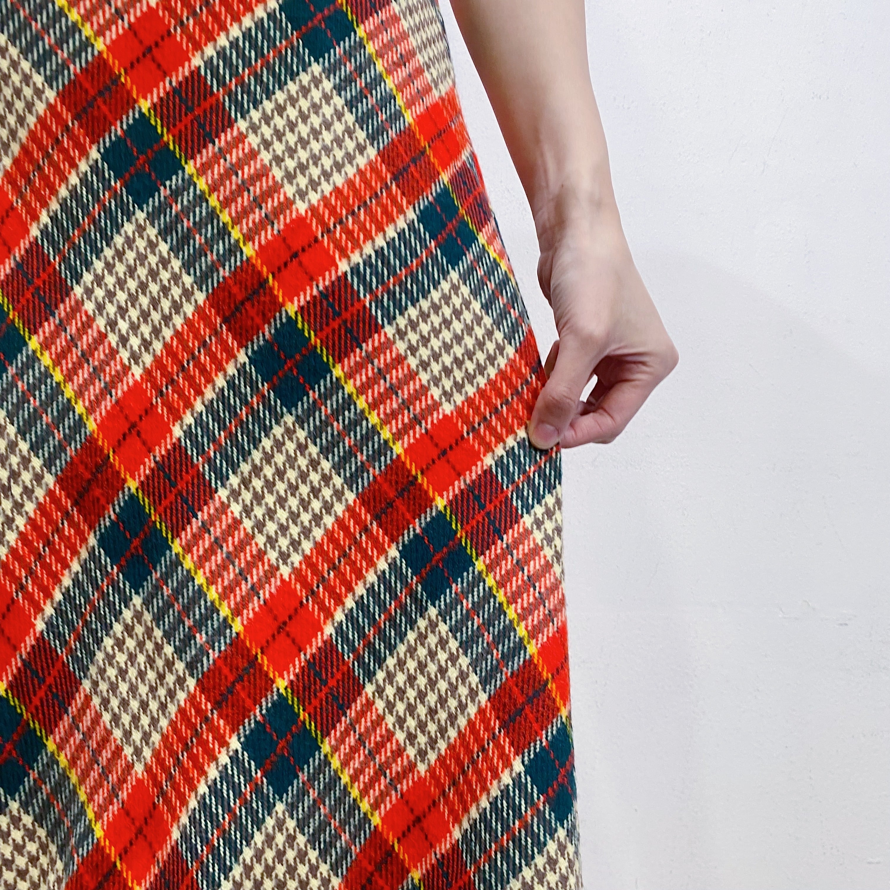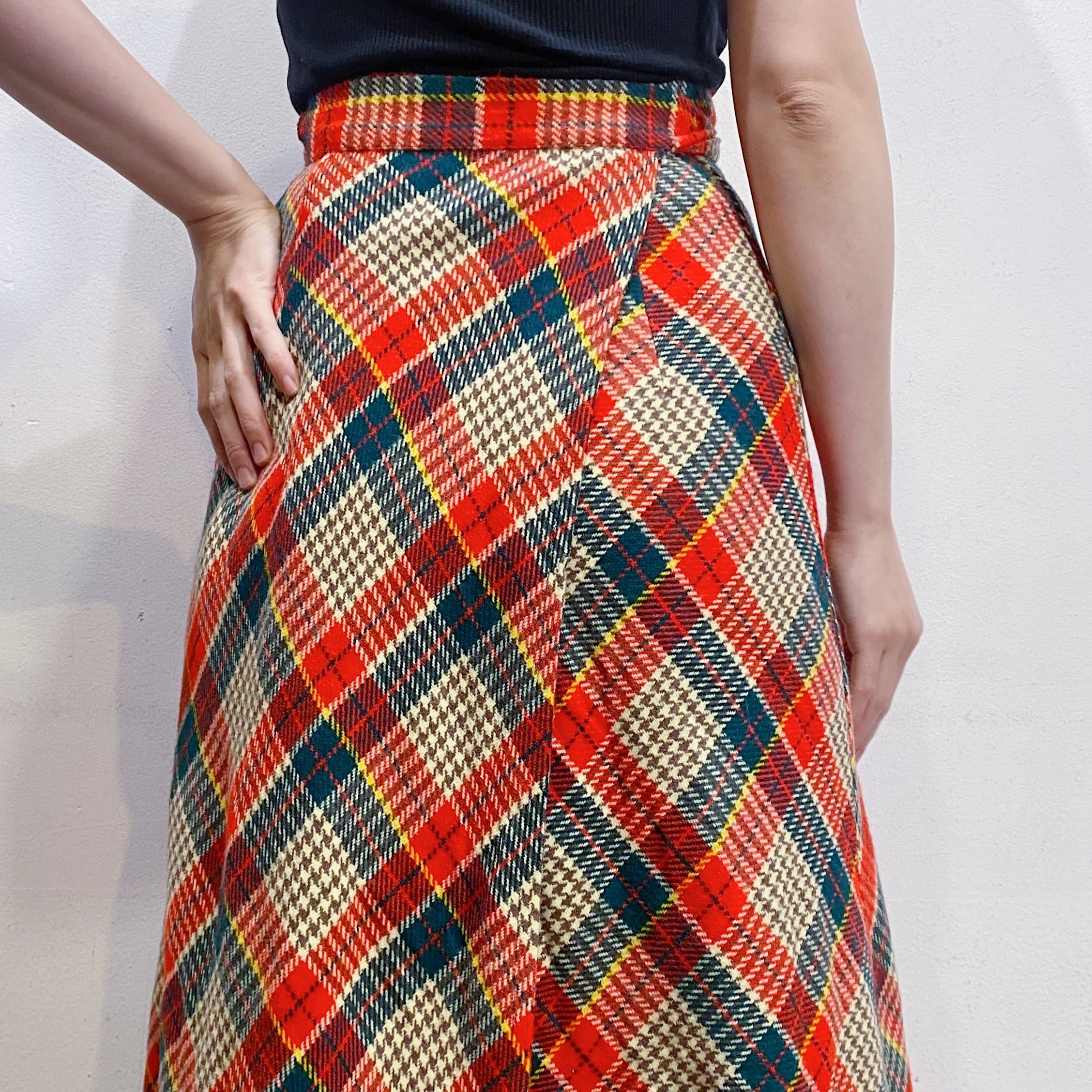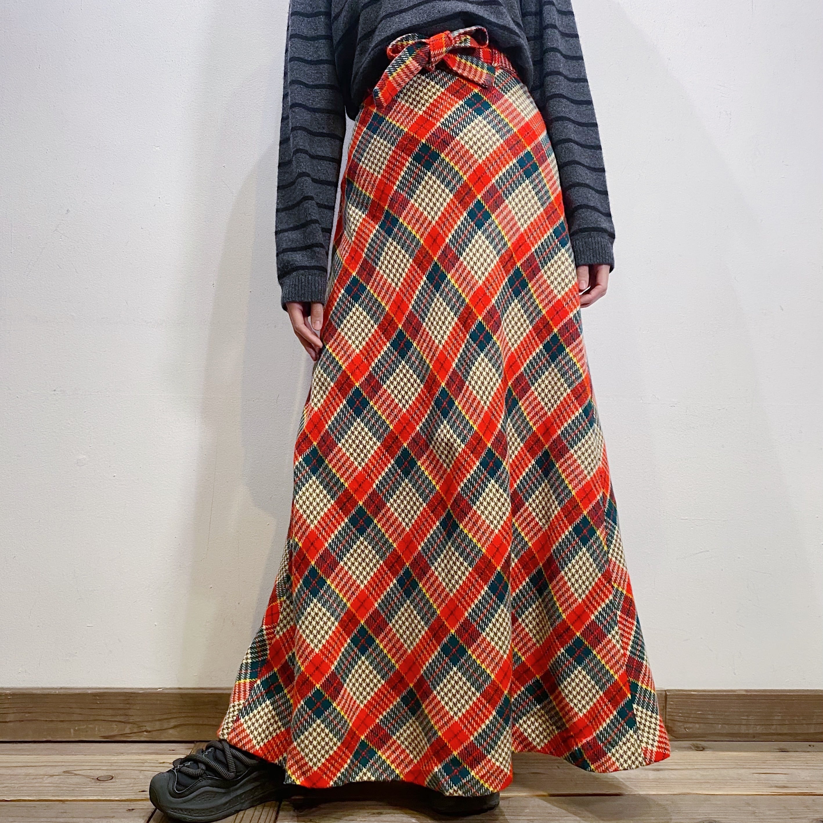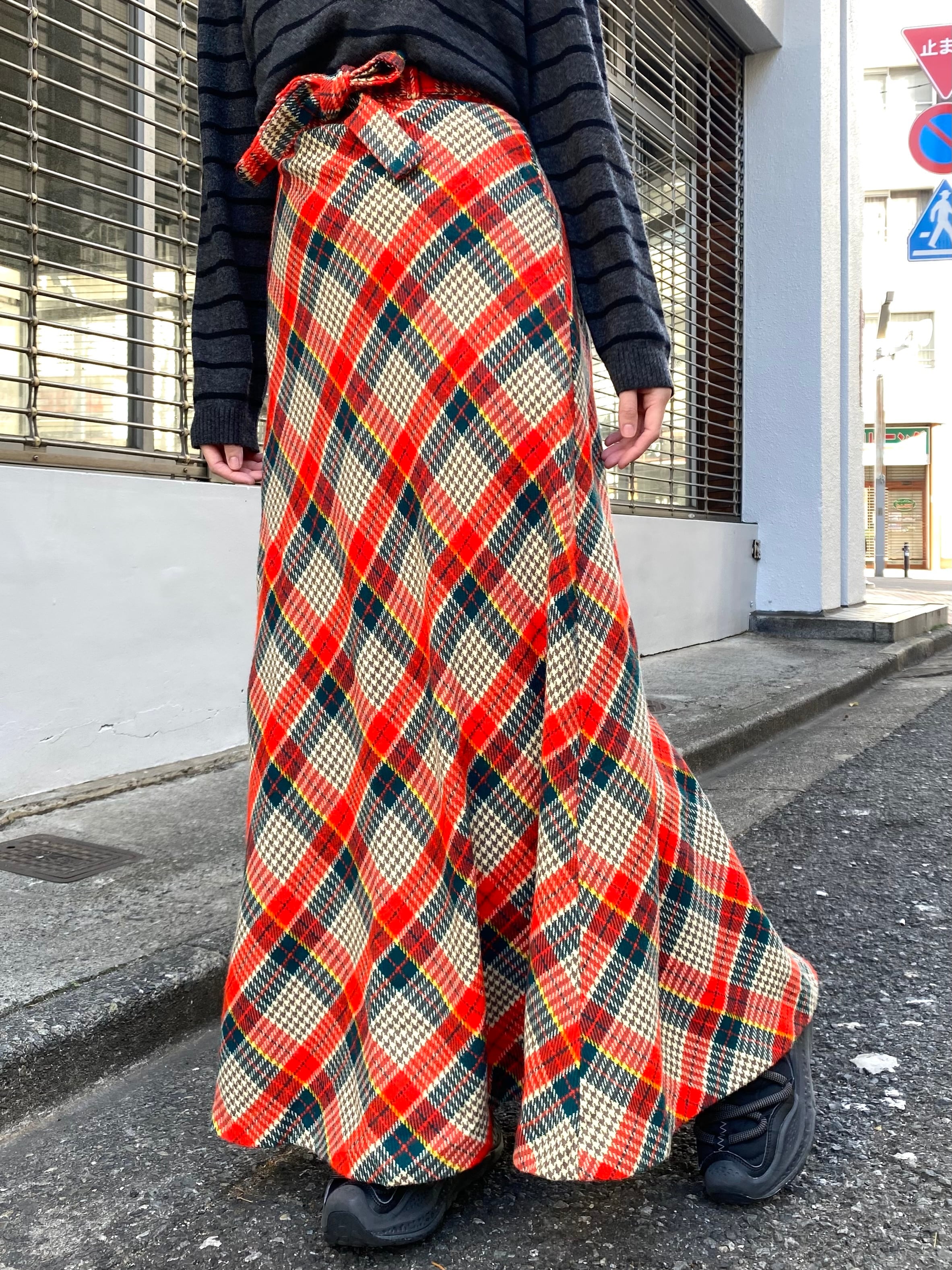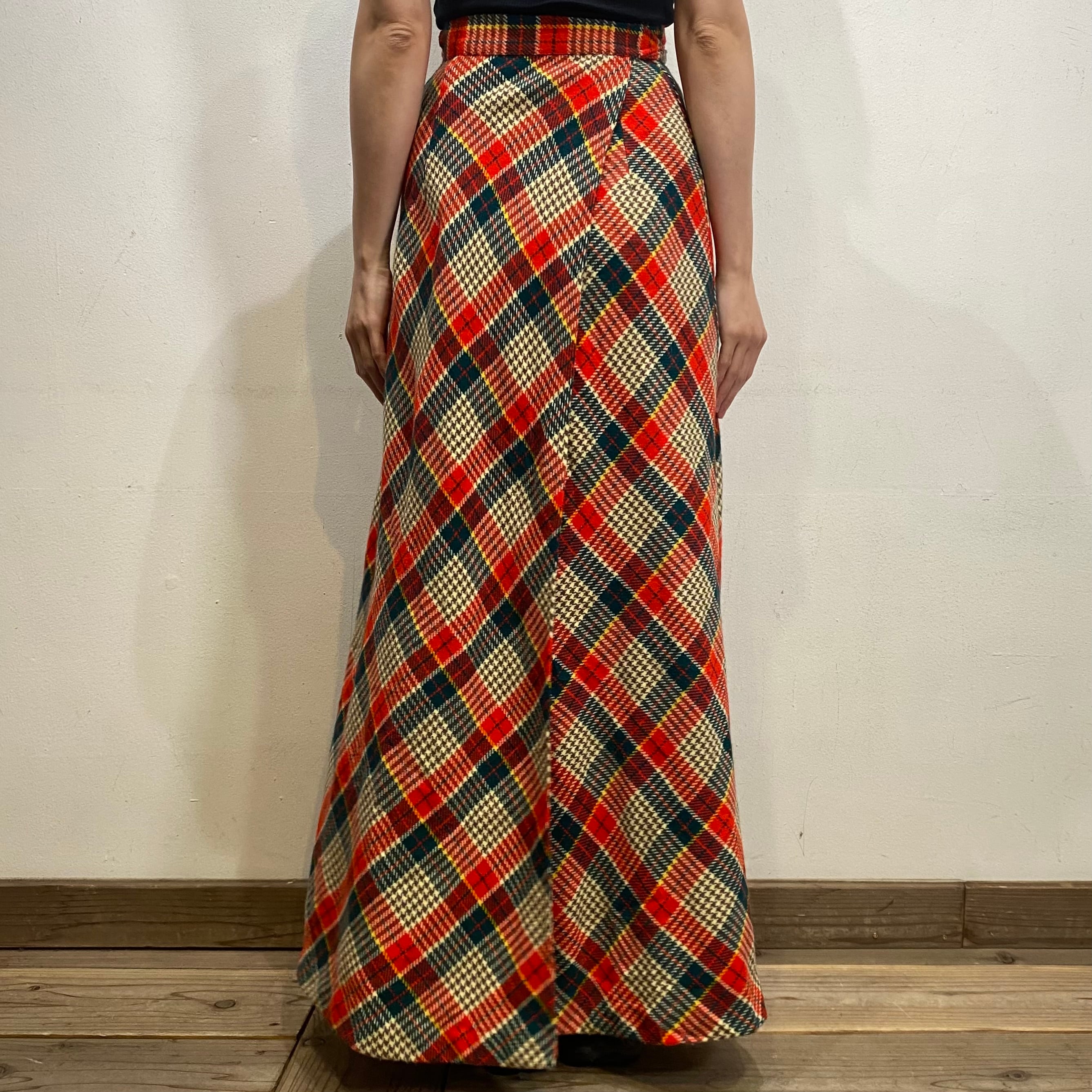 70s wool plaid long wrap skirt【1176】