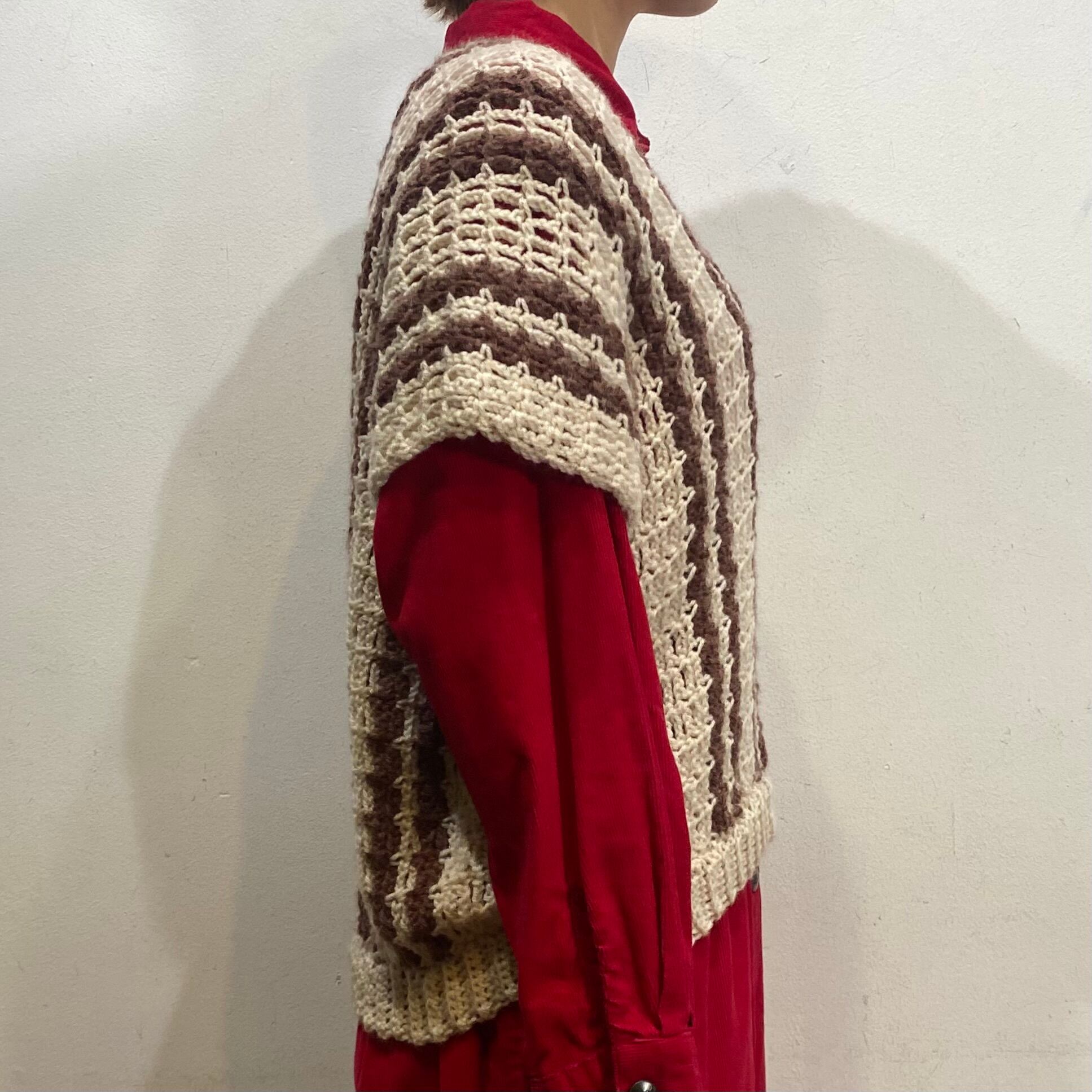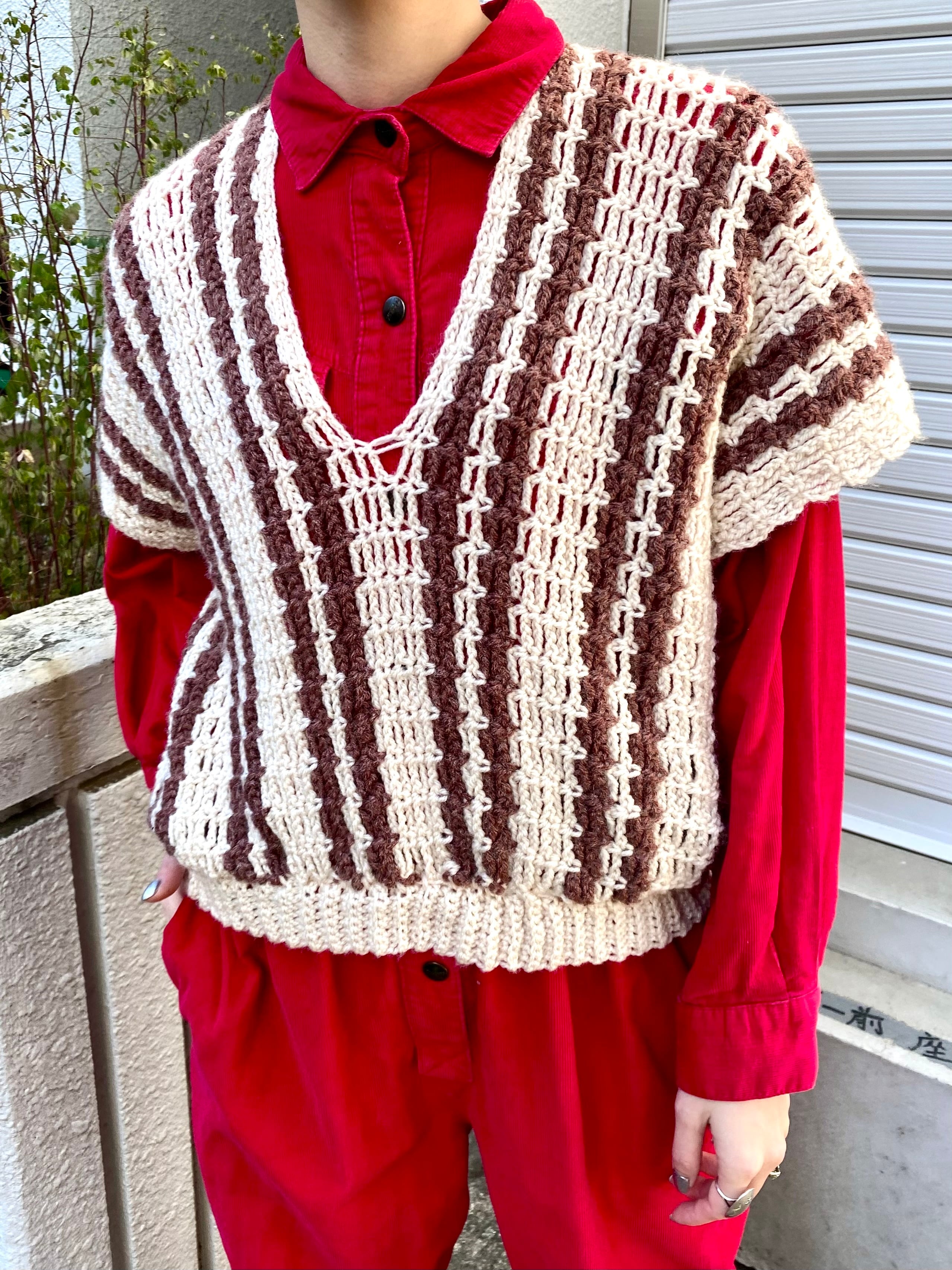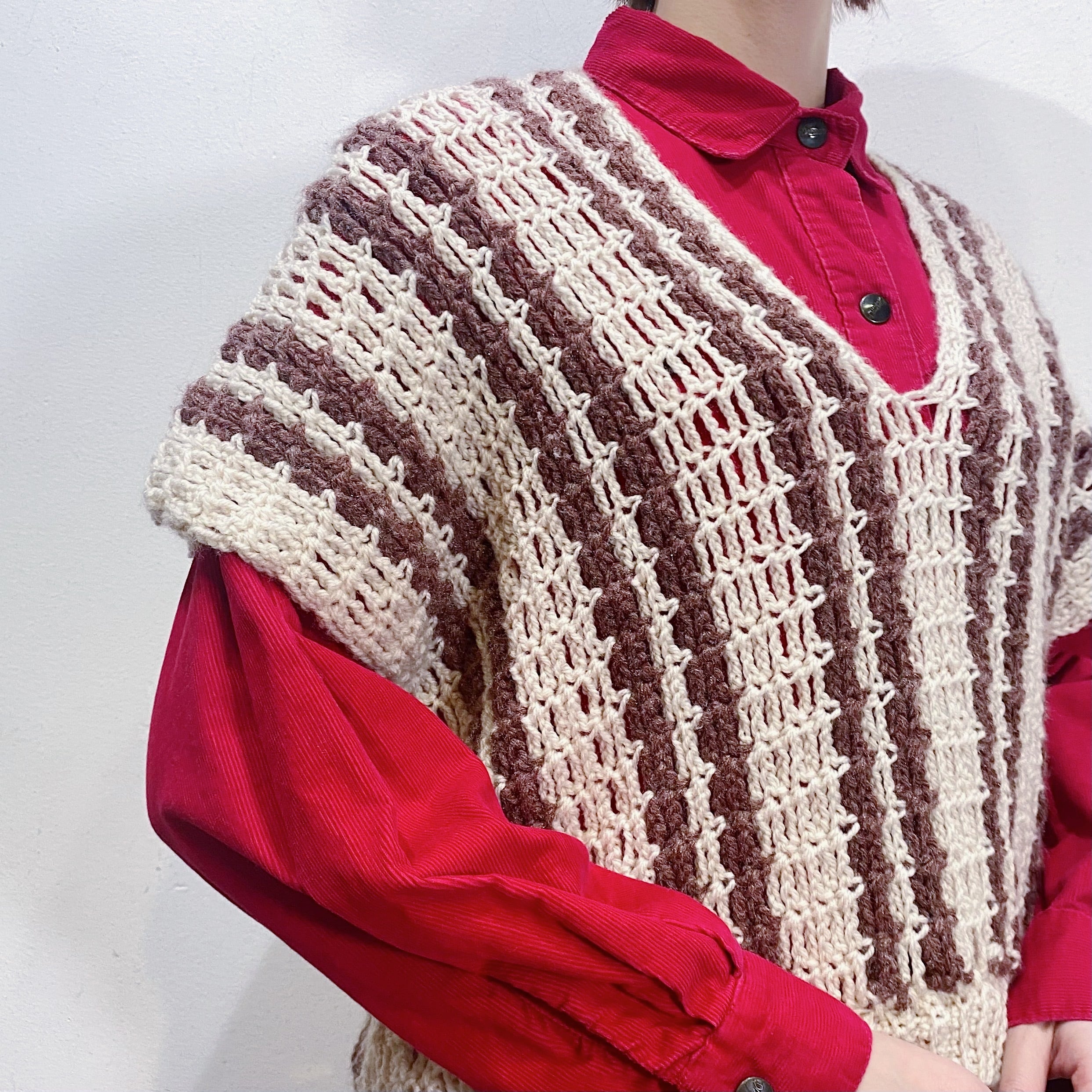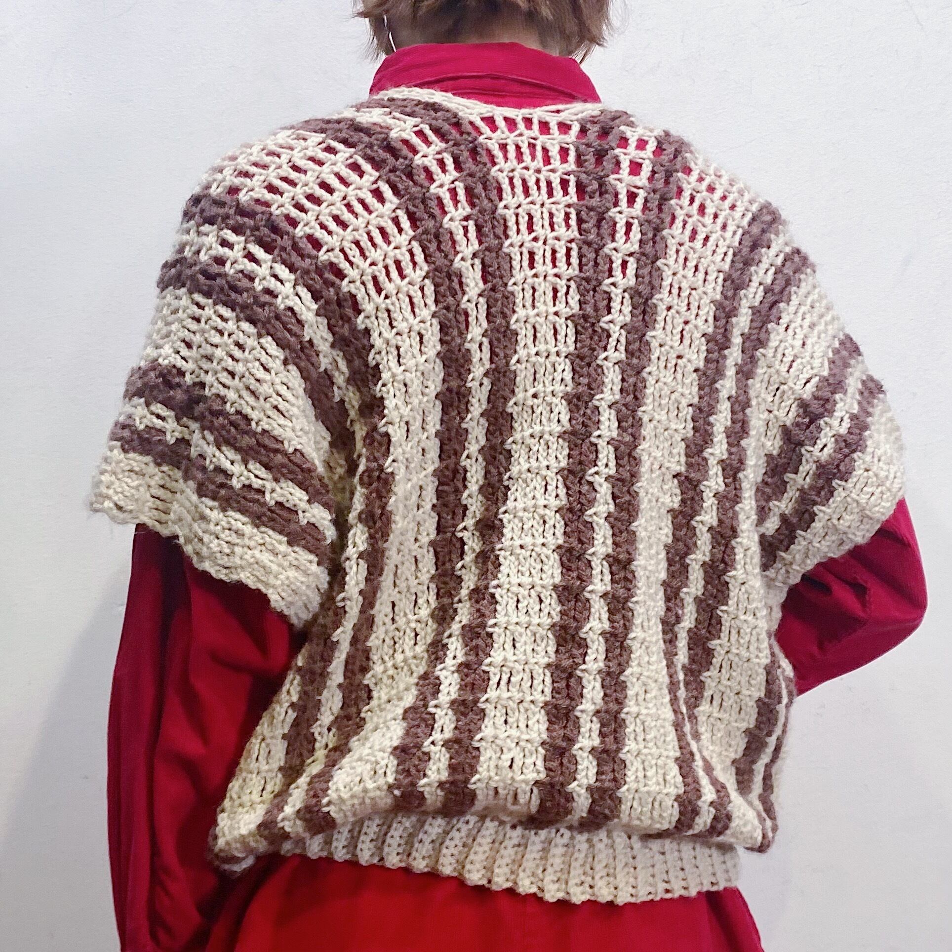 茶と白の色合わせでコーディネートに取り入れやすい、70年代のストライプのベストです。