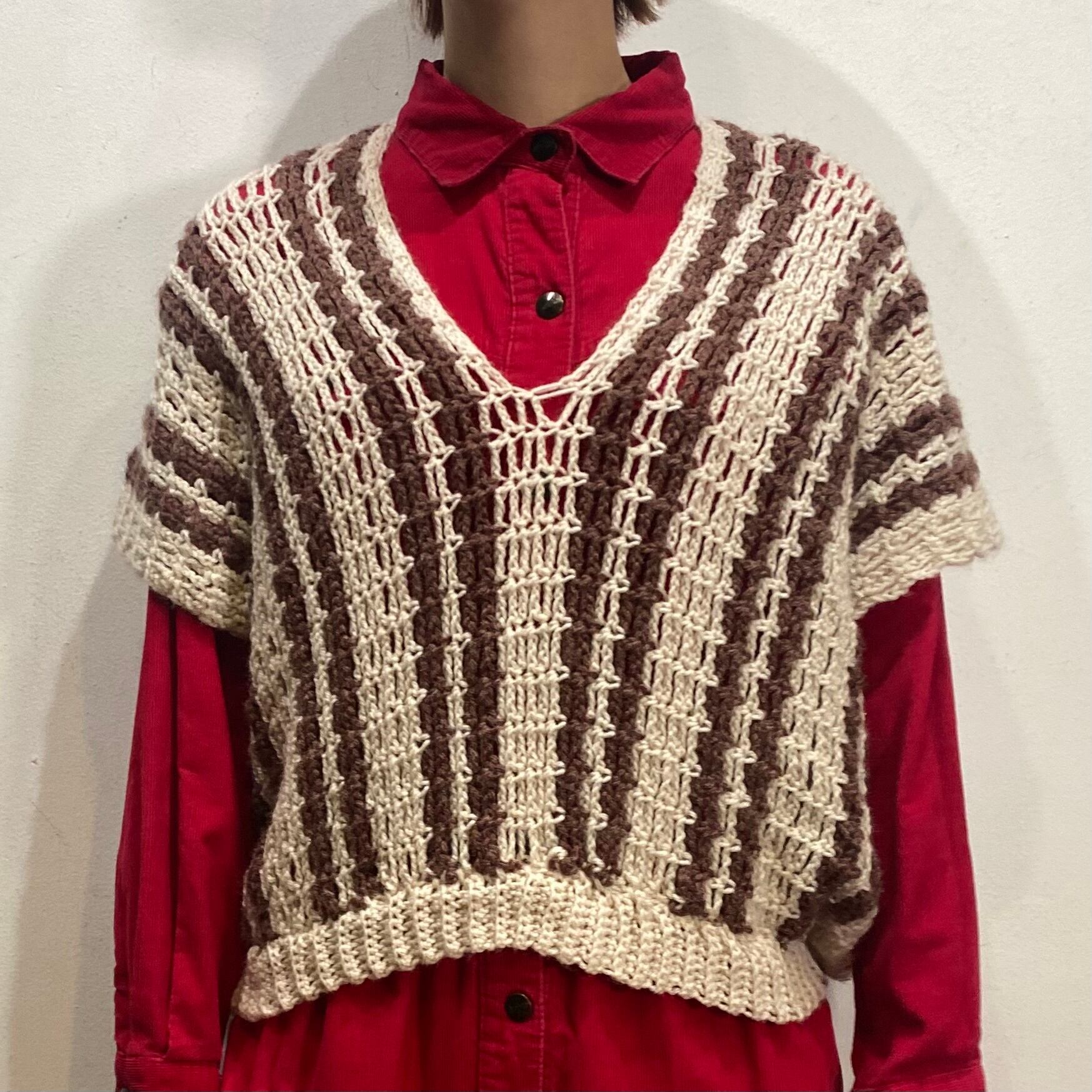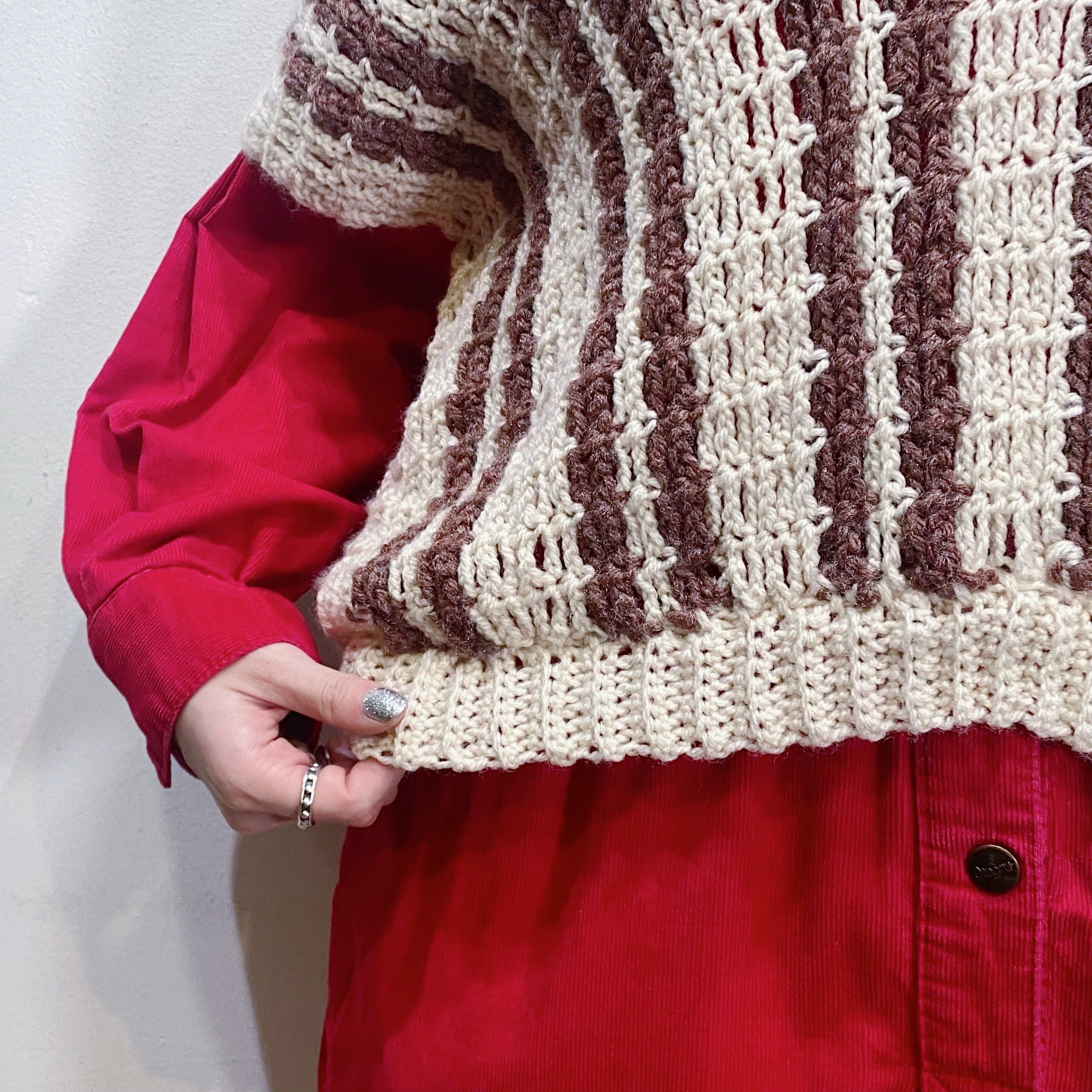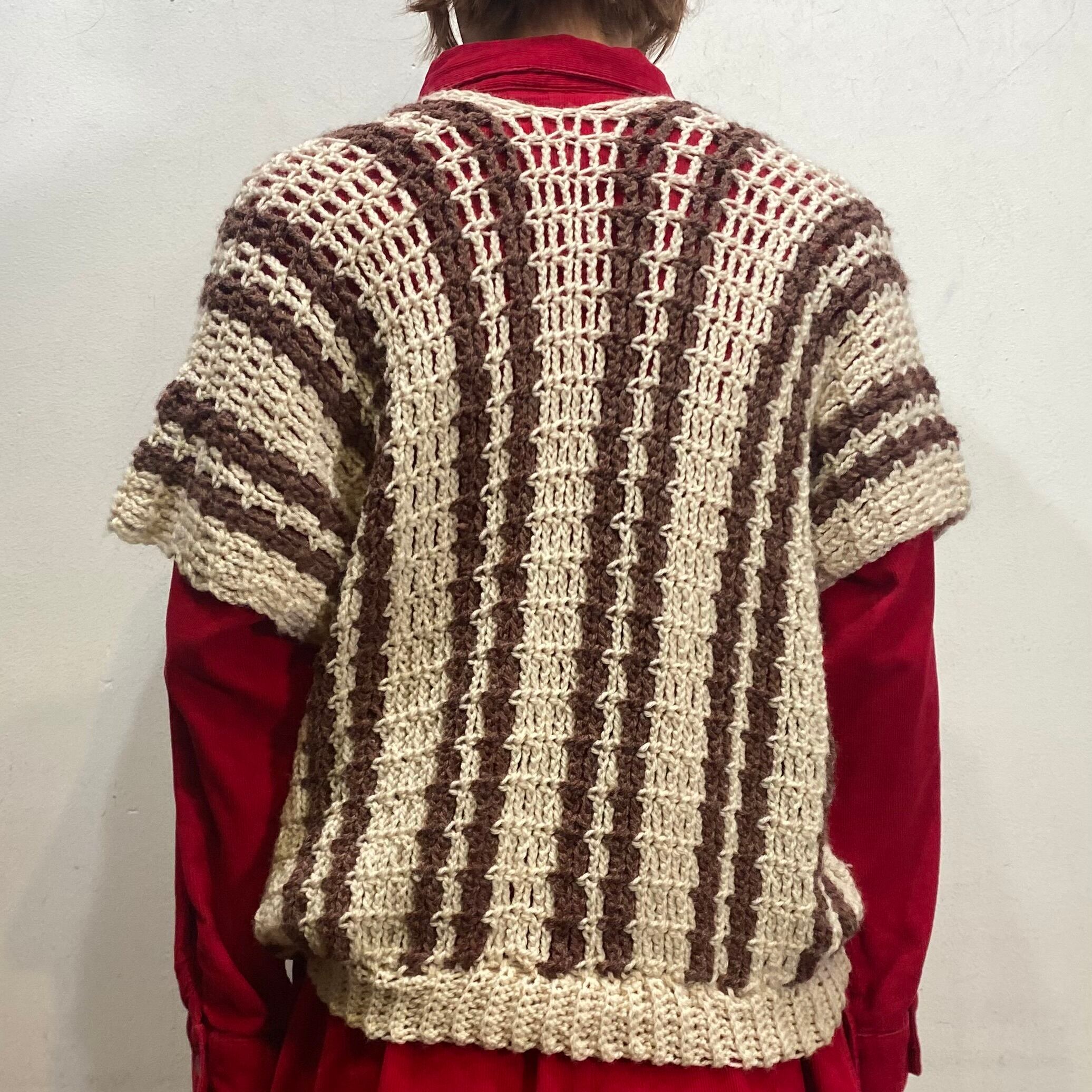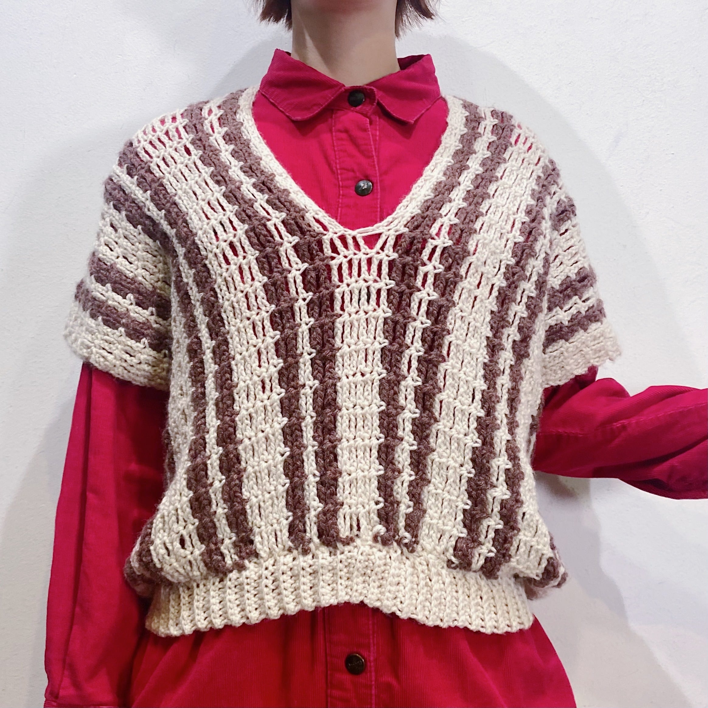 茶と白の色合わせでコーディネートに取り入れやすい、70年代のストライプのベストです。