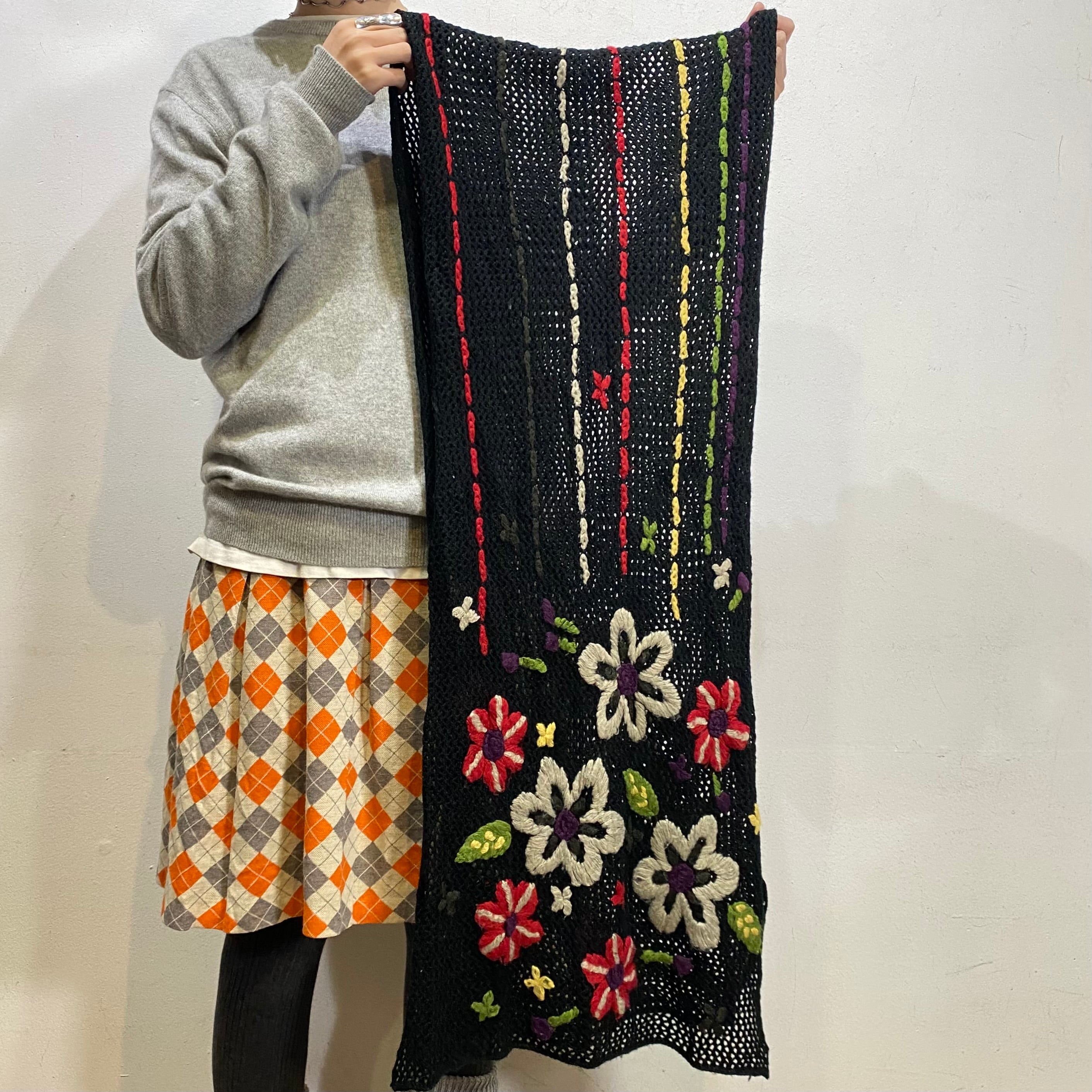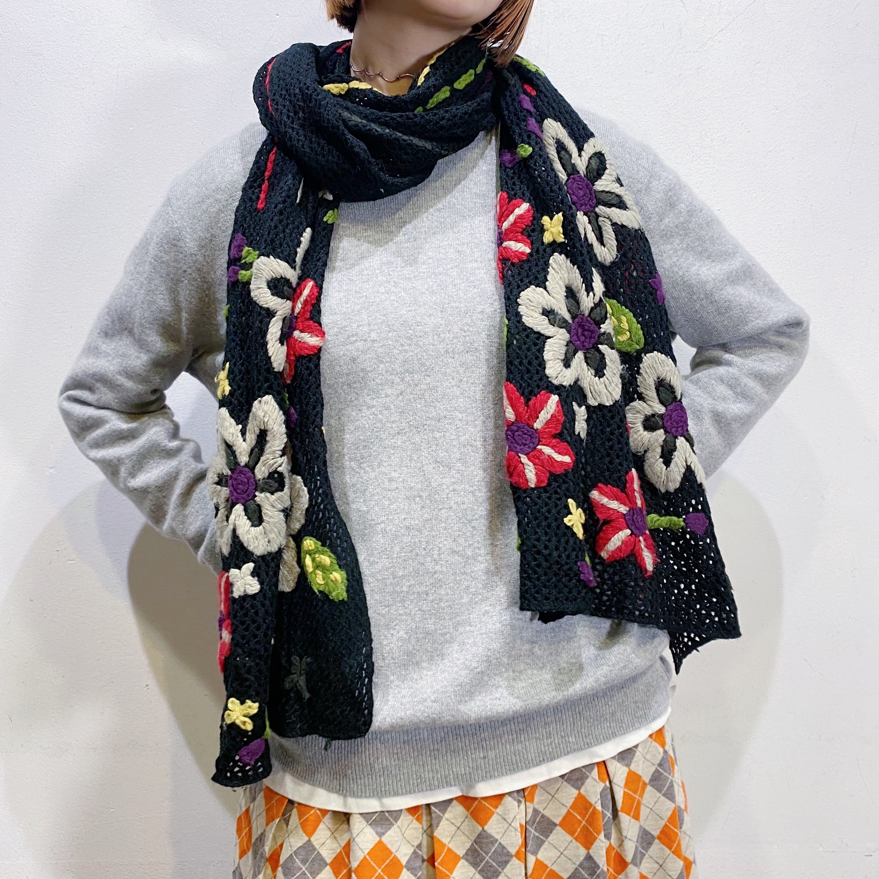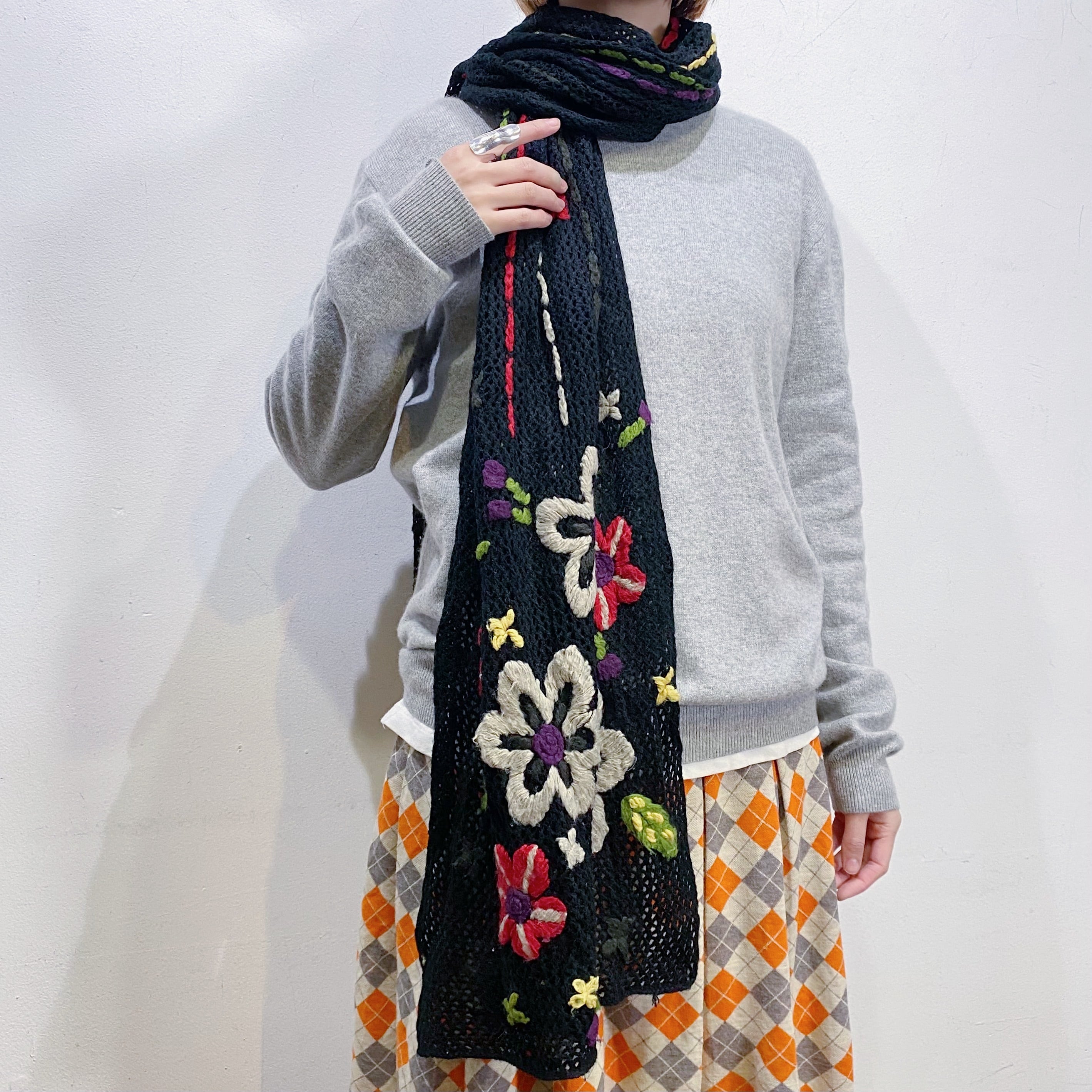 ブラックベースにカラフルなお花の刺繍が映えるマフラーです。