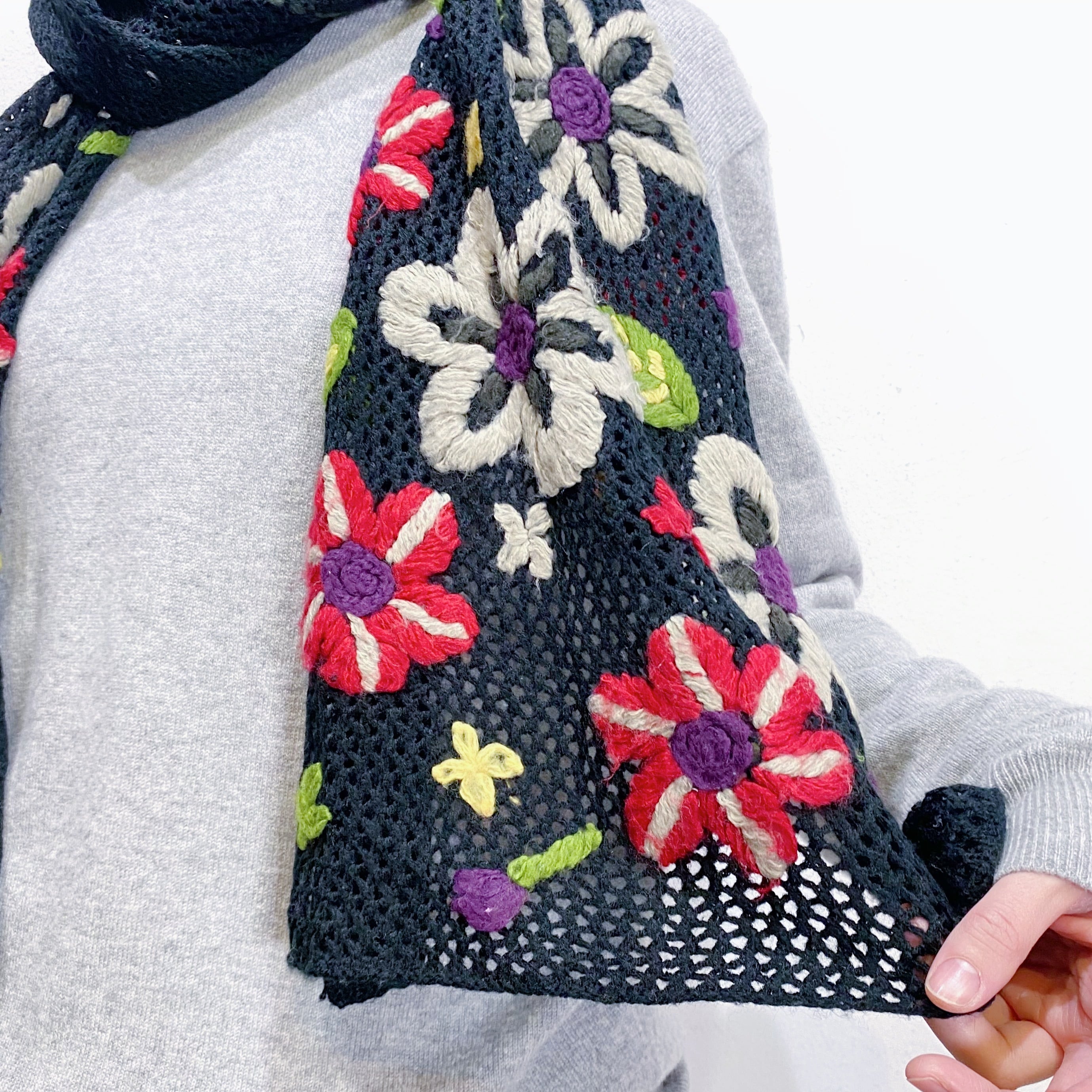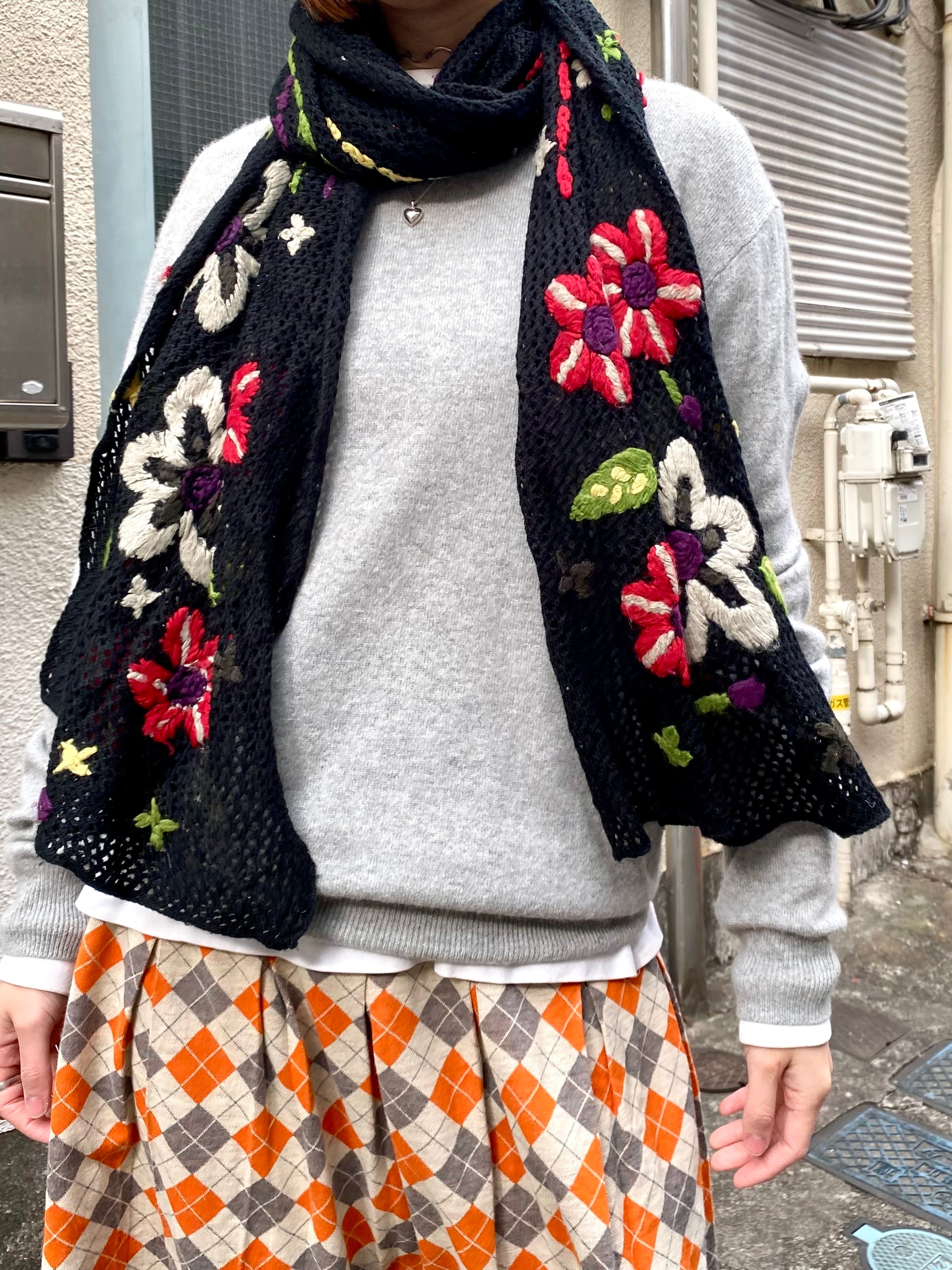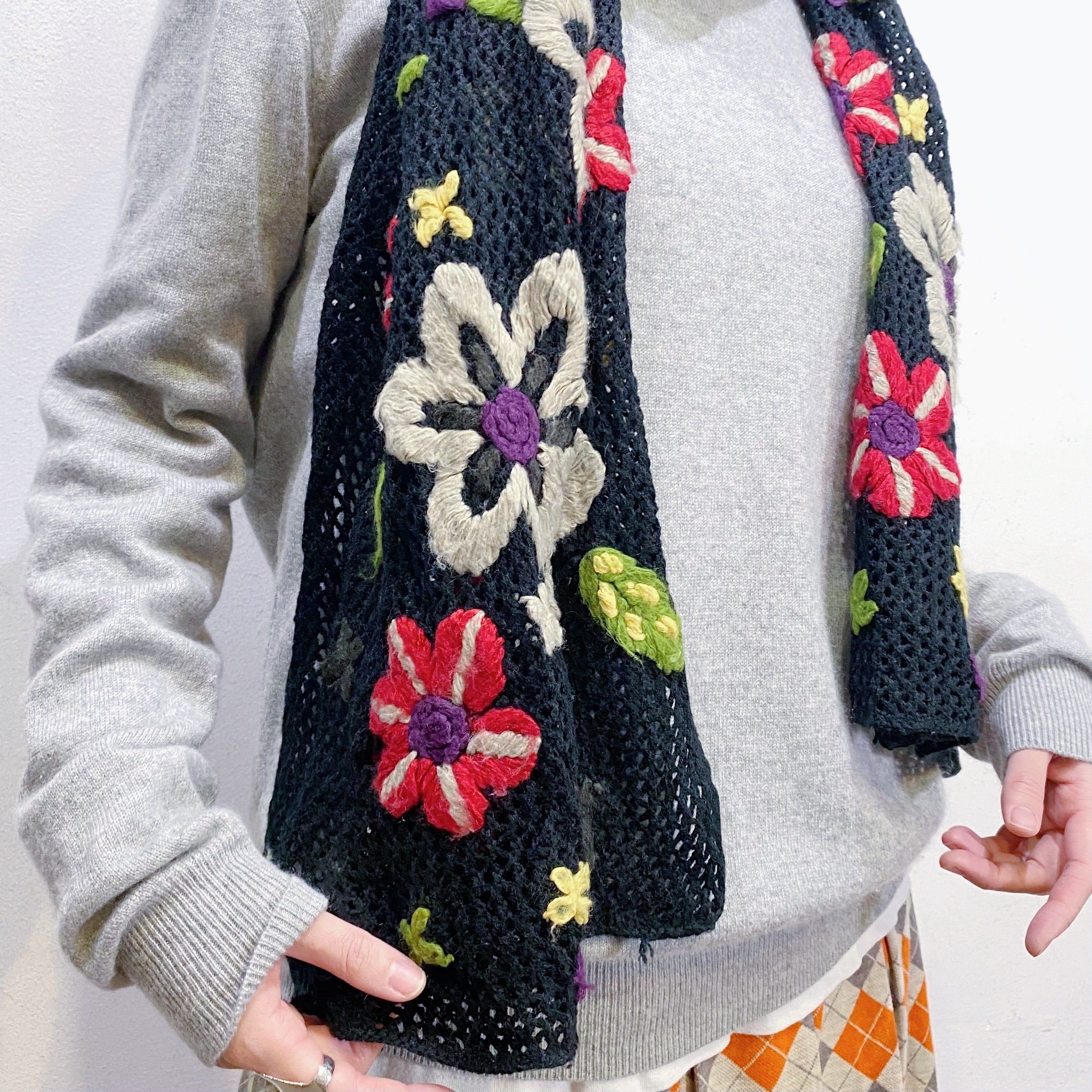 ブラックベースにカラフルなお花の刺繍が映えるマフラーです。