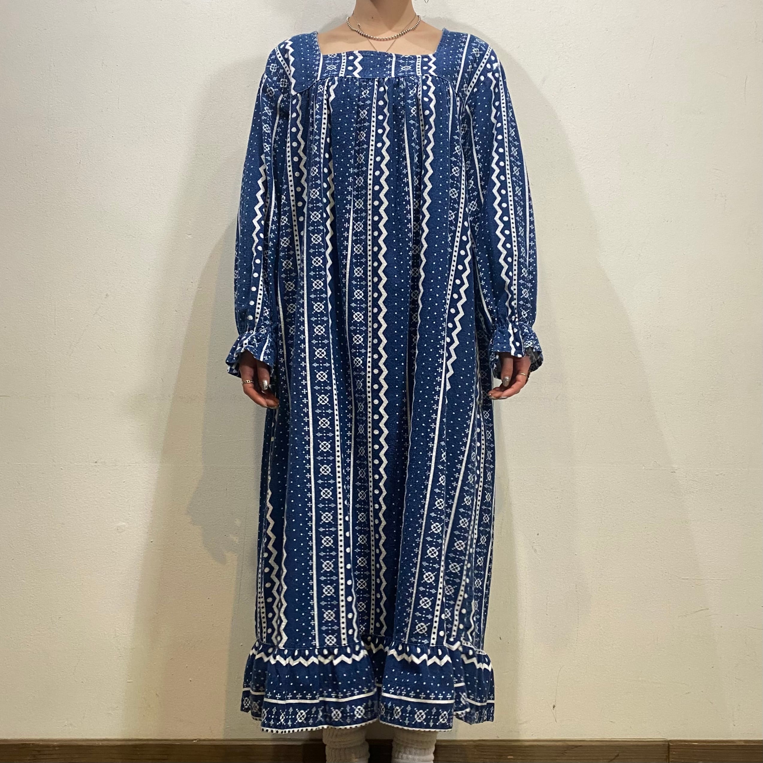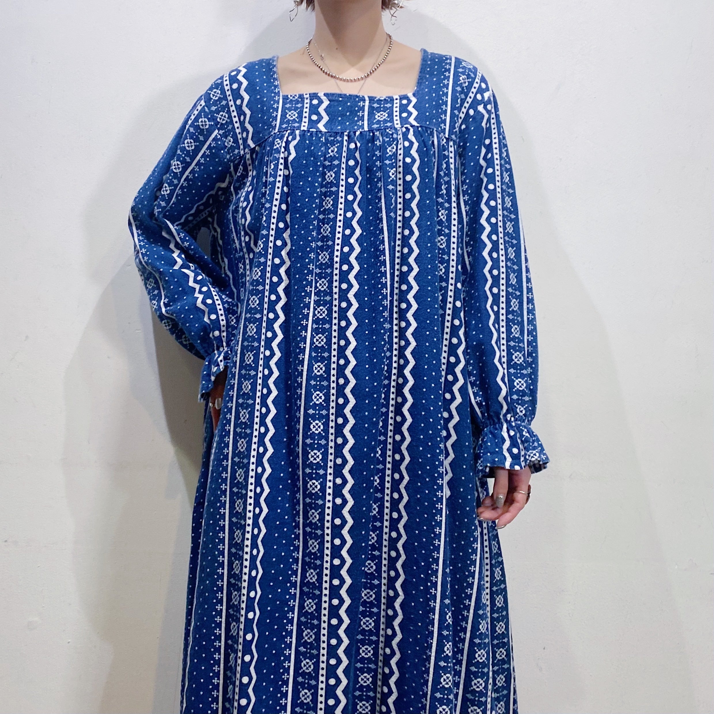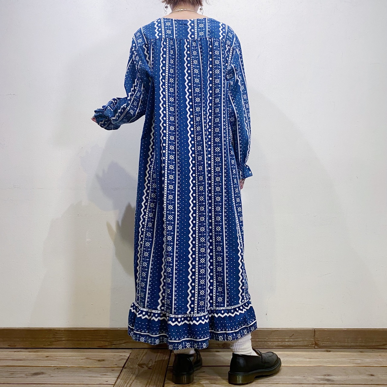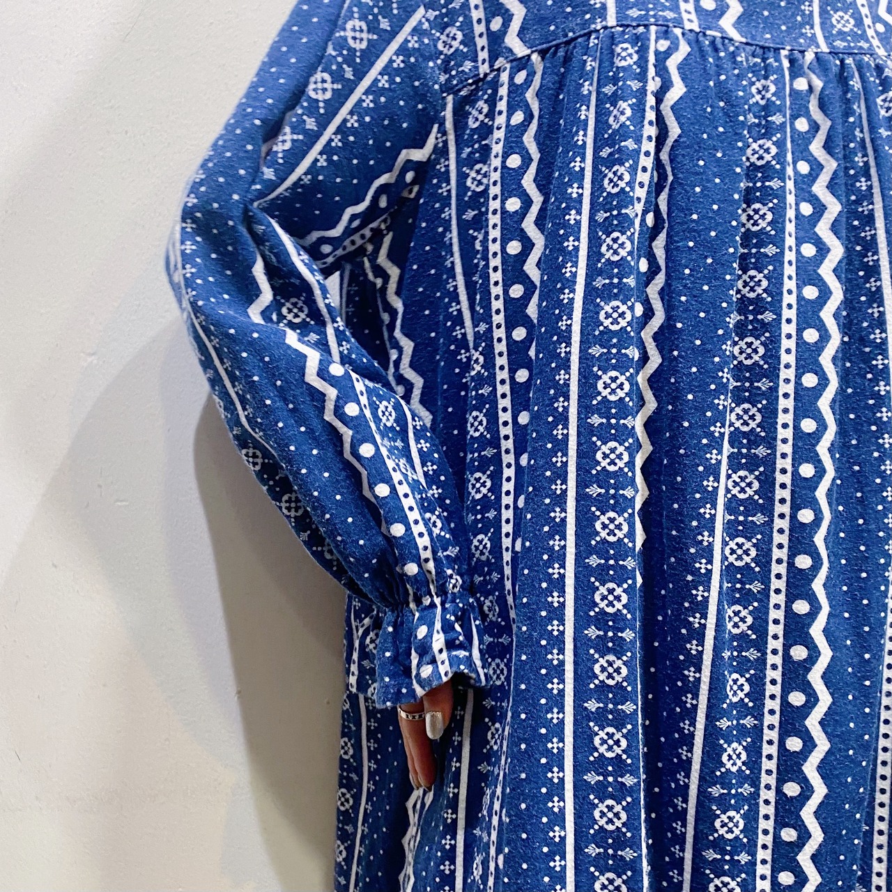 ネイビーベースにジグザグやドット、クローバーのような模様が可愛い、70~80年代のワンピースです。