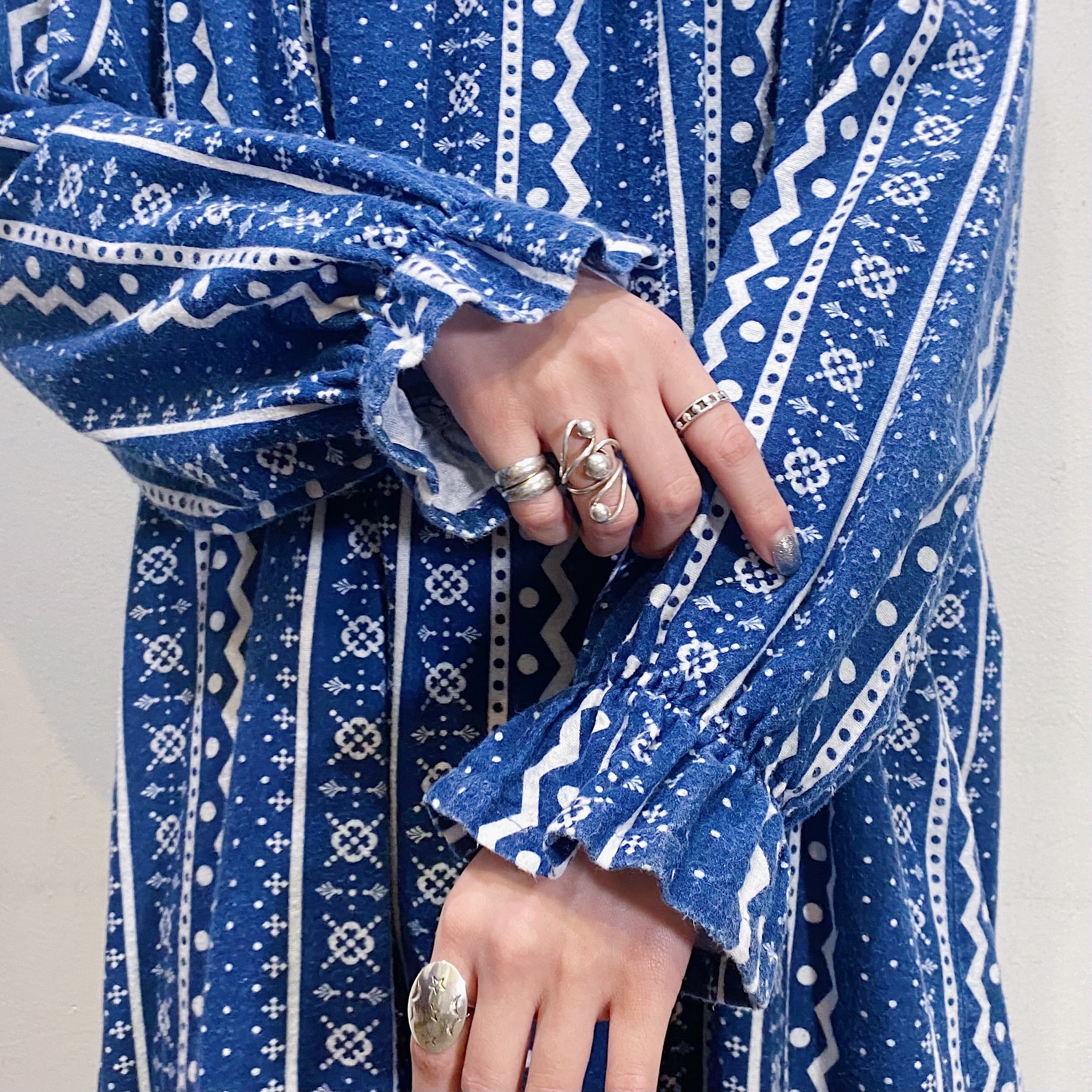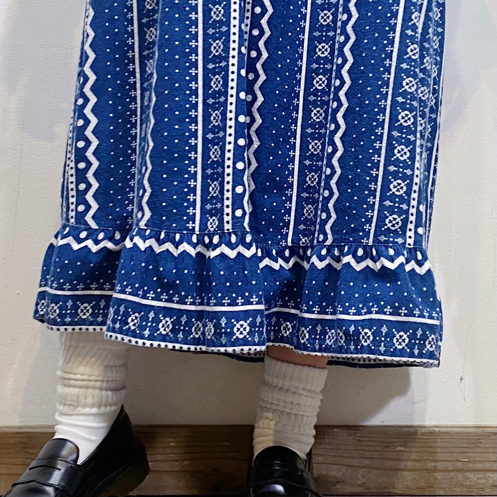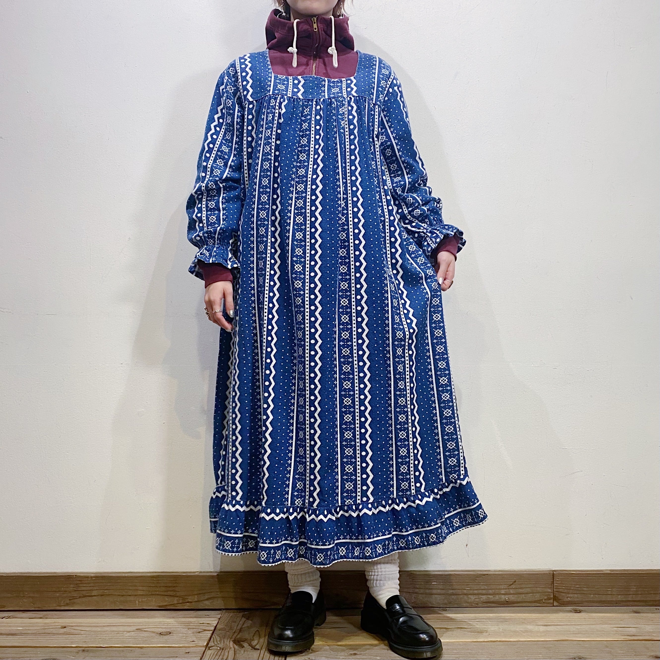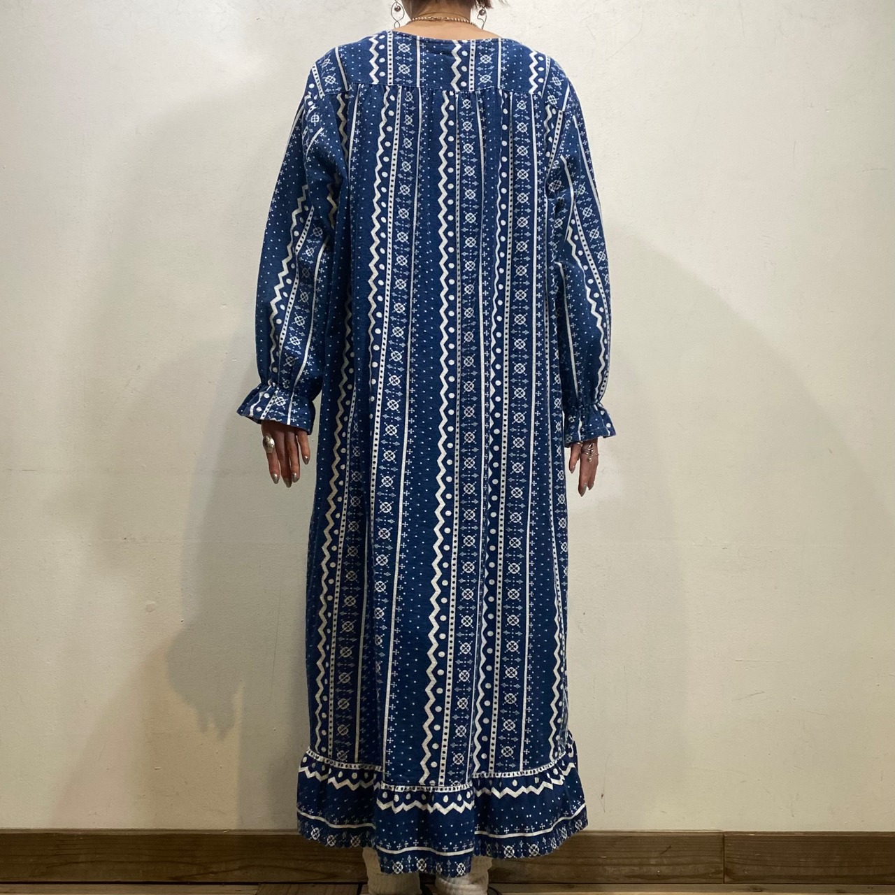 ネイビーベースにジグザグやドット、クローバーのような模様が可愛い、70~80年代のワンピースです。