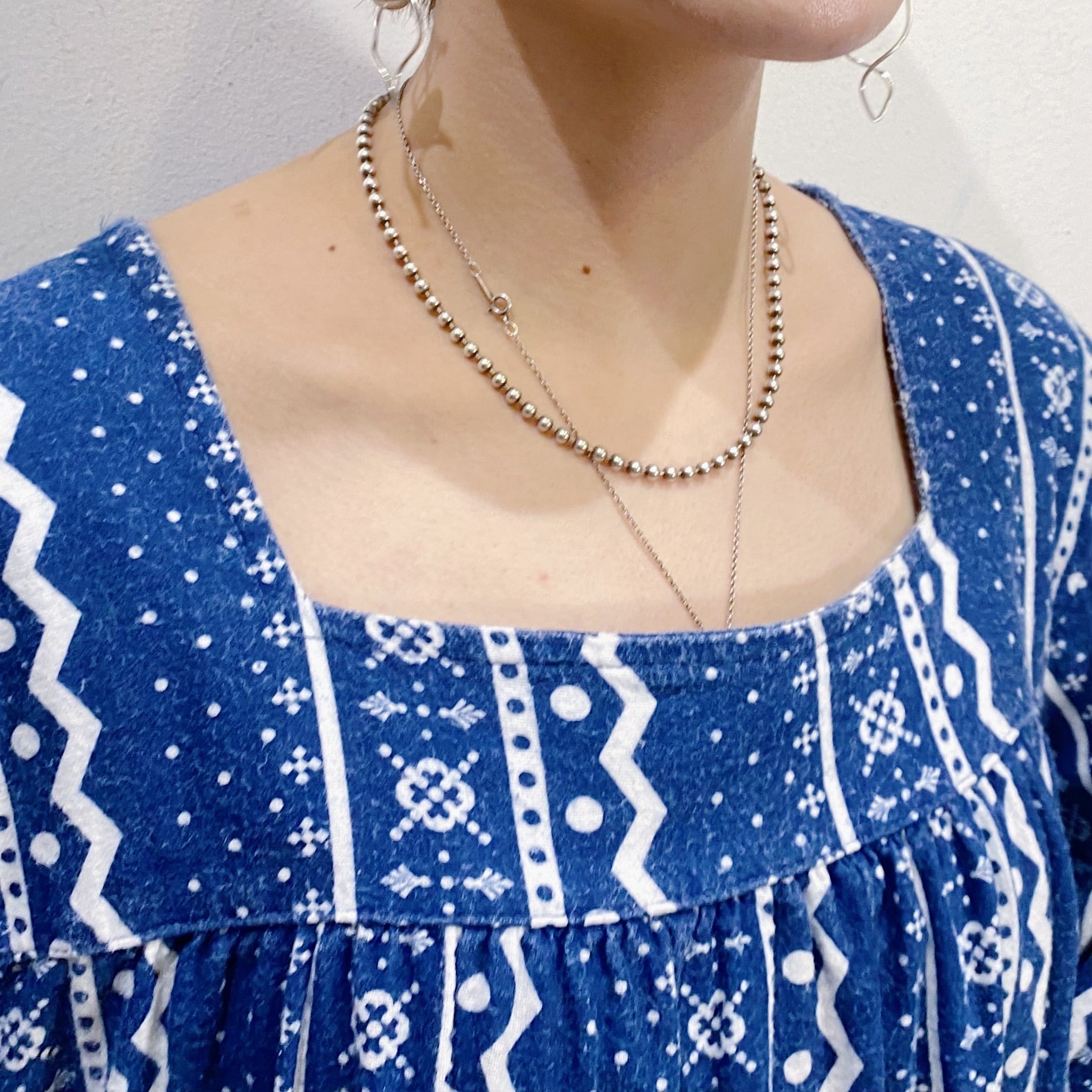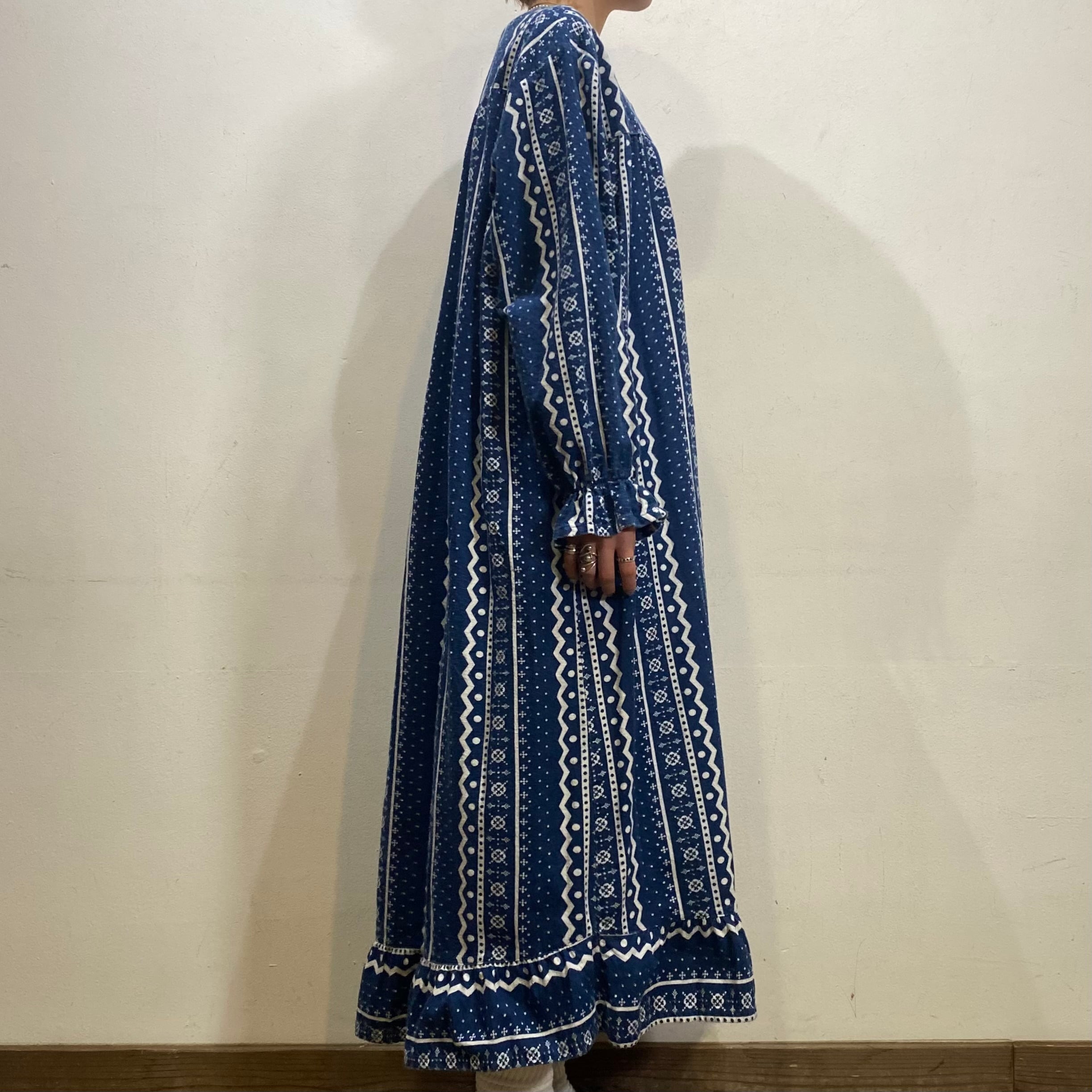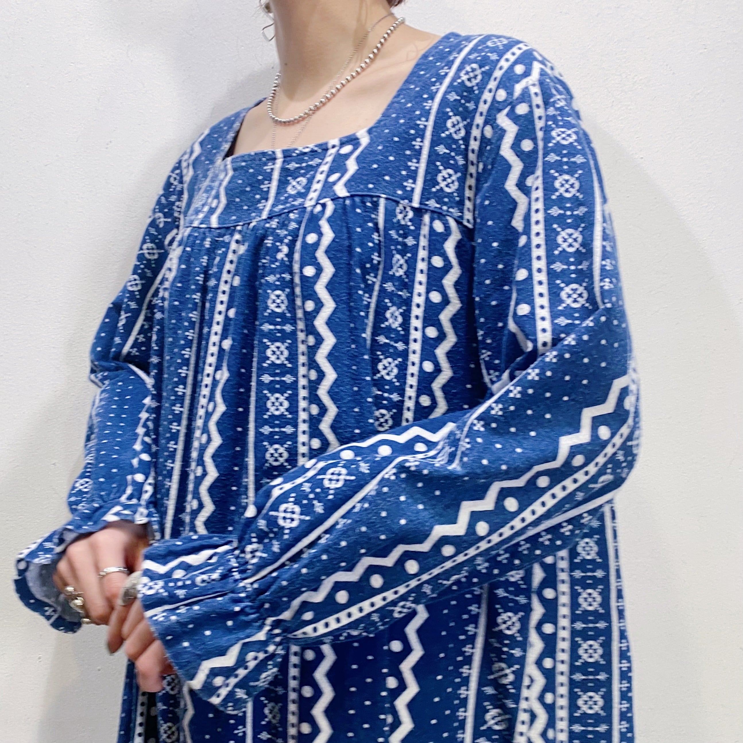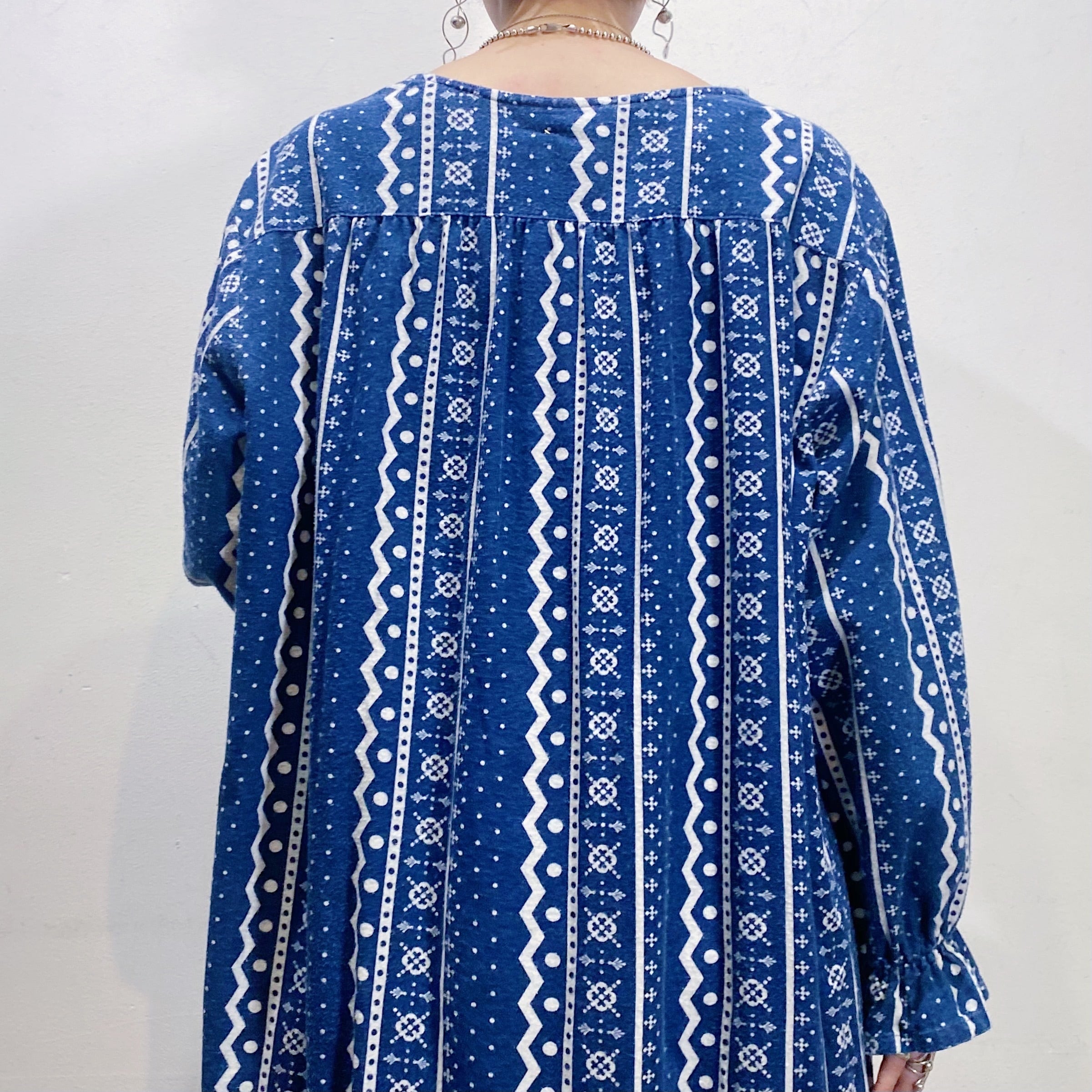 ネイビーベースにジグザグやドット、クローバーのような模様が可愛い、70~80年代のワンピースです。