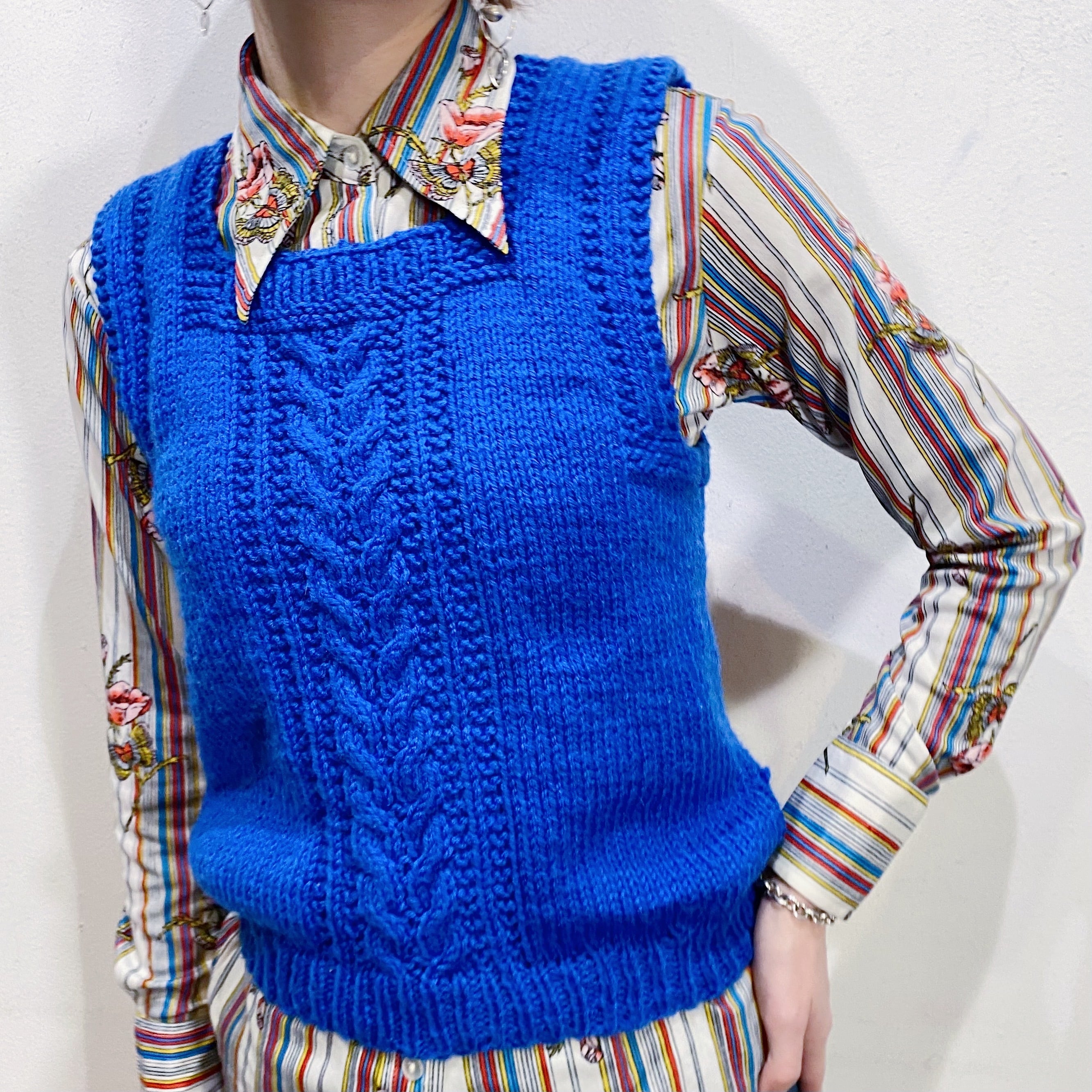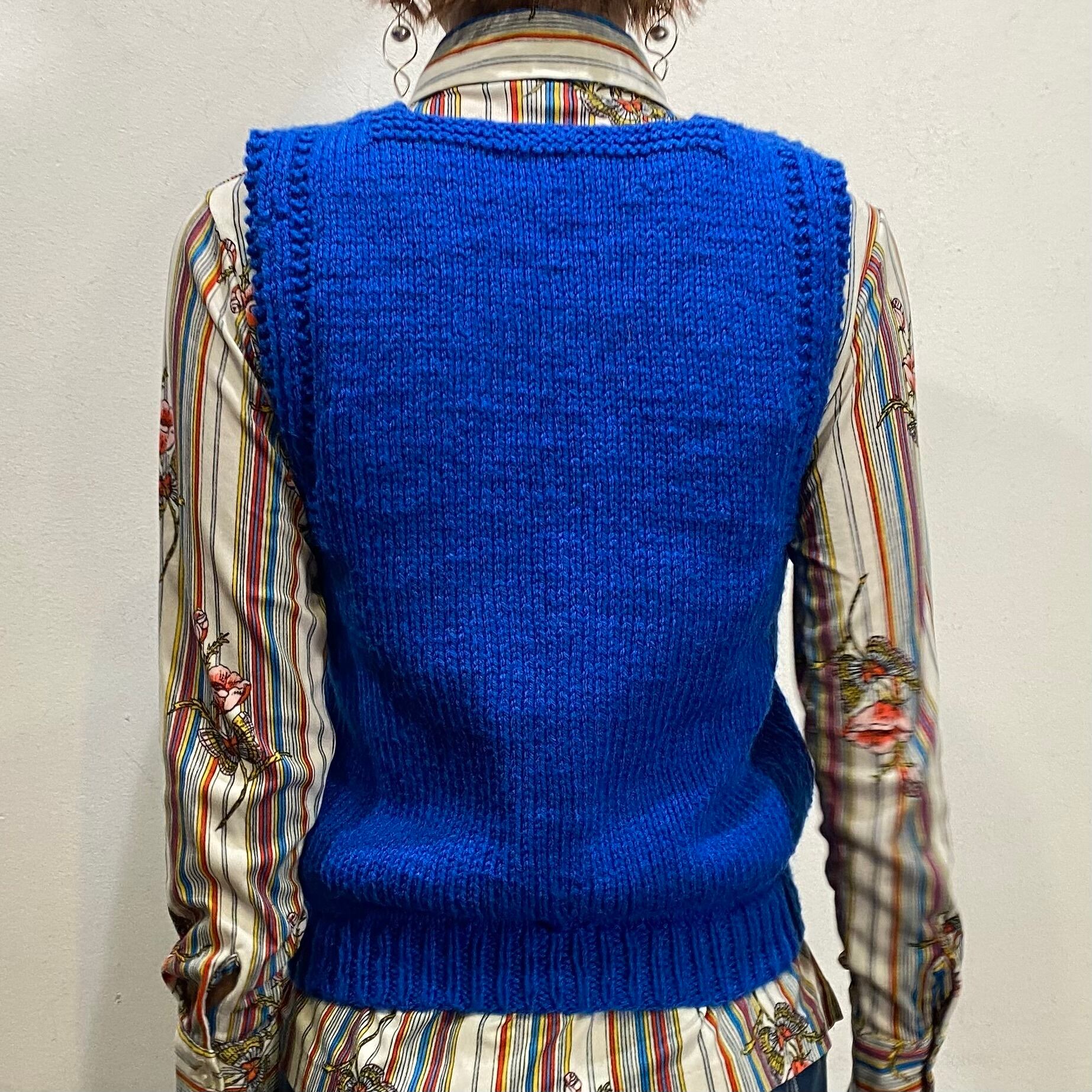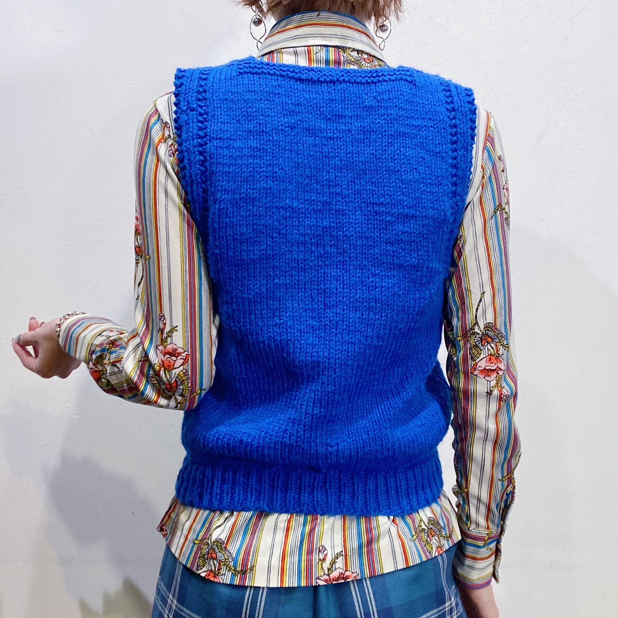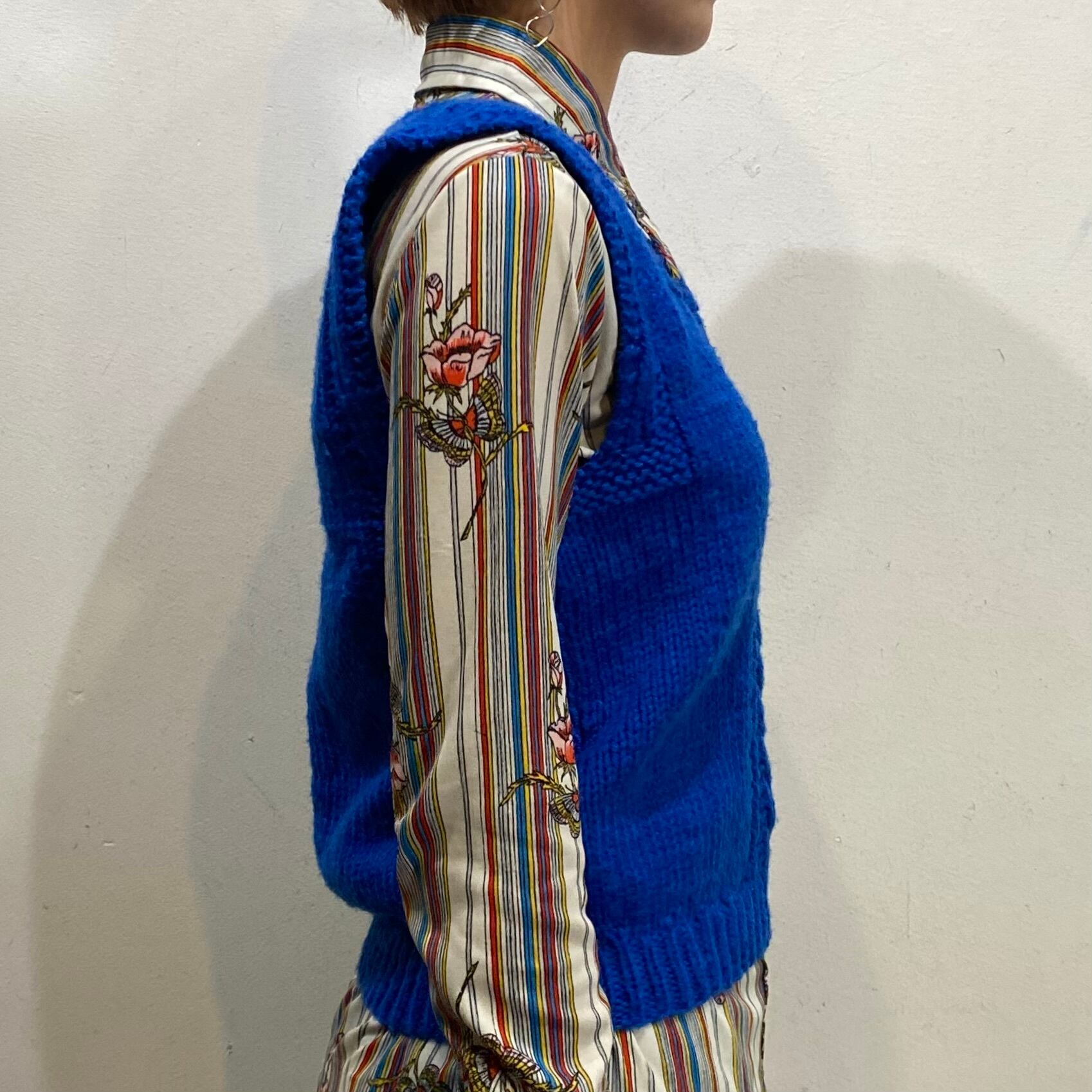 鮮やかなブルーがパッと目を惹く、70年代のニットベストです。