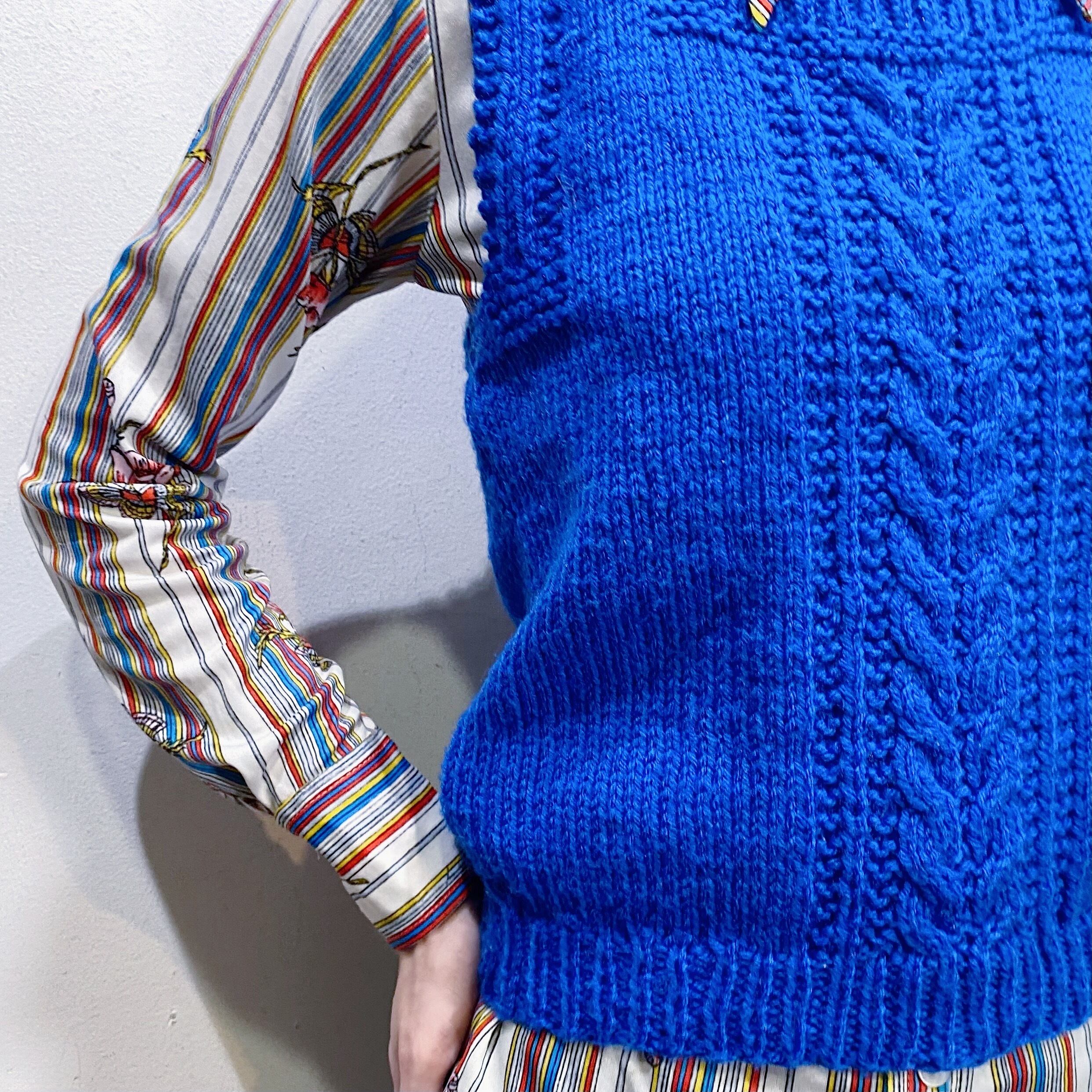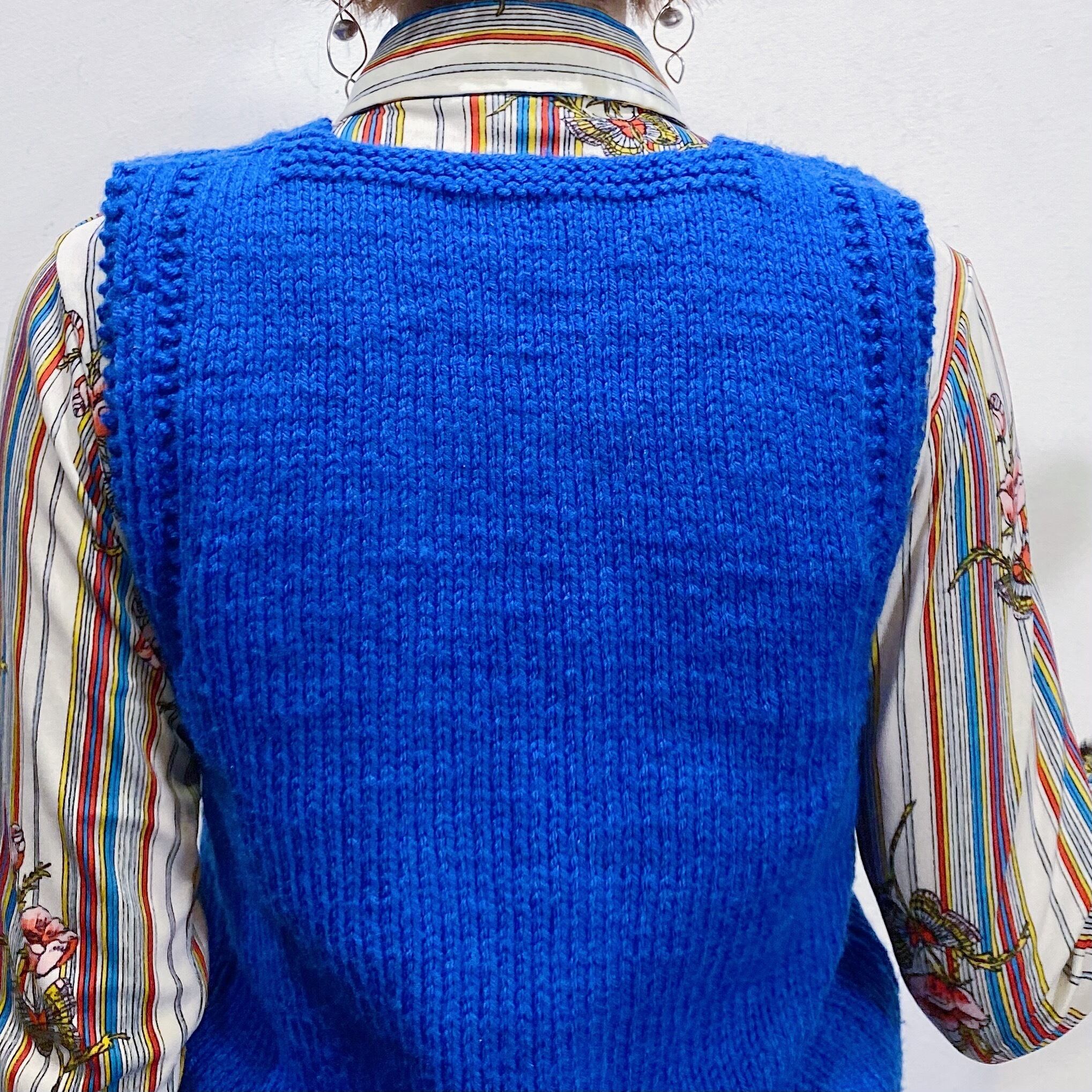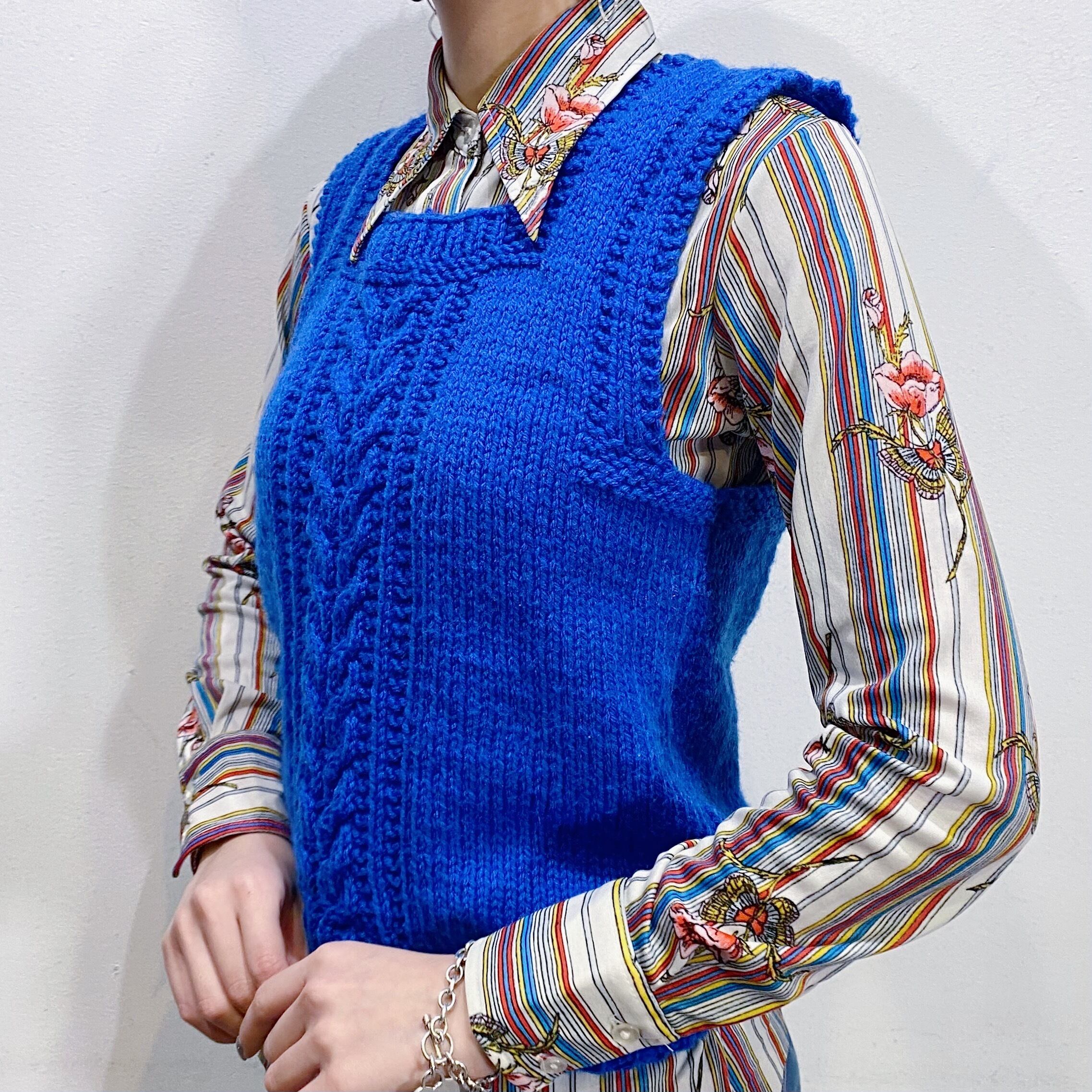 鮮やかなブルーがパッと目を惹く、70年代のニットベストです。