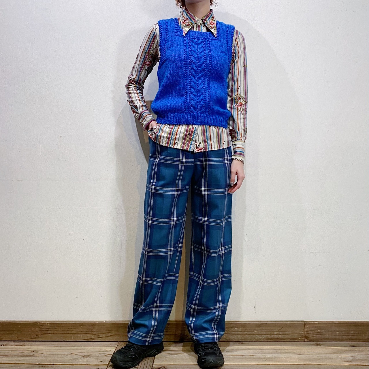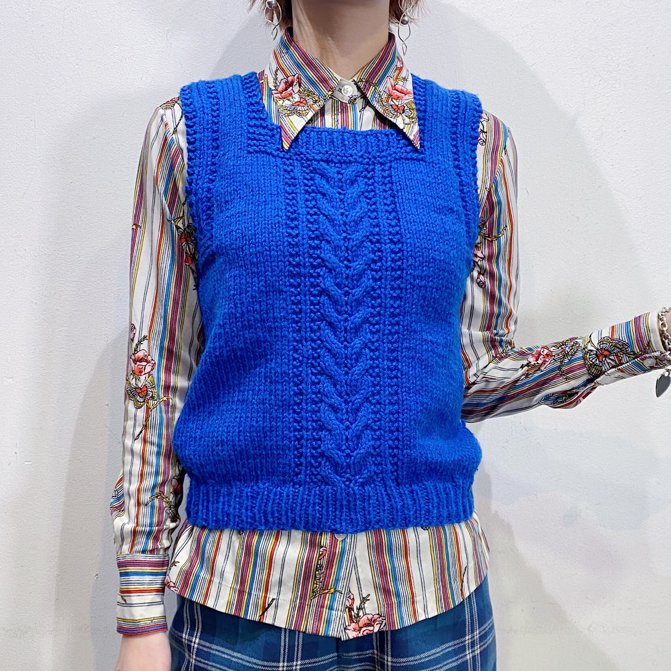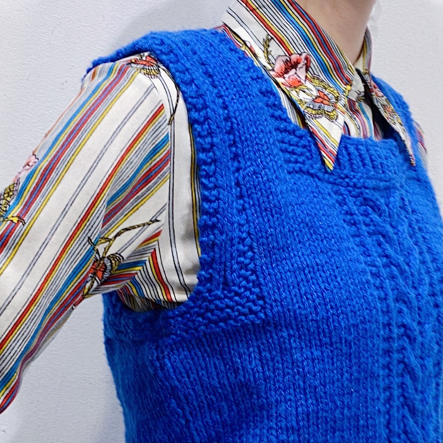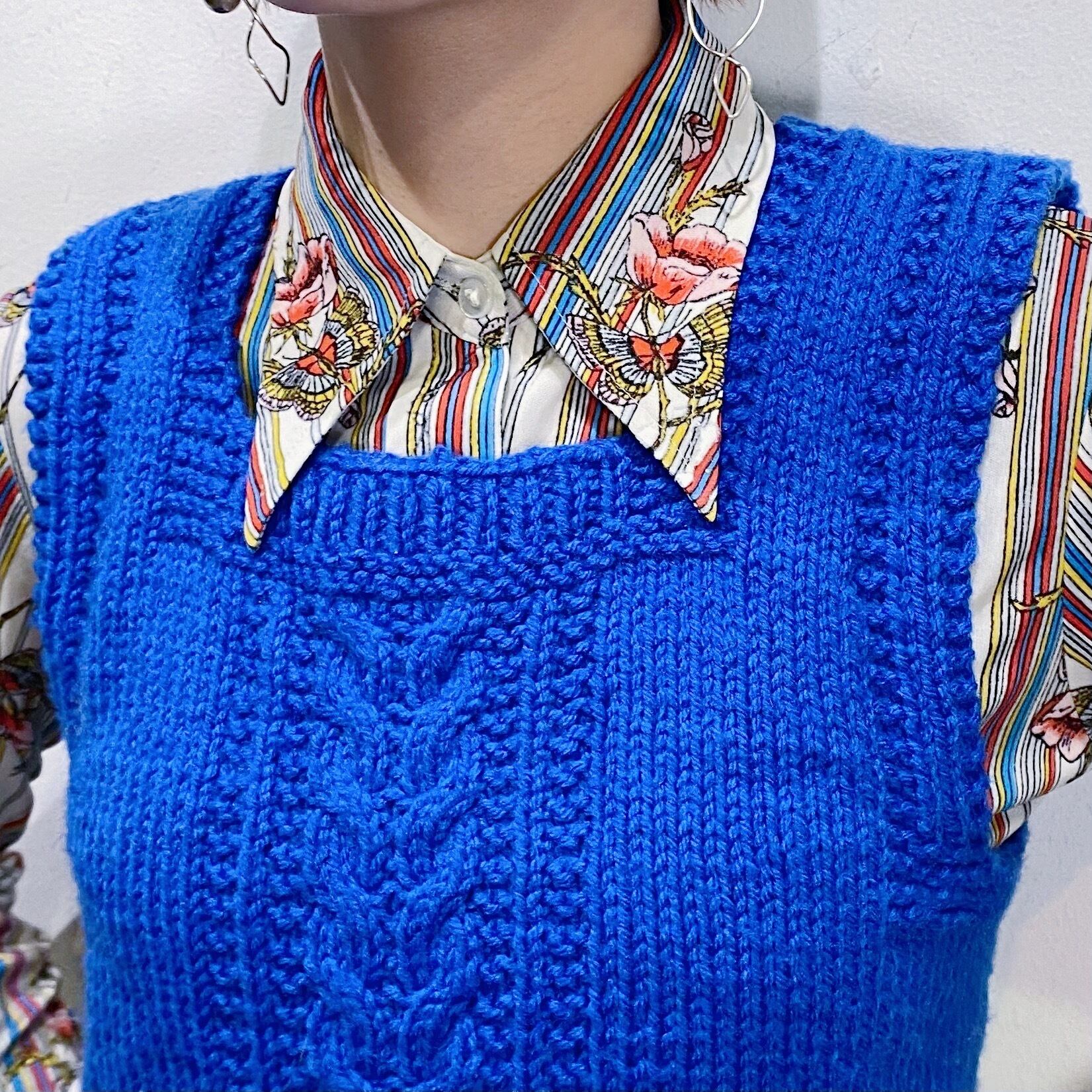 鮮やかなブルーがパッと目を惹く、70年代のニットベストです。