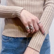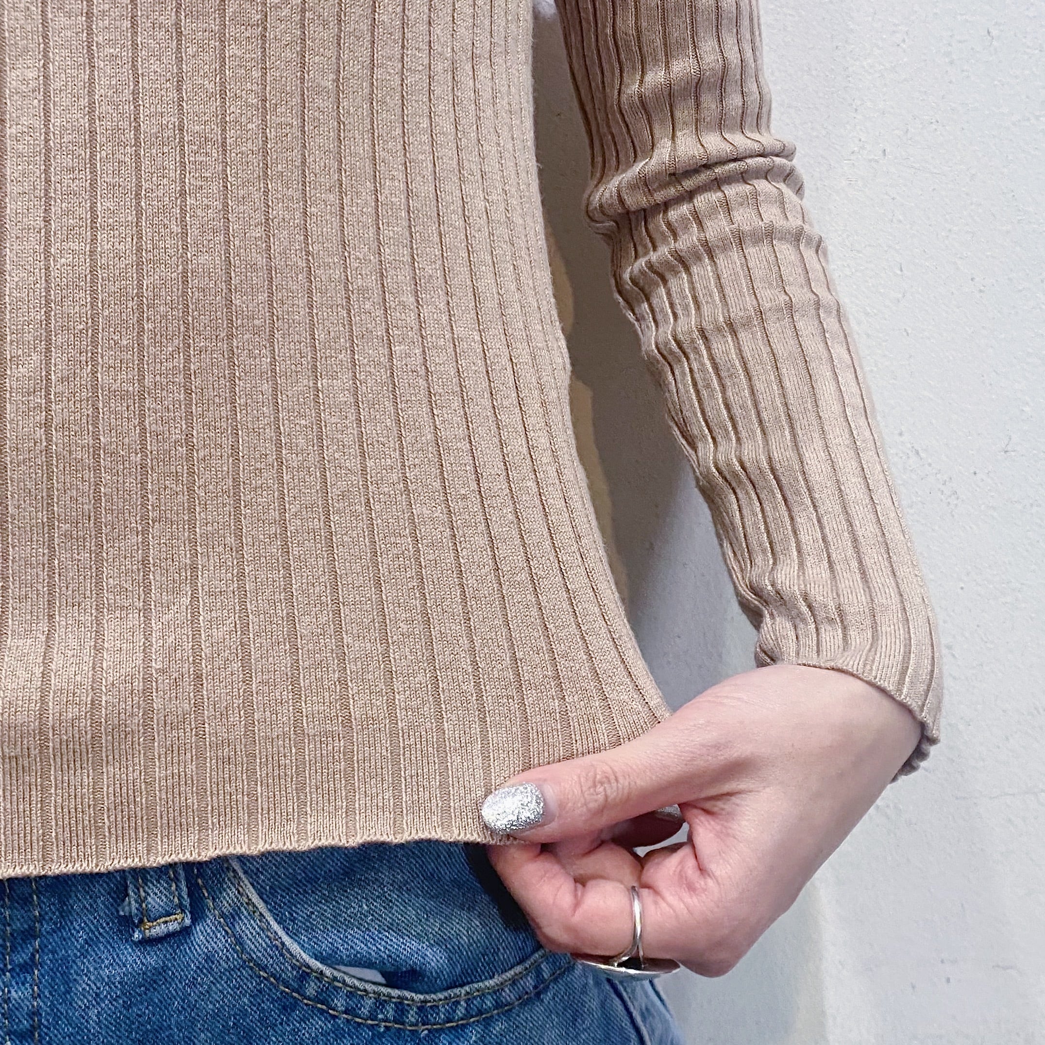 伸縮性のあるリブで、程よく体にフィットして着こなしやすいです。