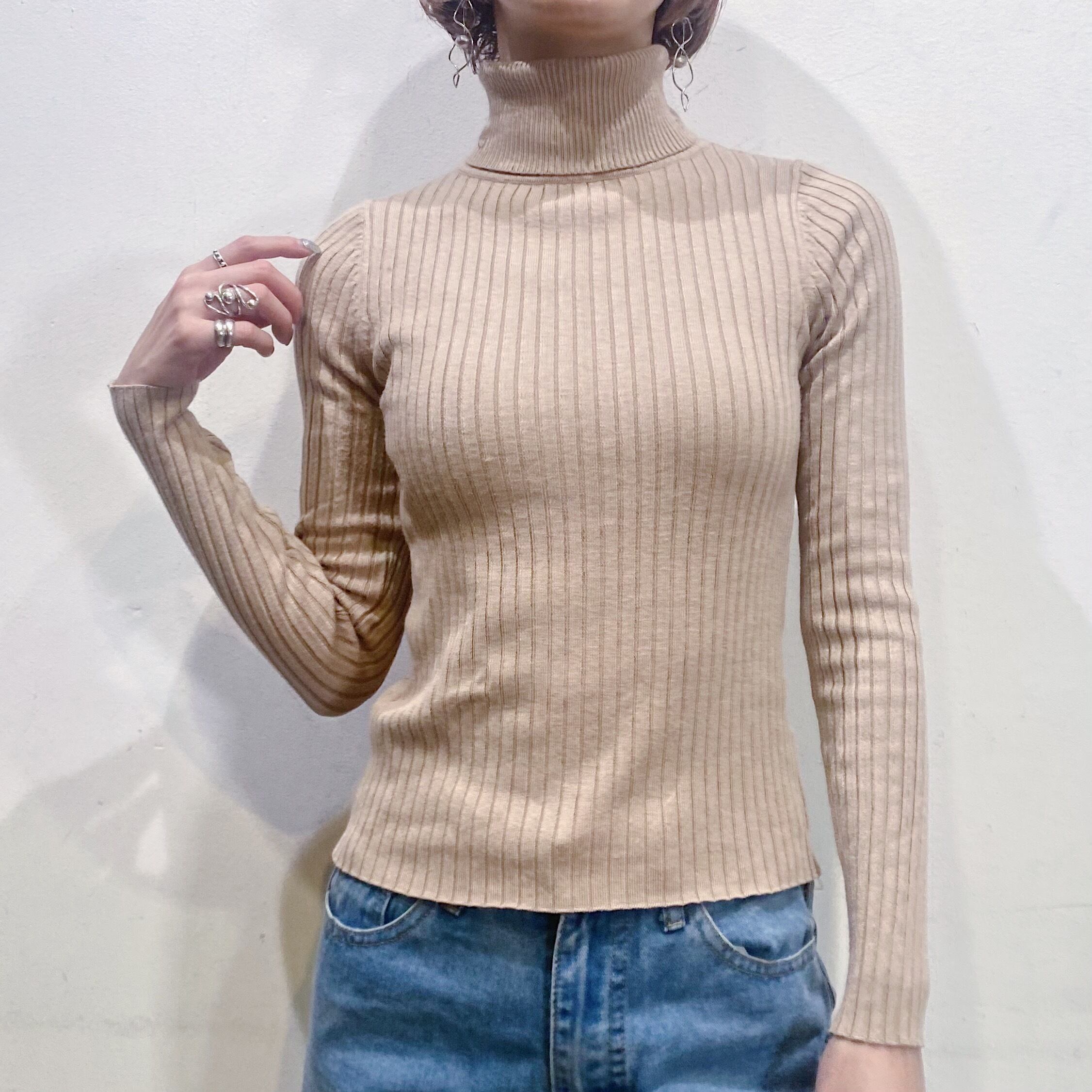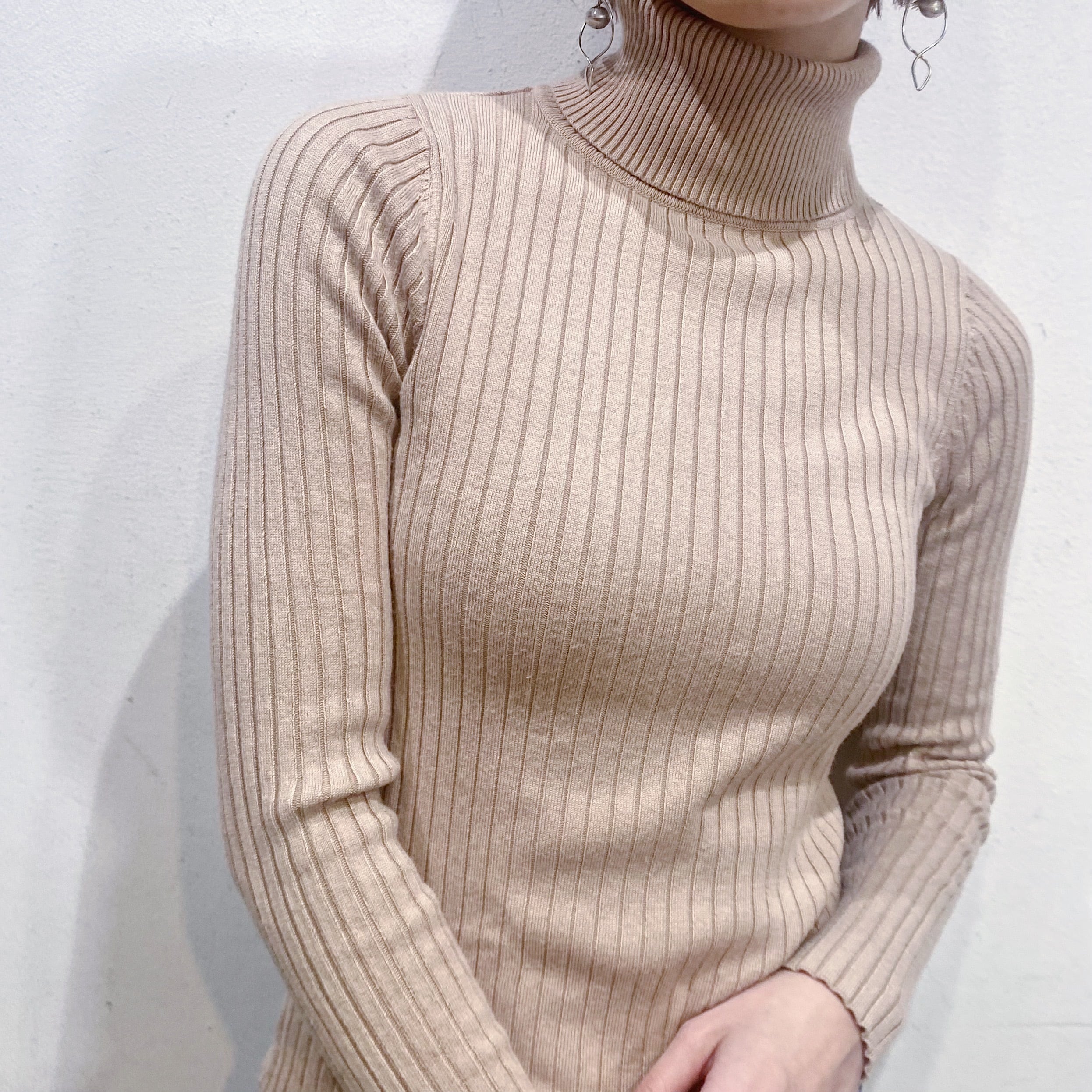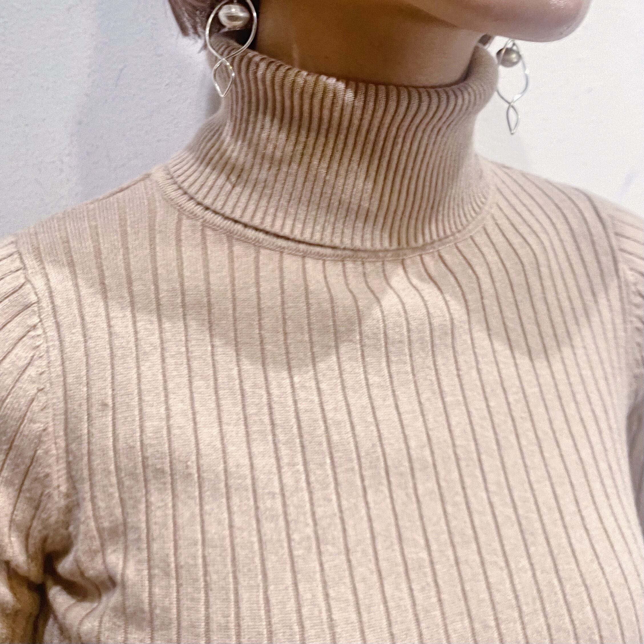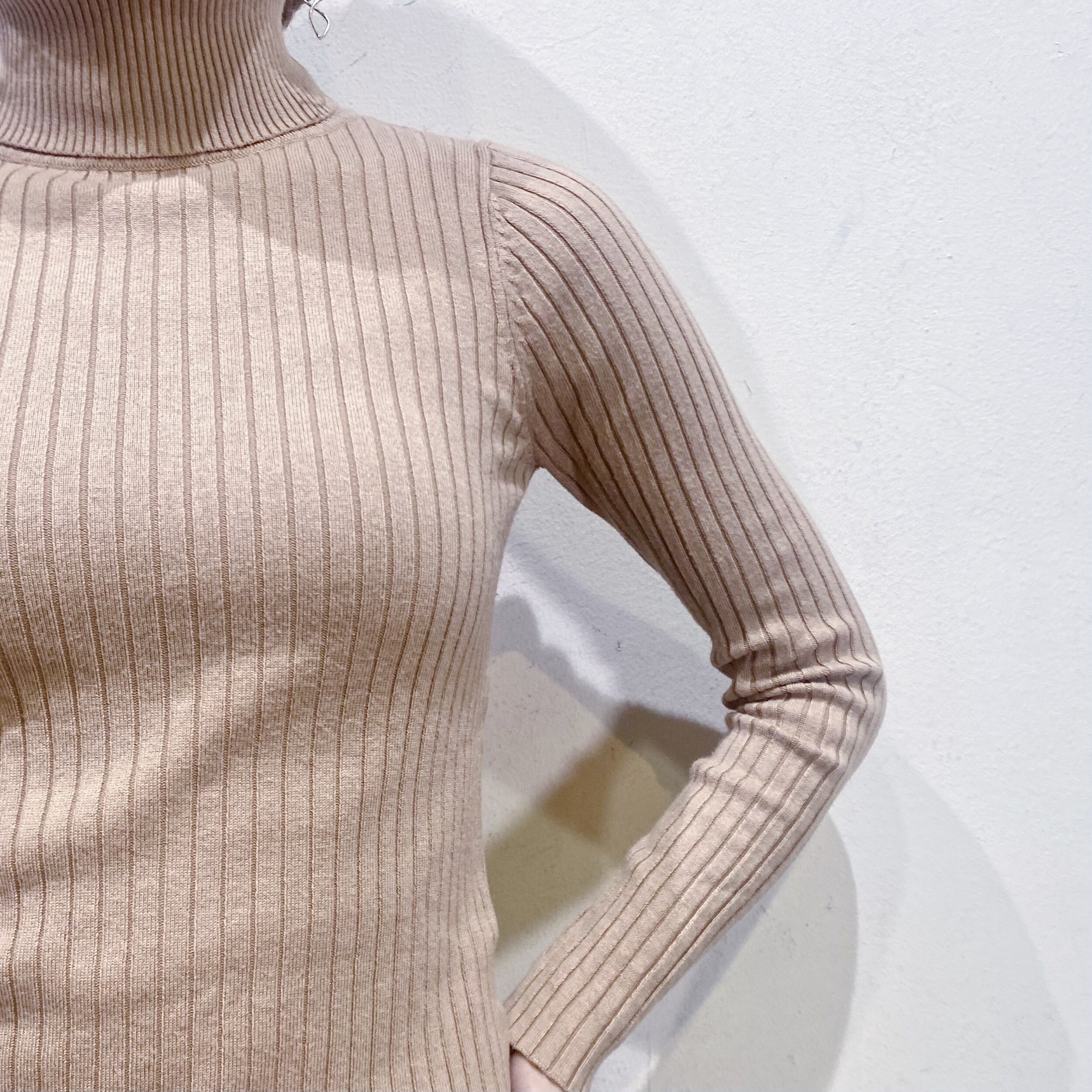 ベージュでコーディネートに取り入れやすい、ハイネックトップスです。
