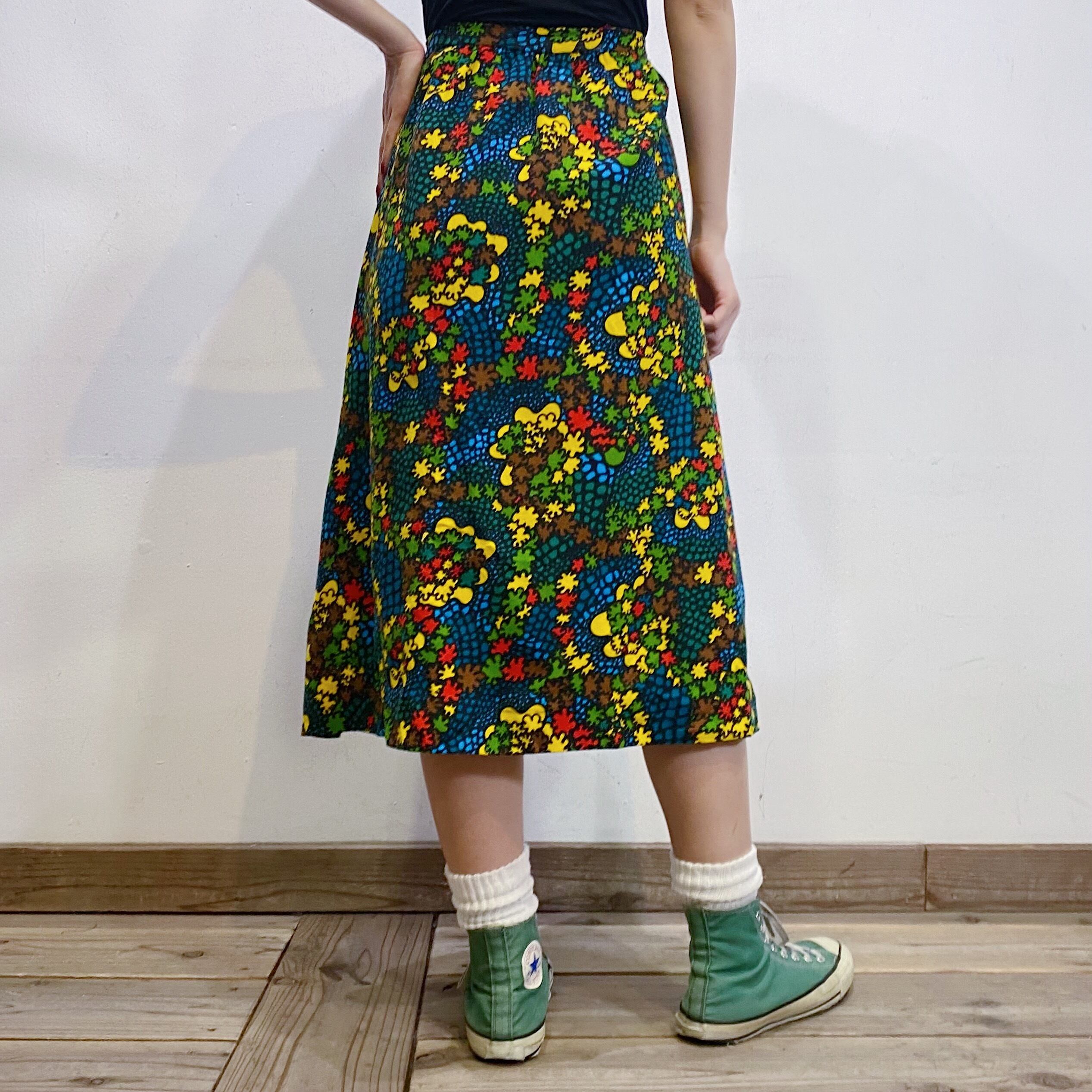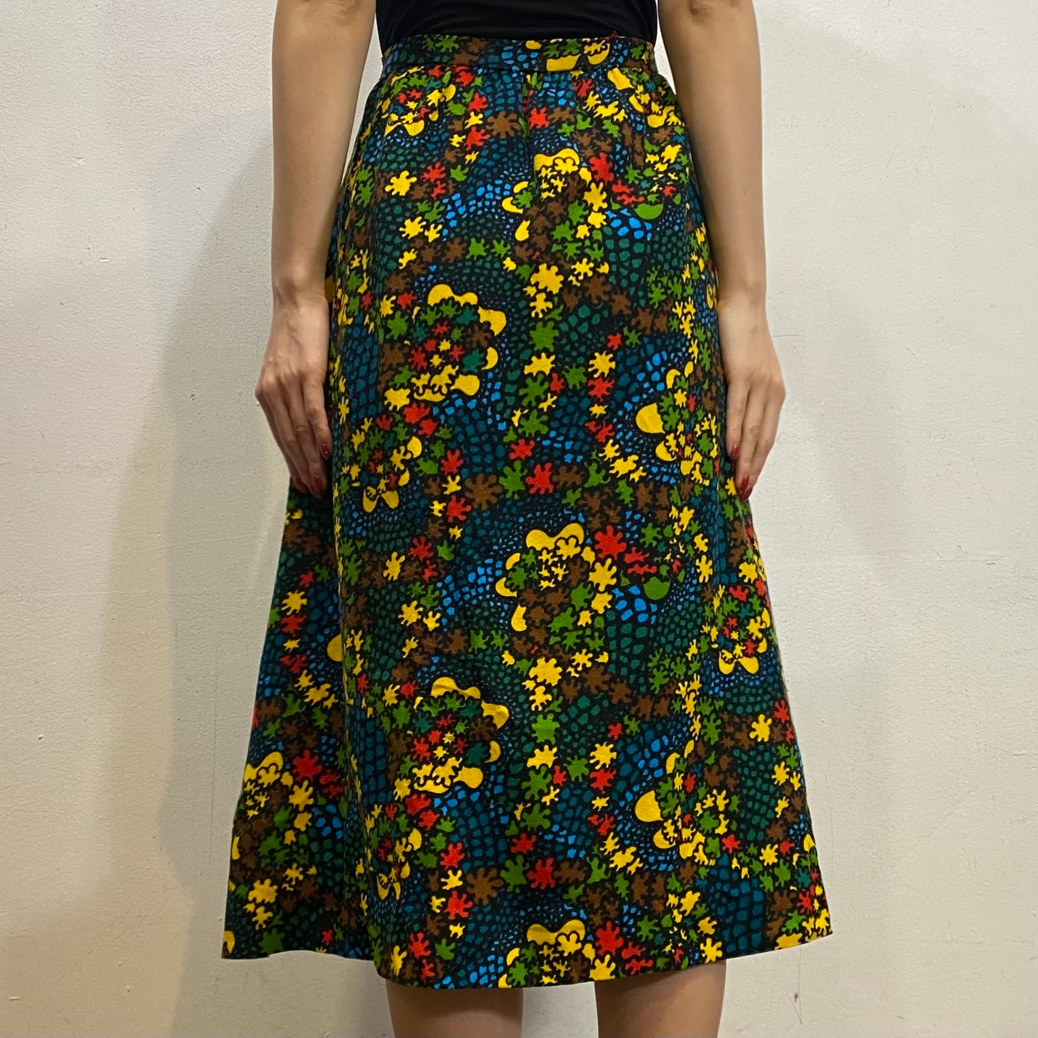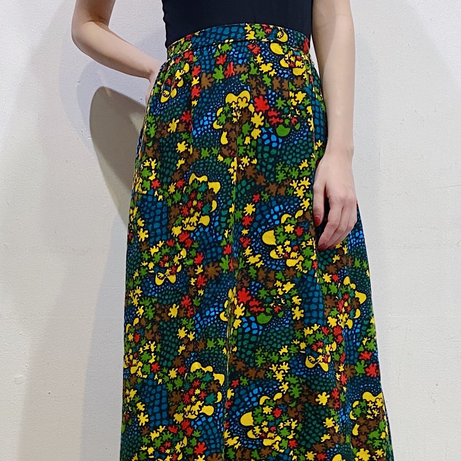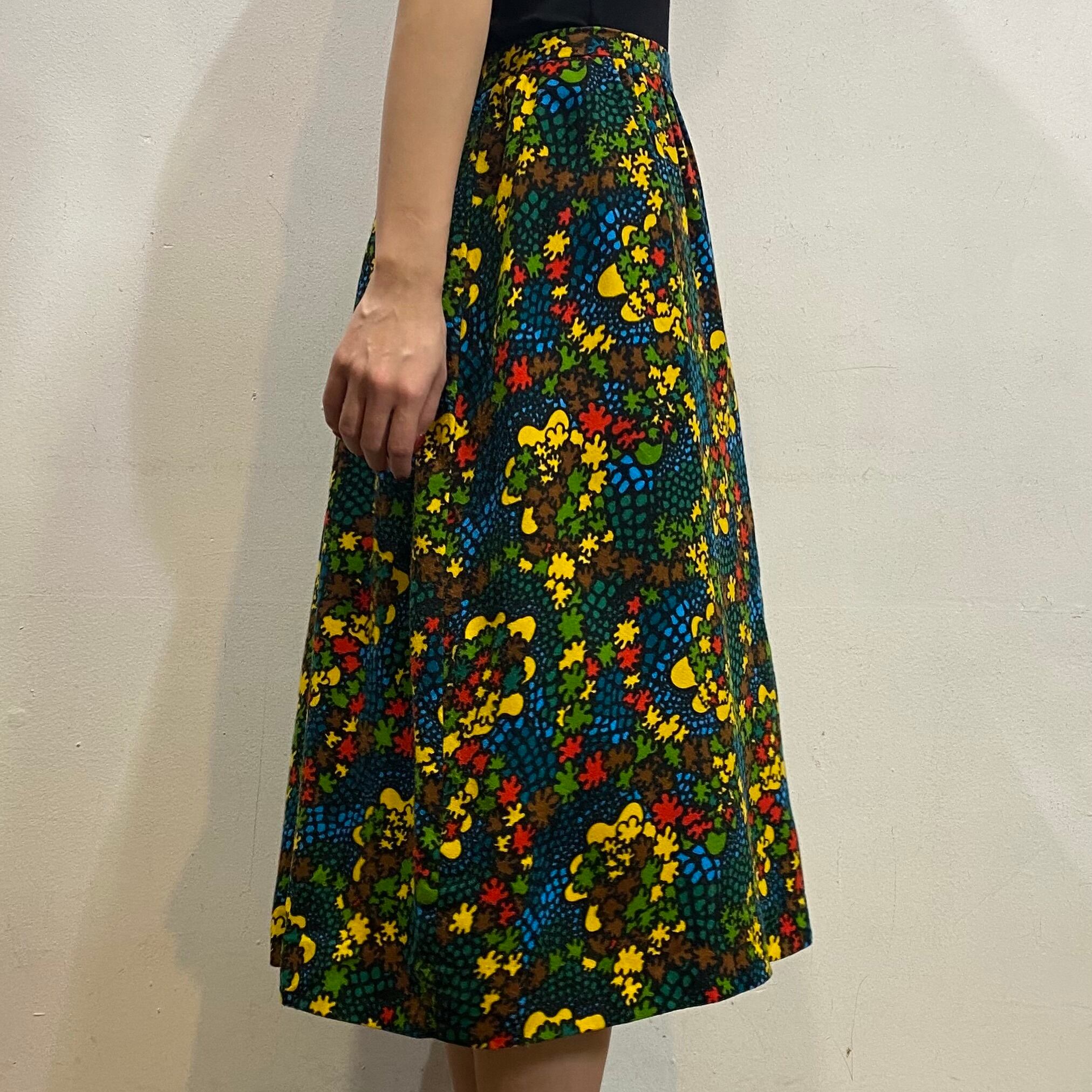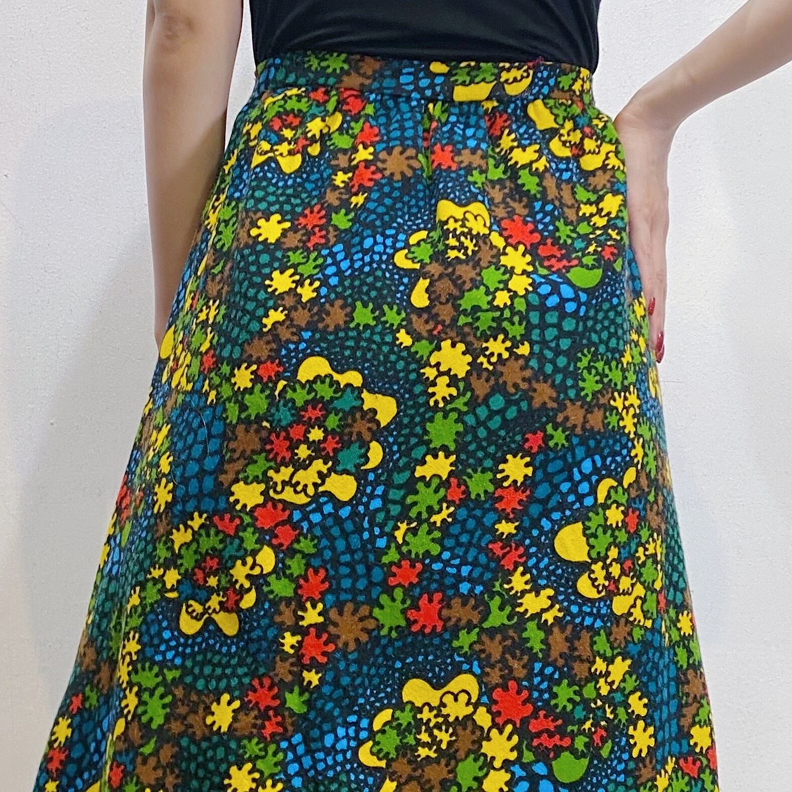 ブラックベースにカラフルなテキスタイルが可愛い、70sのスカートです。