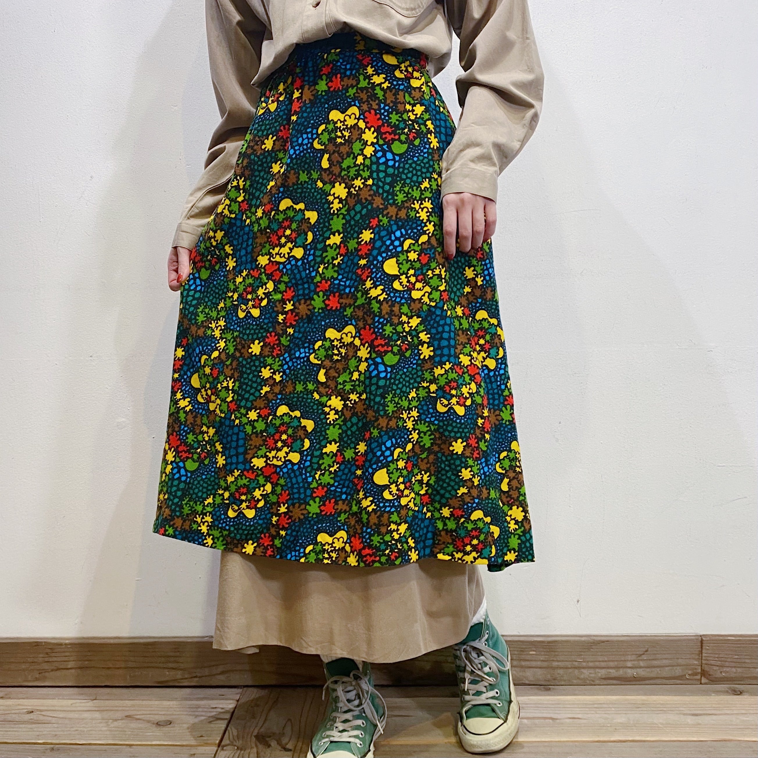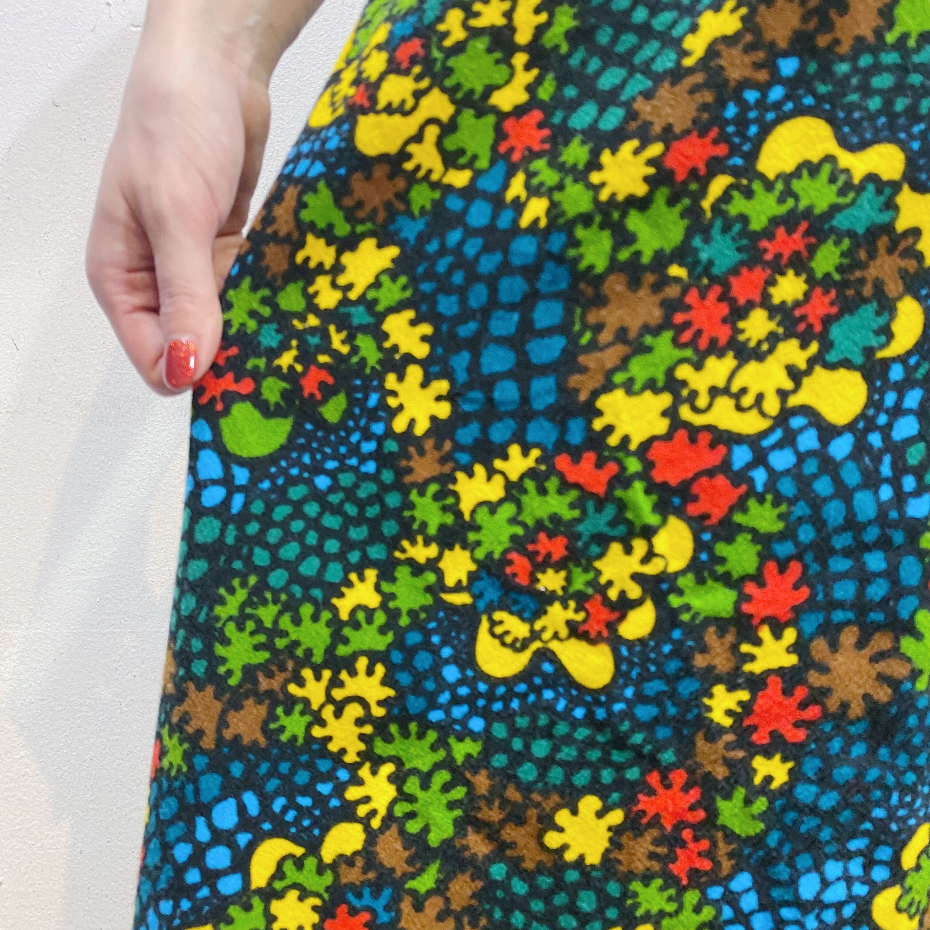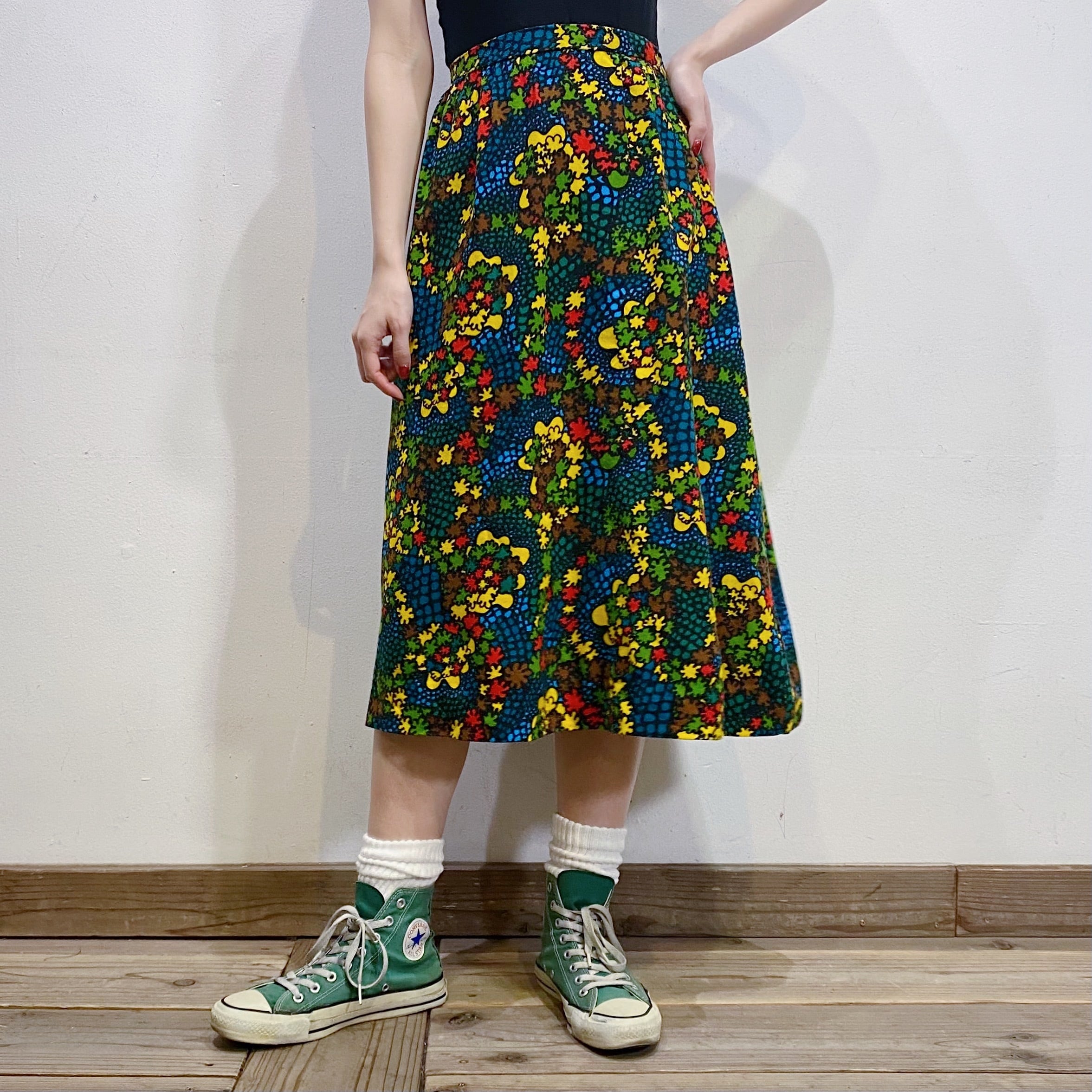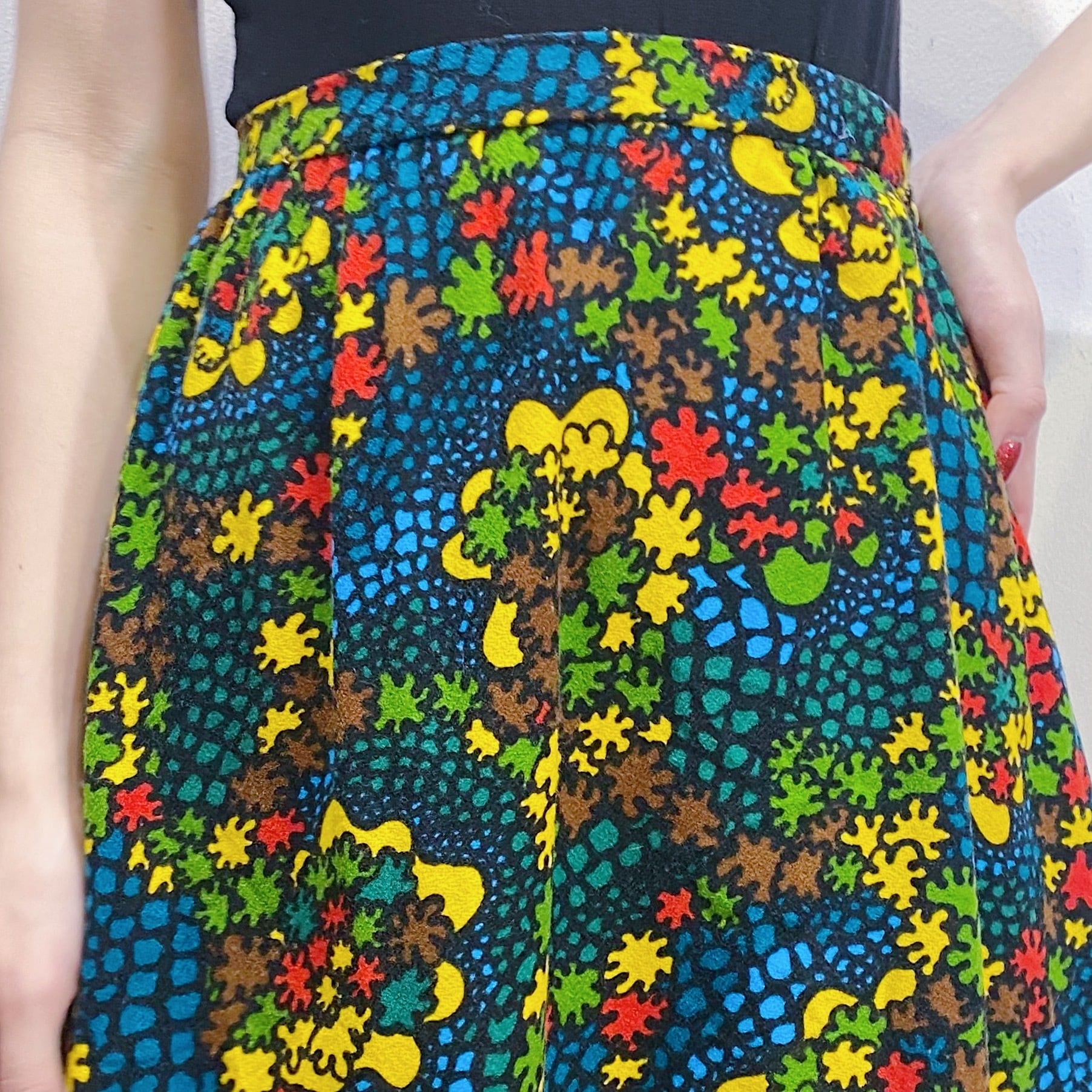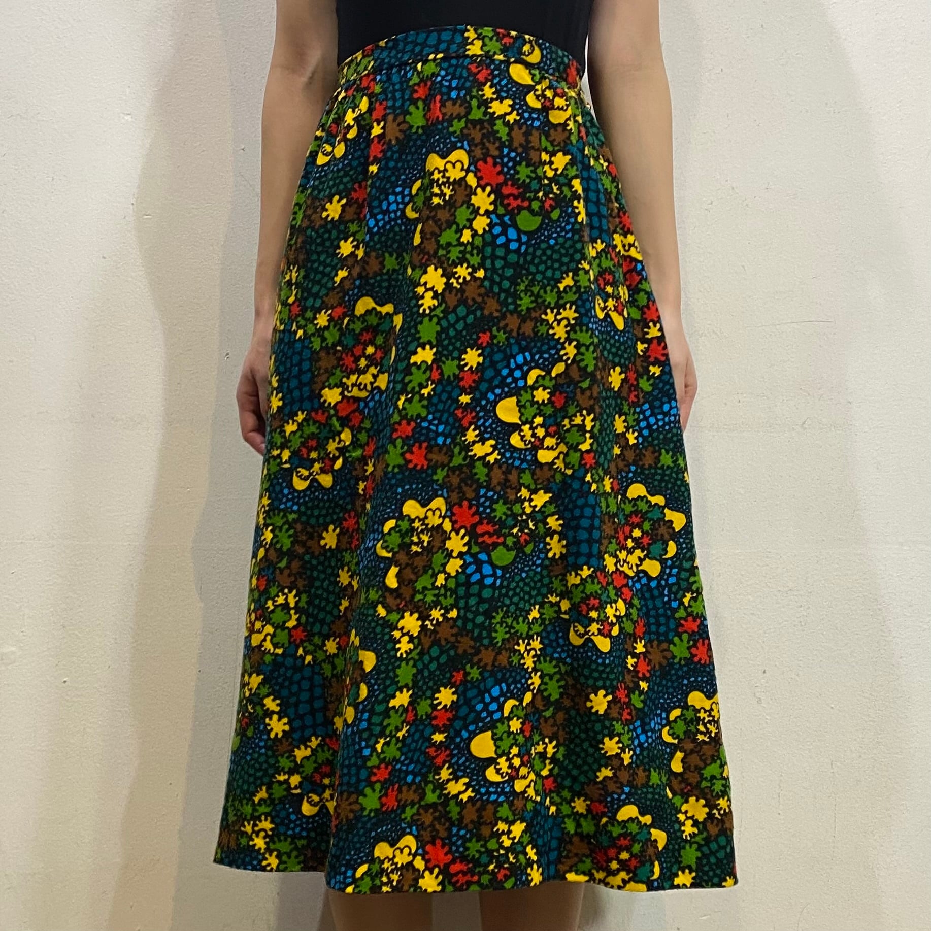 ブラックベースにカラフルなテキスタイルが可愛い、70sのスカートです。