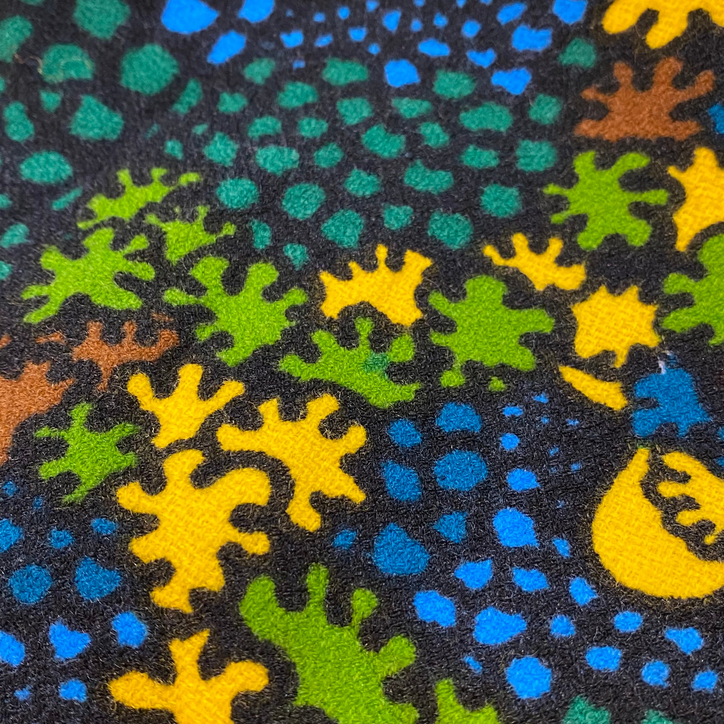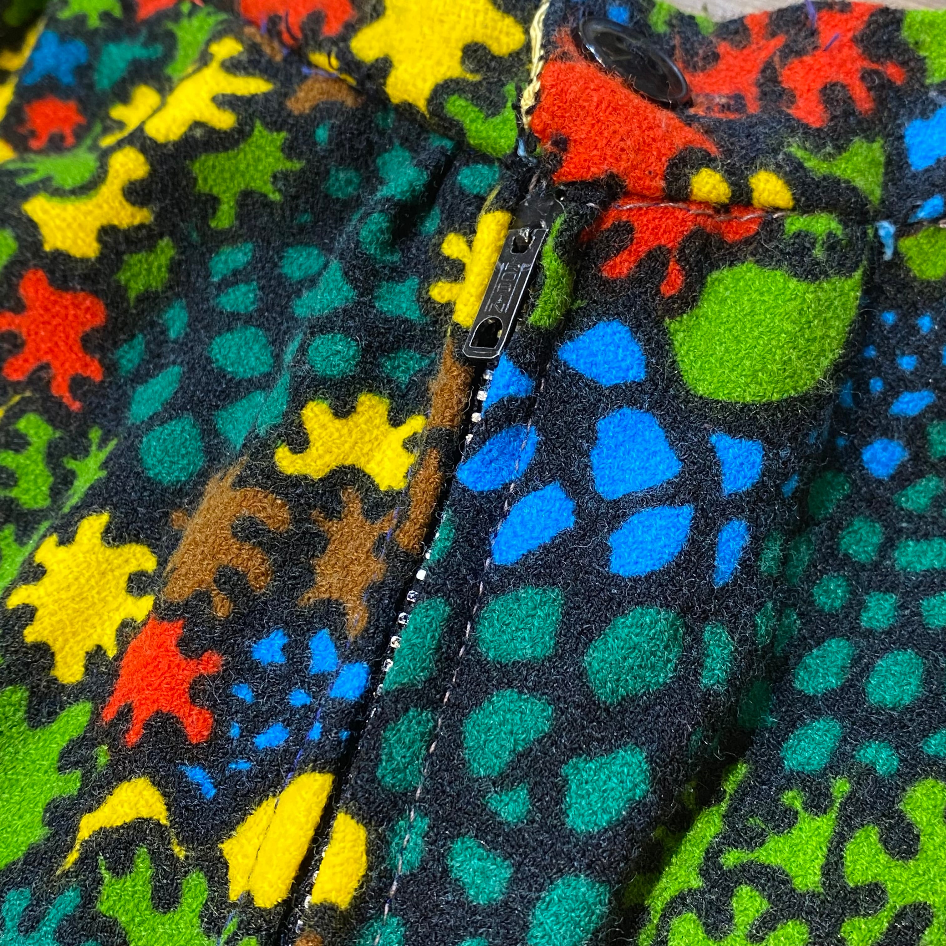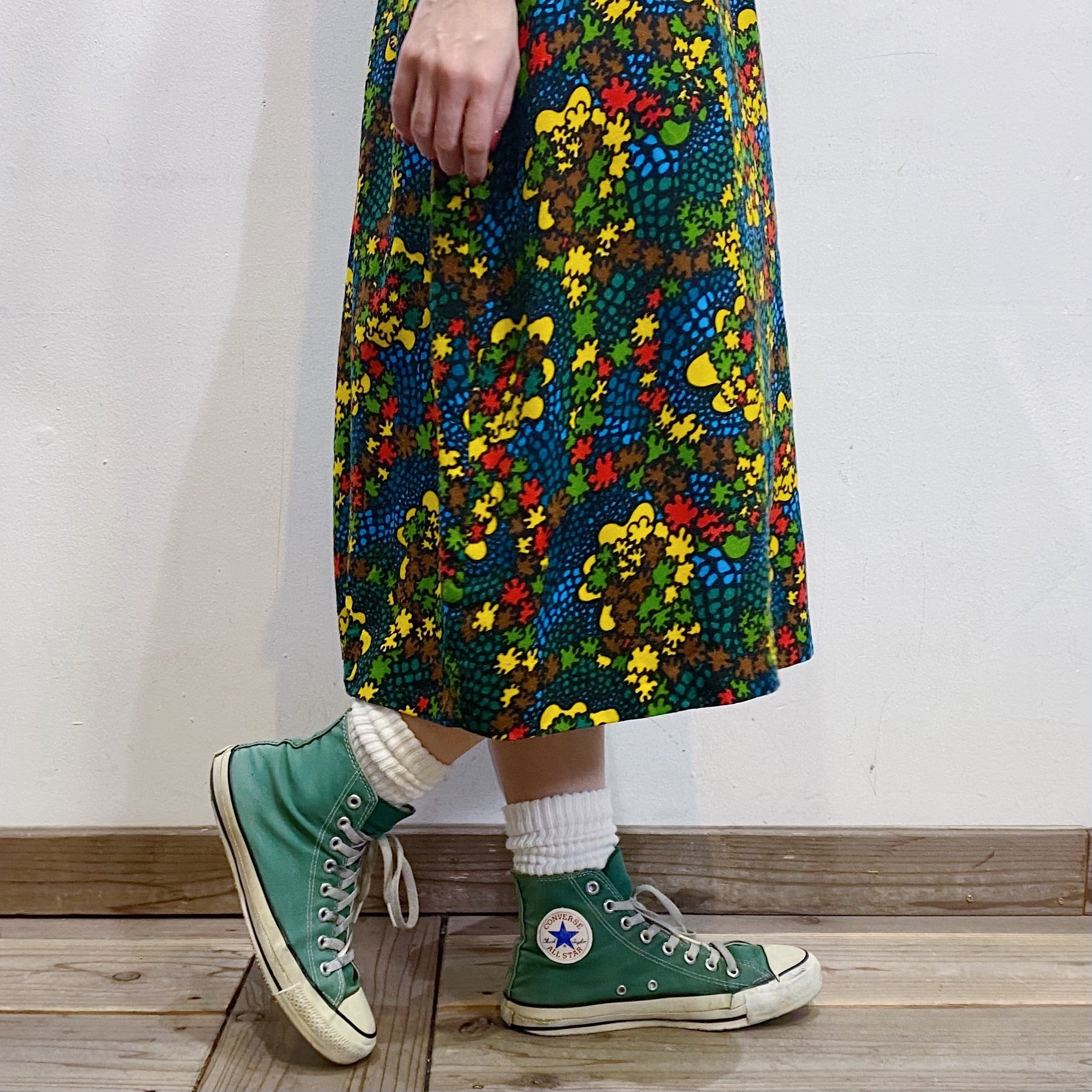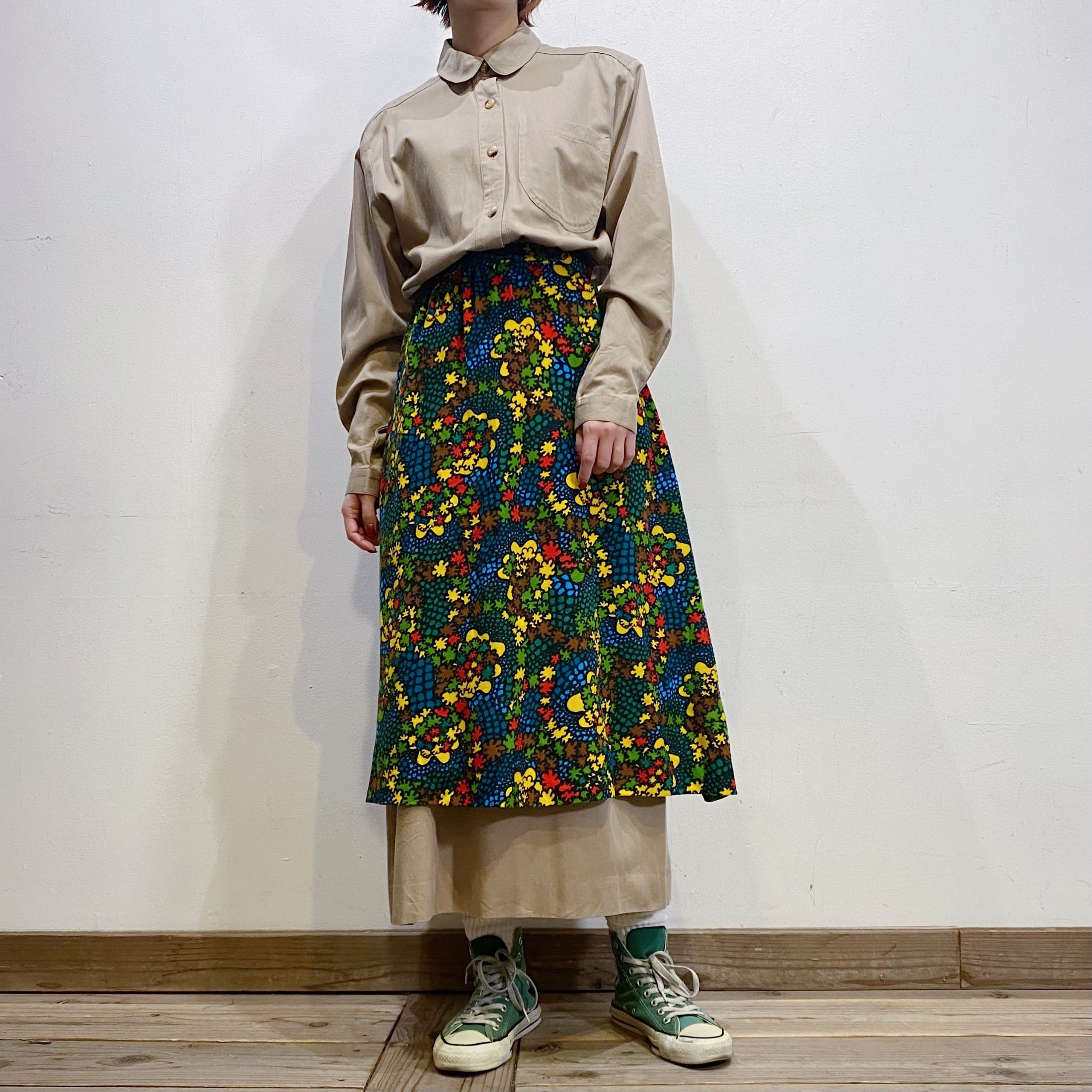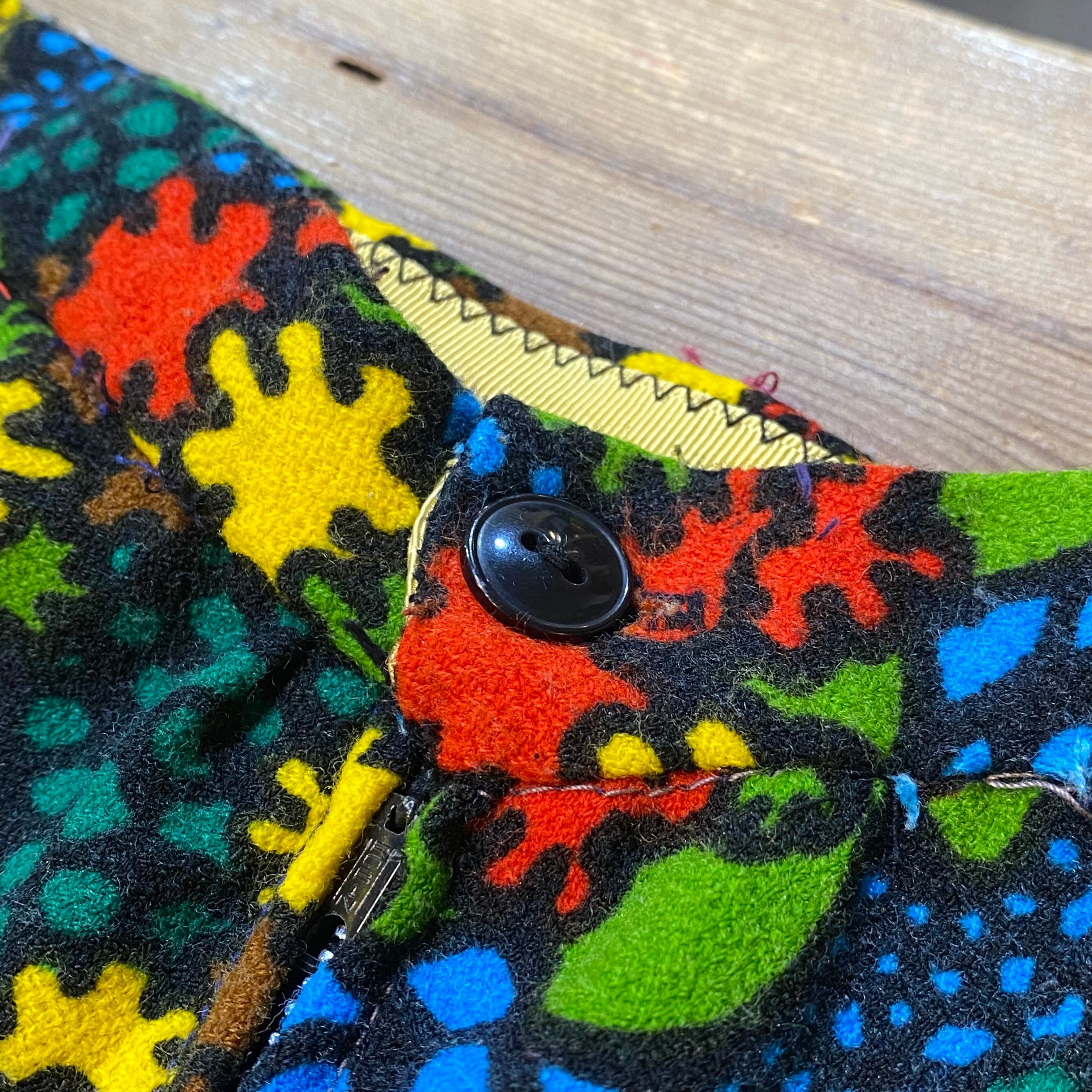 ブラックベースにカラフルなテキスタイルが可愛い、70sのスカートです。