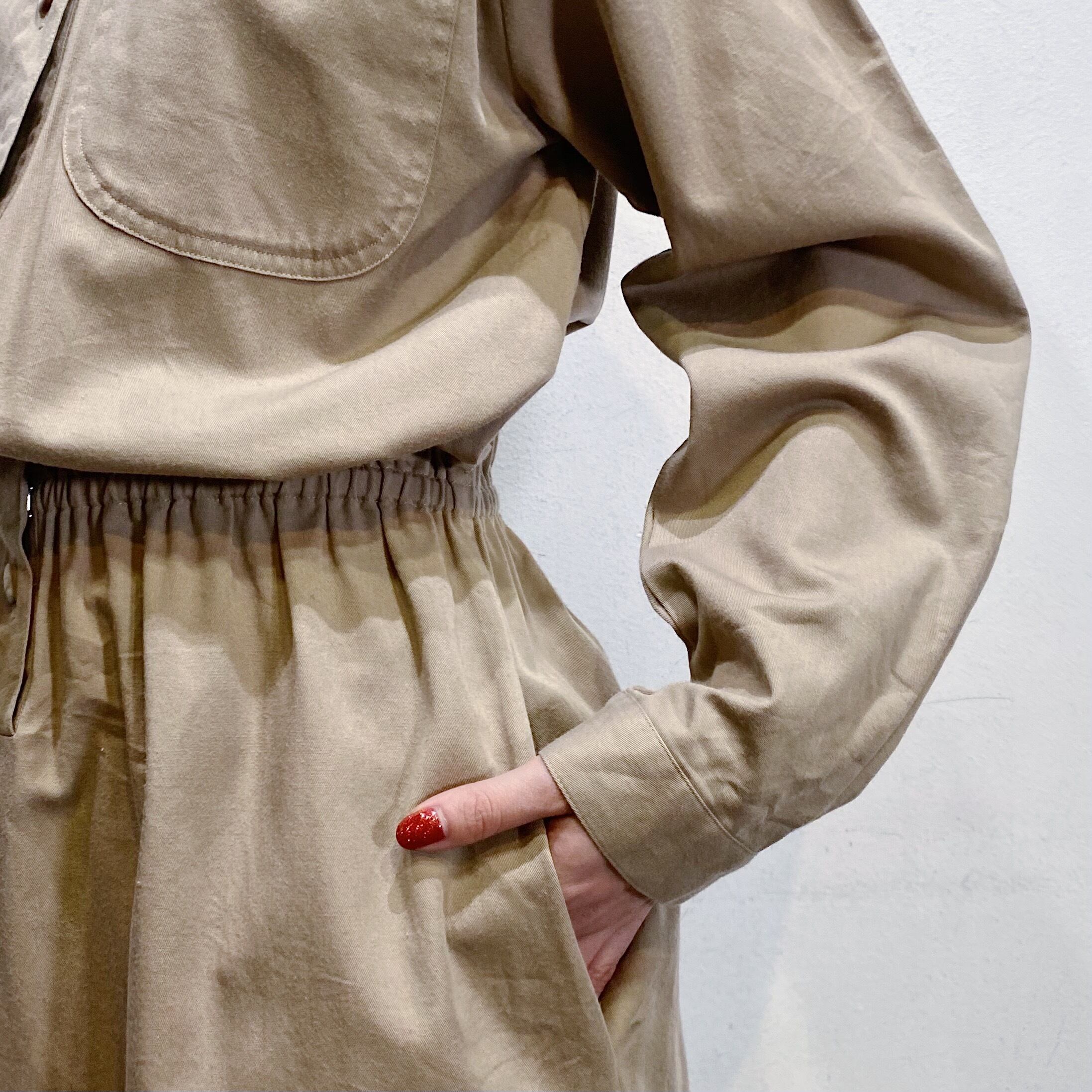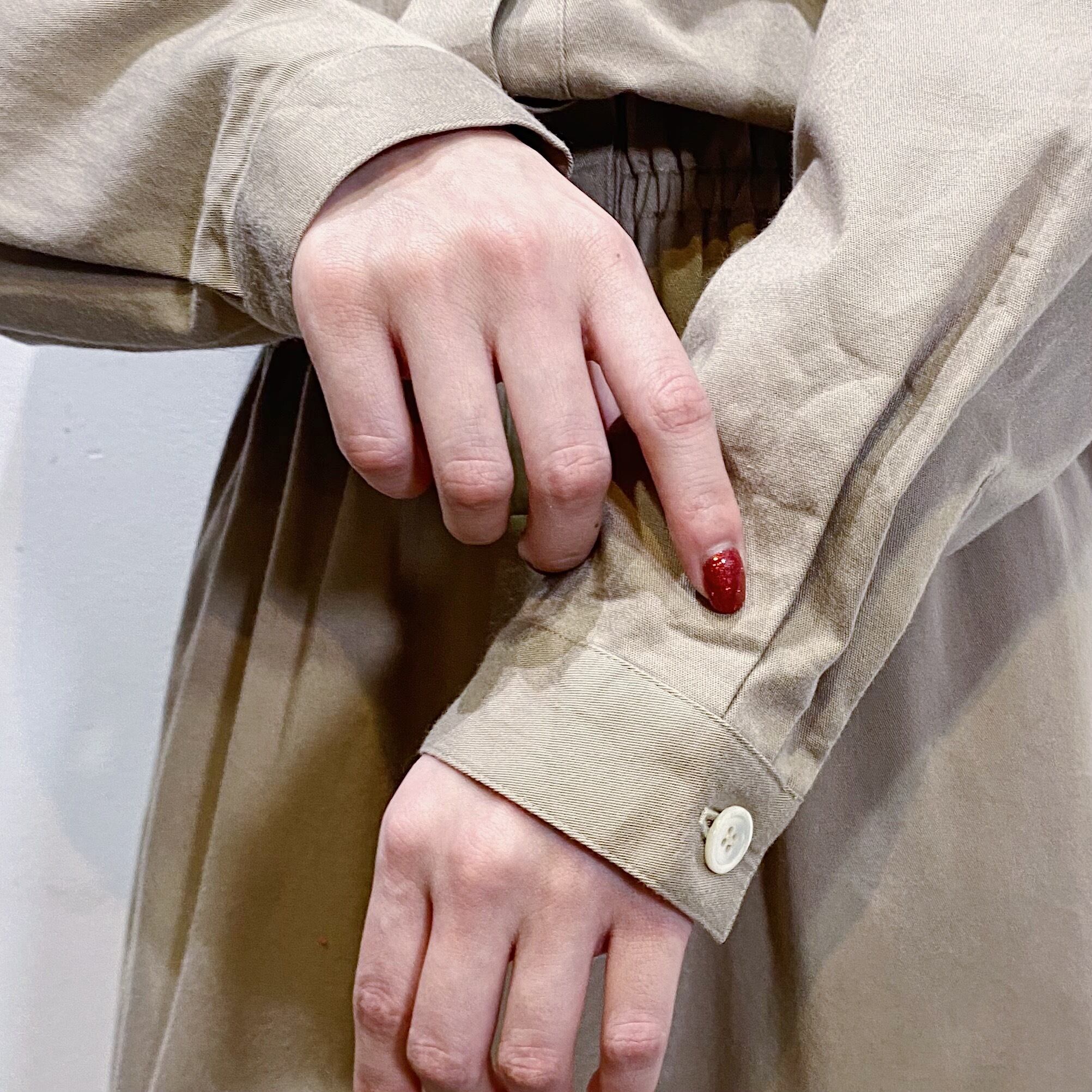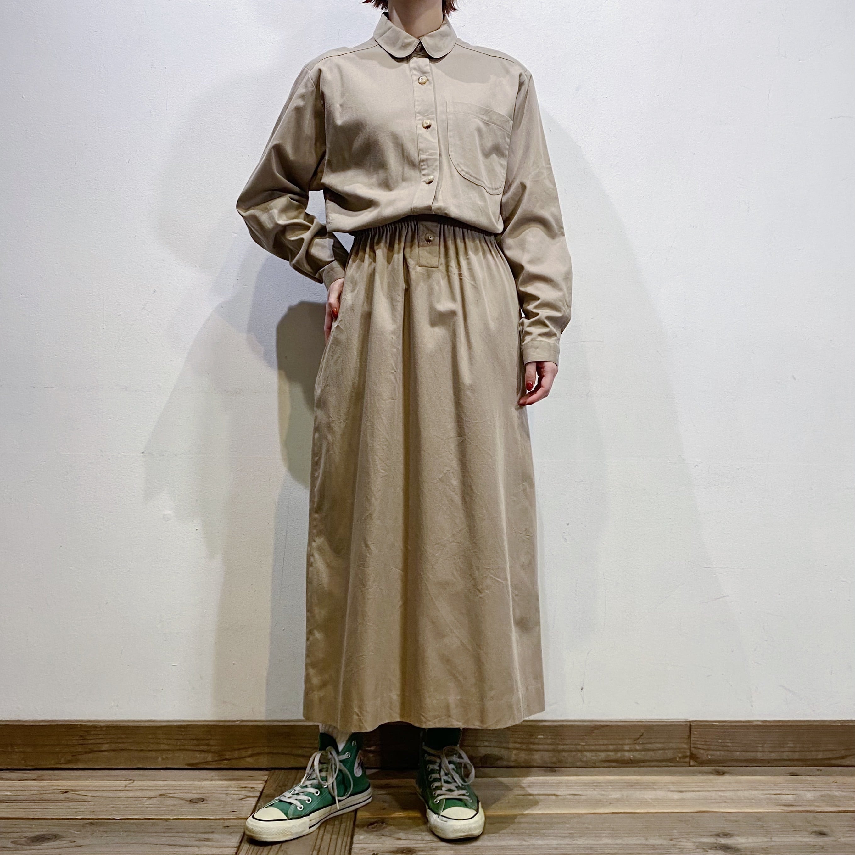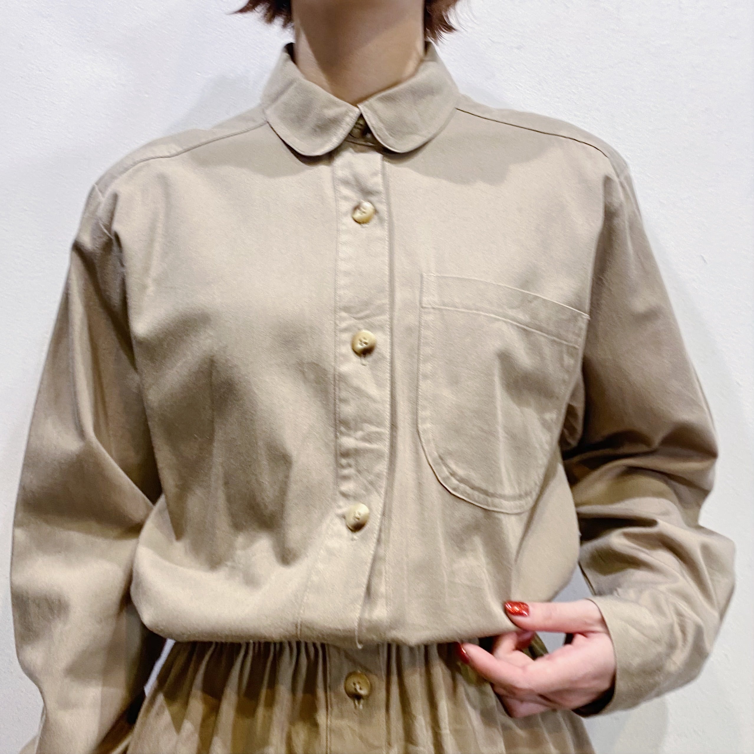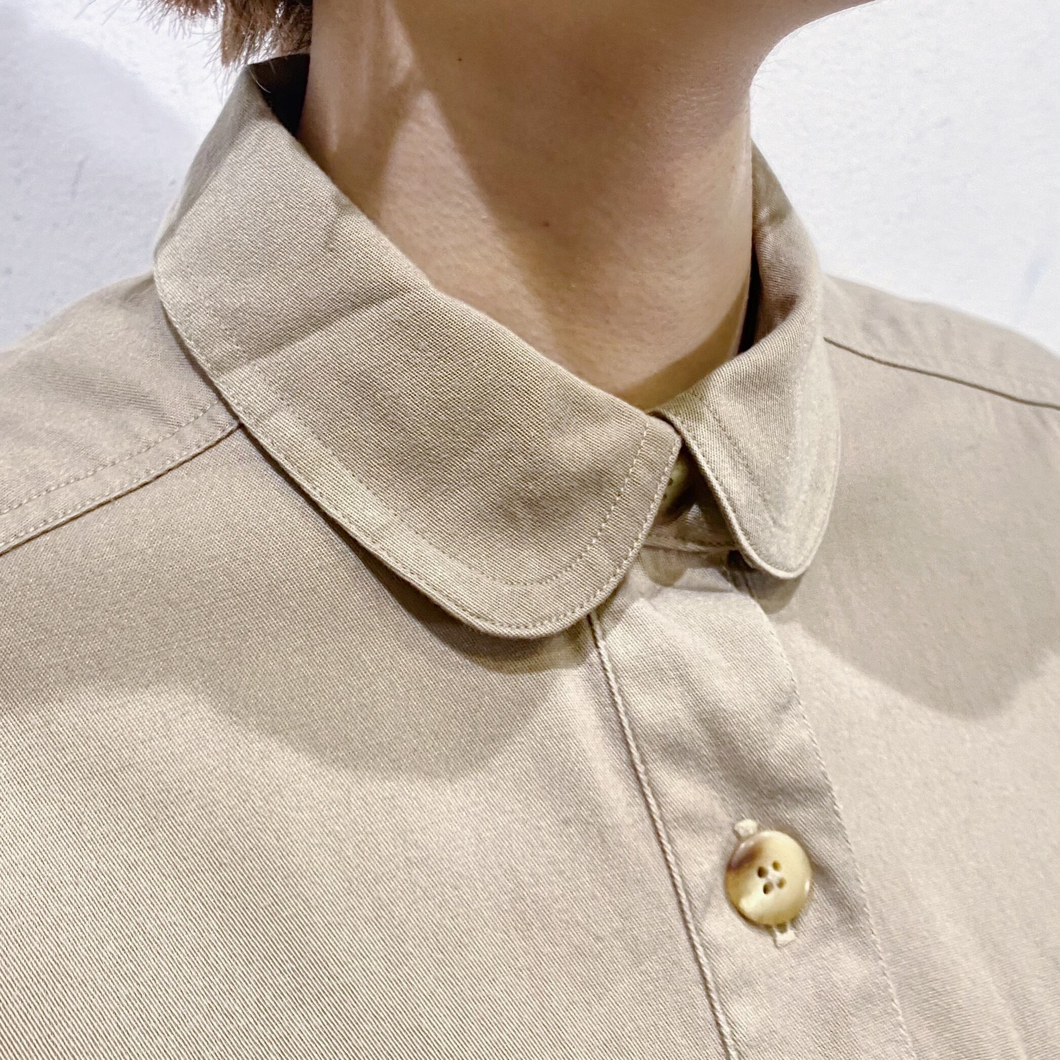 ベージュカラーで大変着こなしやすい、シャツワンピースです。