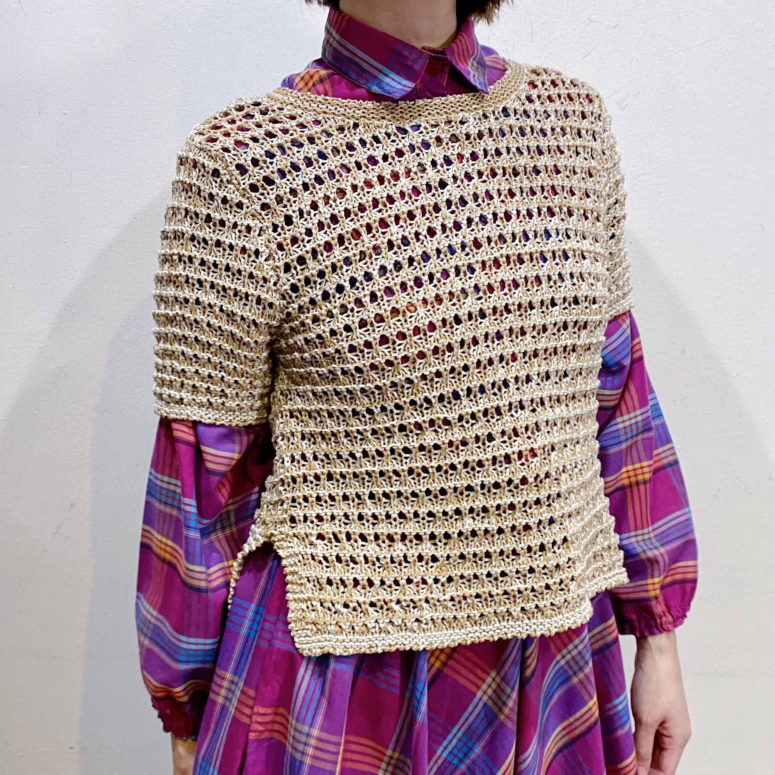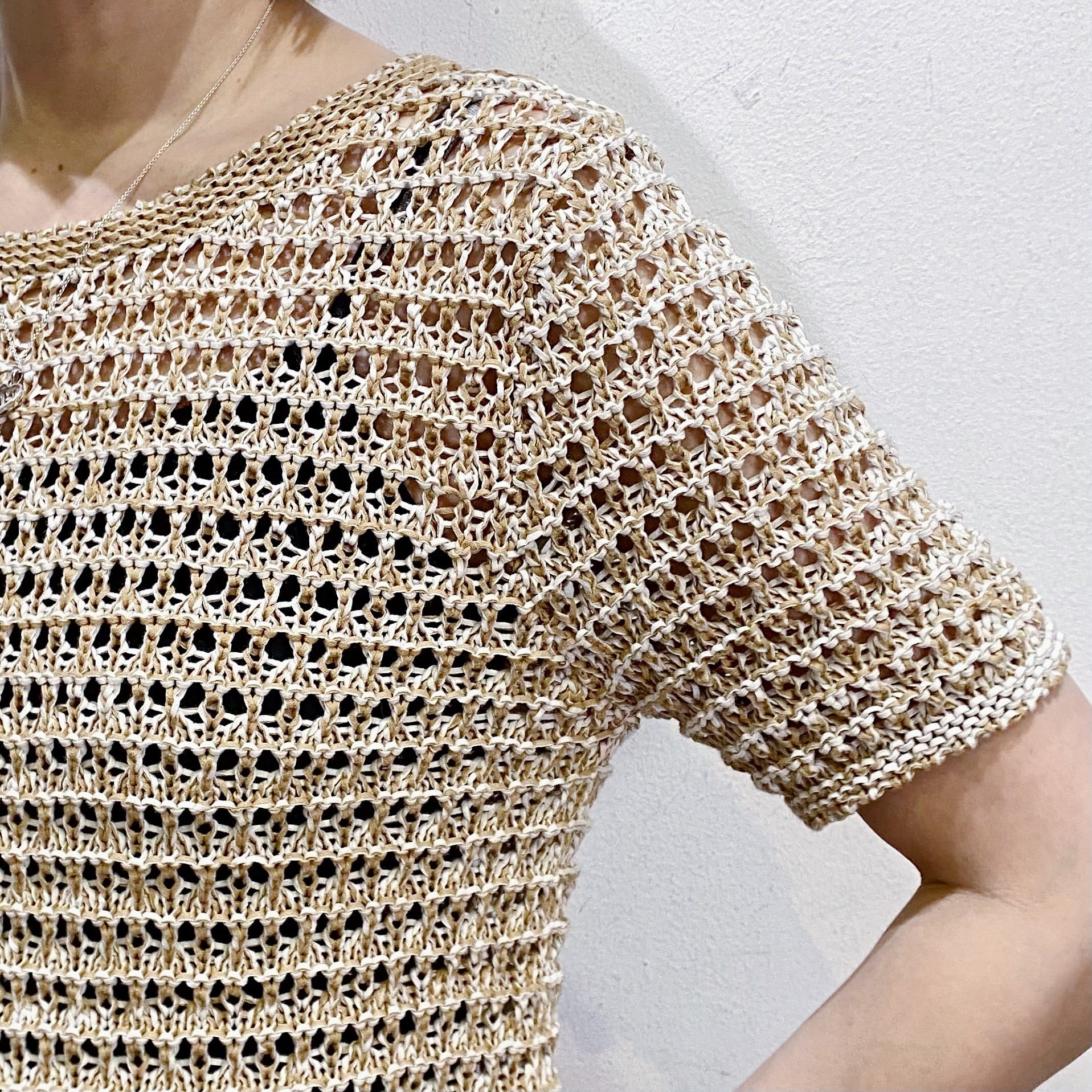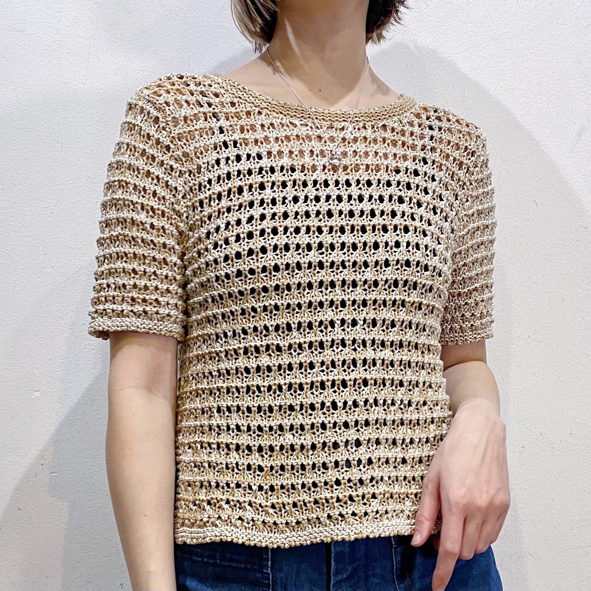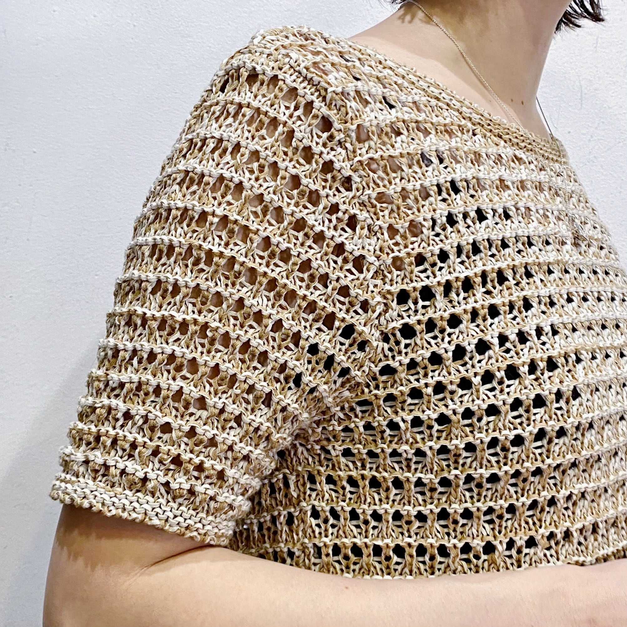 ベージュカラーで大変使い勝手の良い、クロシェトップスです。