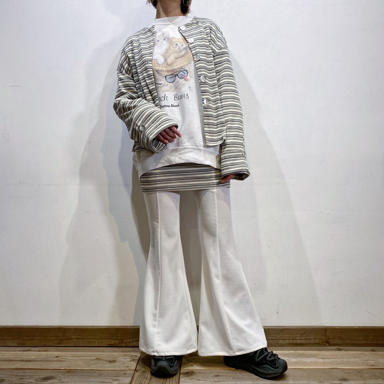 シンプルにデニムパンツやチノパンなどと合わせても可愛いですし、着用写真のような柄ボトムスとも相性良く着られます。