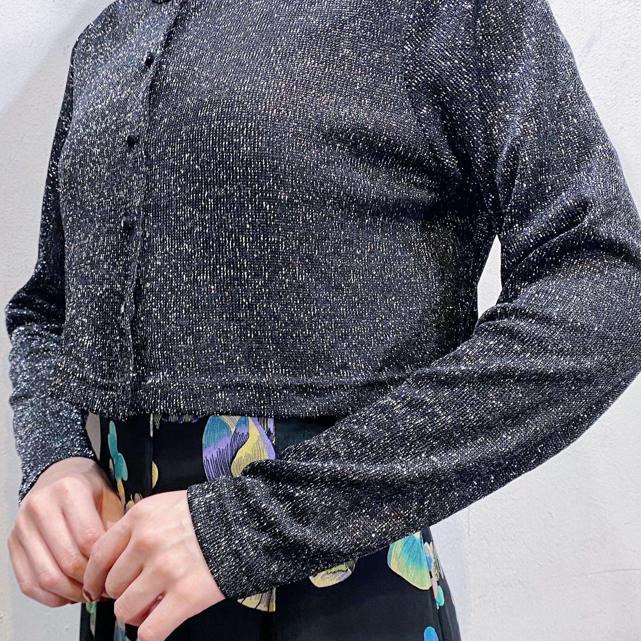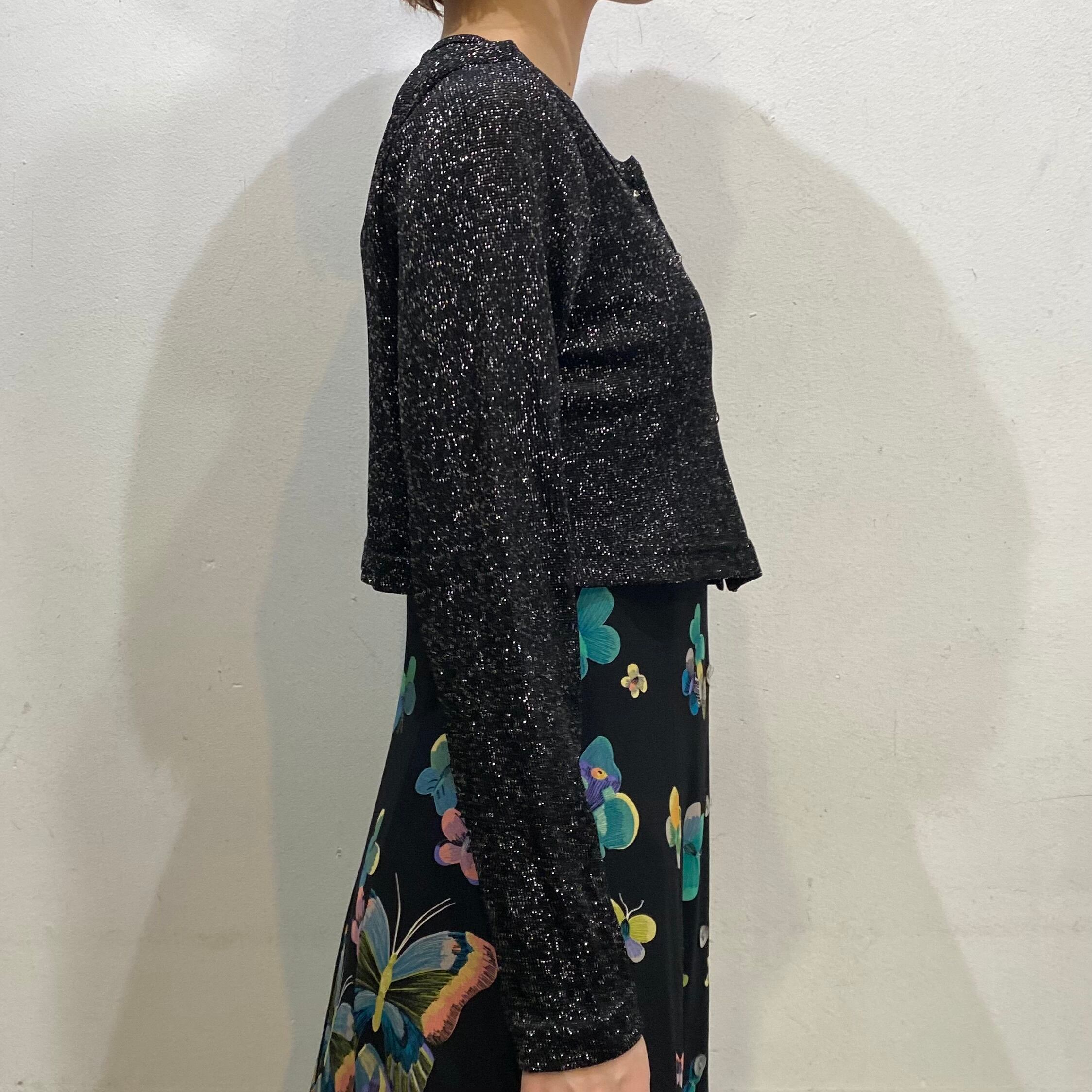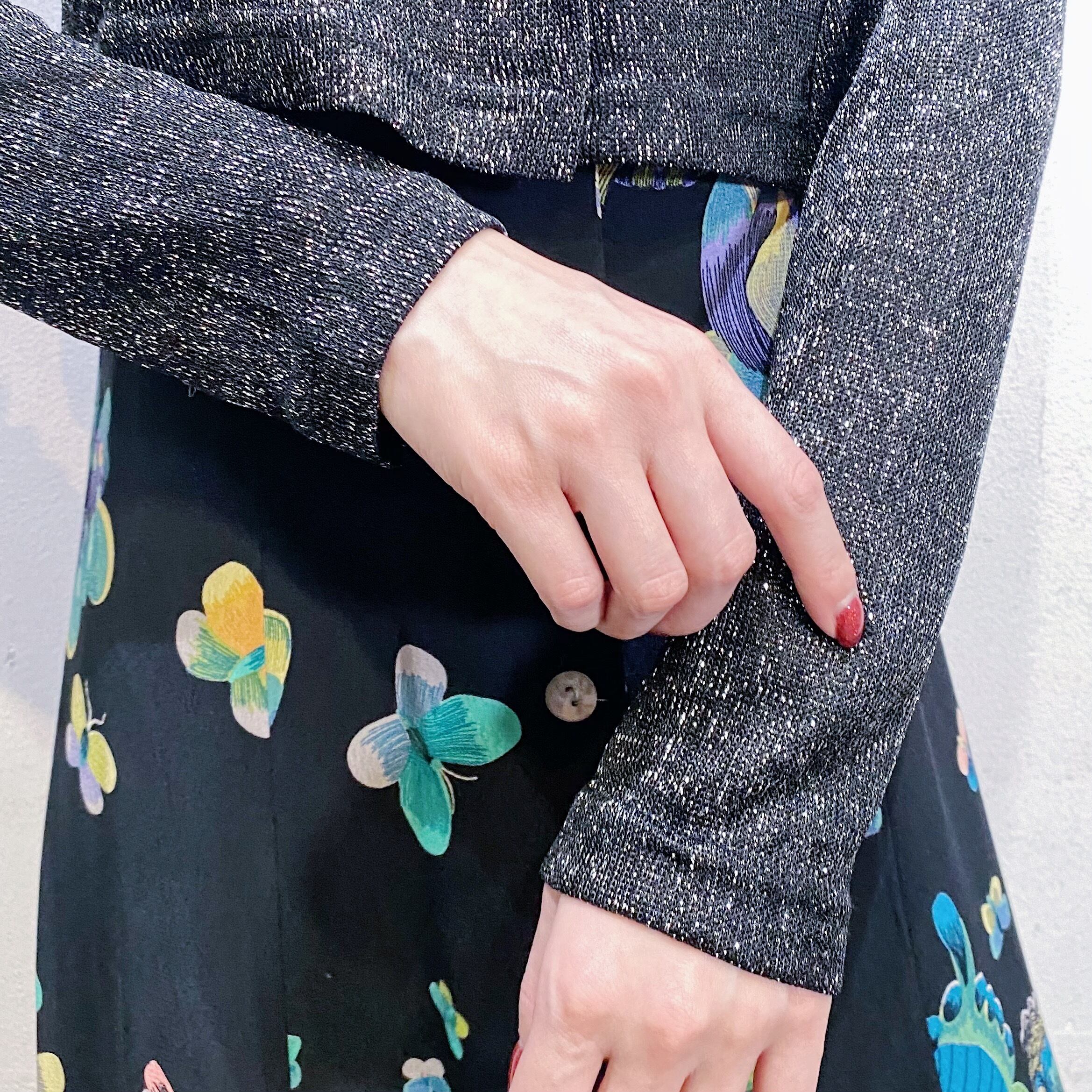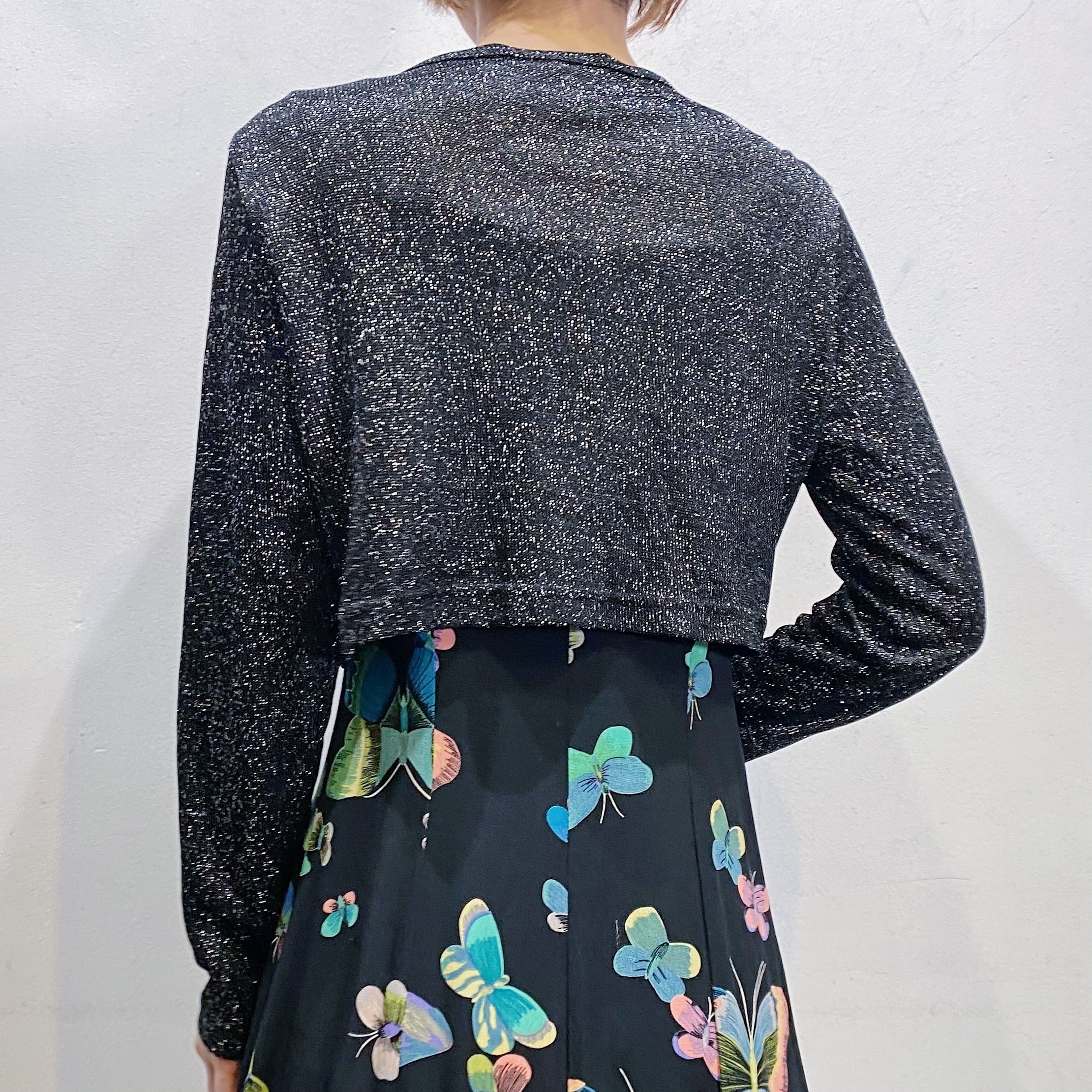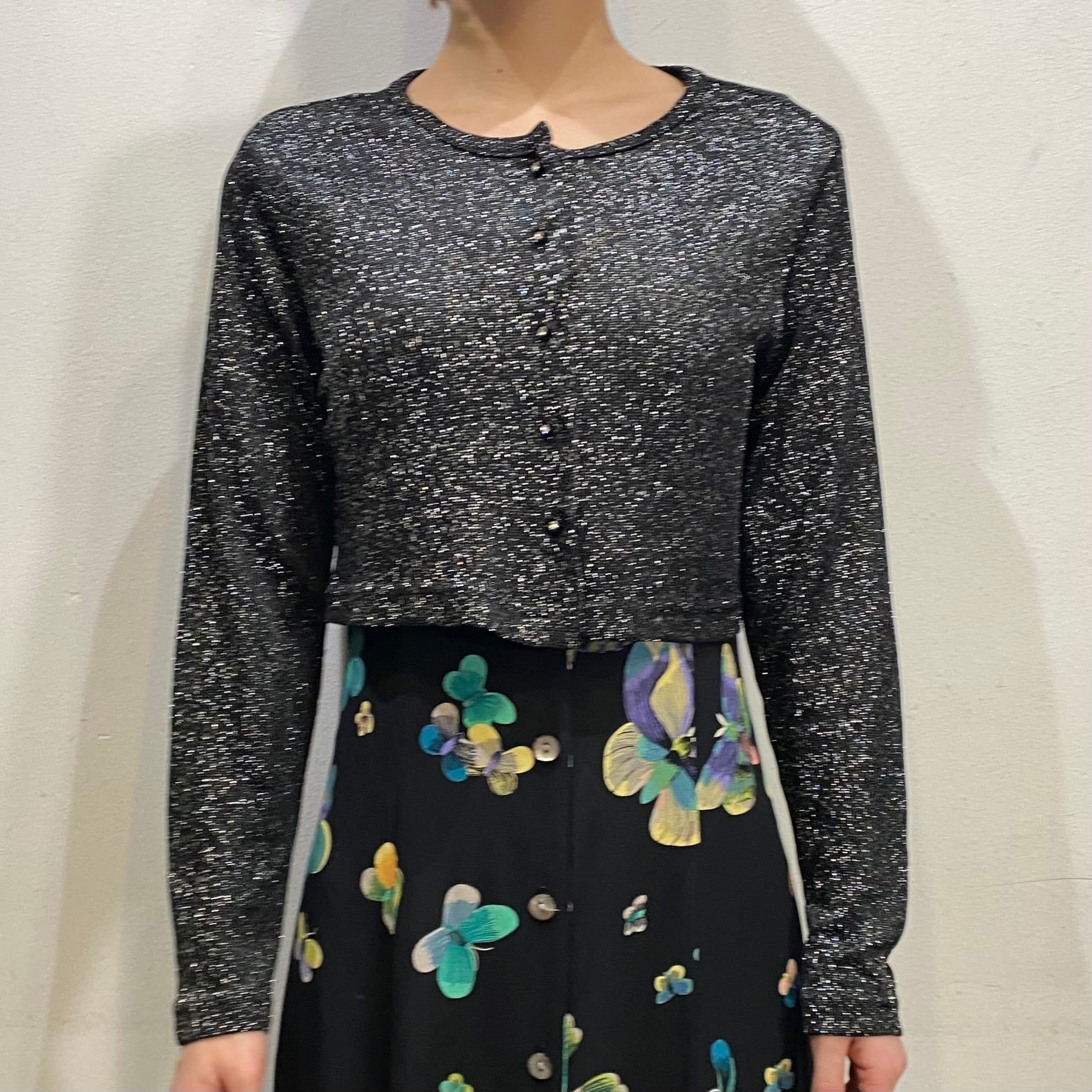 ブラックベースにシルバーのラメ糸が可愛い、80年代のカーディガンです。