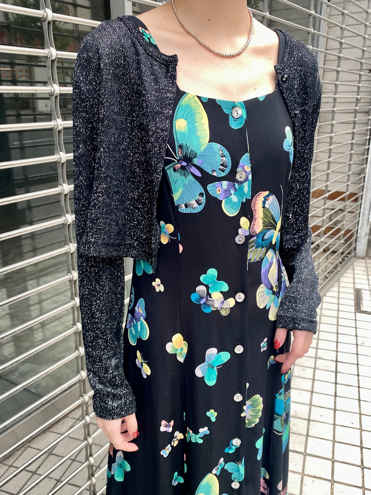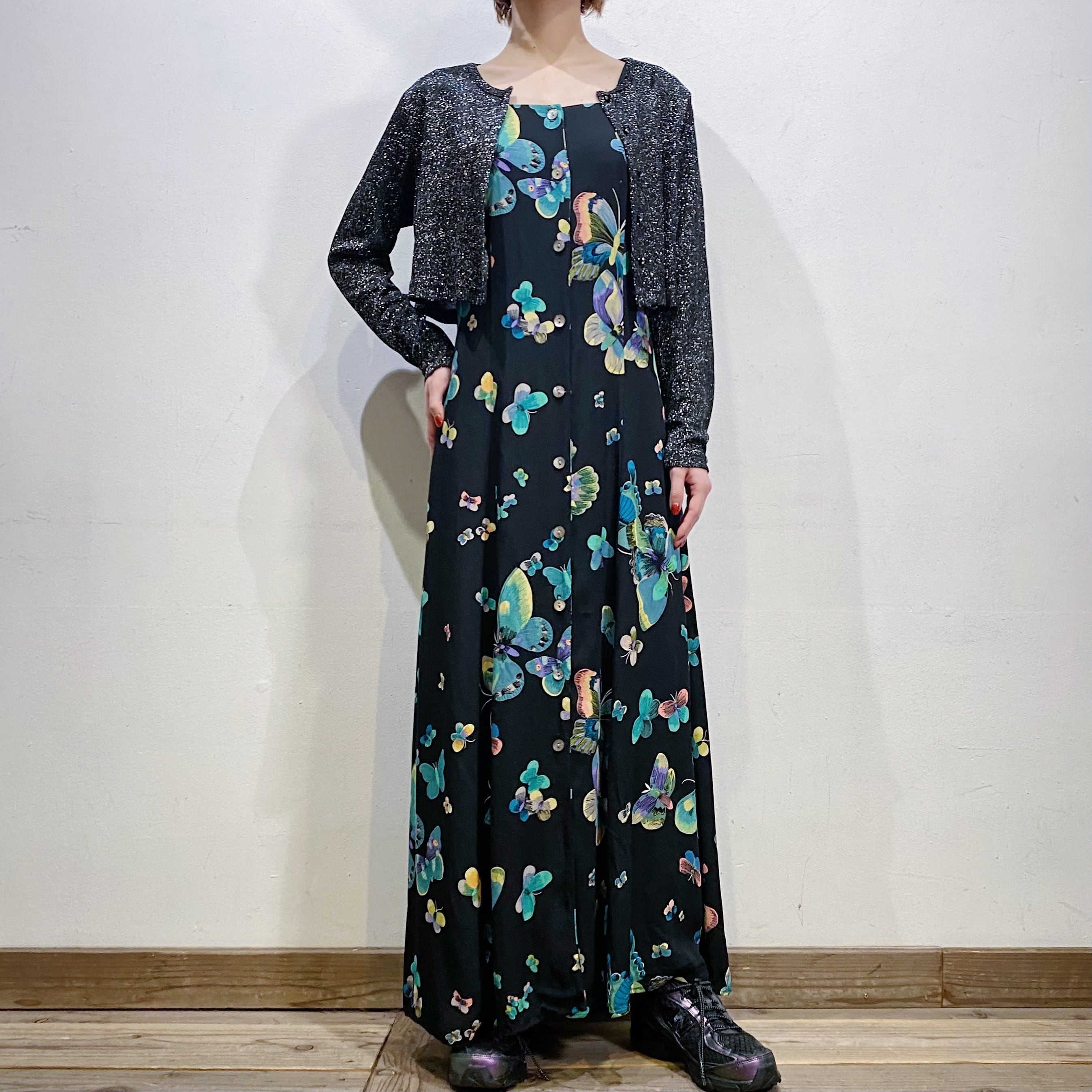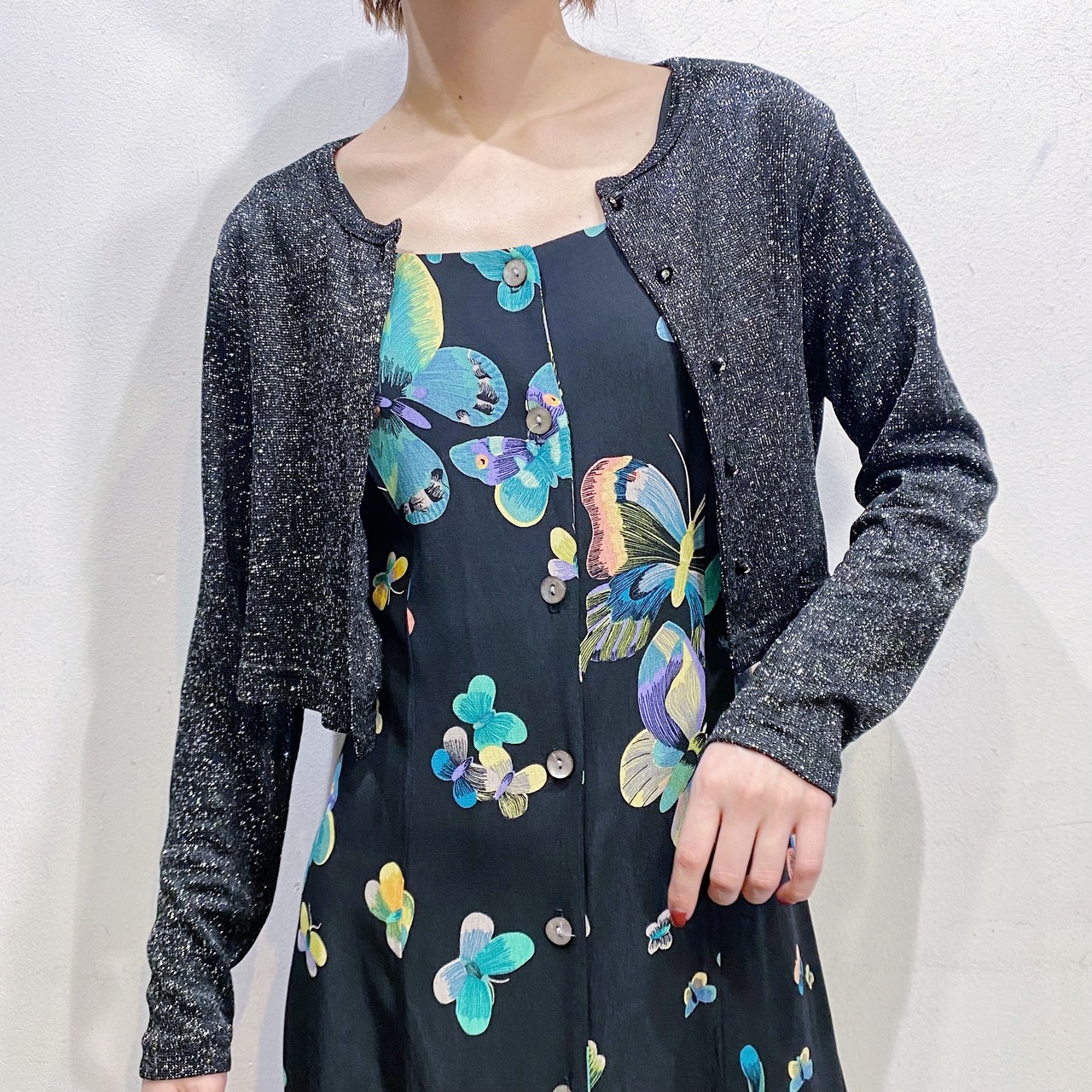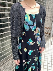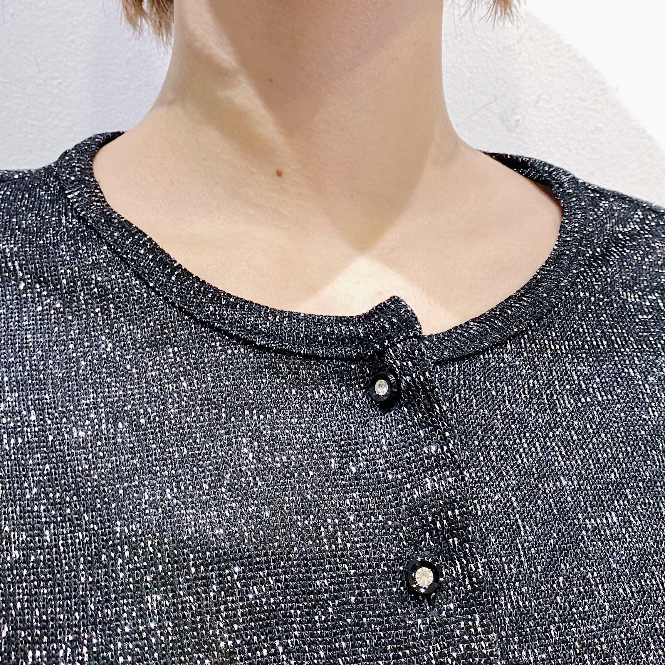 ブラックベースにシルバーのラメ糸が可愛い、80年代のカーディガンです。