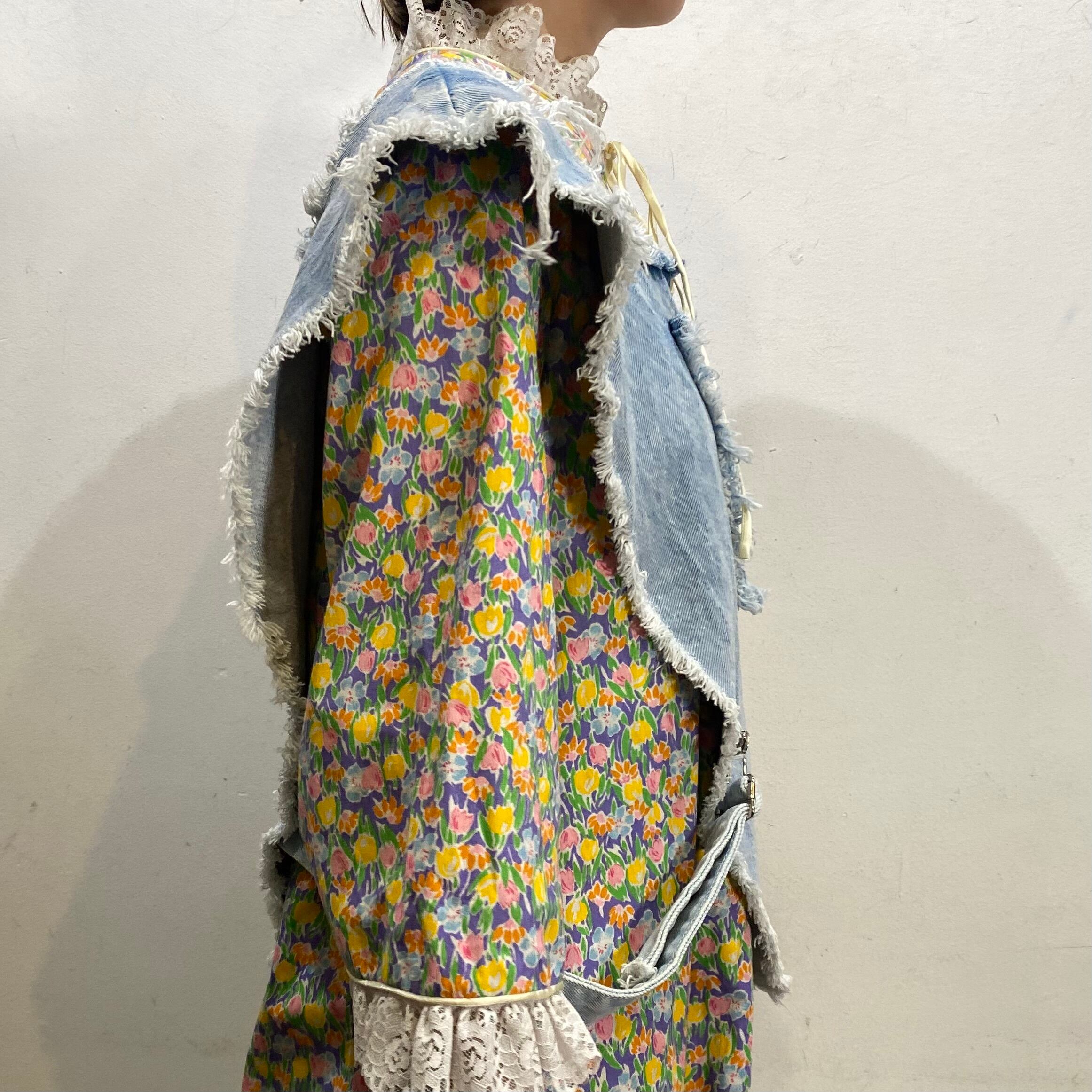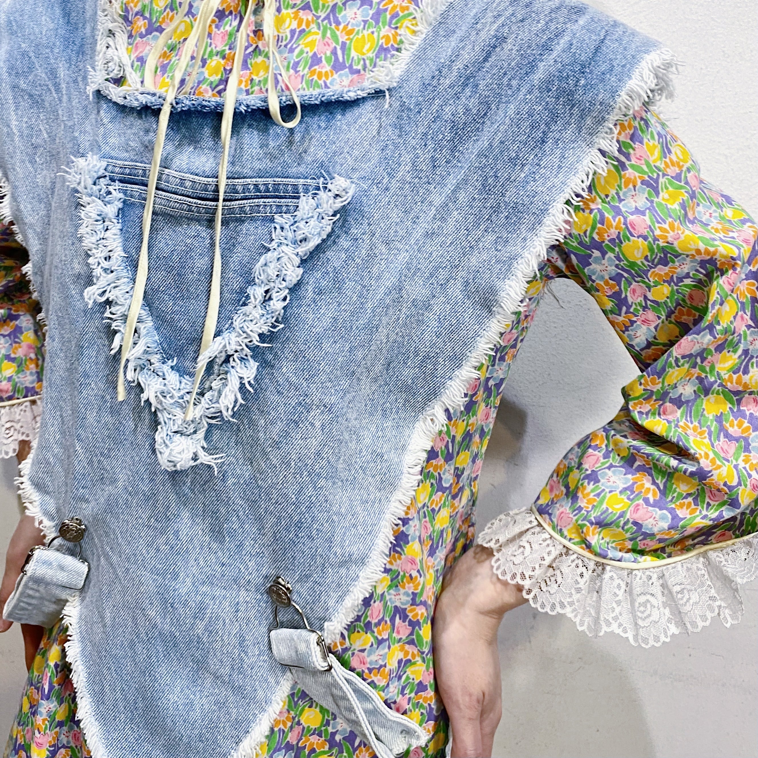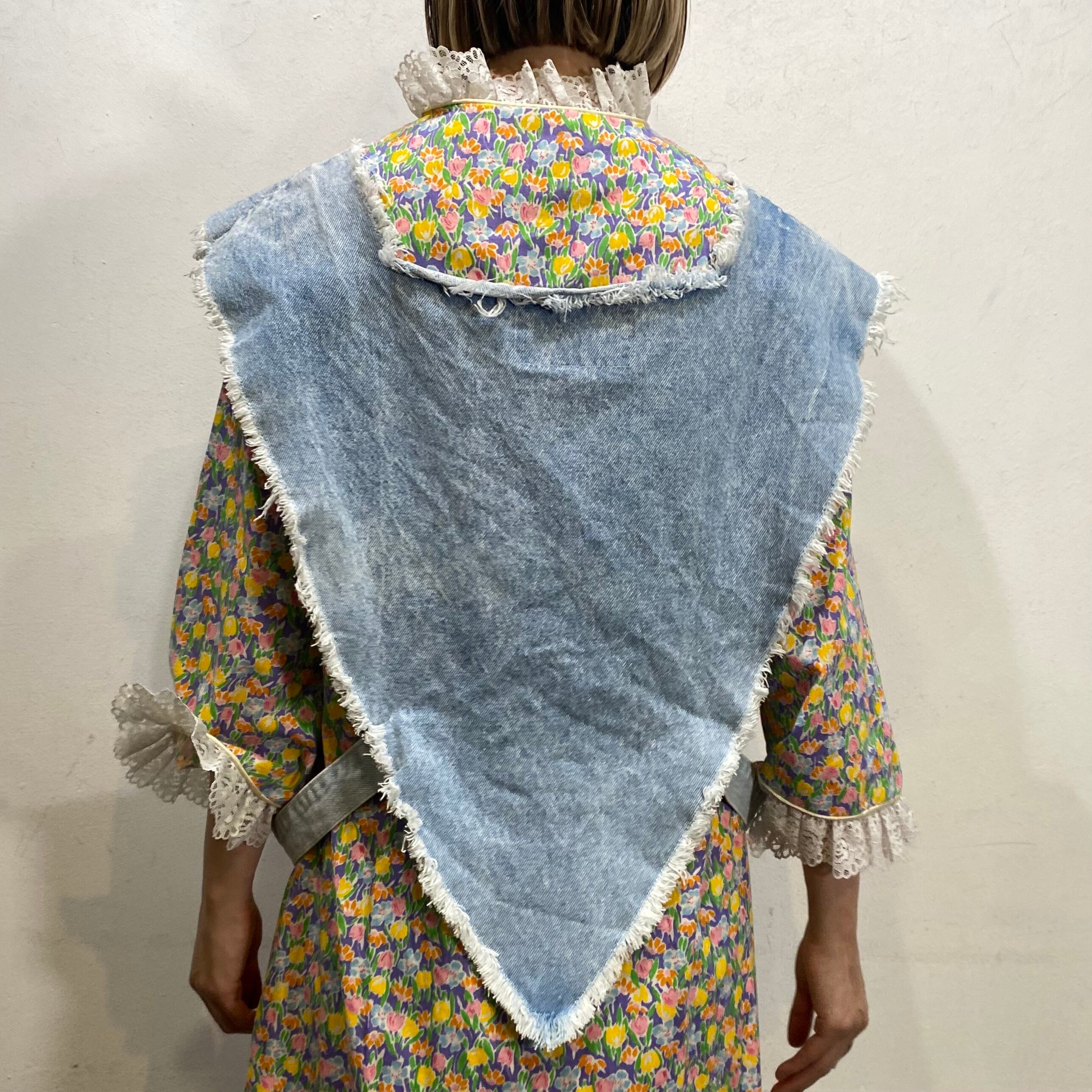 逆三角形のようなフォルムにポンチョのようなデザインがユニークで可愛い、80年代のデニムベストです。