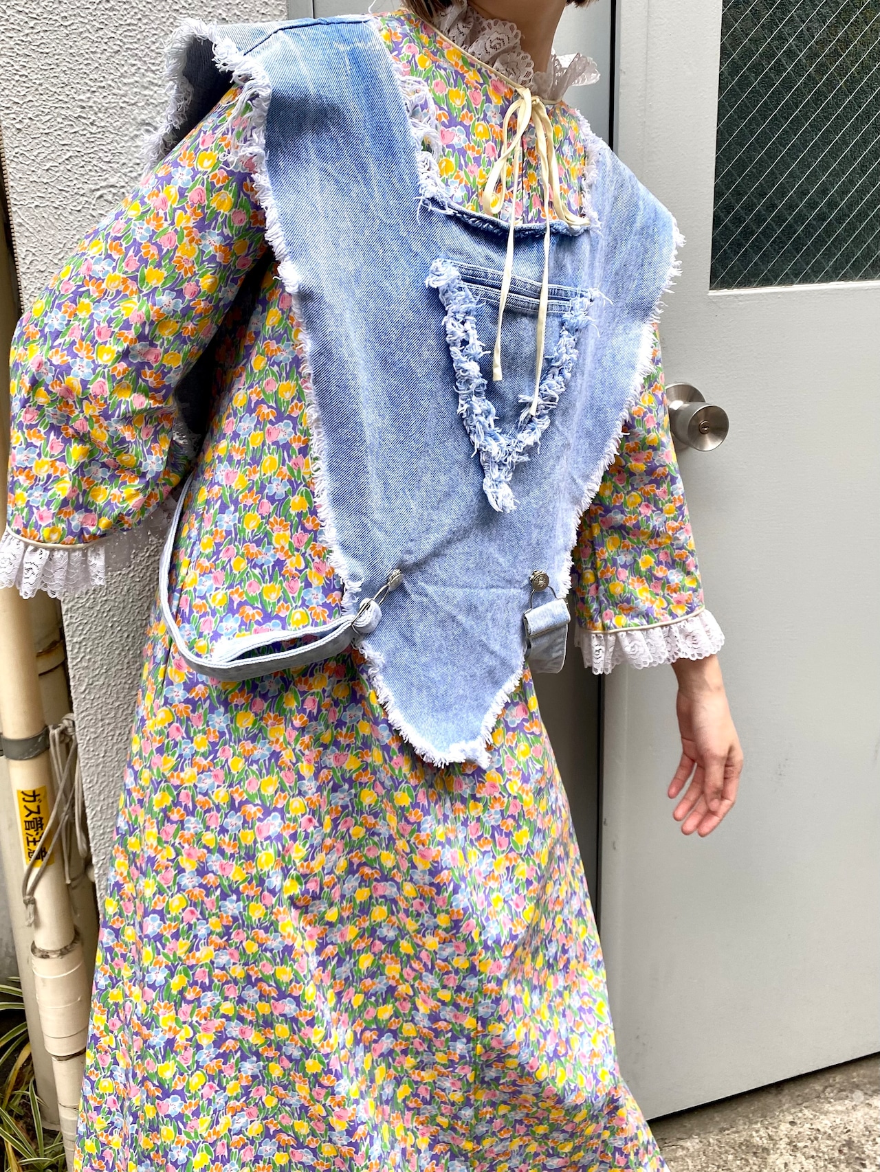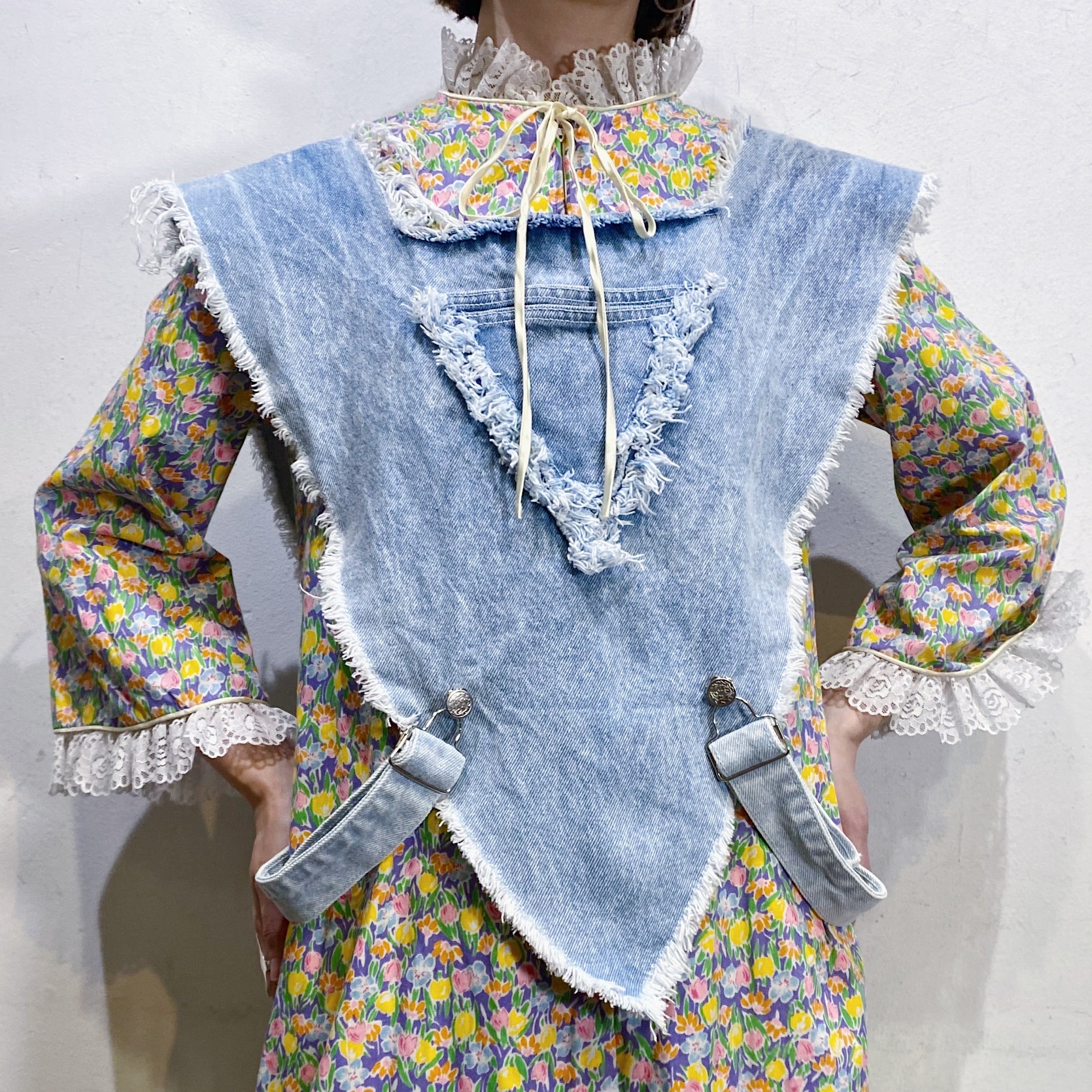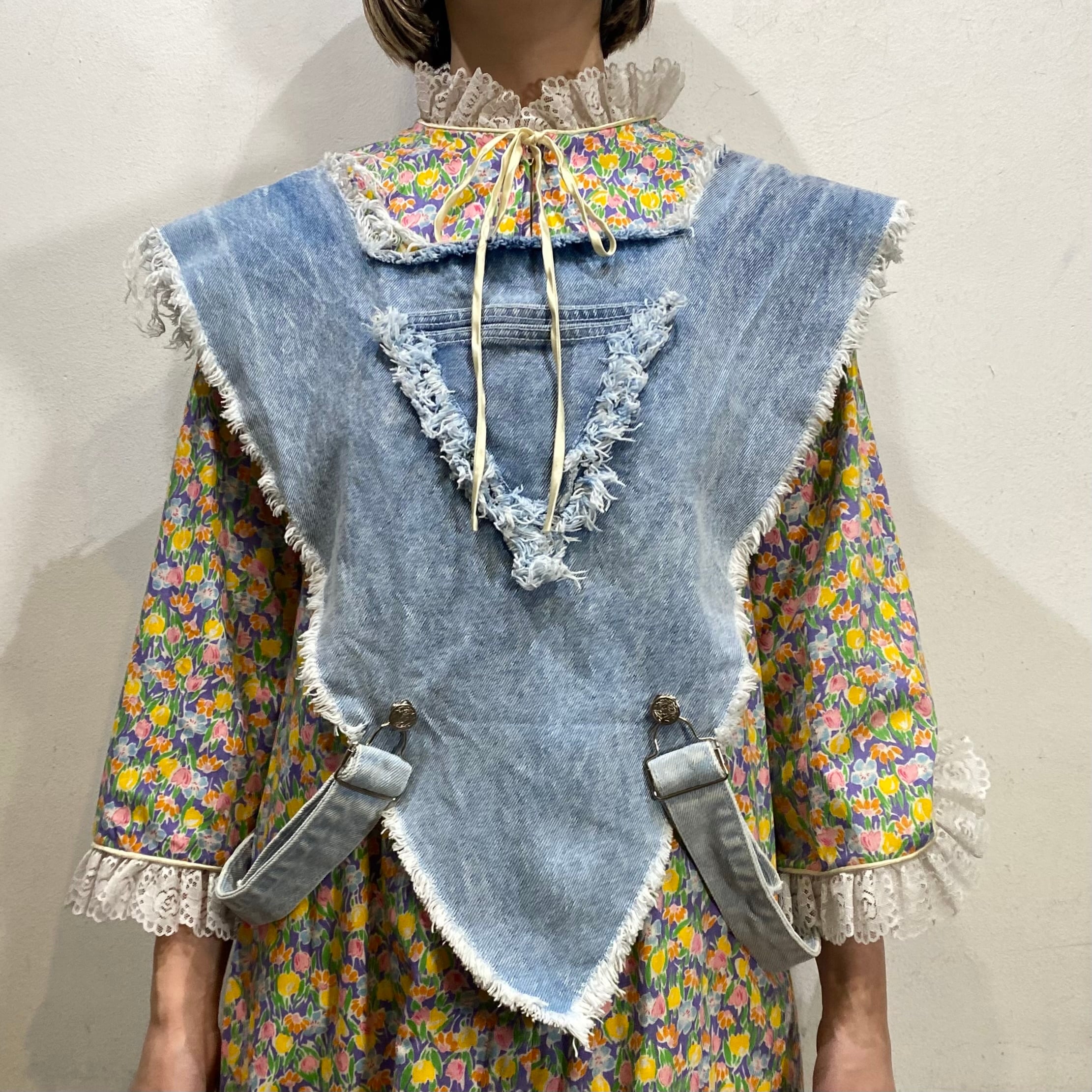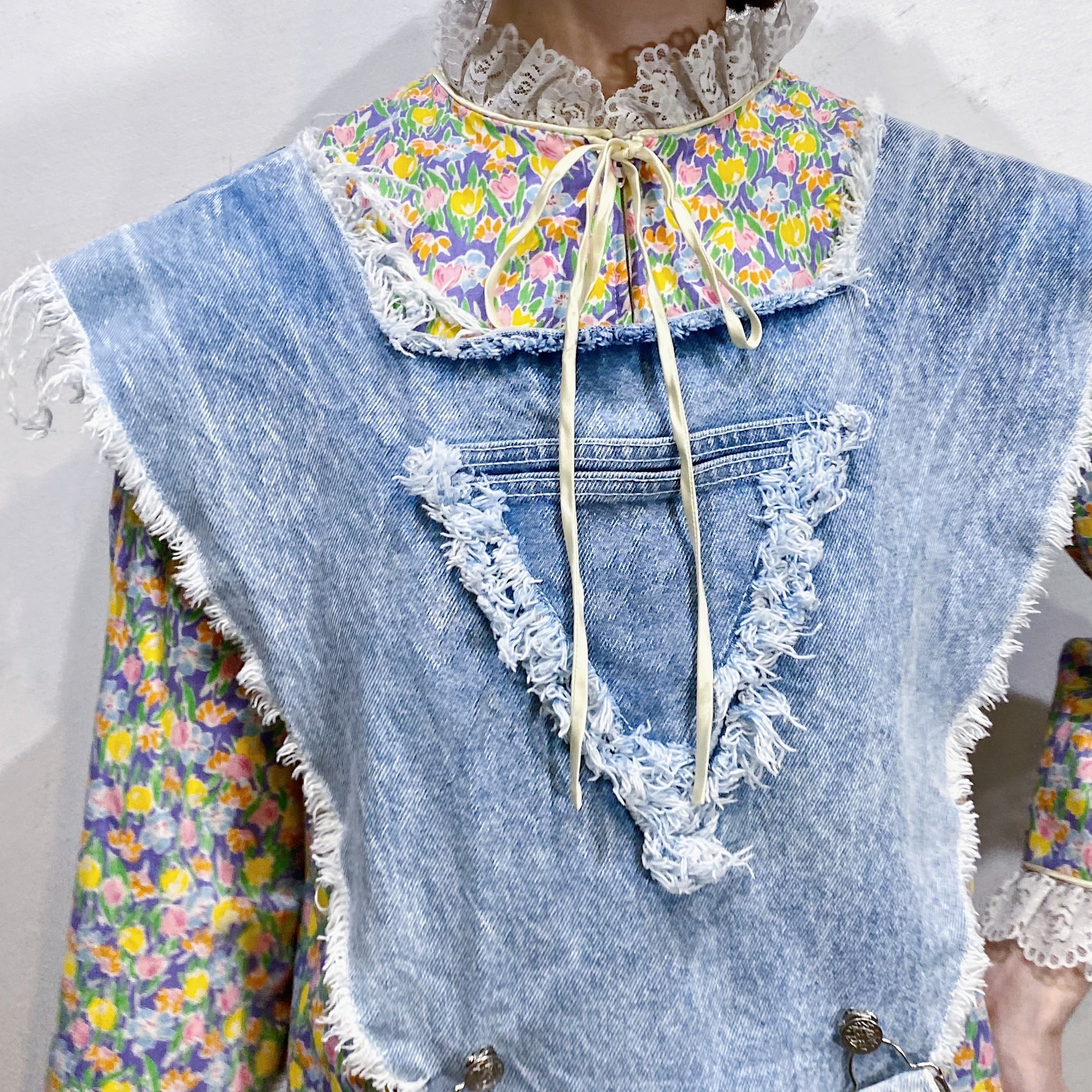 逆三角形のようなフォルムにポンチョのようなデザインがユニークで可愛い、80年代のデニムベストです。