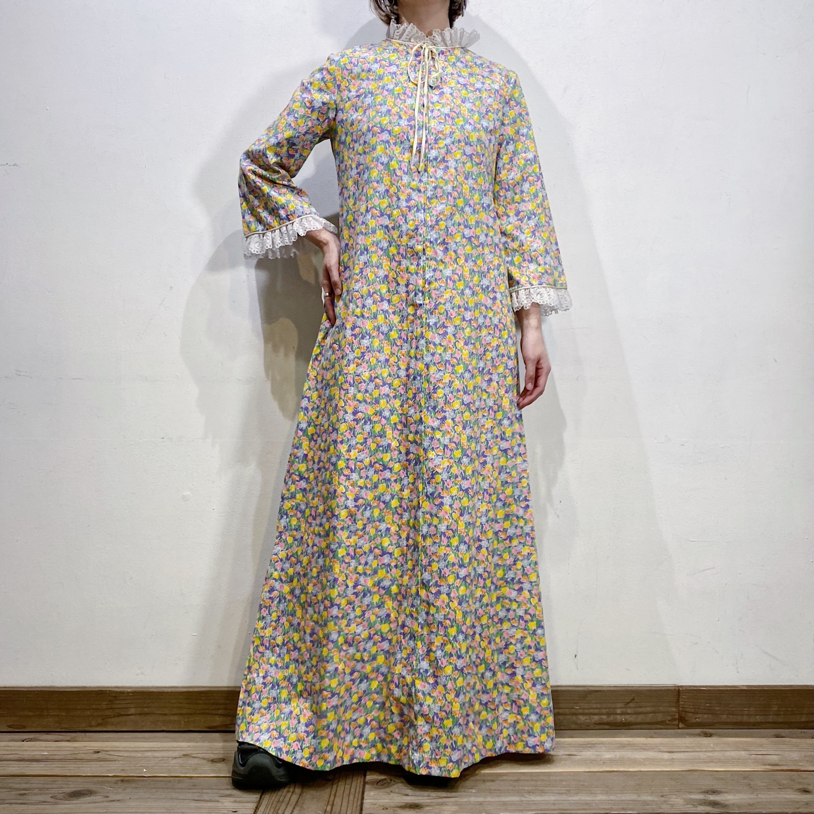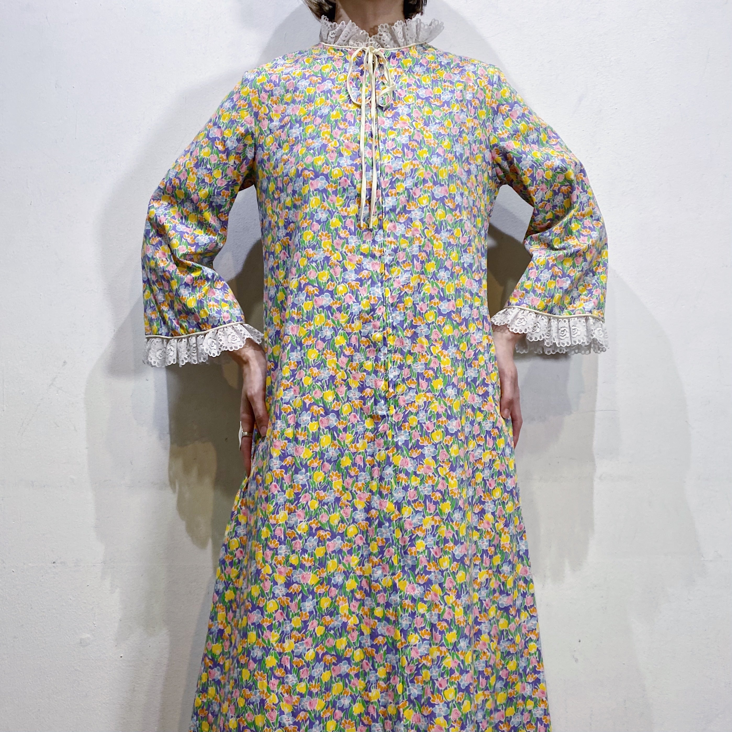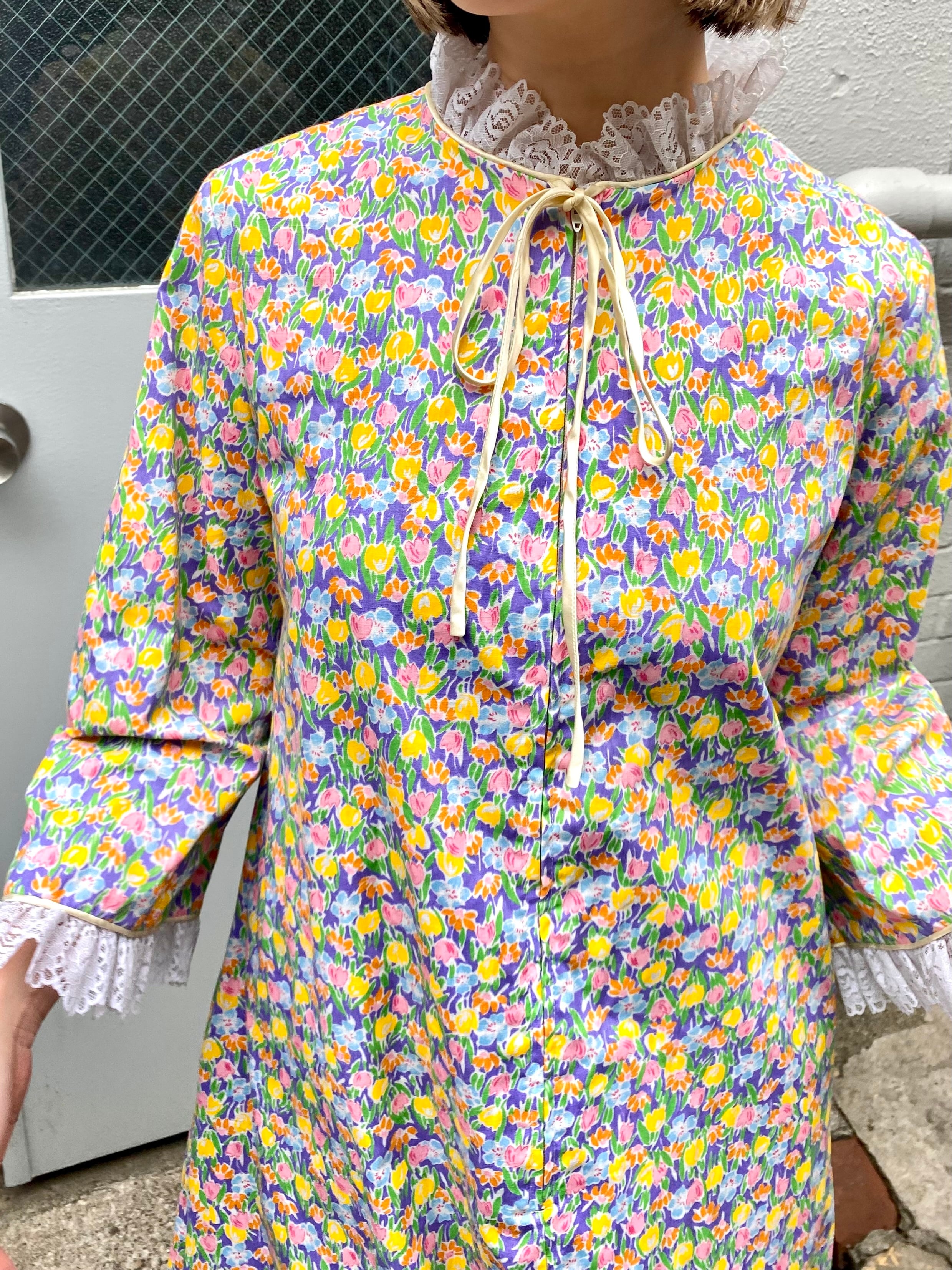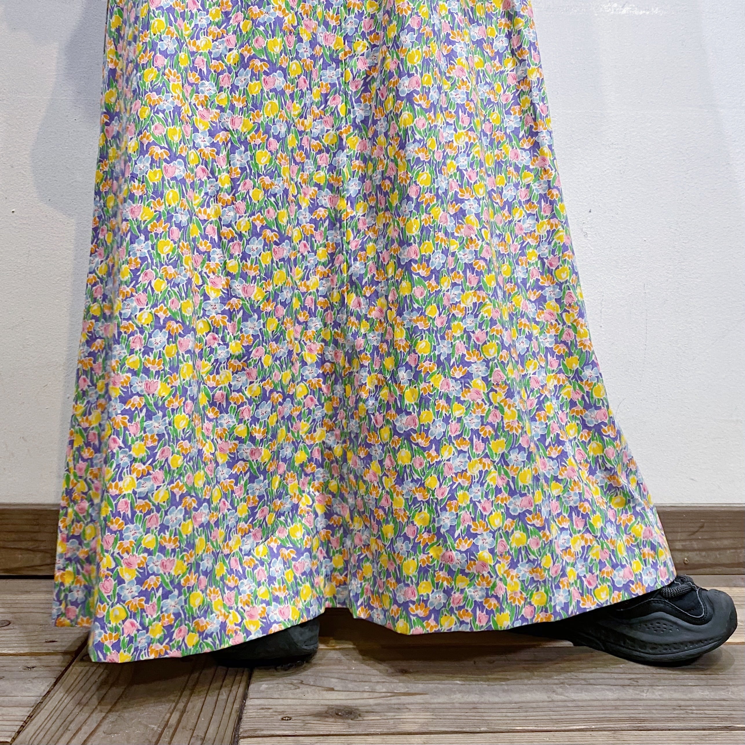 パープルベースにカラフルなお花がびっしりとプリントされた、70年代のワンピースです。