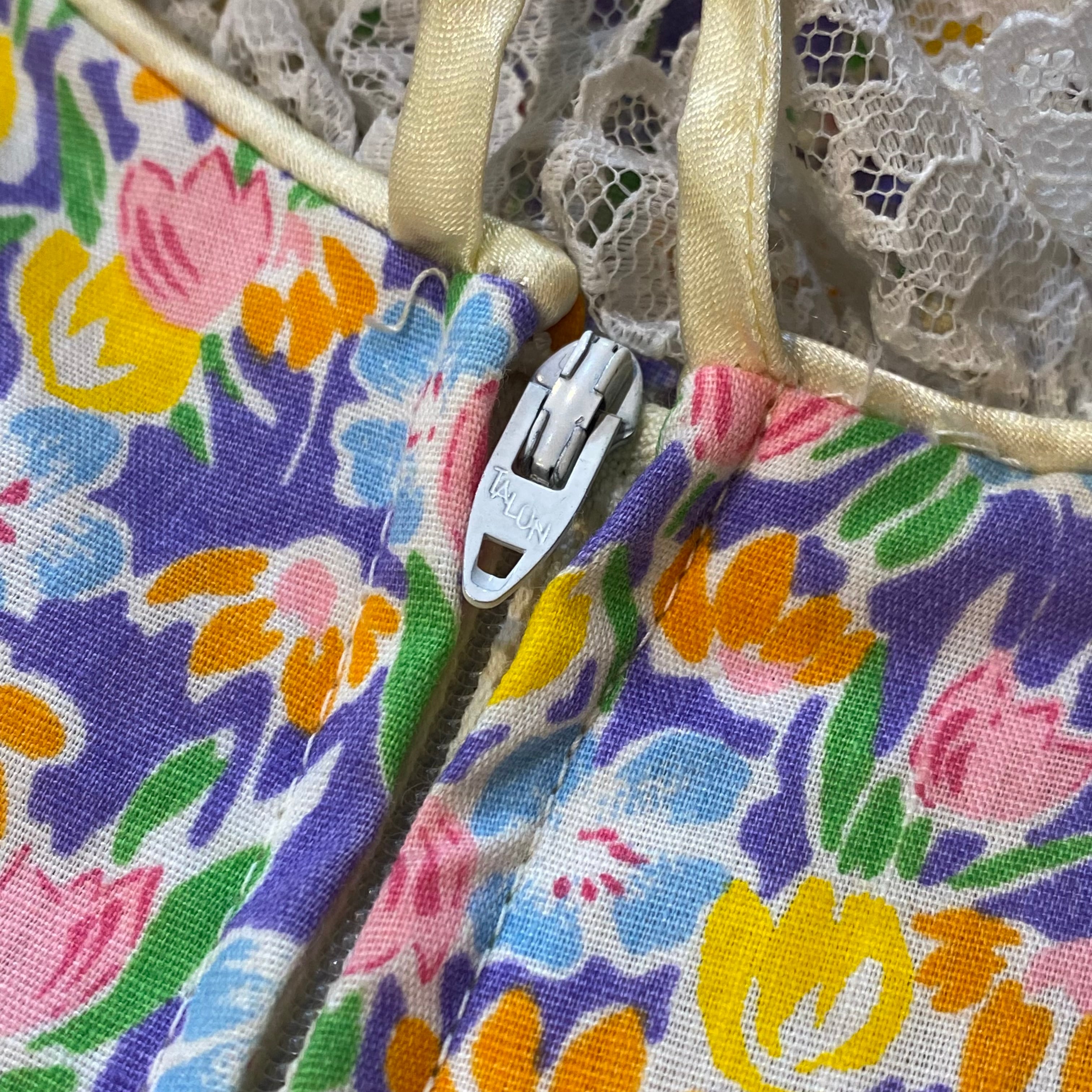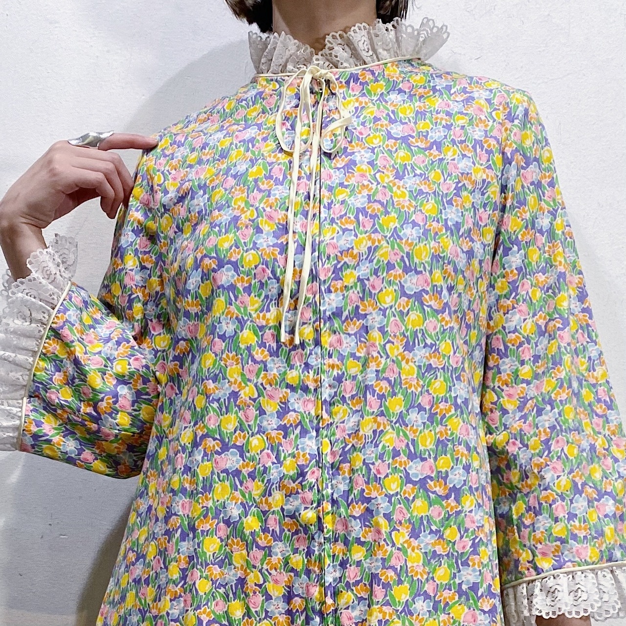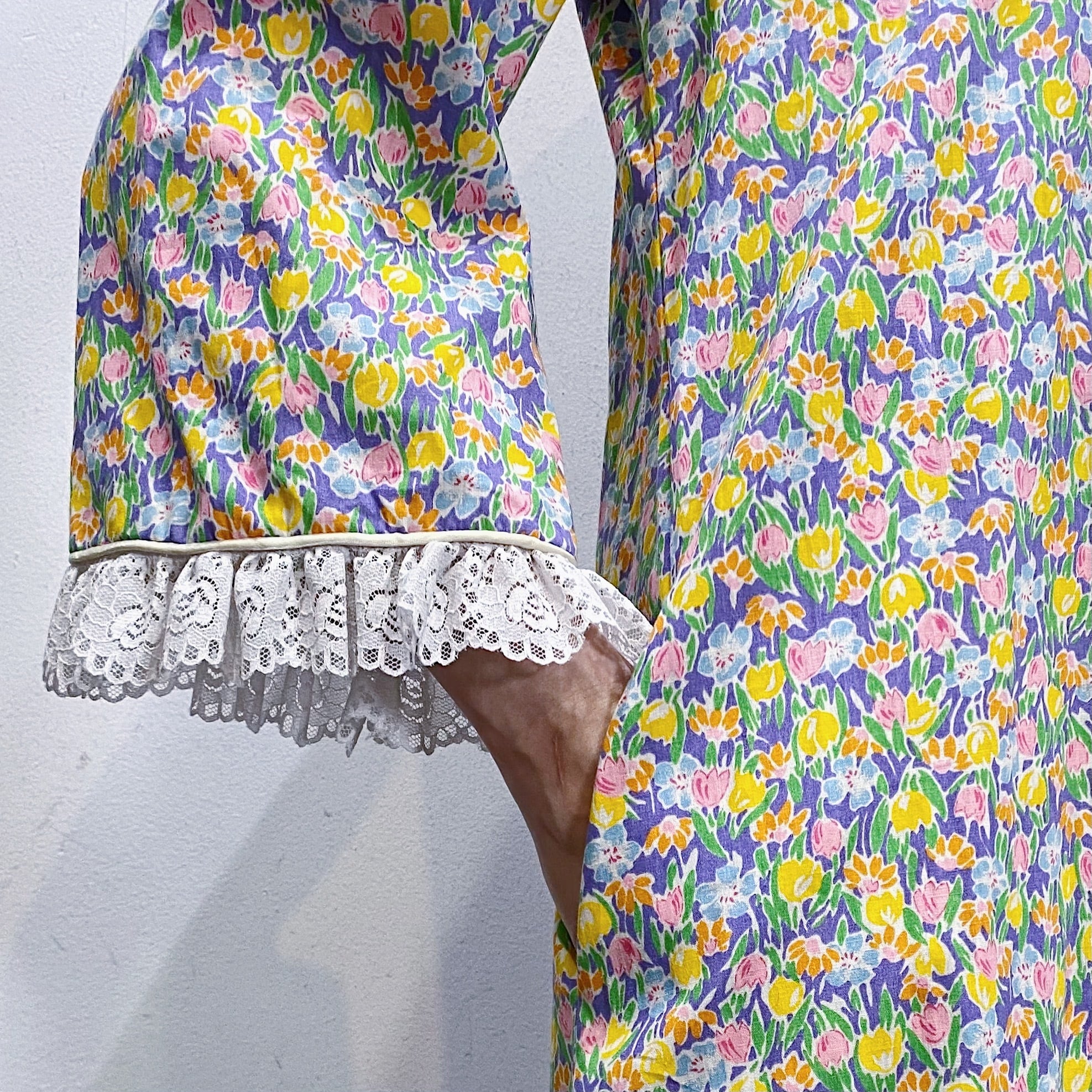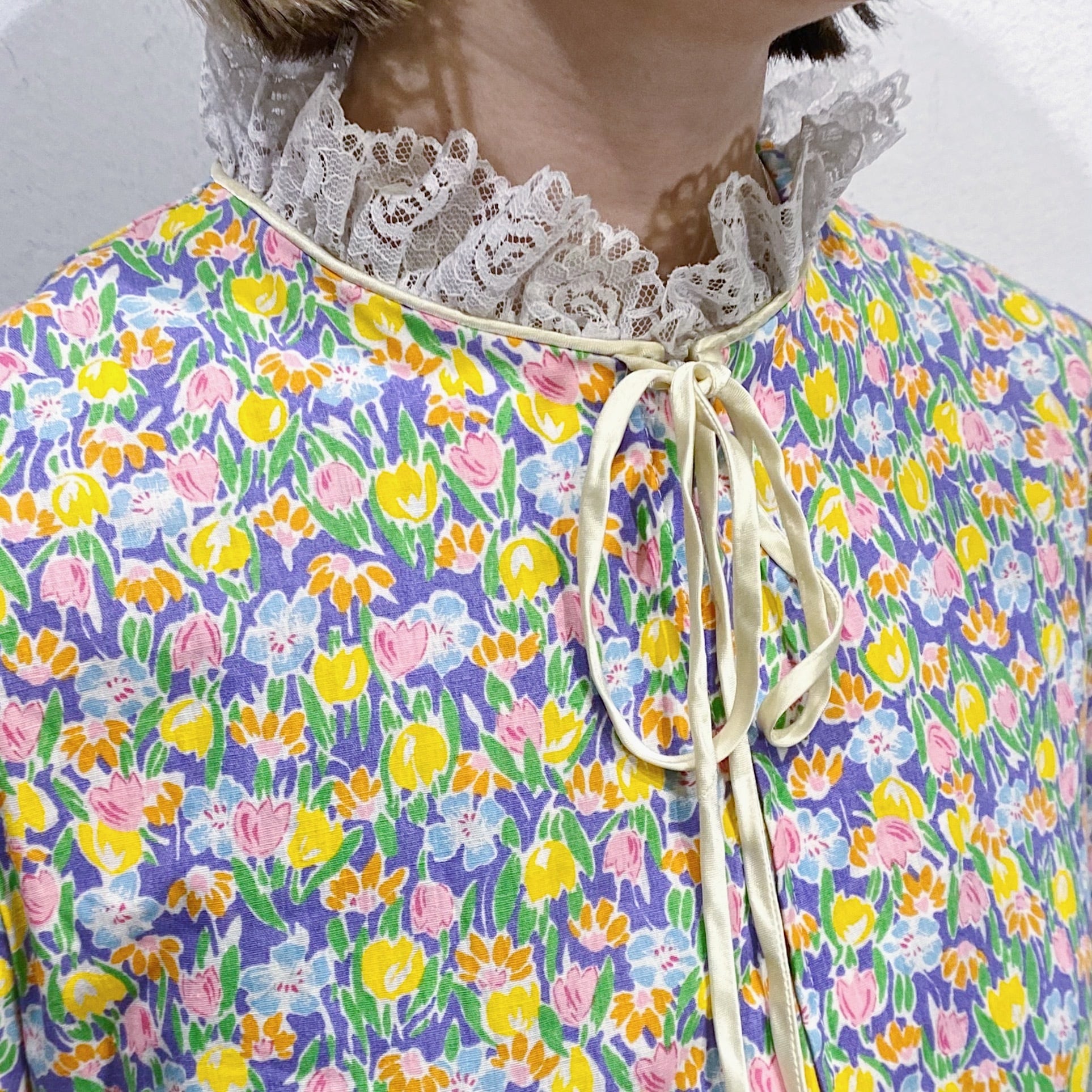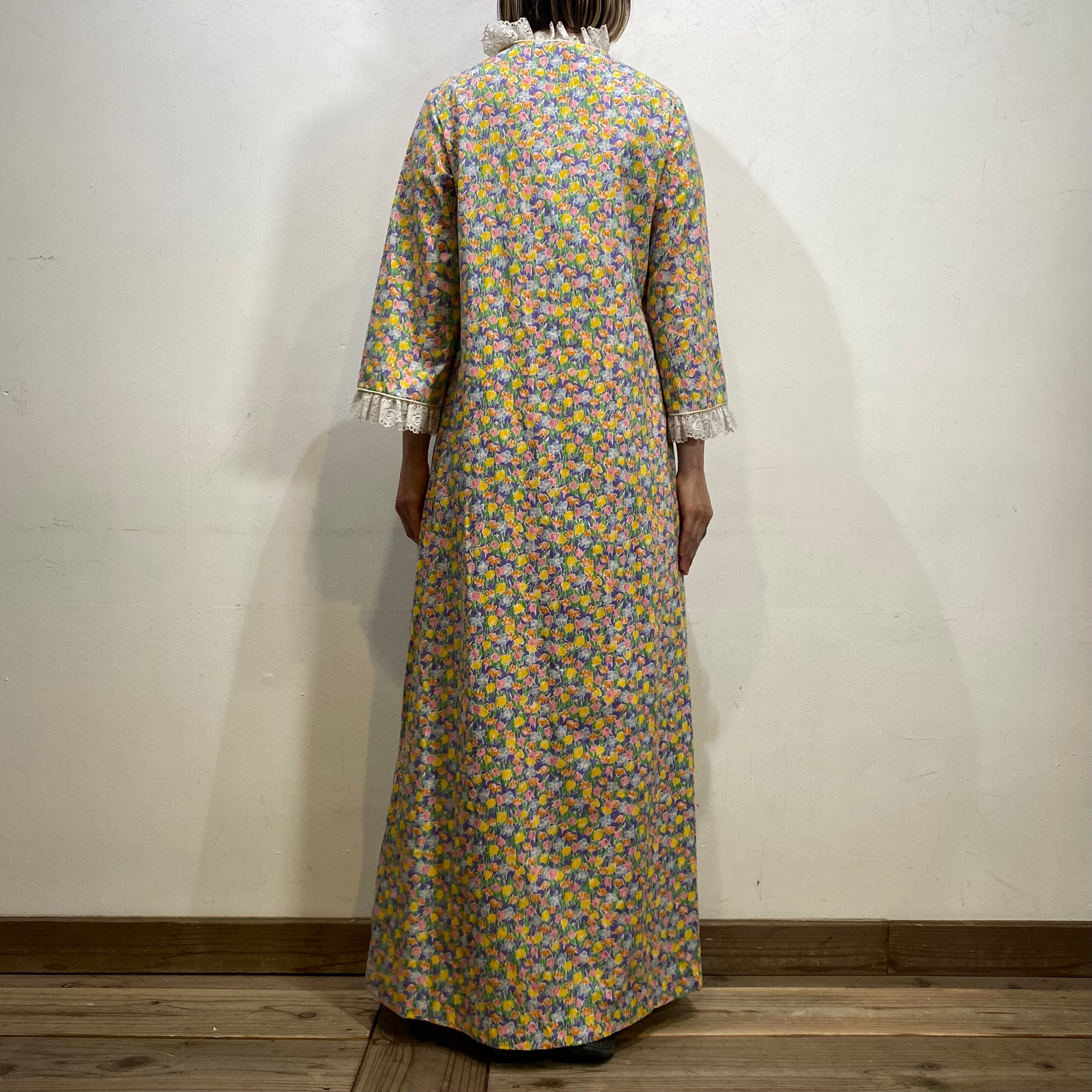 パープルベースにカラフルなお花がびっしりとプリントされた、70年代のワンピースです。