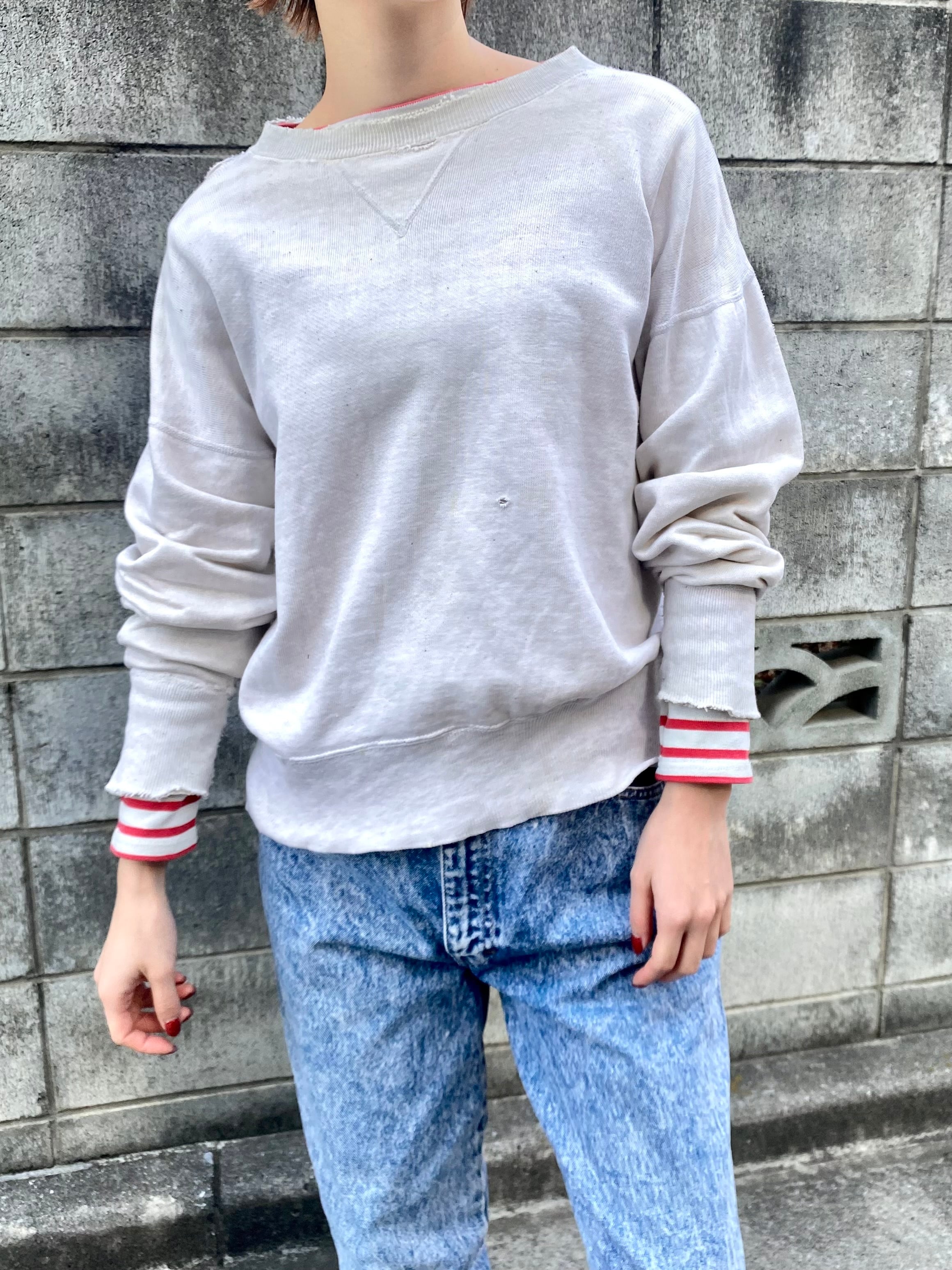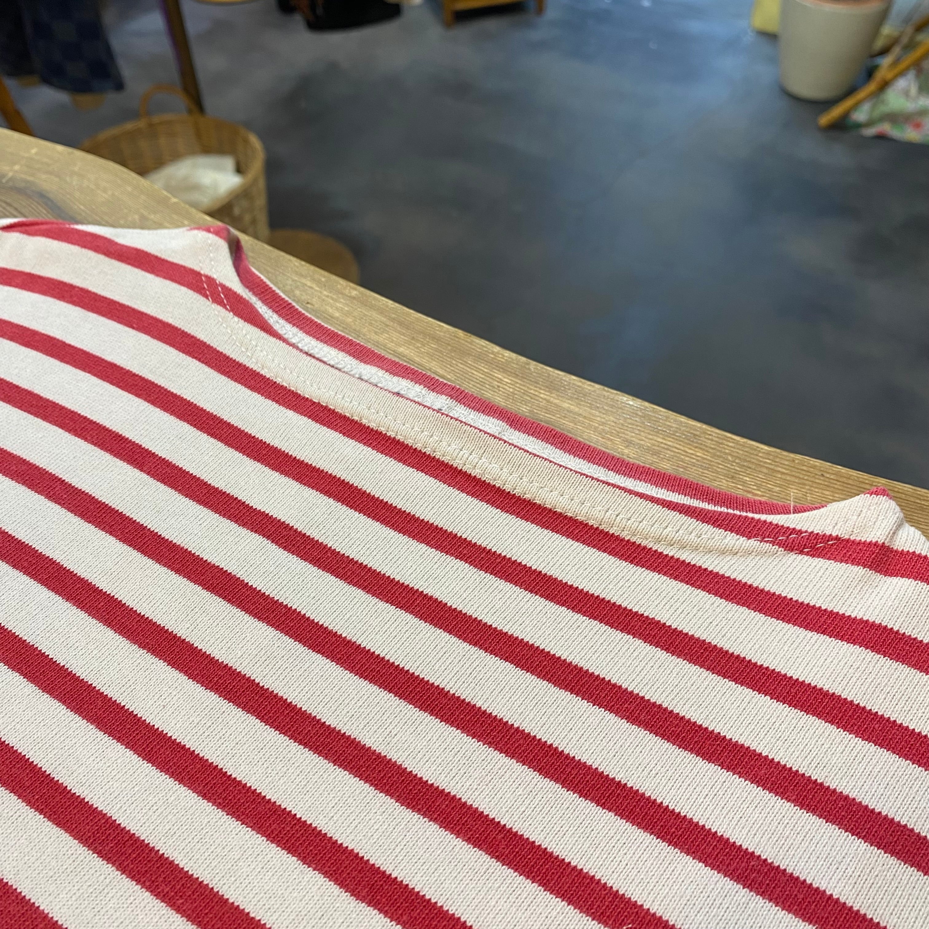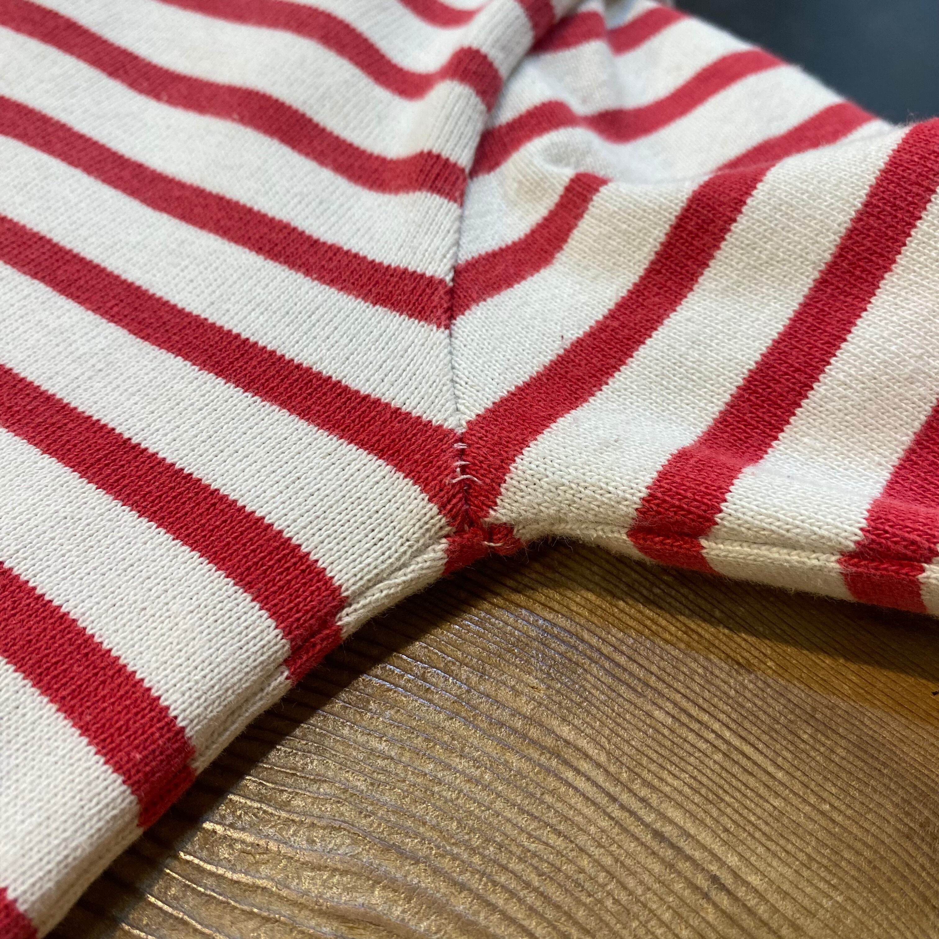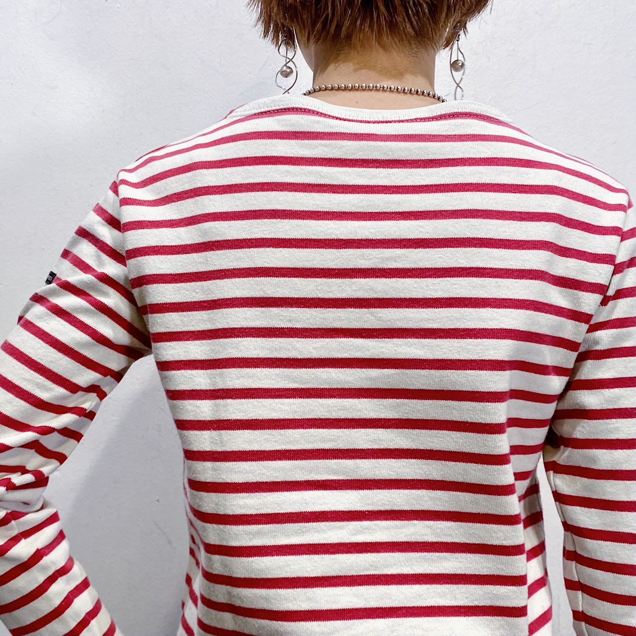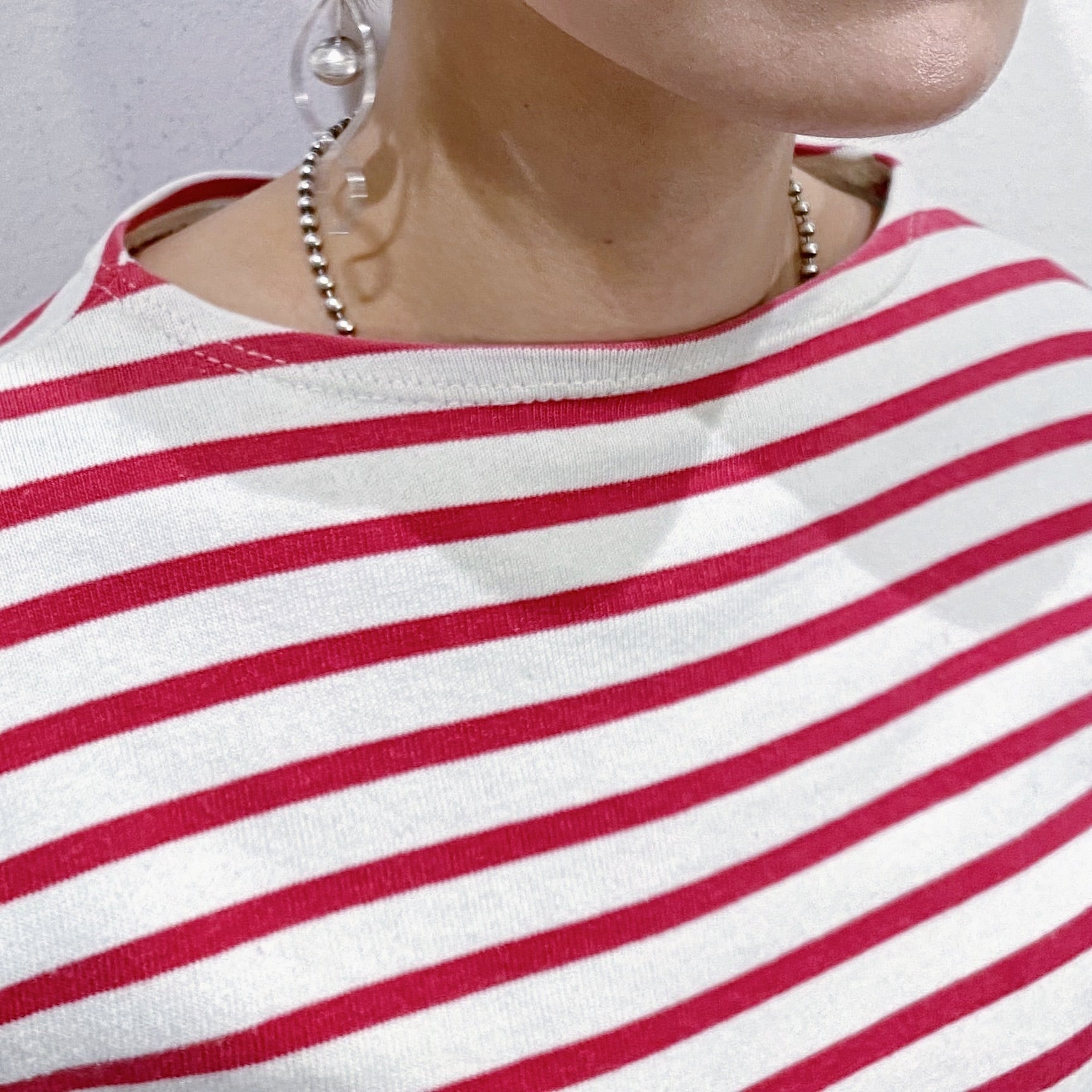 着用写真のようにスウェットやニットなどの下に重ね、首元や袖口からボーダーを覗かせたレイヤードスタイルもおすすめ。