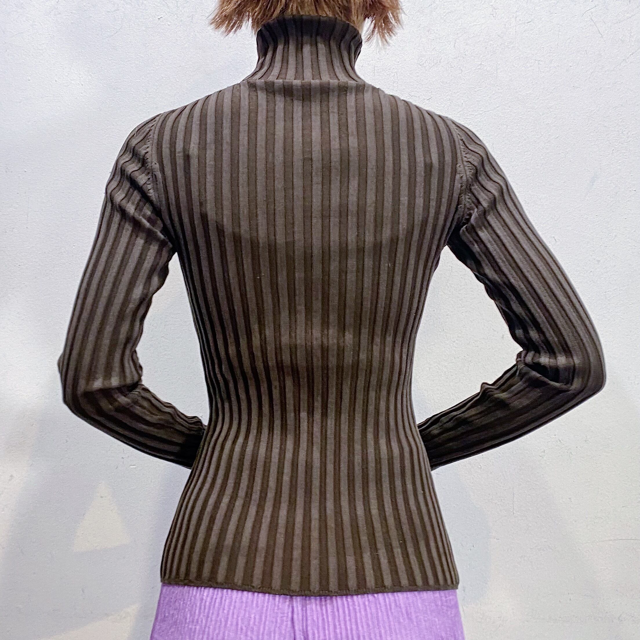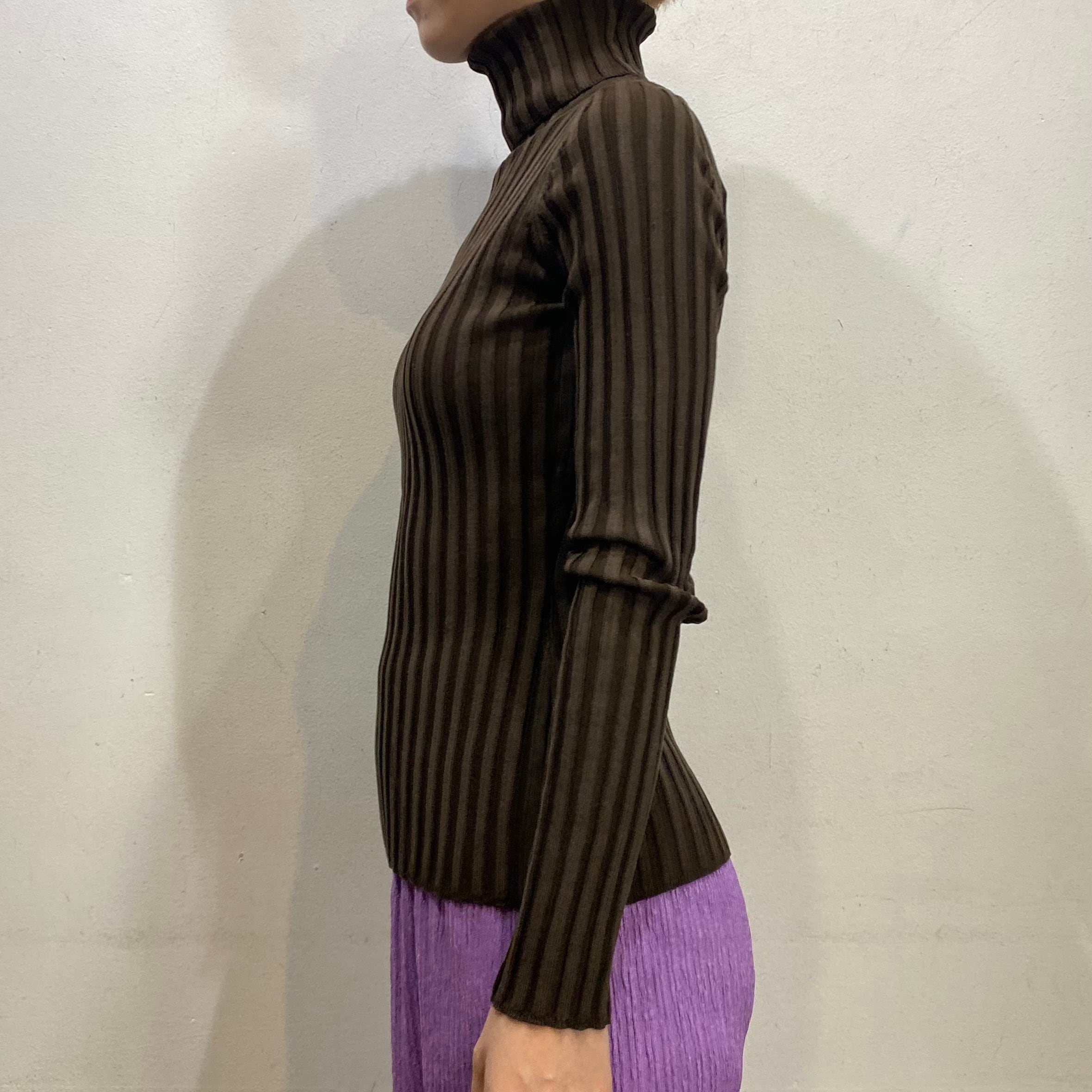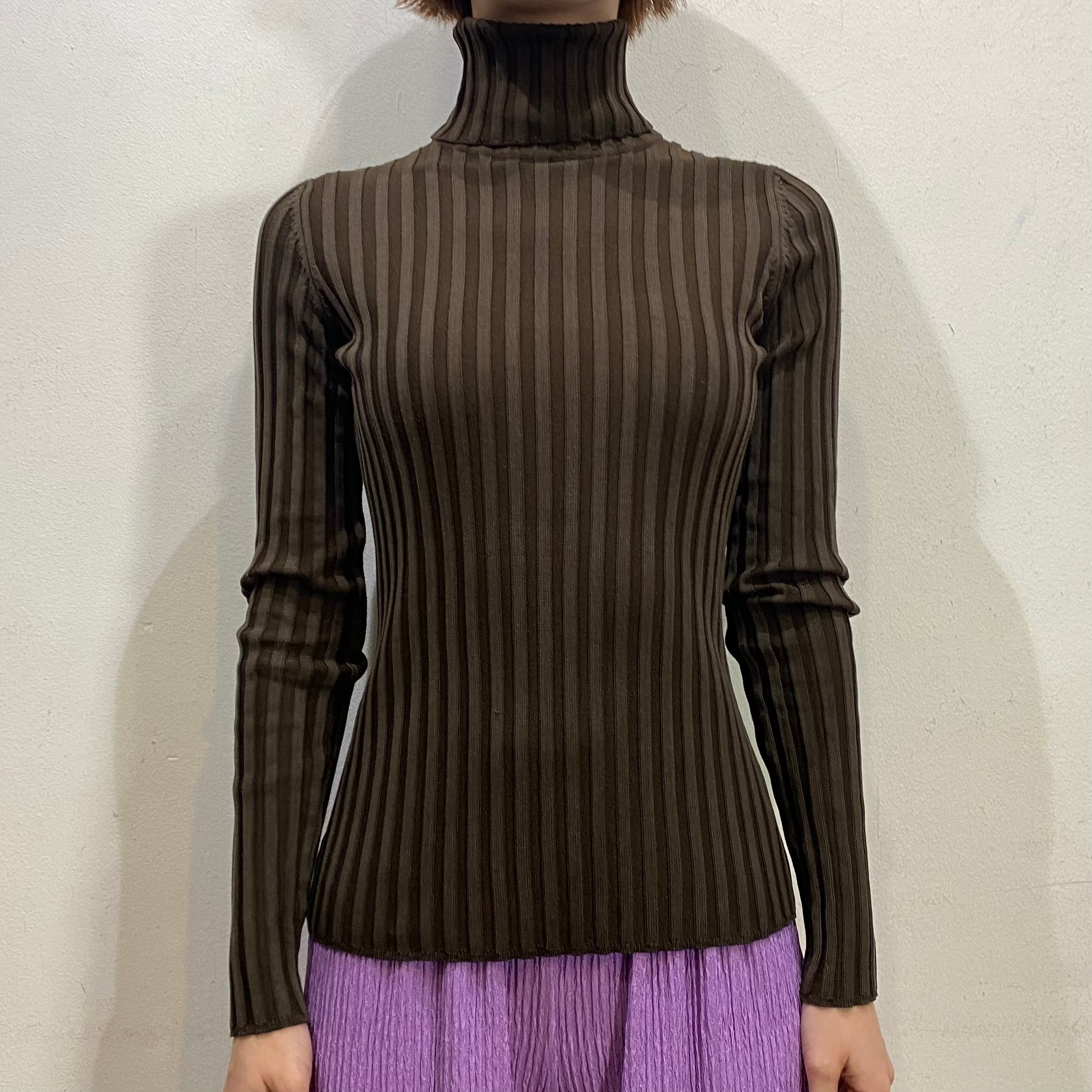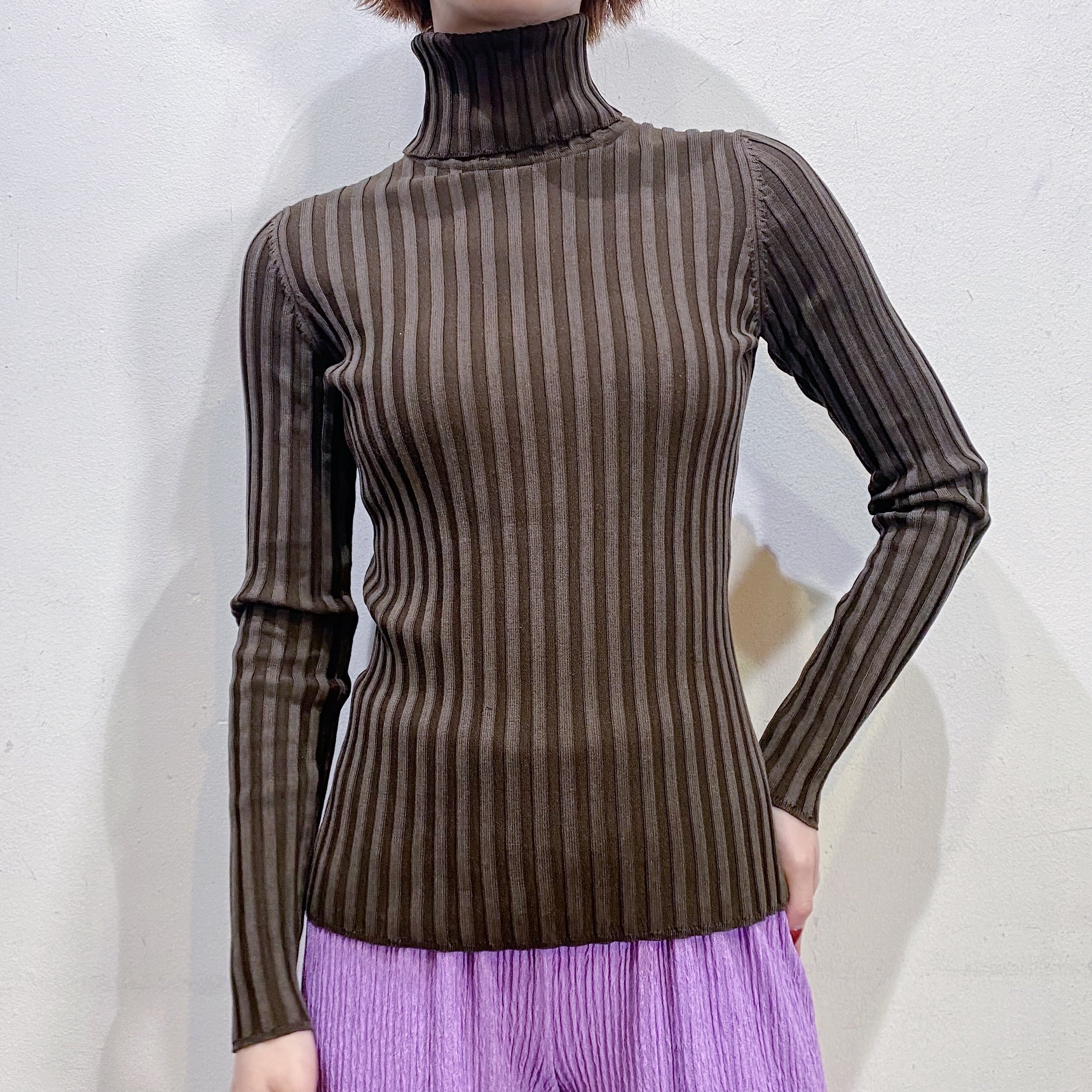 落ち着いた色合いのブラウンカラーで着こなしやすい、ハイネックニットトップスです。