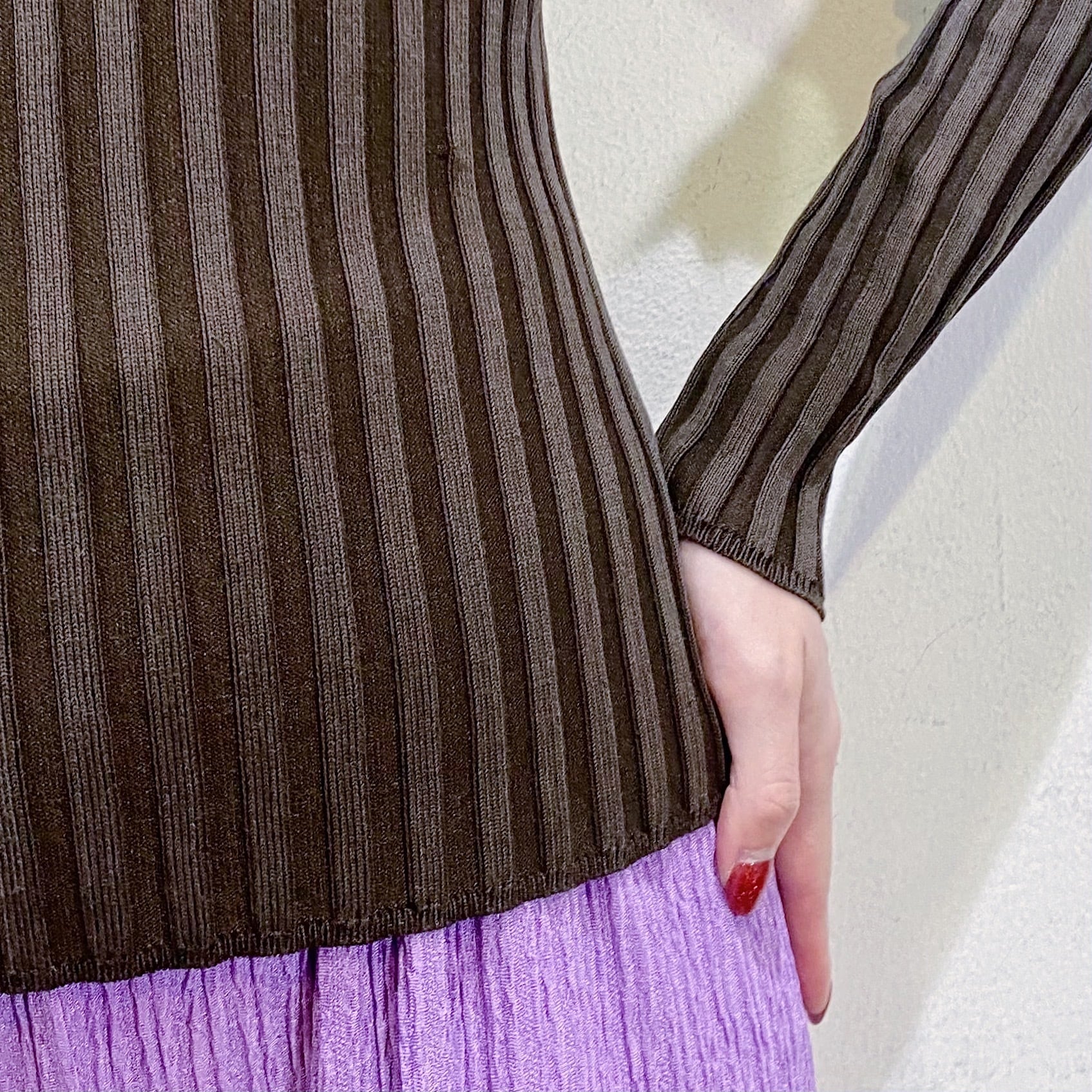 伸縮性のあるリブデザインが、程よく体にフィットする一枚。