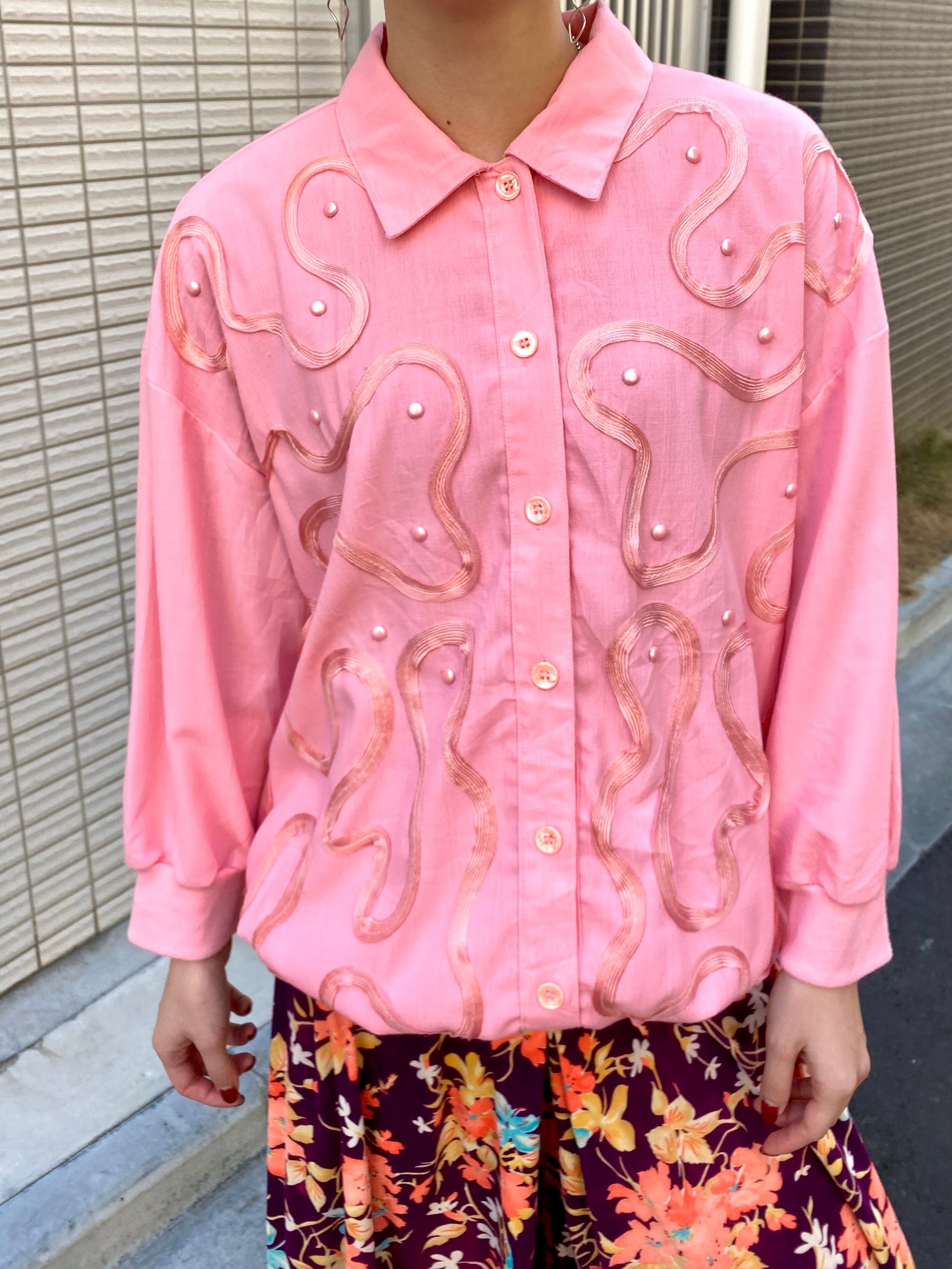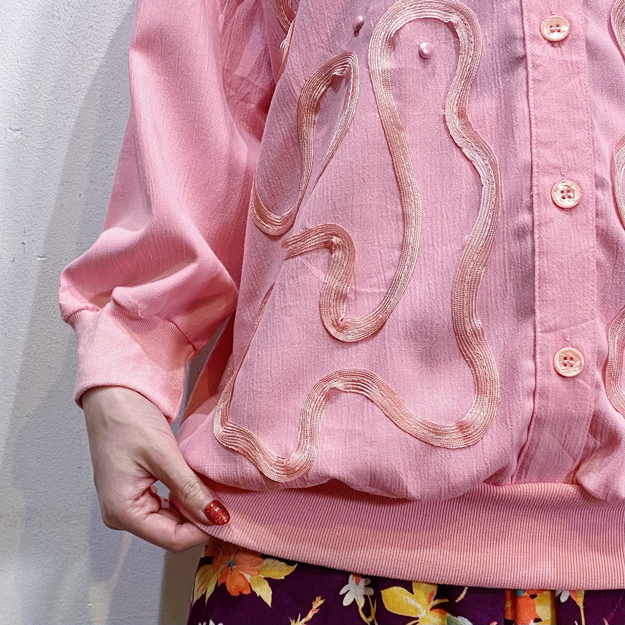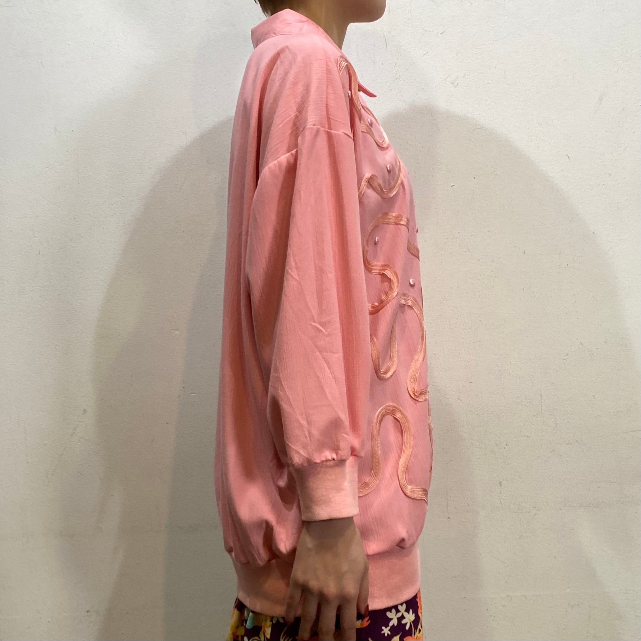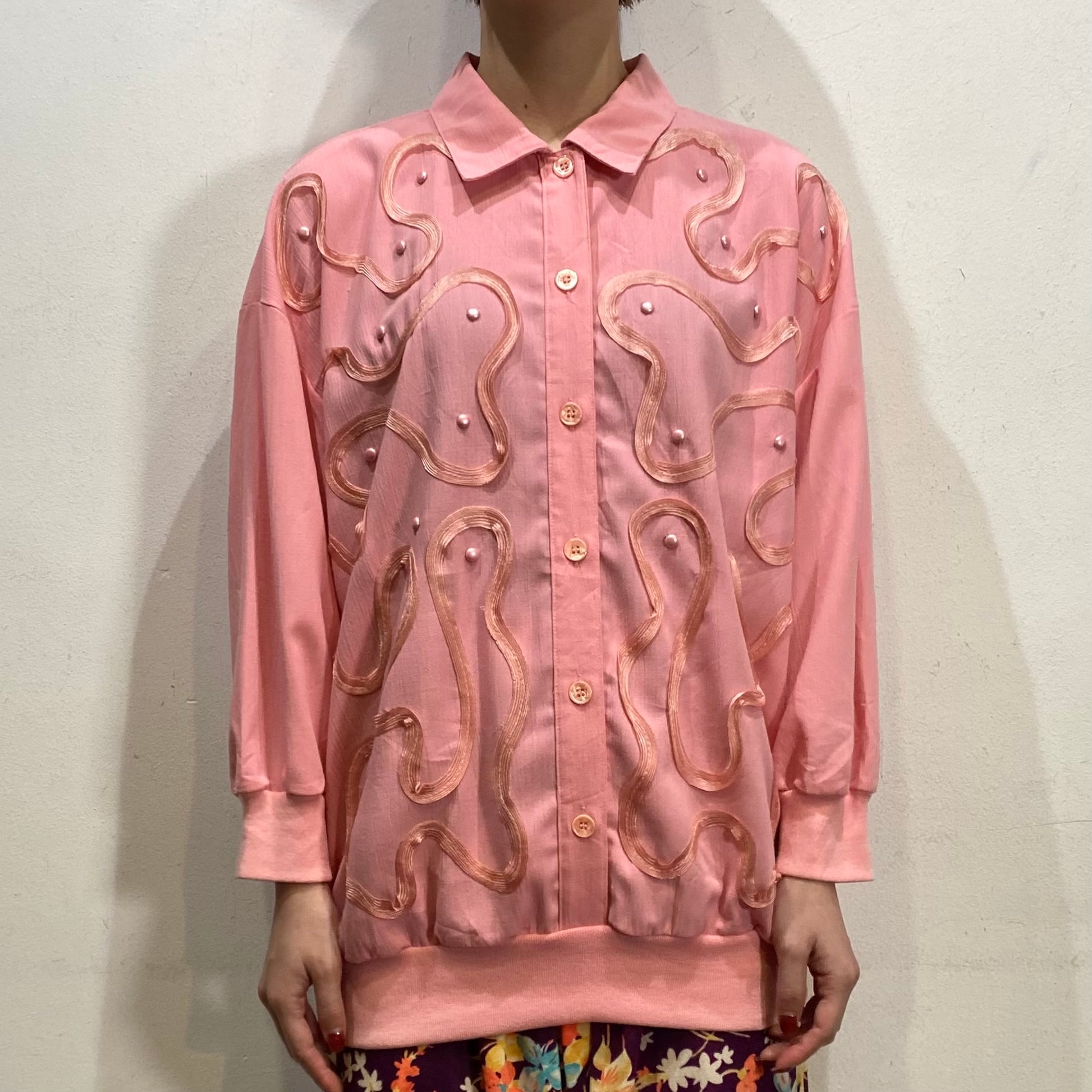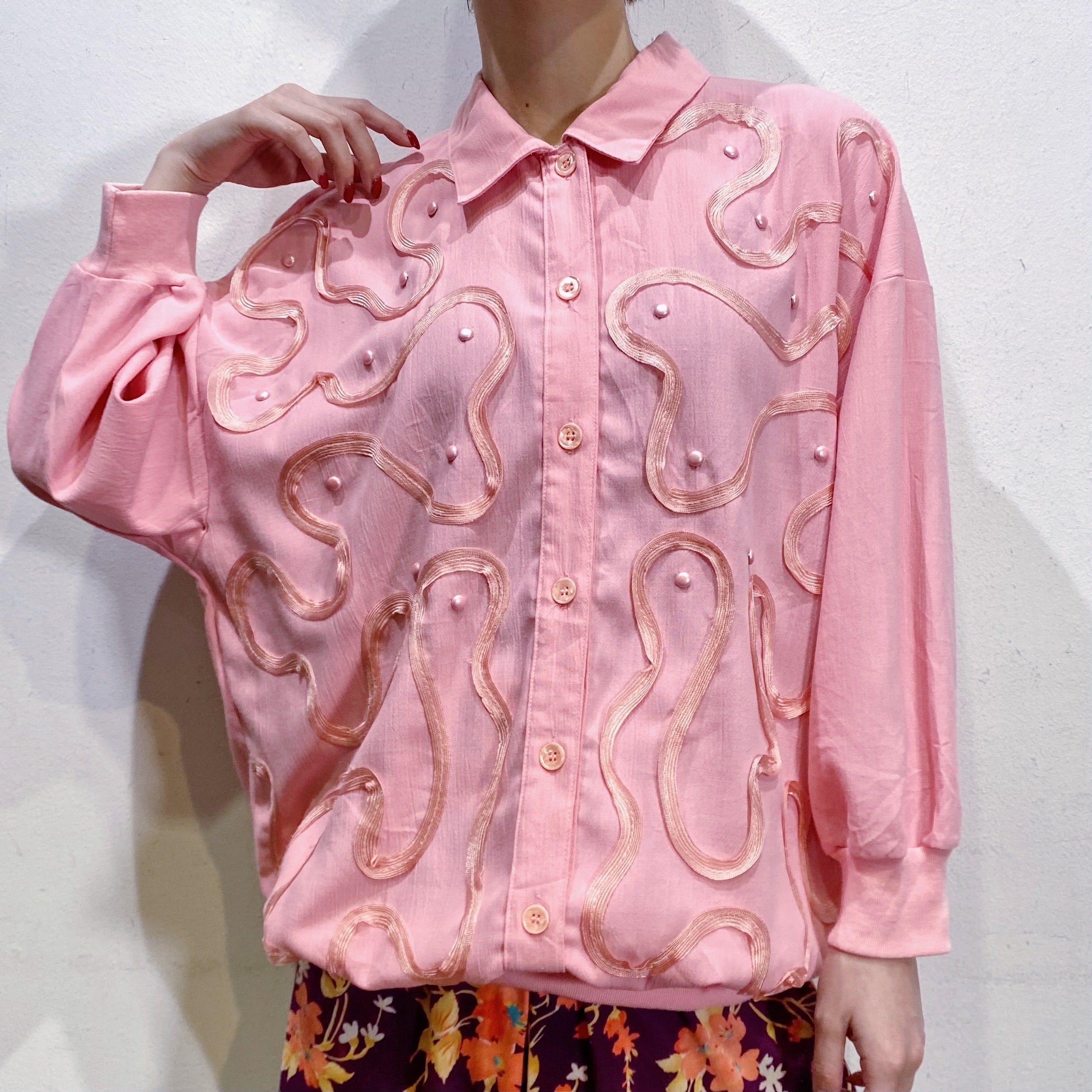 ピンクベースの生地にピンクのスタッズとテープで装飾された、ユニークなトップスです。