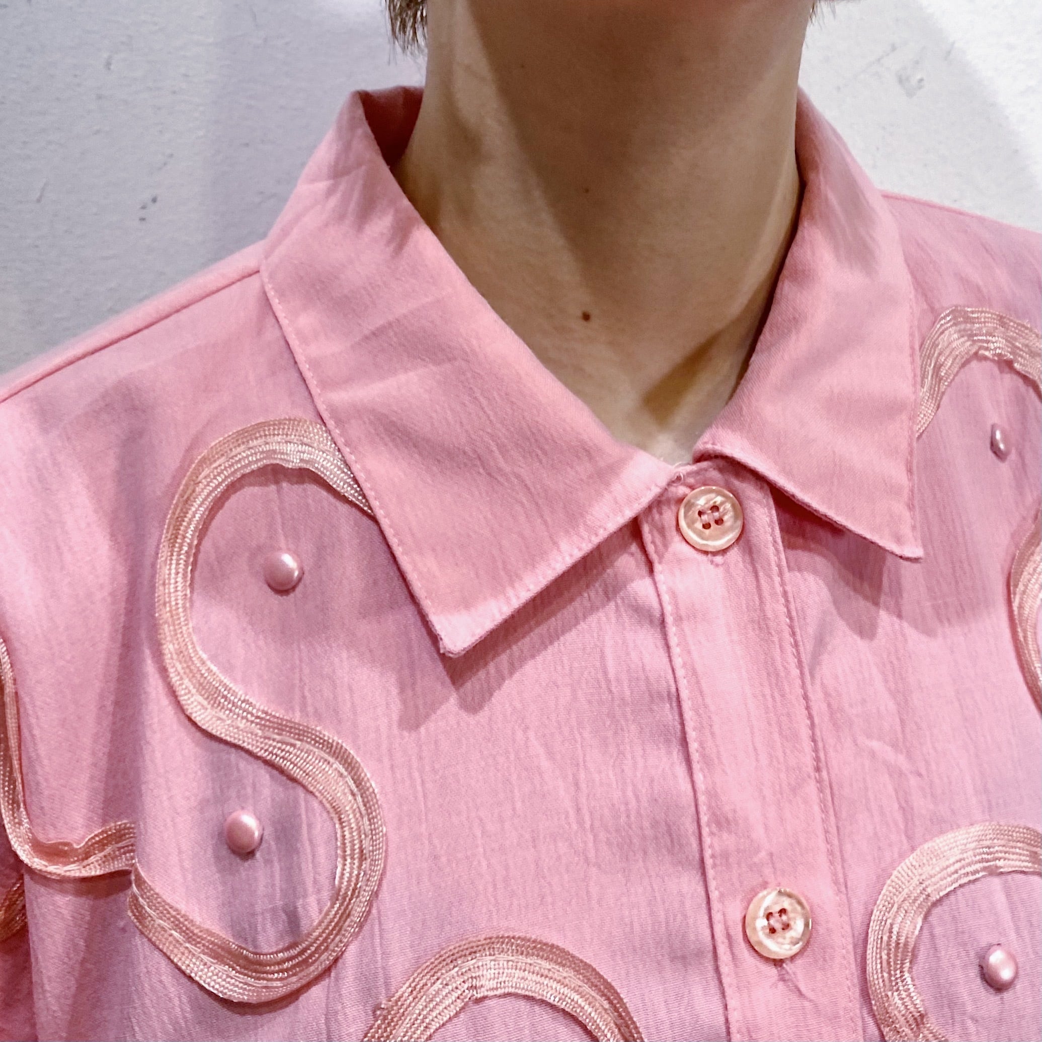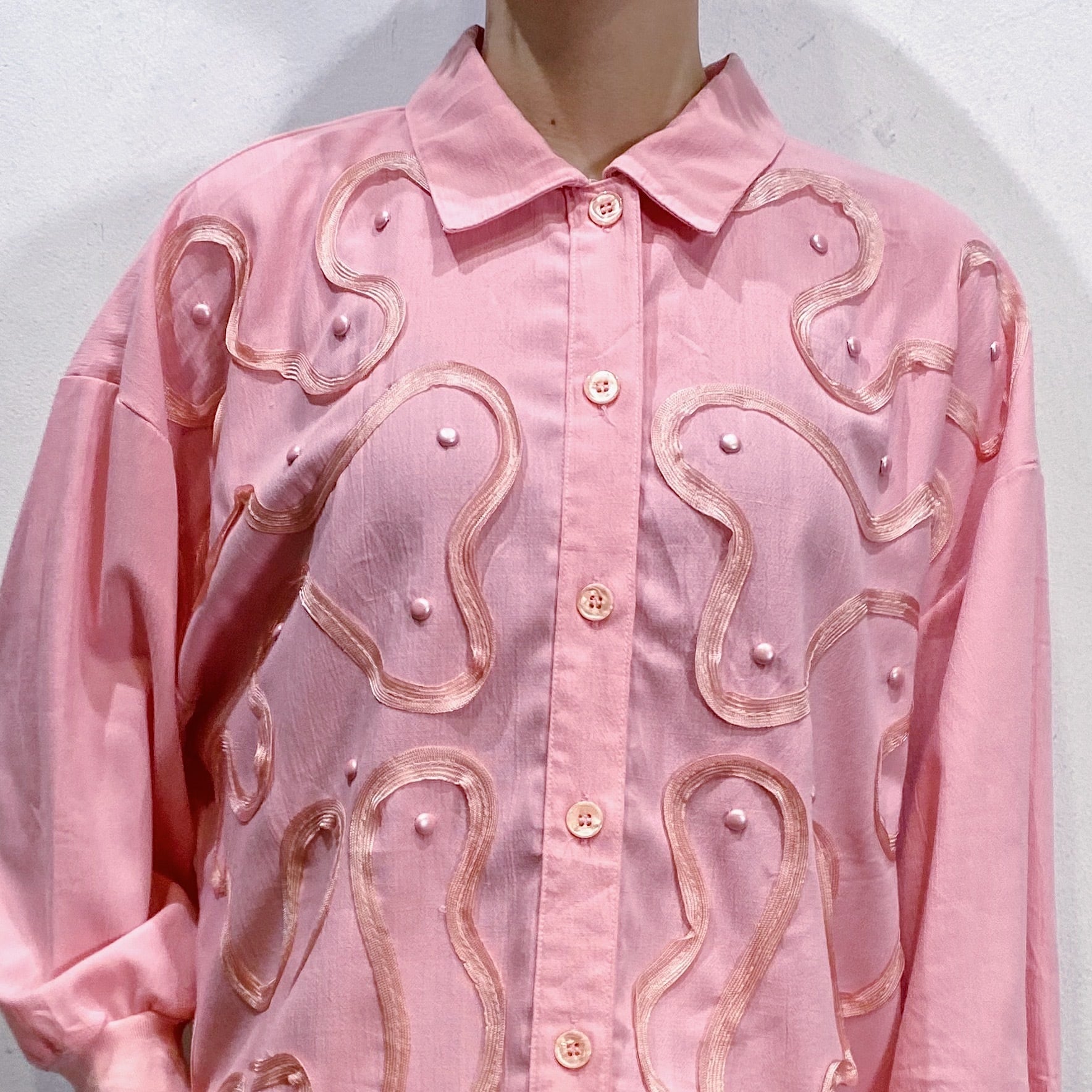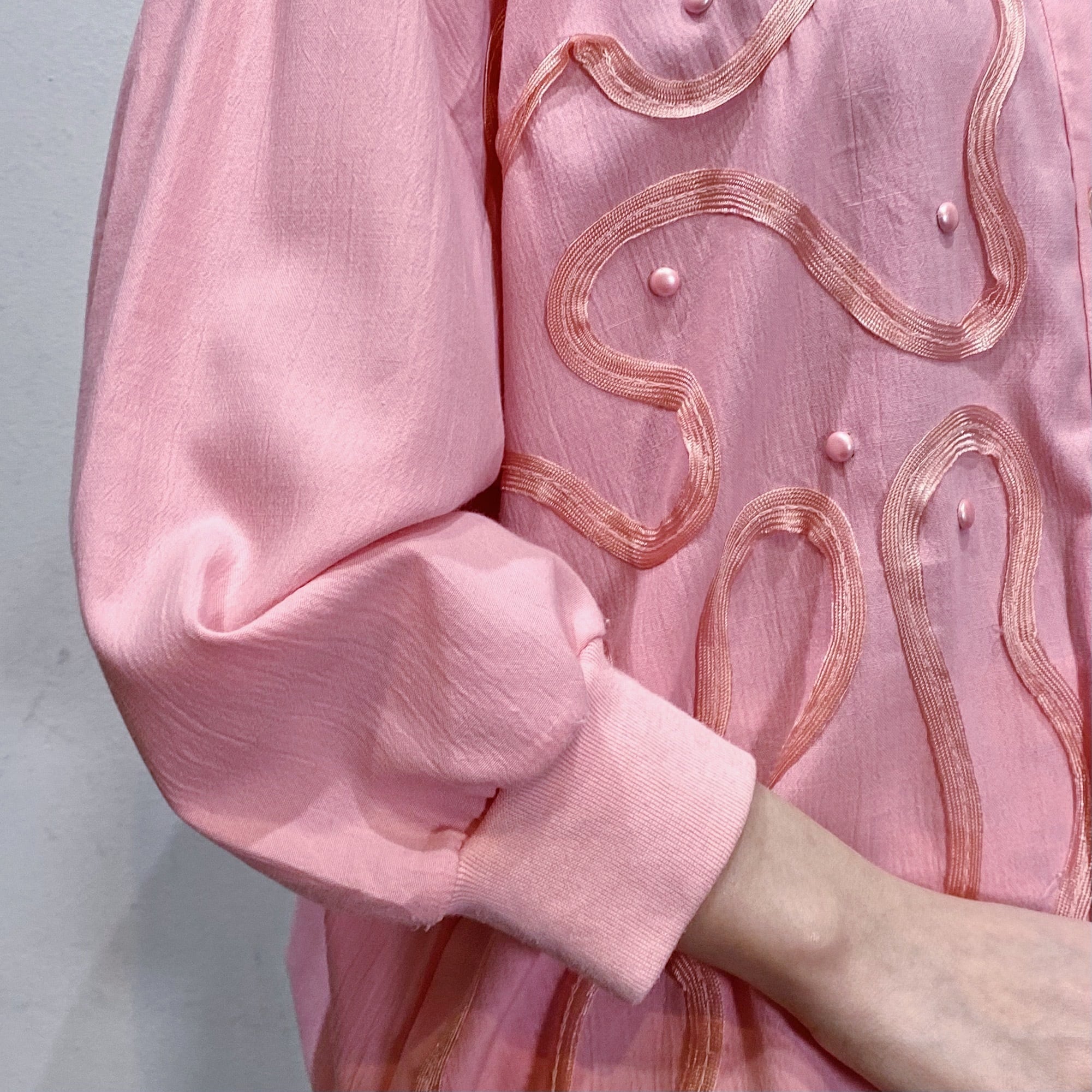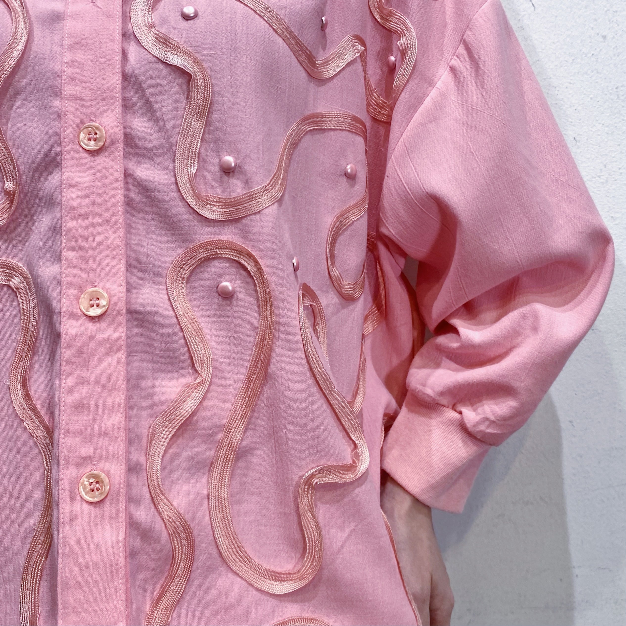 ピンクベースの生地にピンクのスタッズとテープで装飾された、ユニークなトップスです。