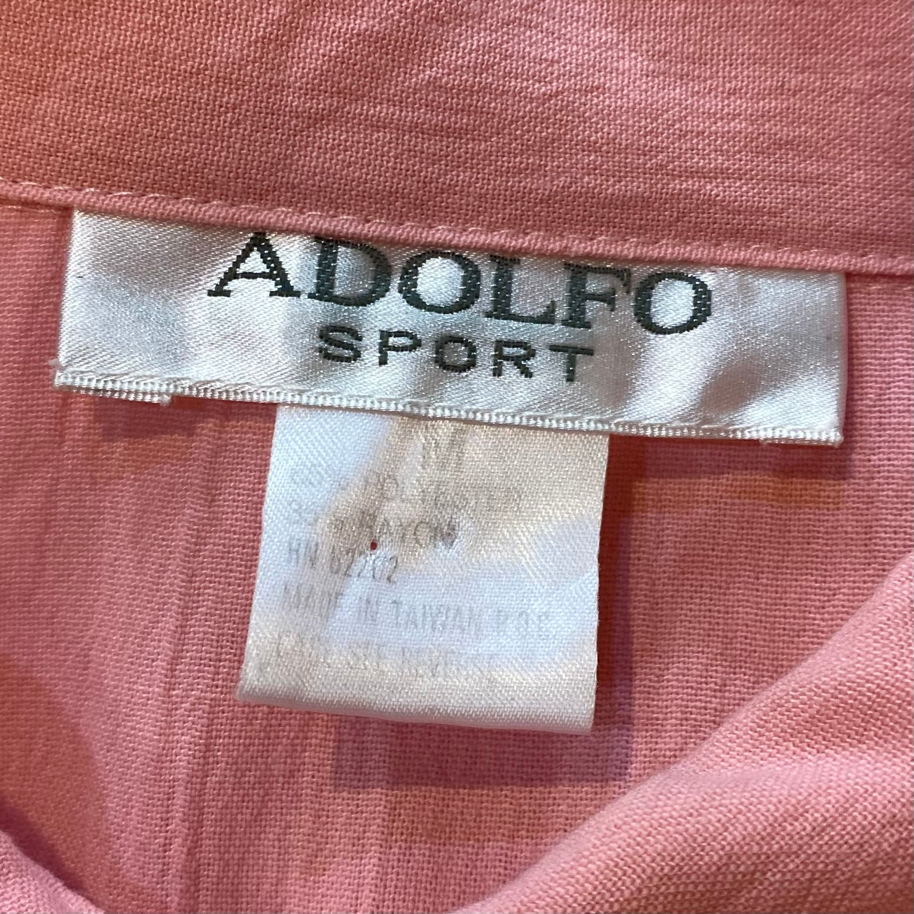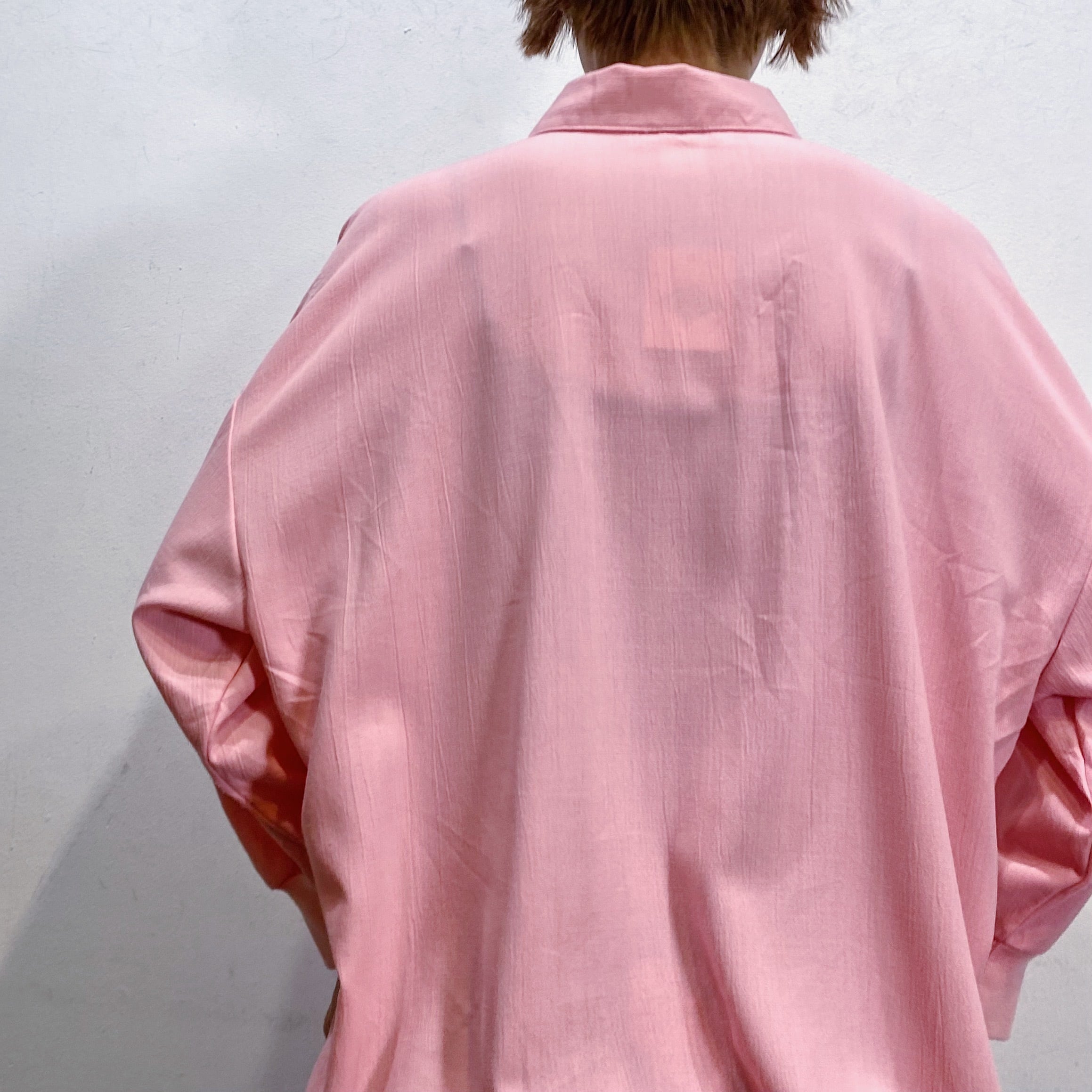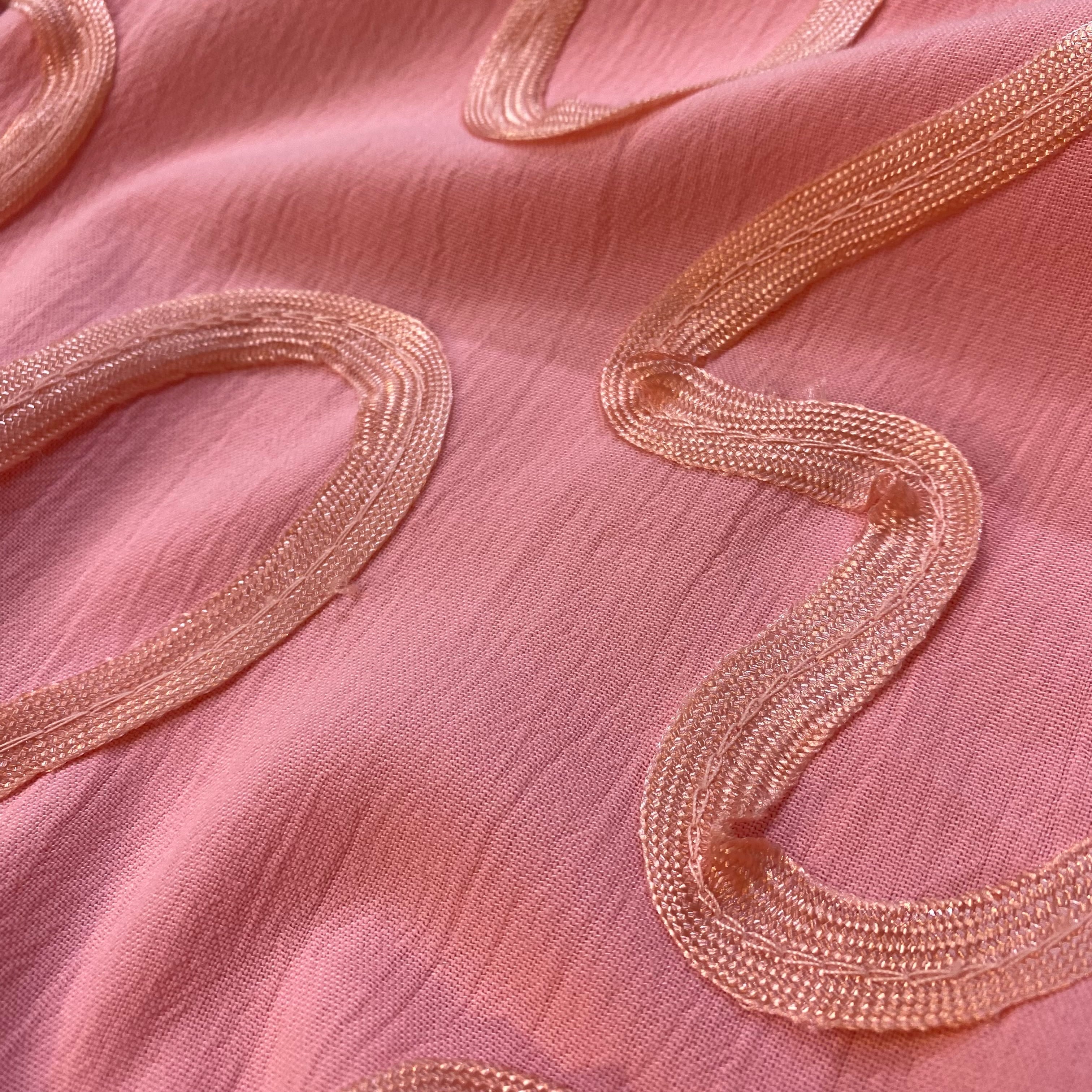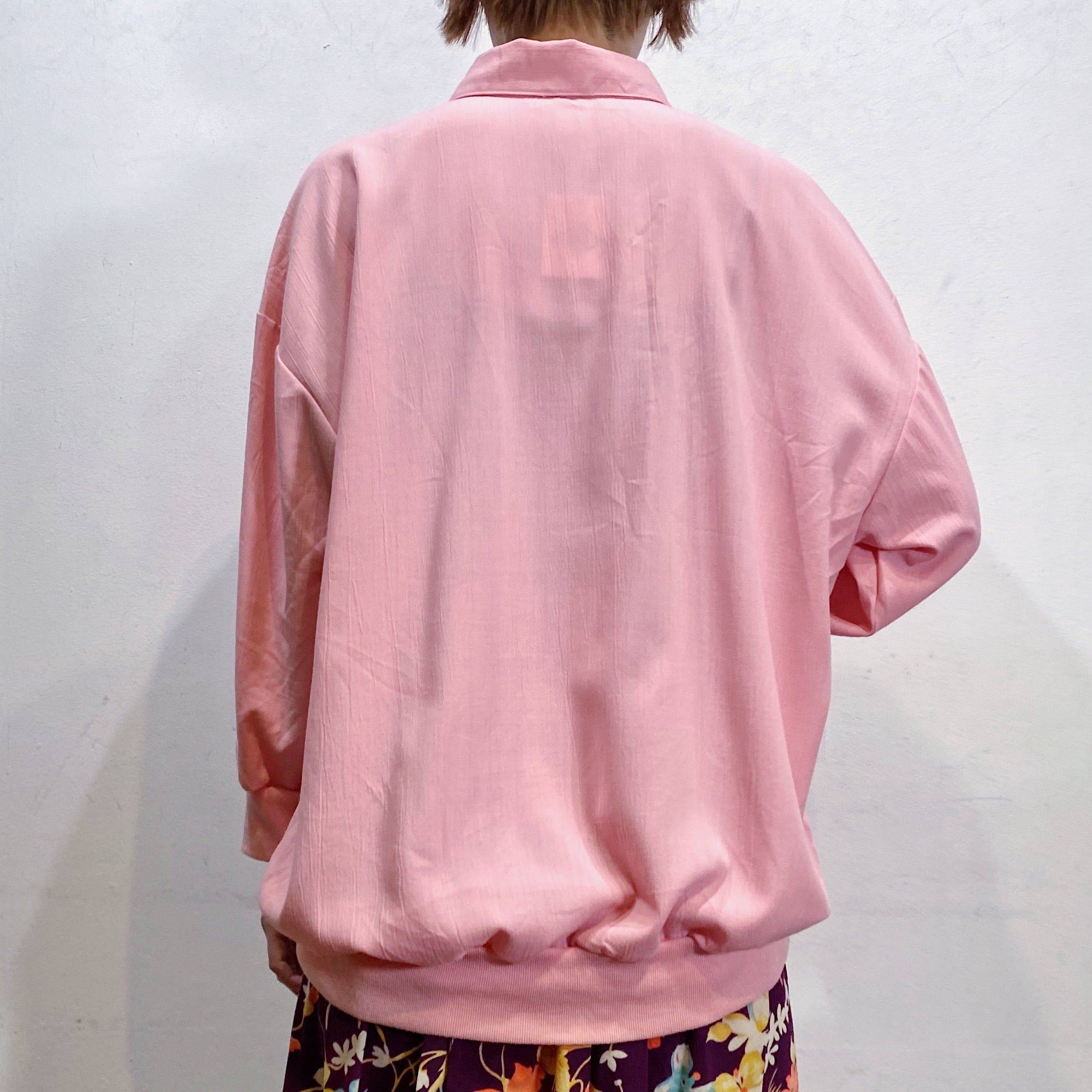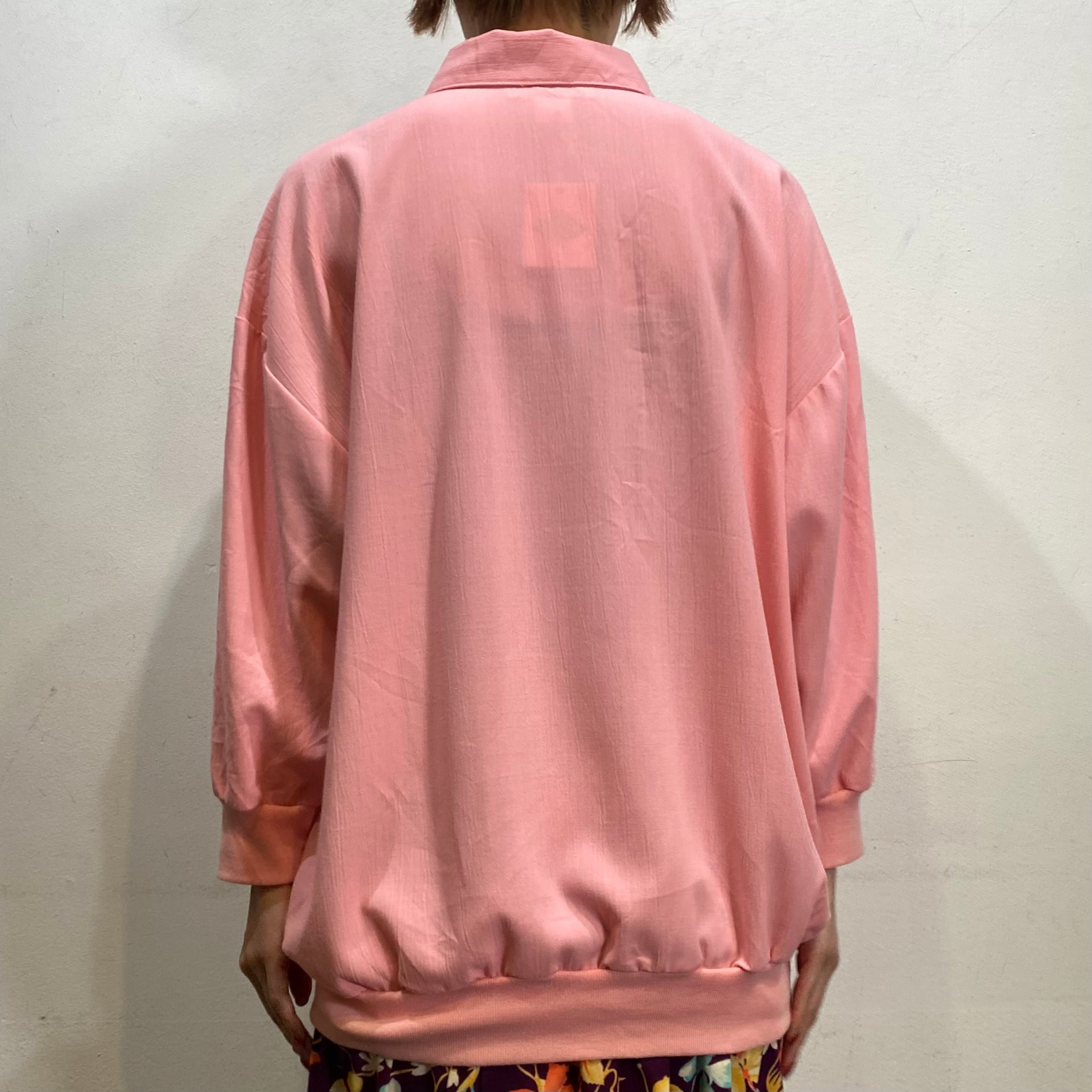 ピンクベースの生地にピンクのスタッズとテープで装飾された、ユニークなトップスです。