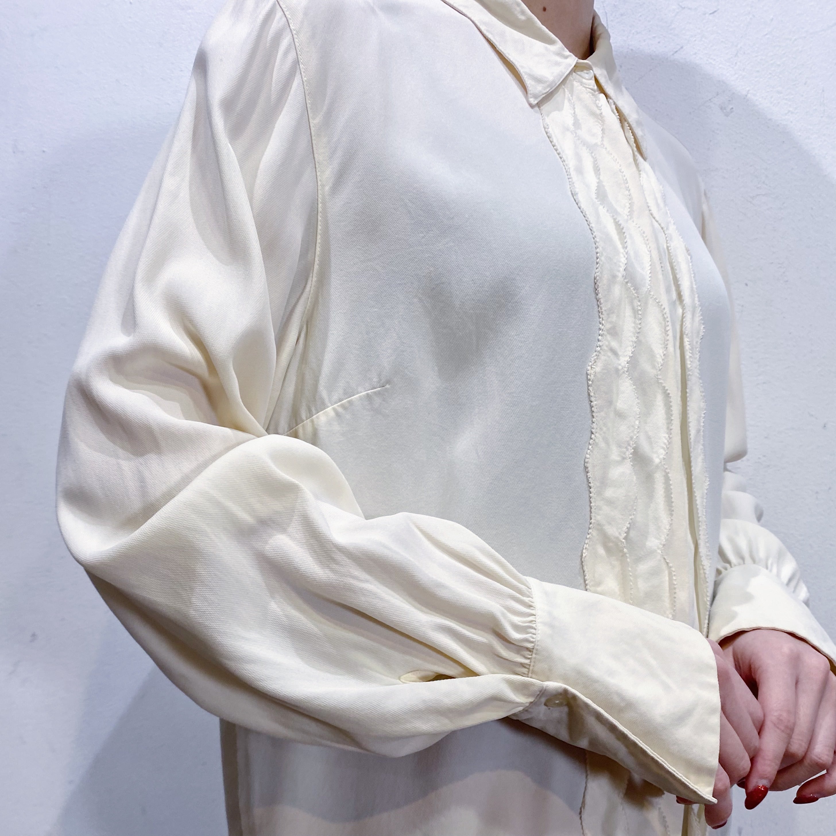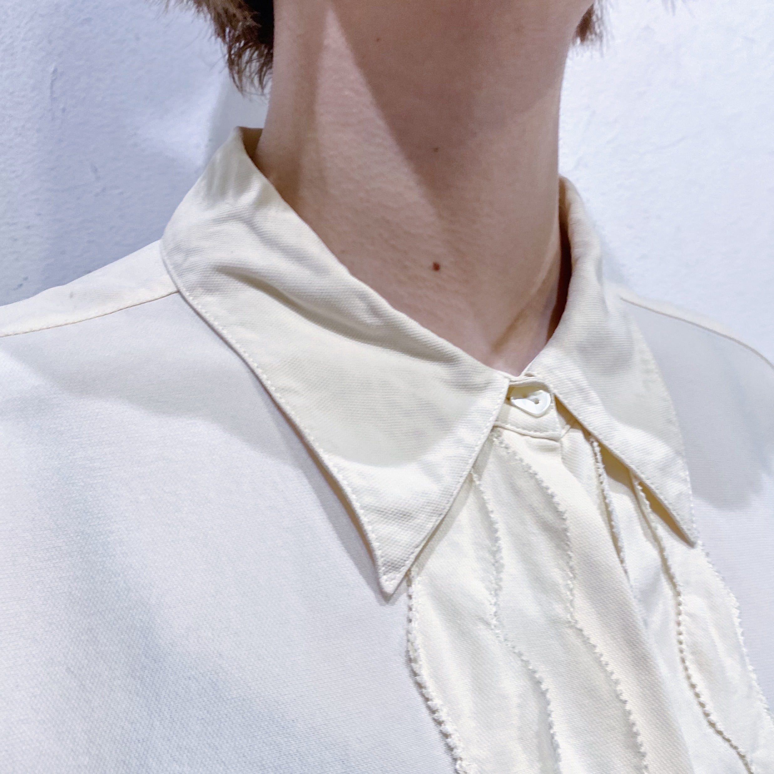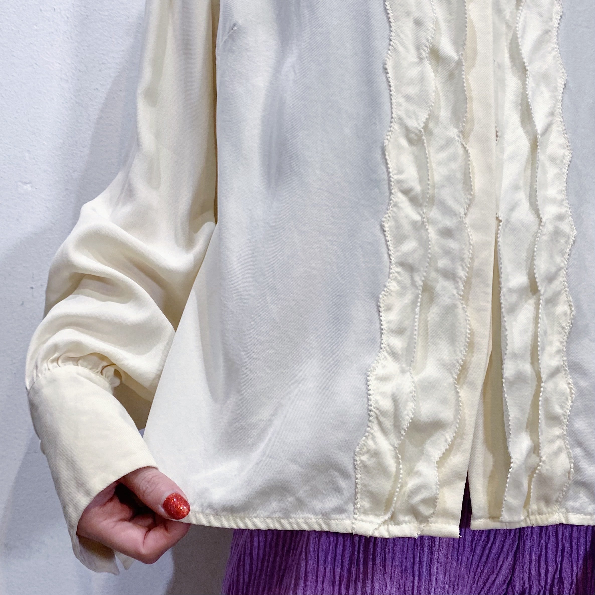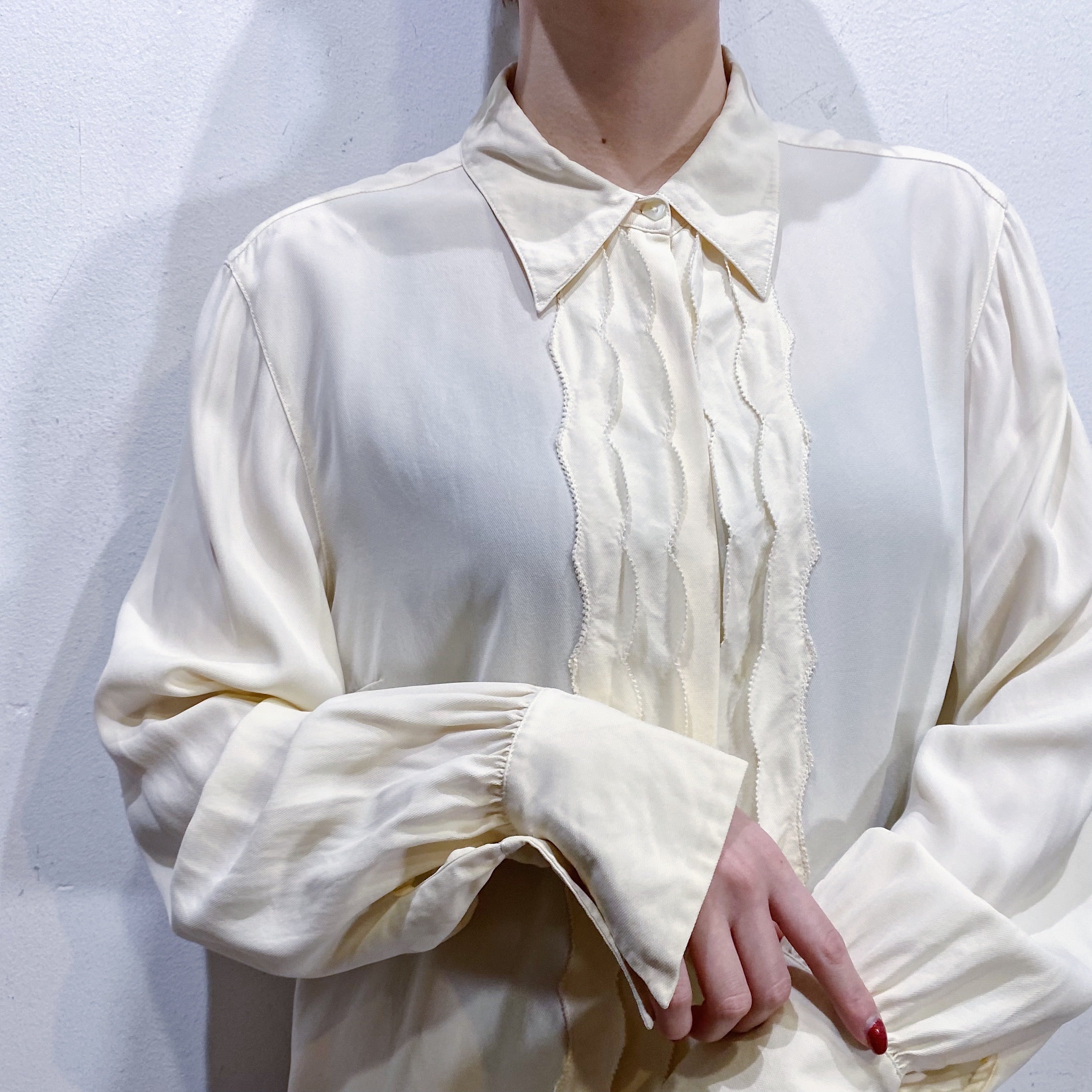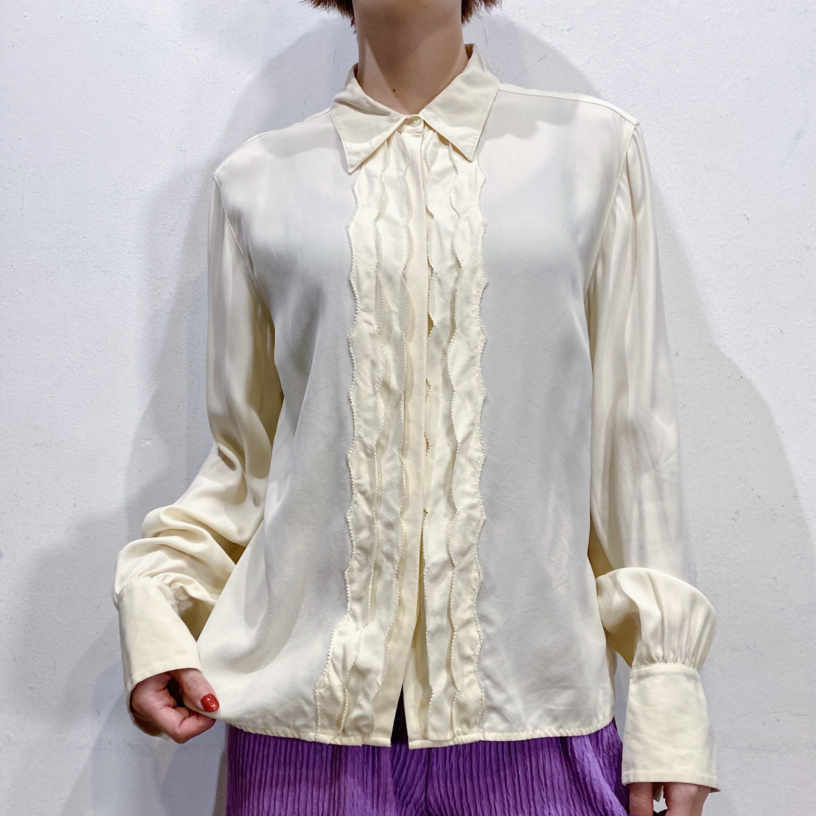 フロントのフリルデザインが可愛い、シルクシャツです。