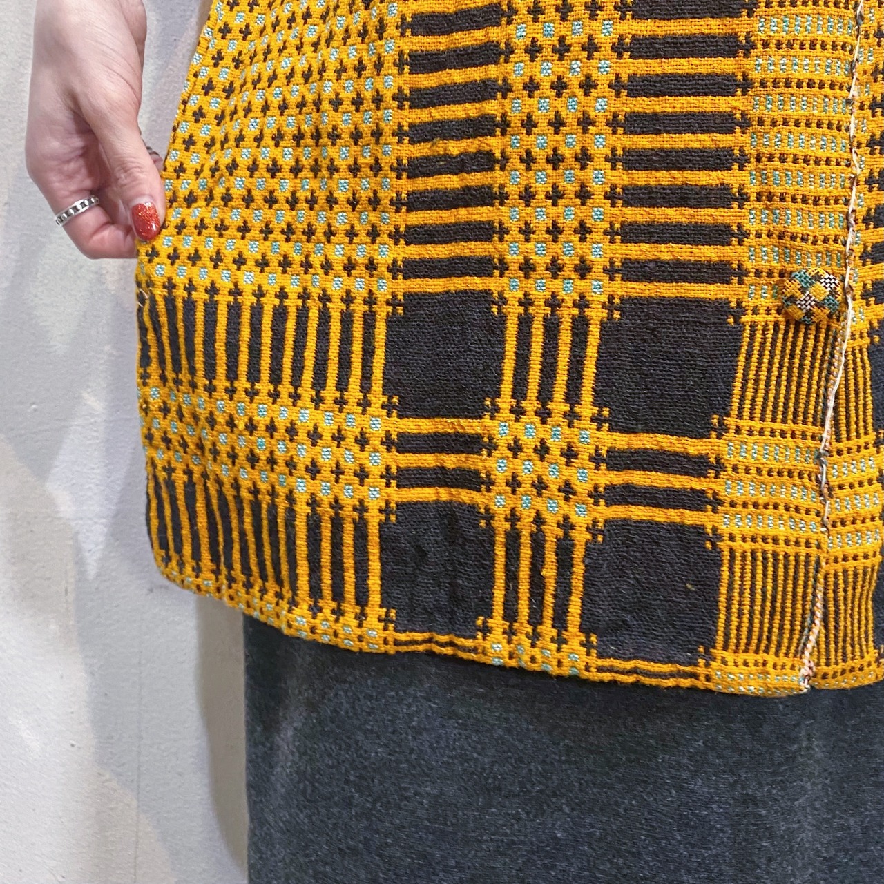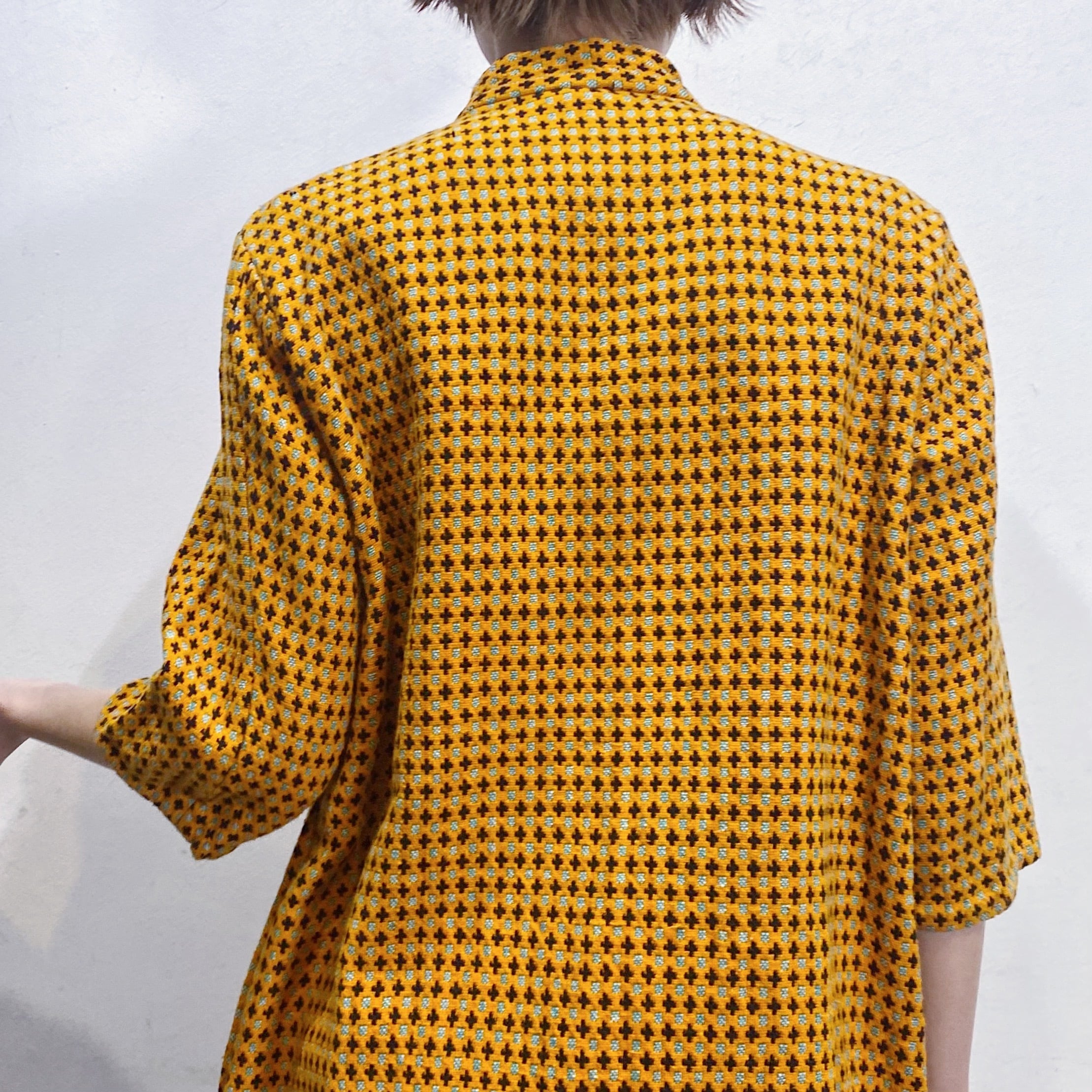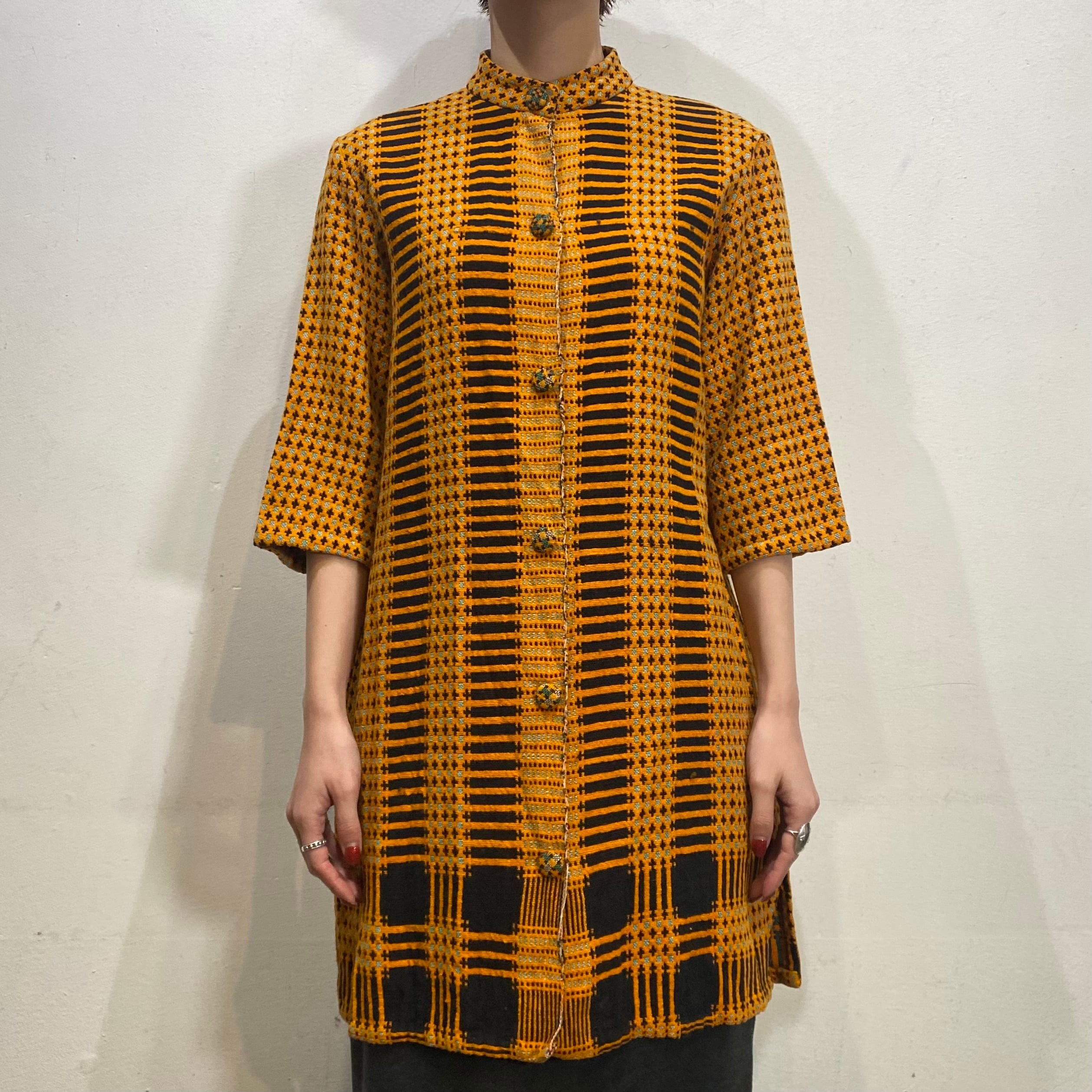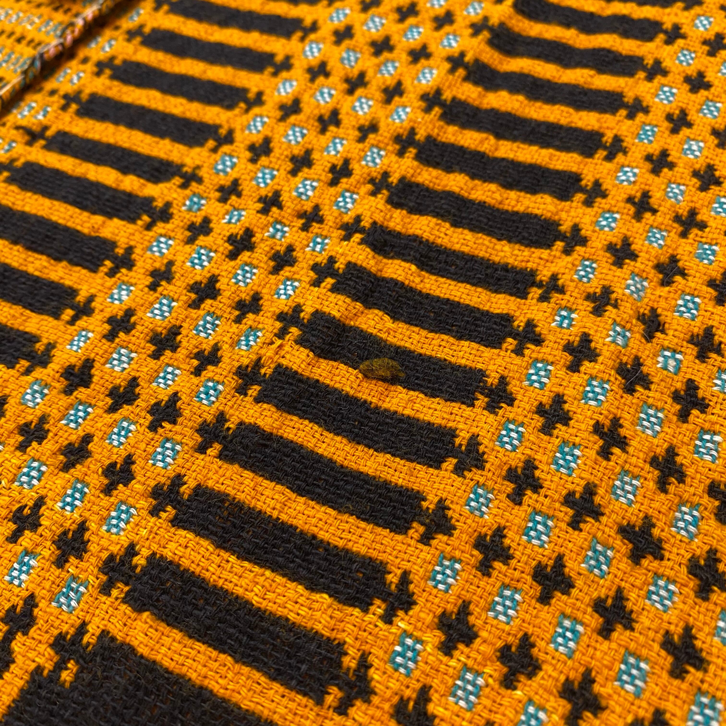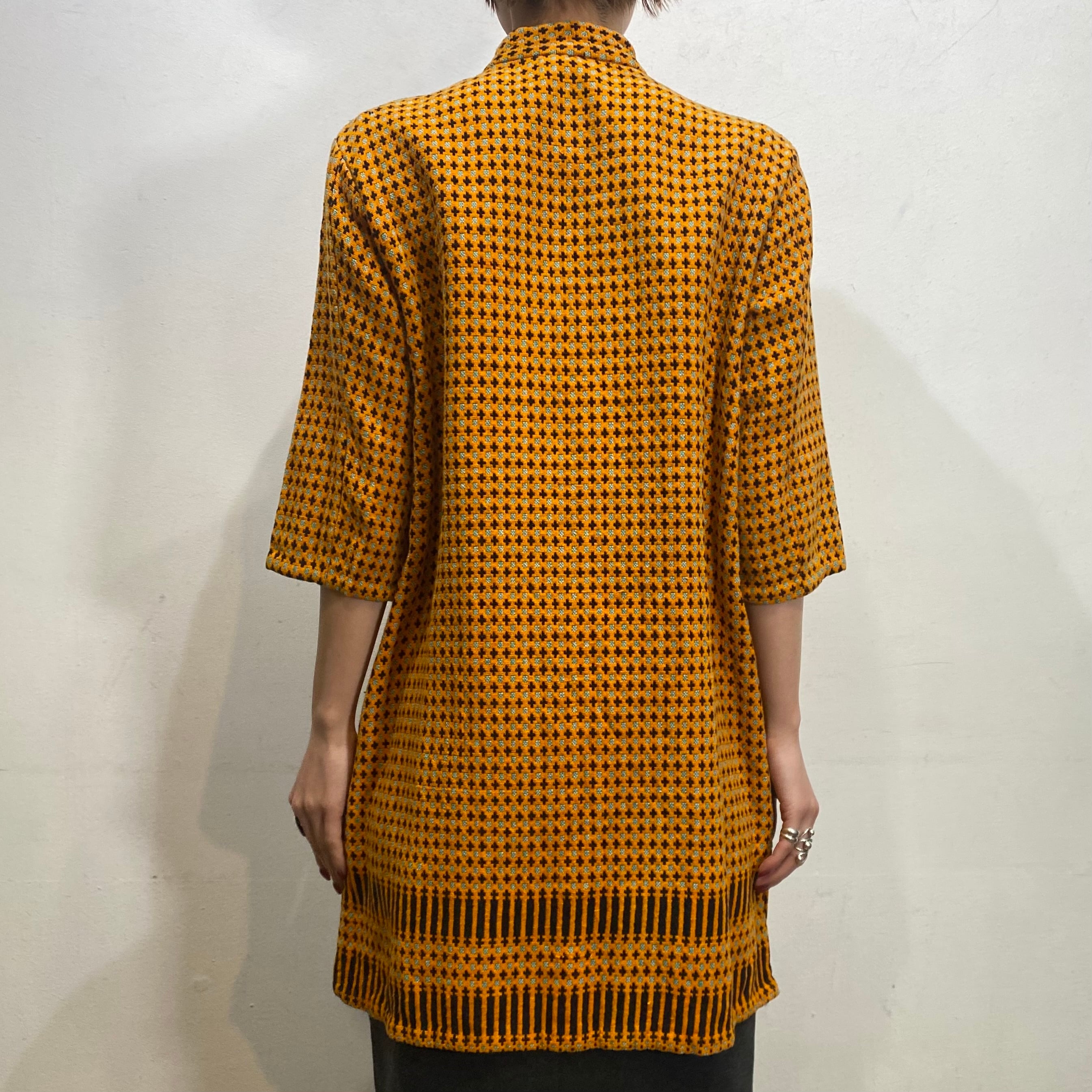 オレンジとブラックの色合わせに、前後で異なるユニークな模様は全て織られた一枚。