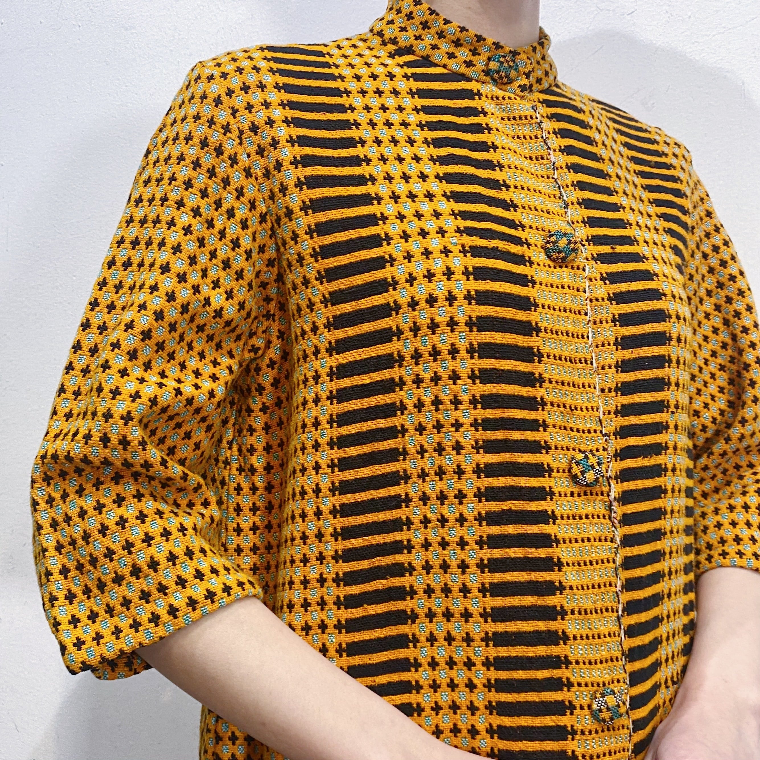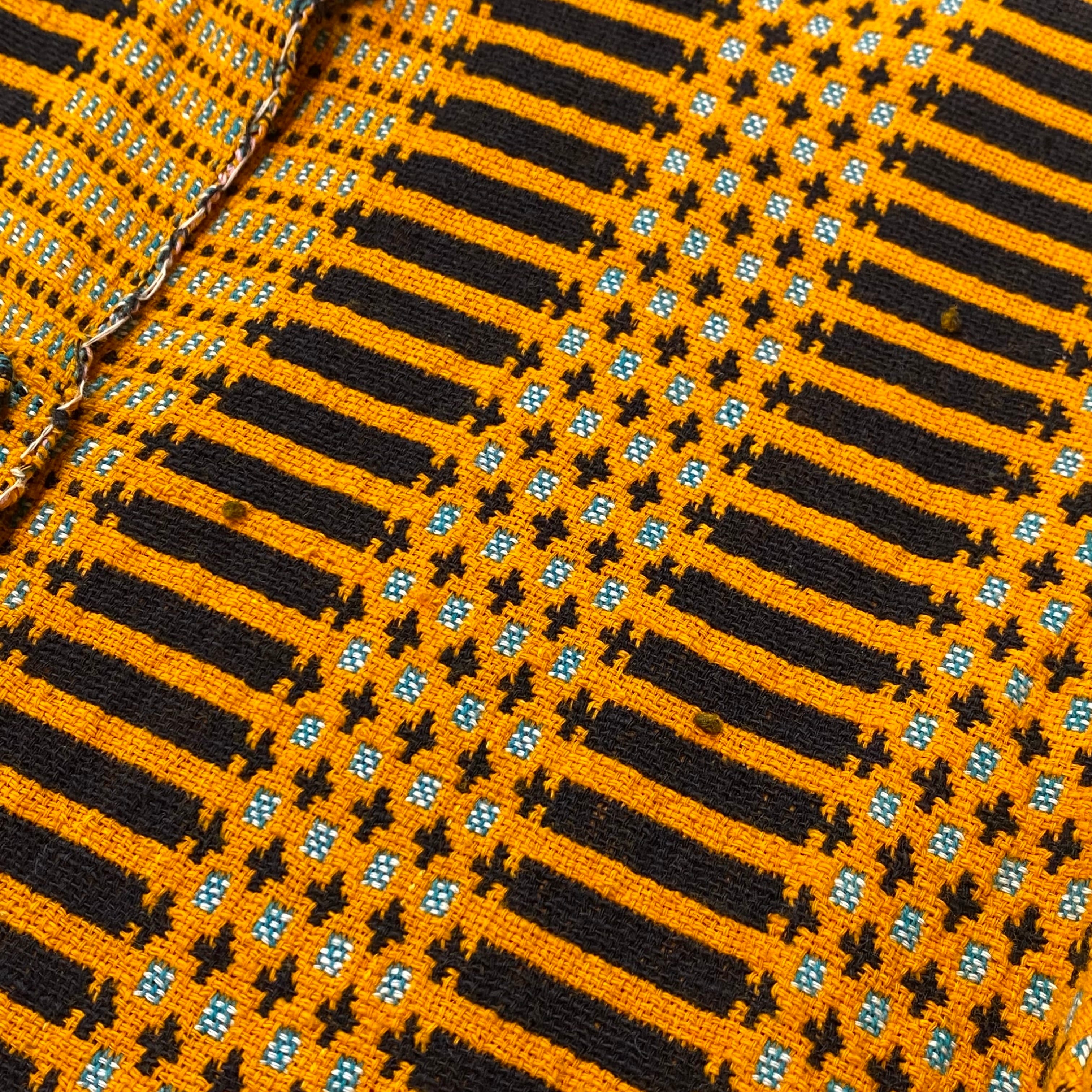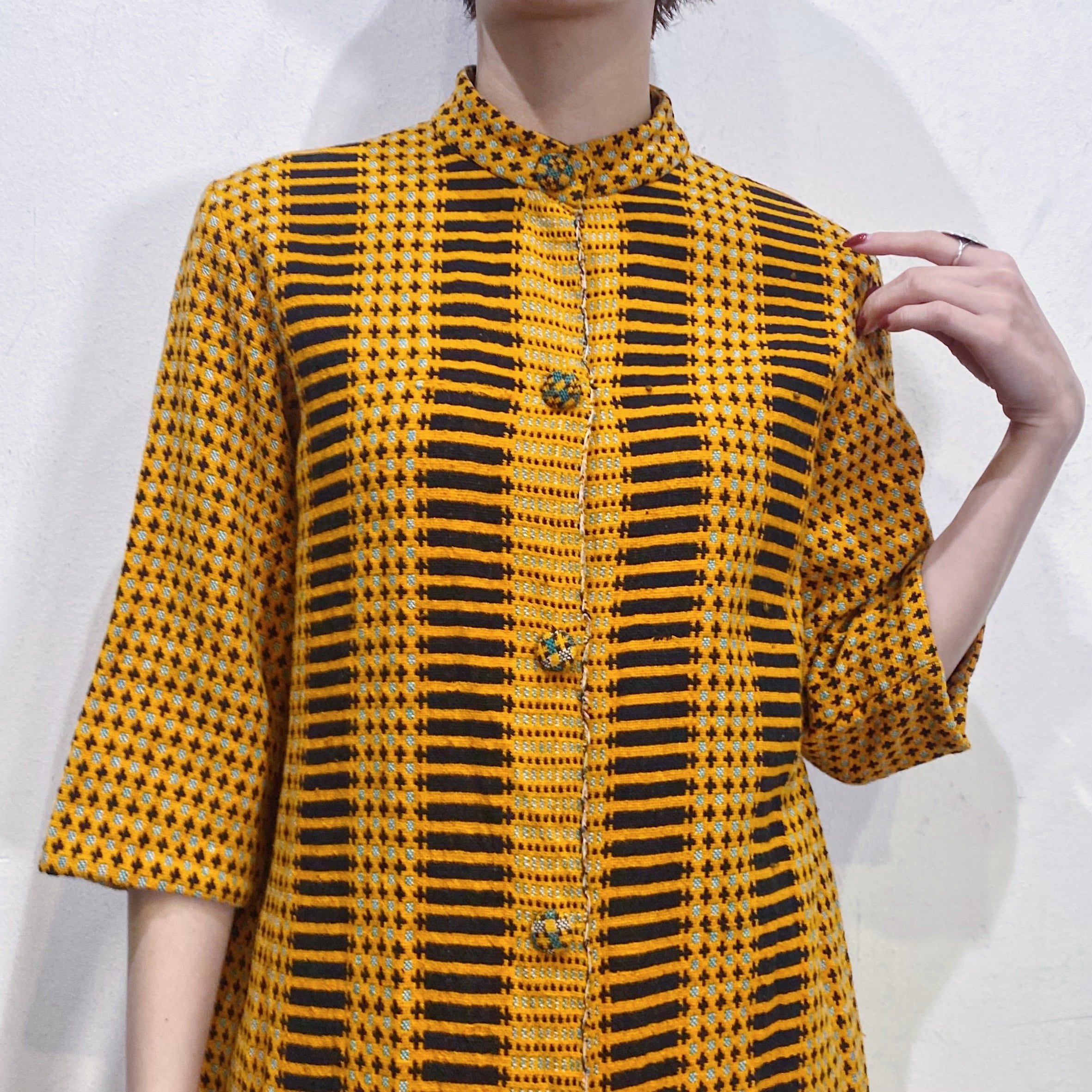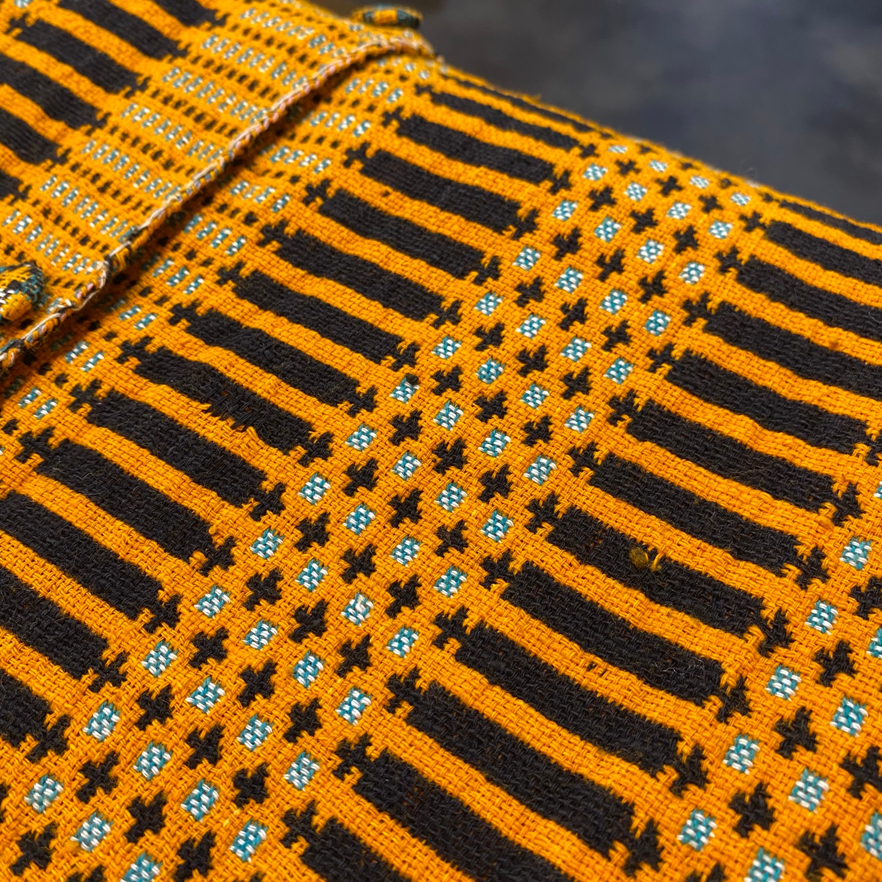 オレンジとブラックの色合わせに、前後で異なるユニークな模様は全て織られた一枚。