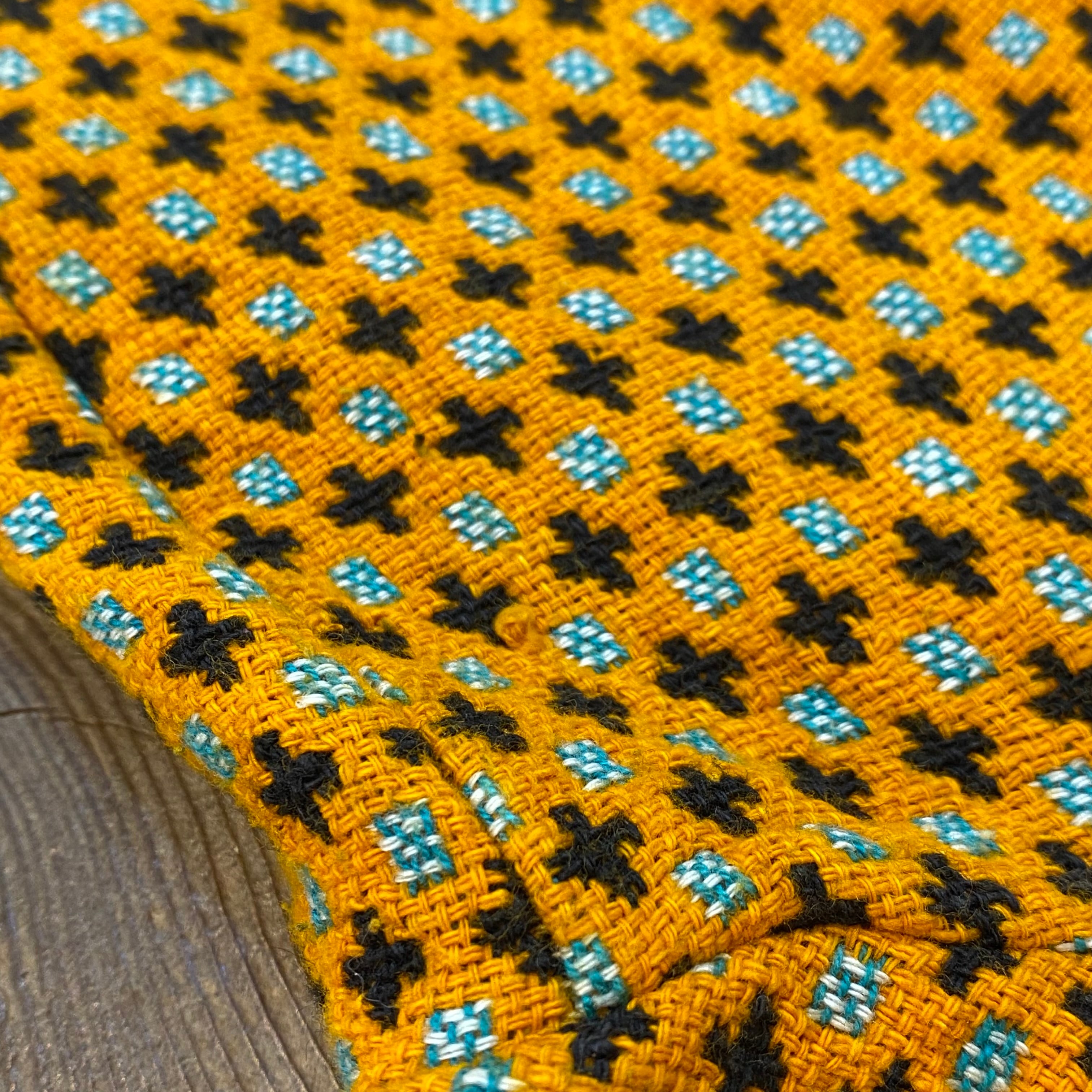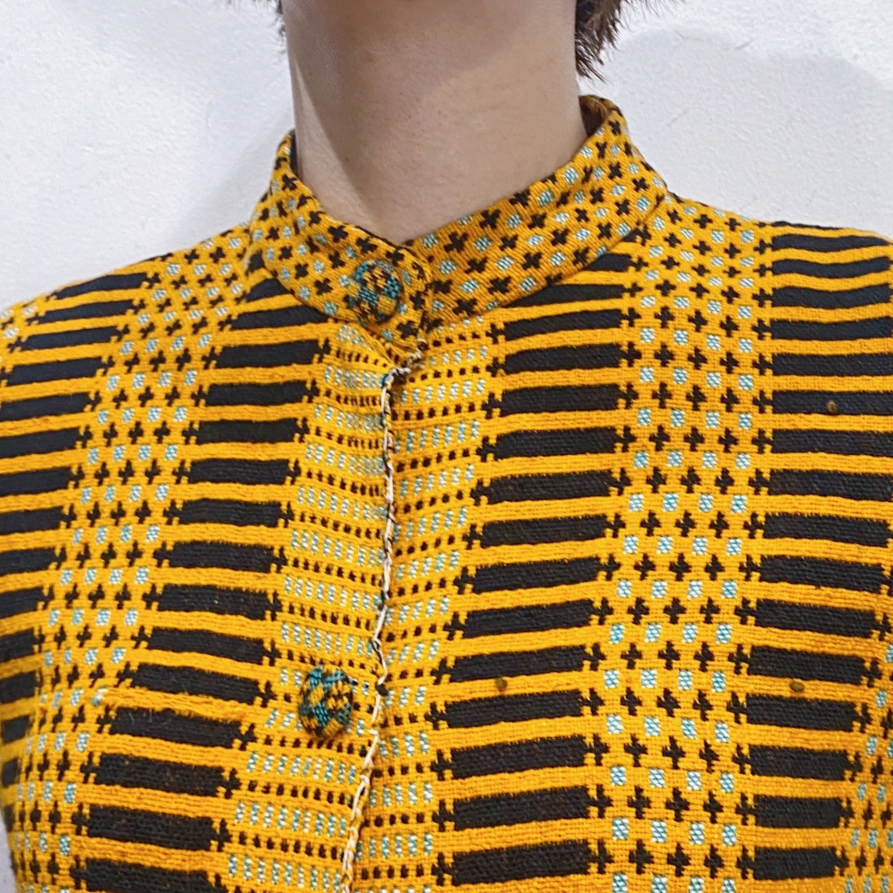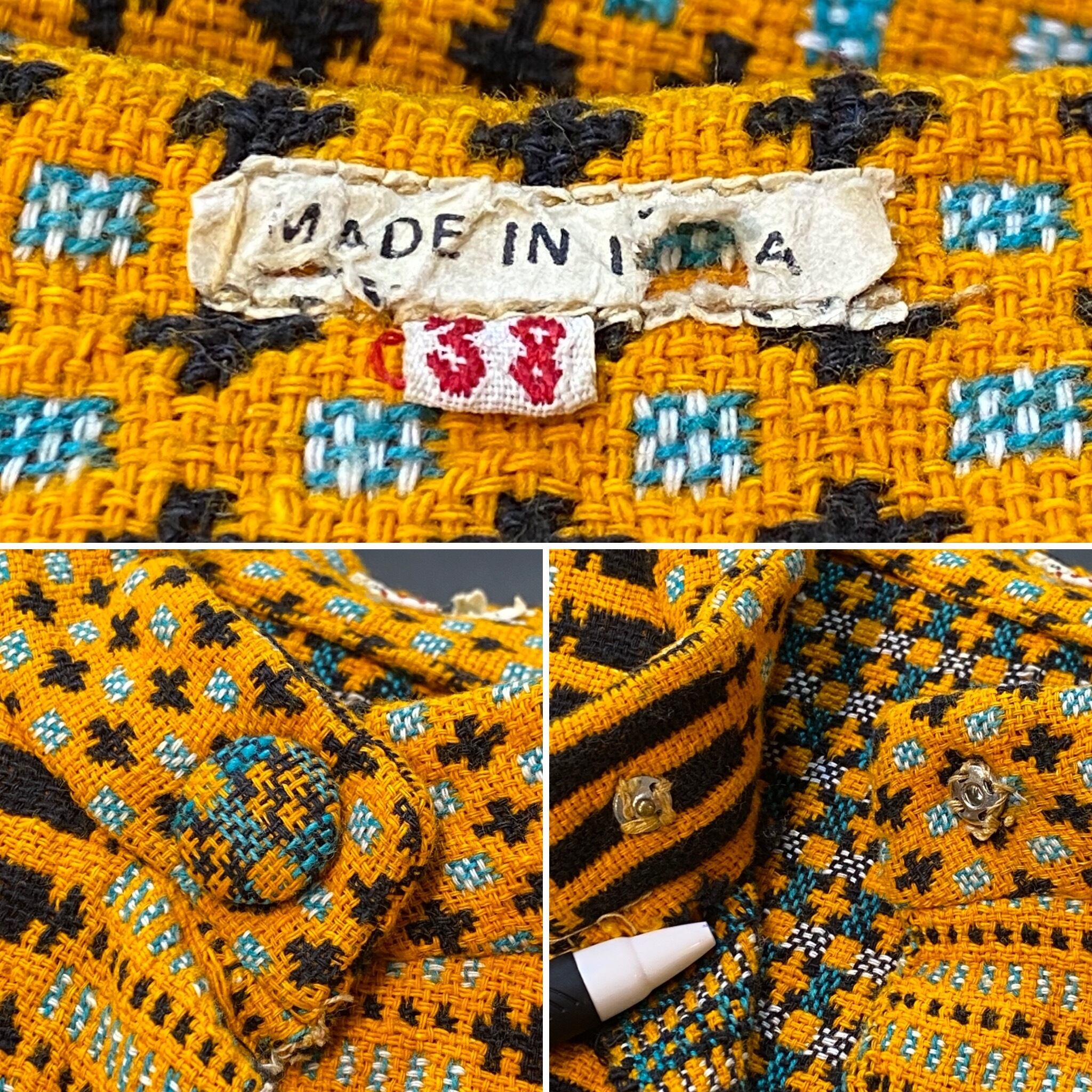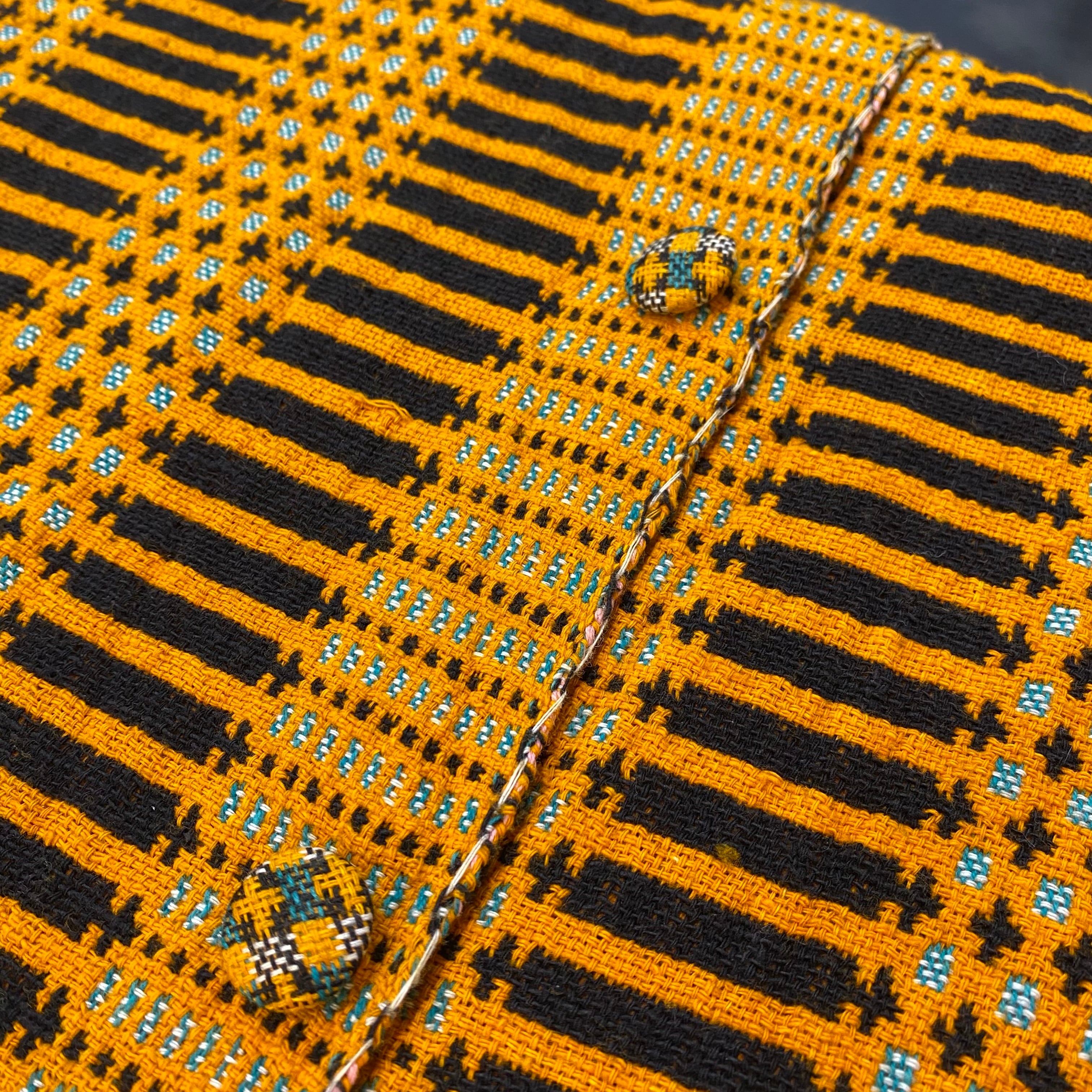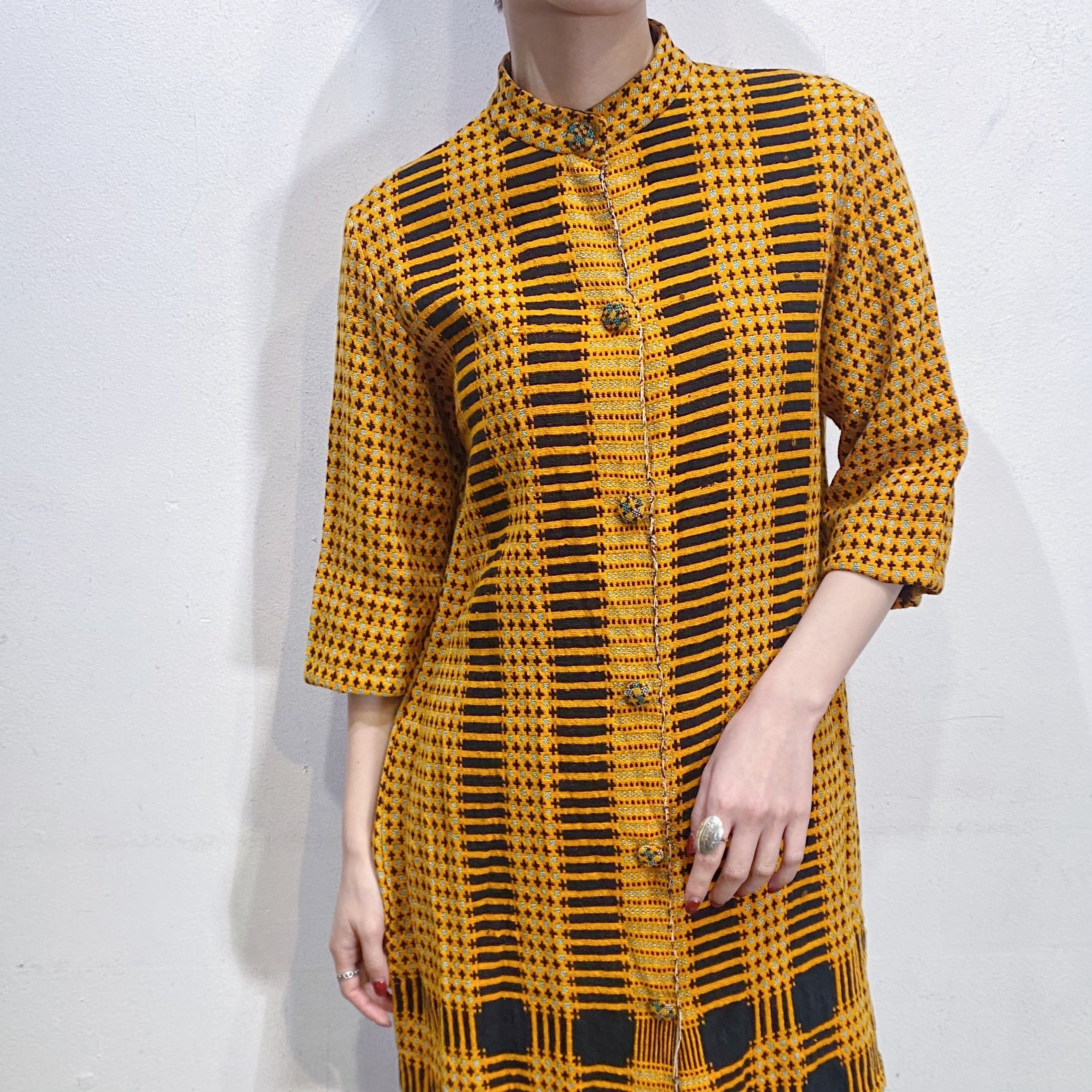 オレンジとブラックの色合わせに、前後で異なるユニークな模様は全て織られた一枚。