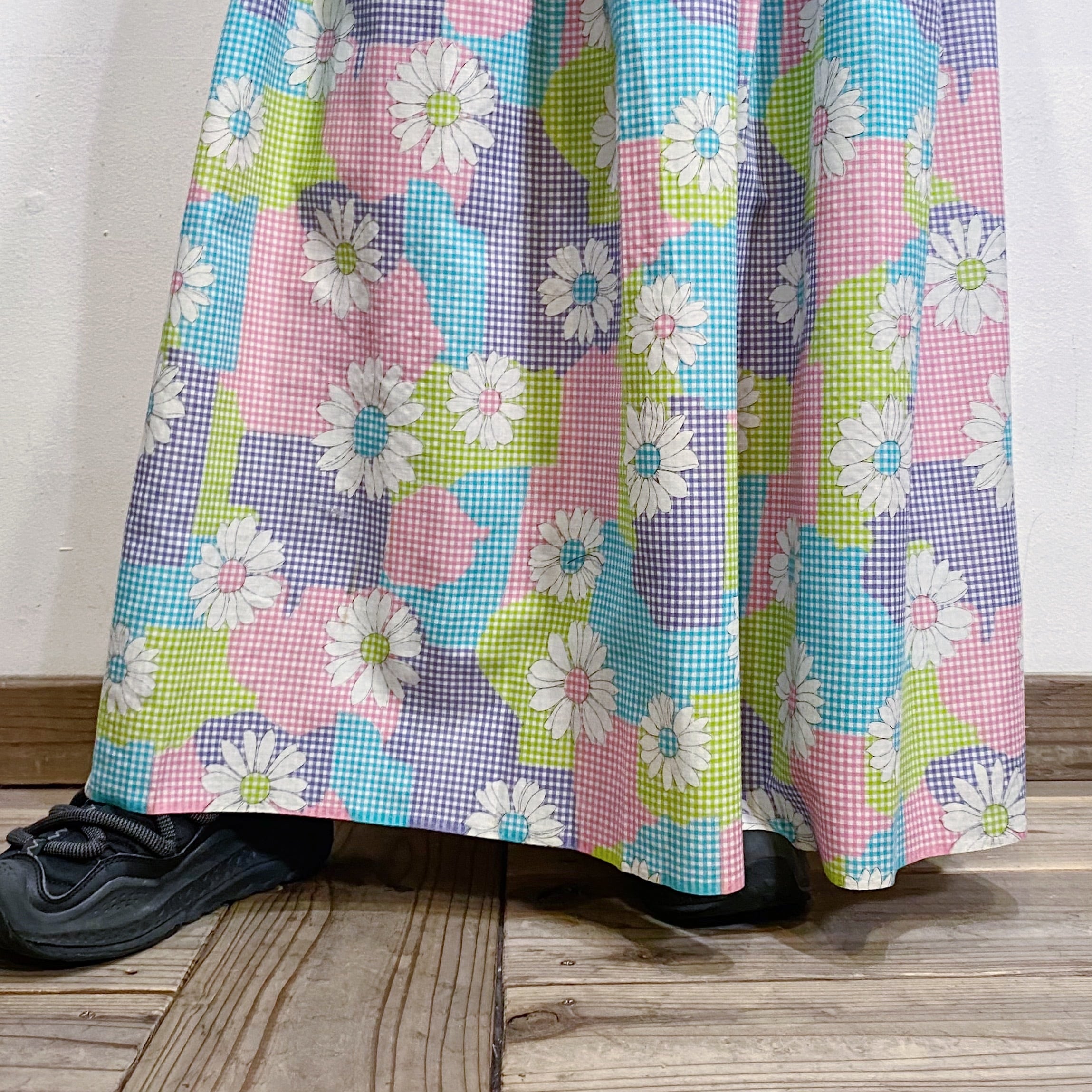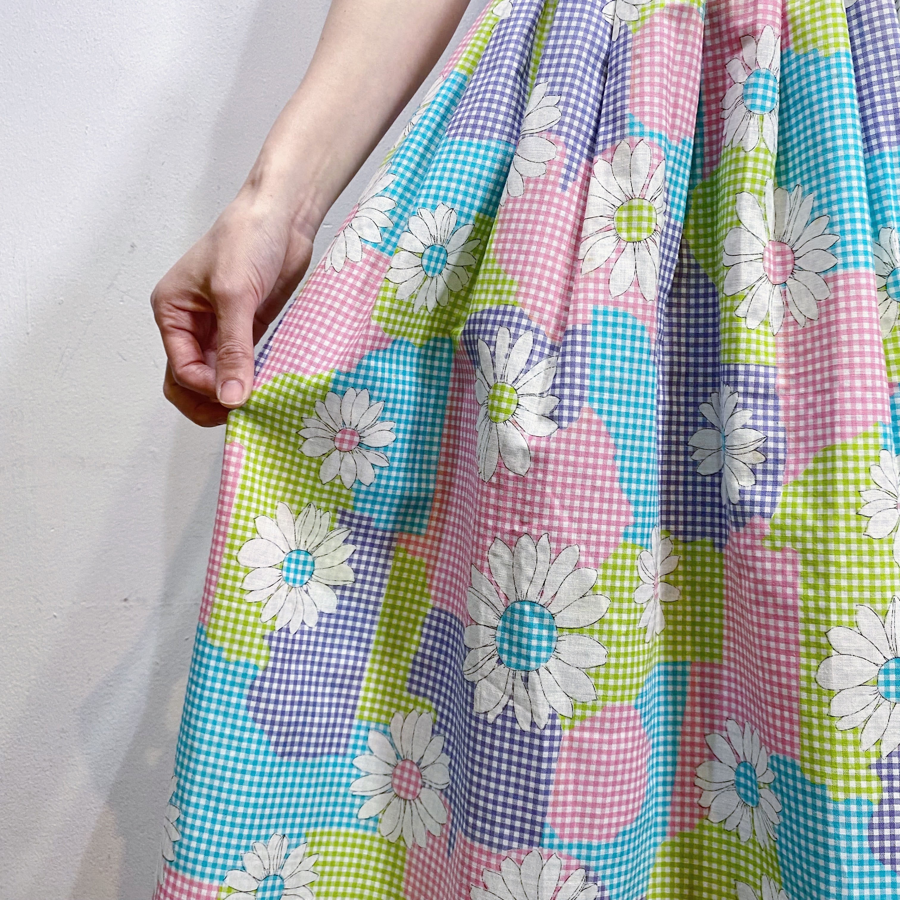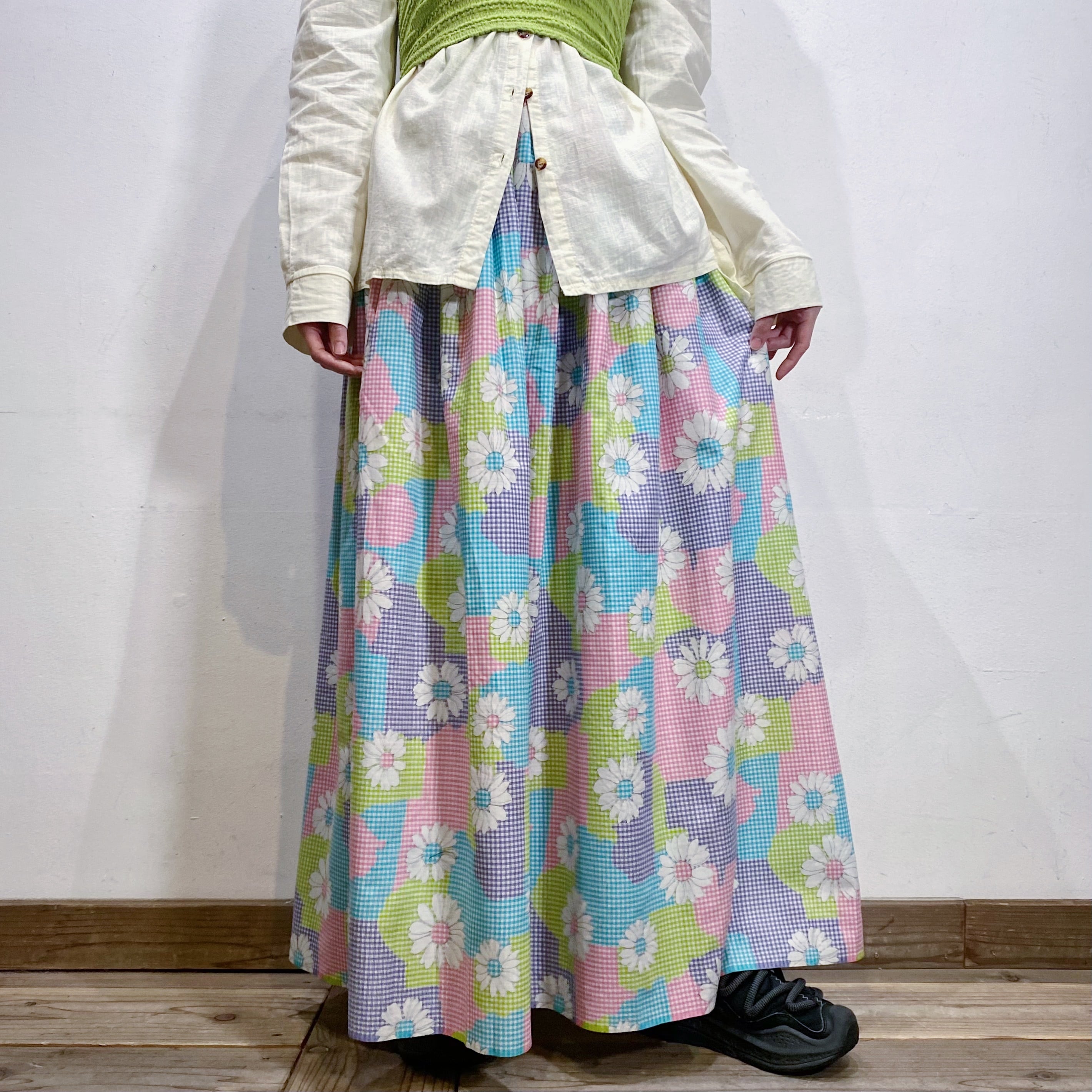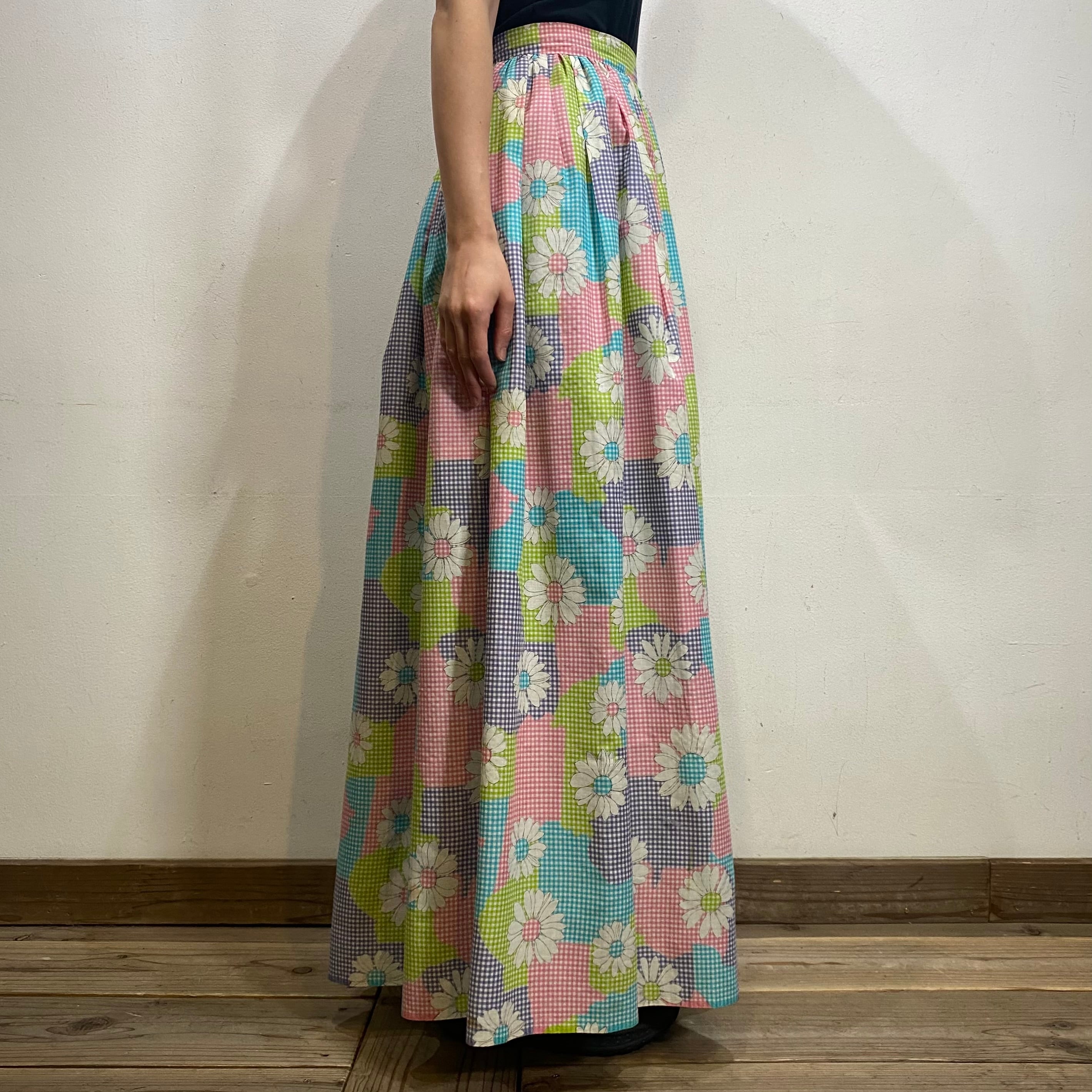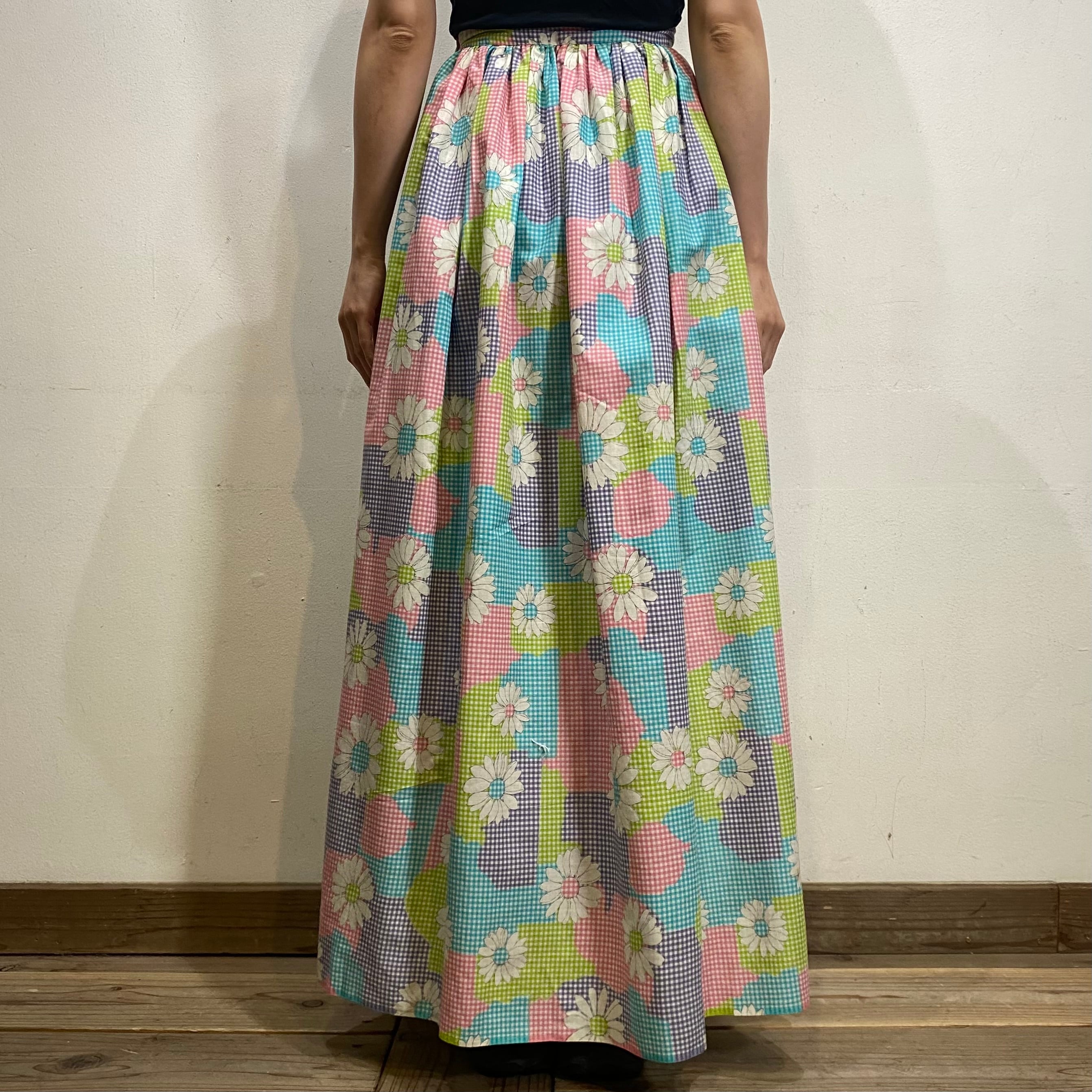 水色やピンク、黄緑などの色合わせが可愛い、70年代のスカートです。