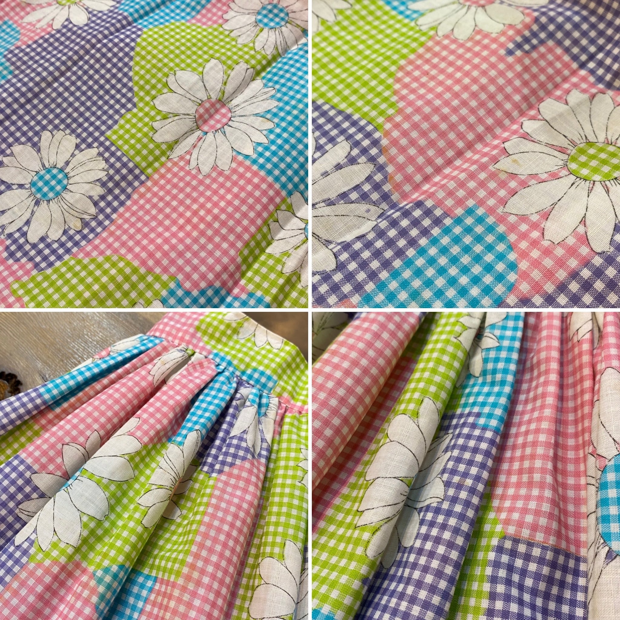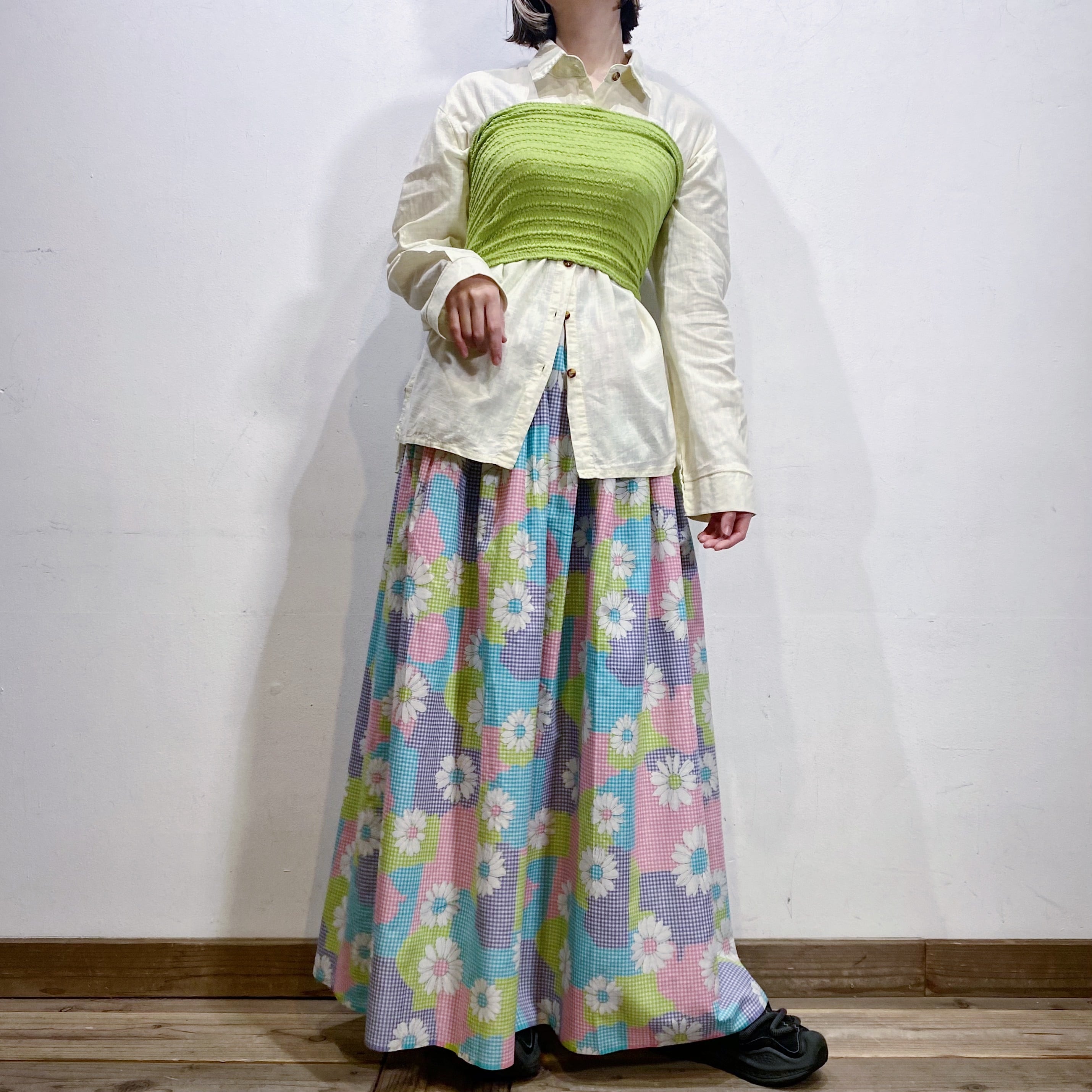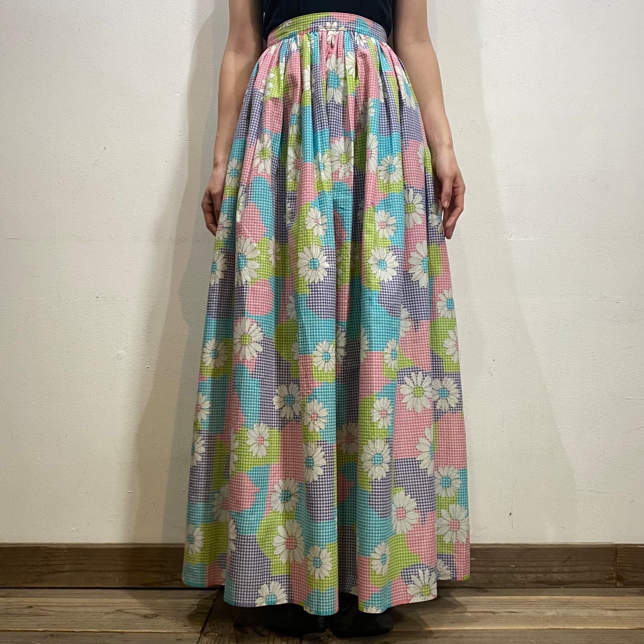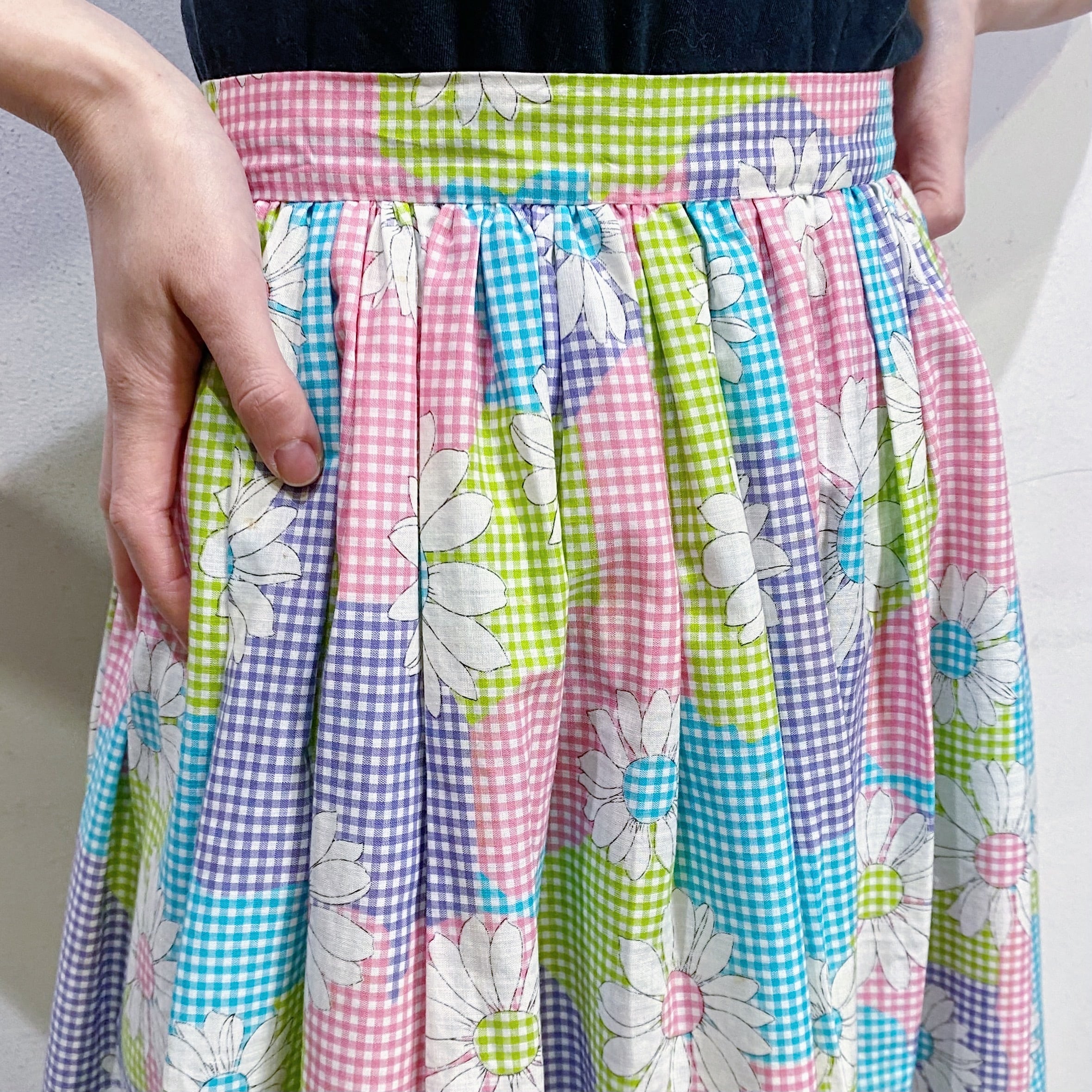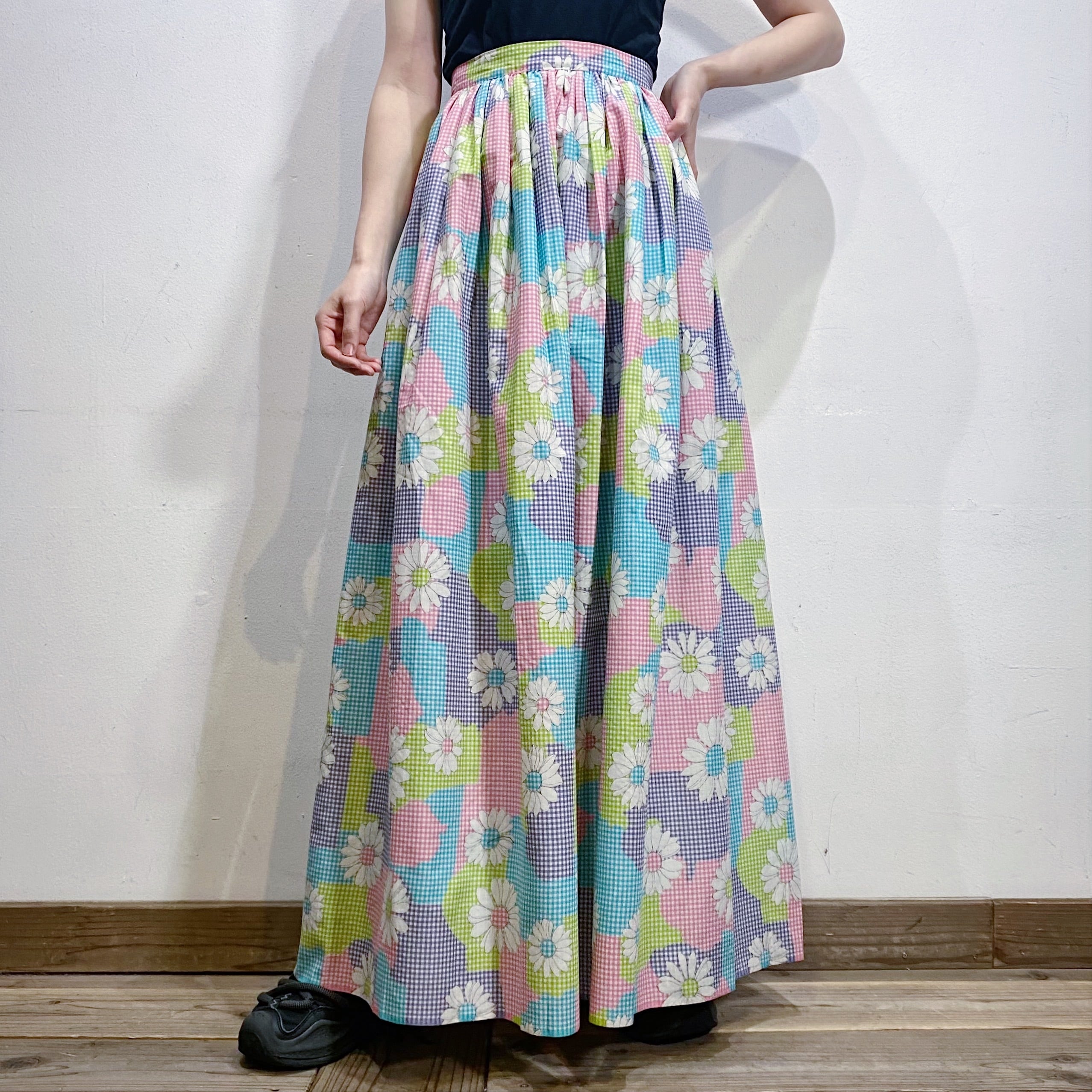 水色やピンク、黄緑などの色合わせが可愛い、70年代のスカートです。