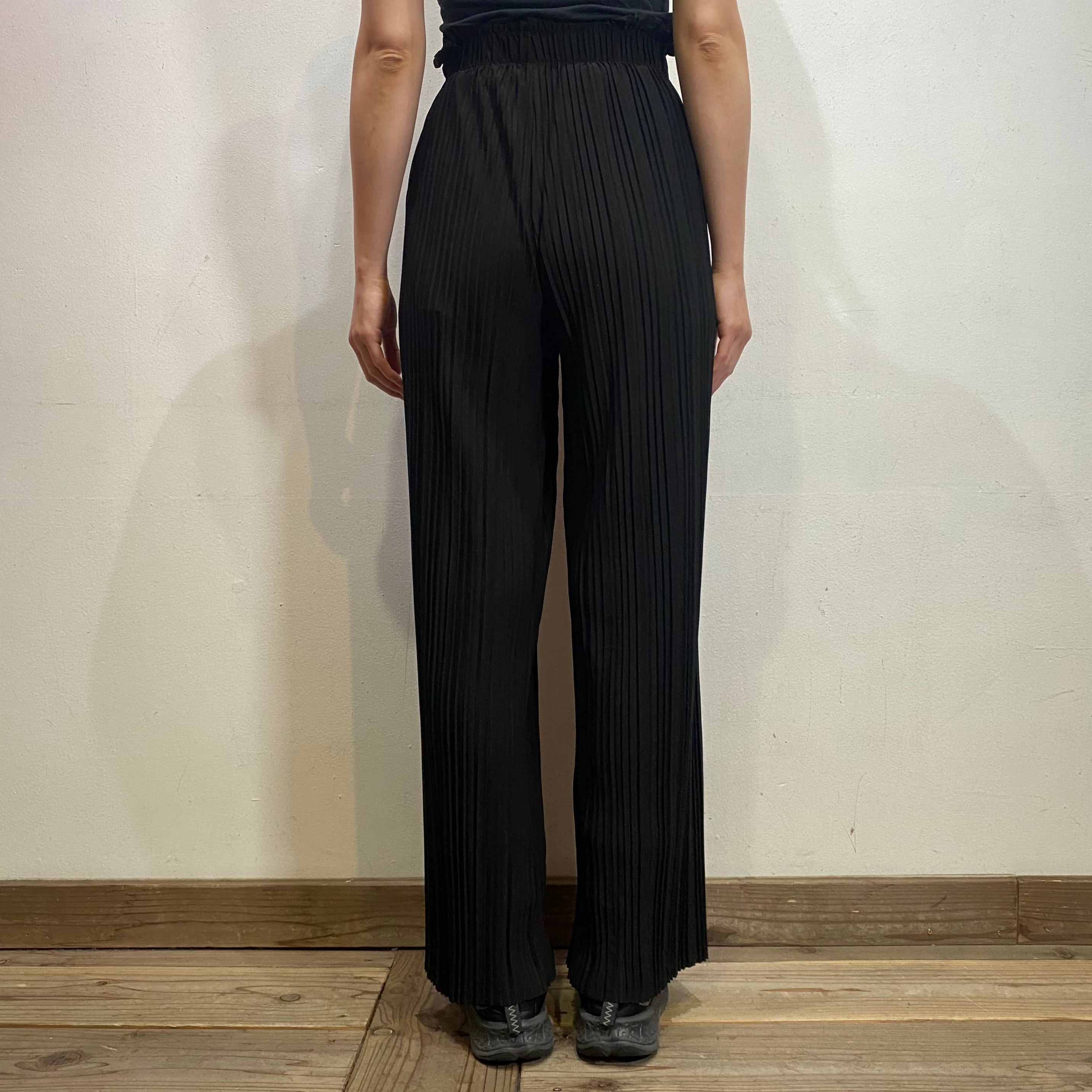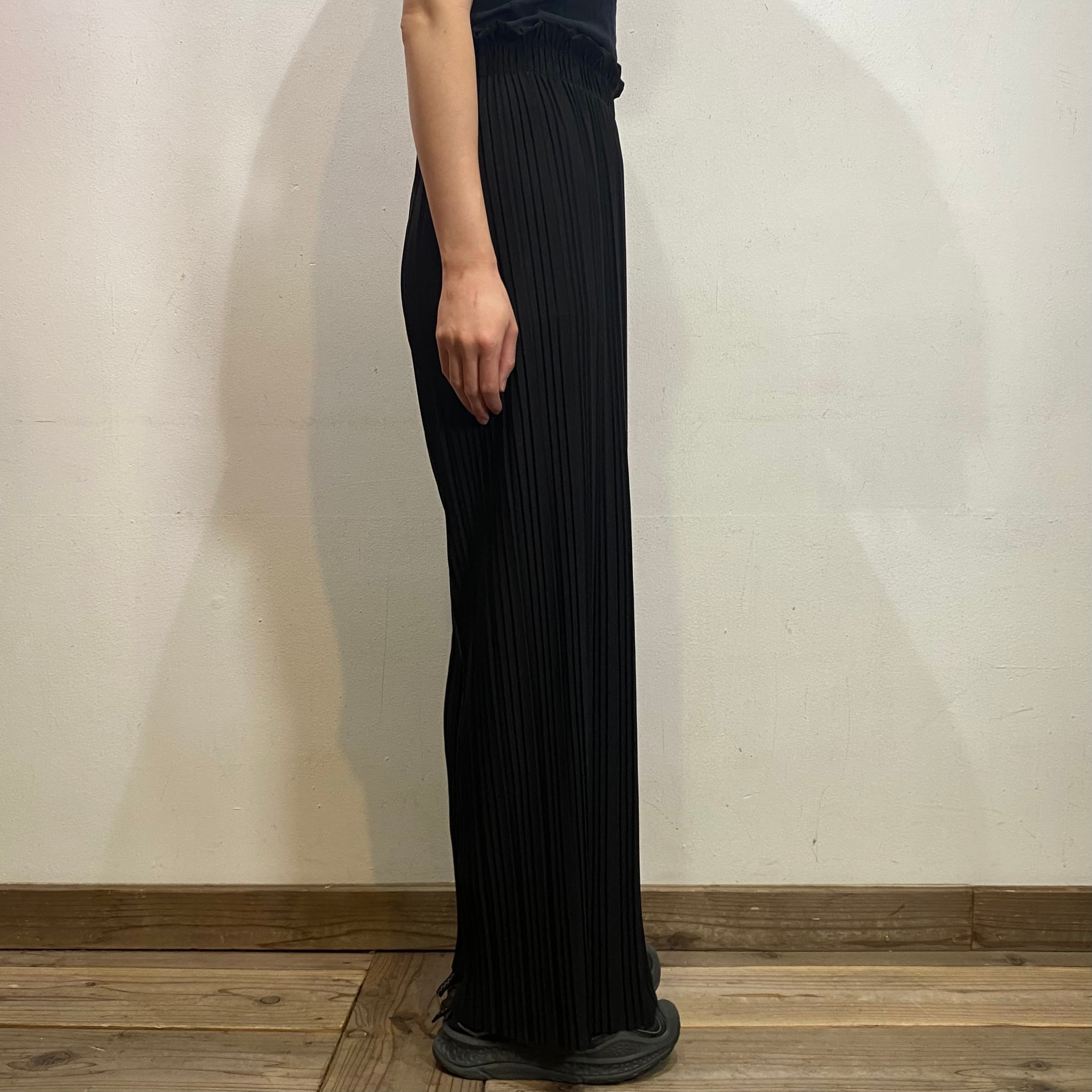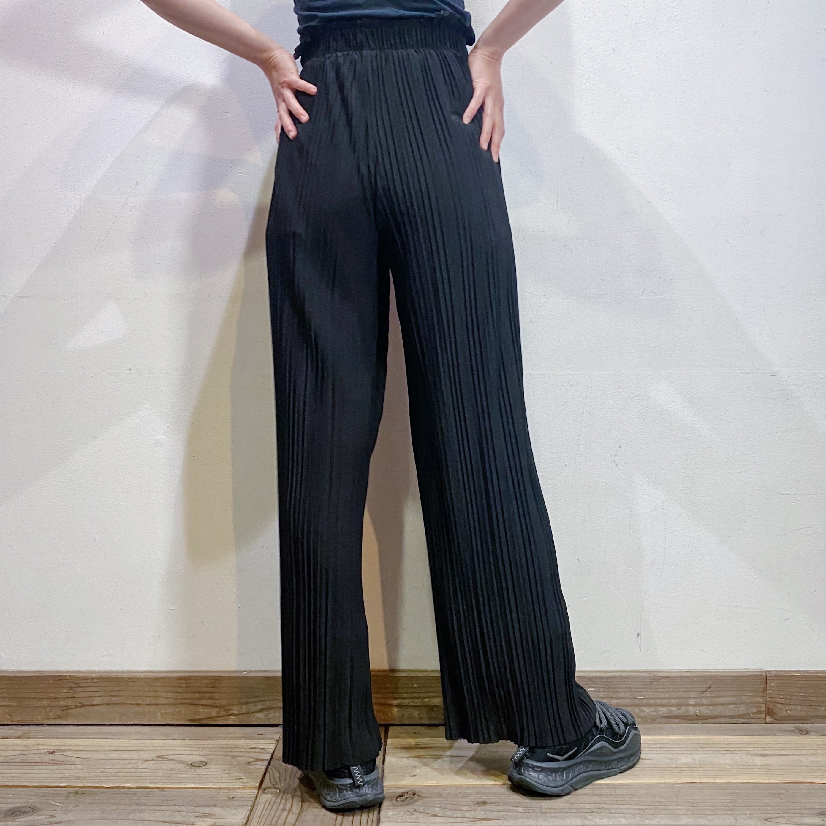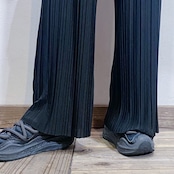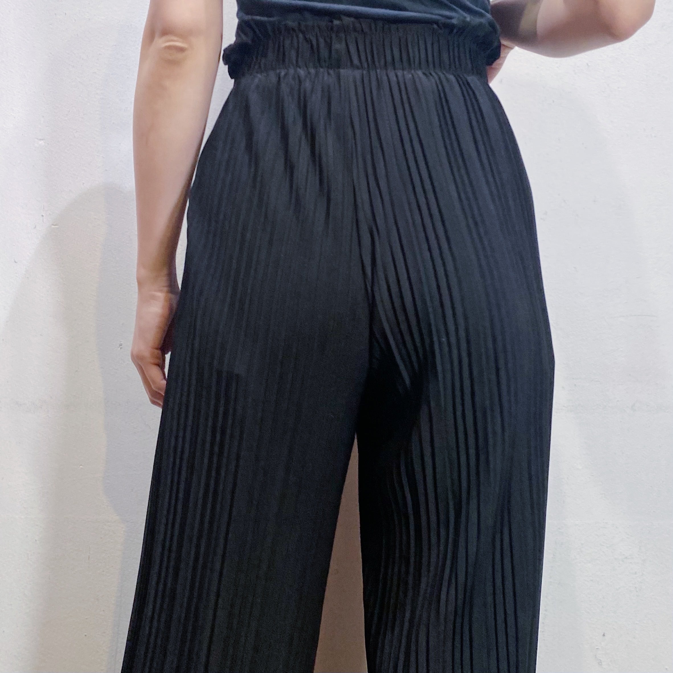 細かいプリーツ加工が施された、伸縮性のある素材感のワイドパンツです。