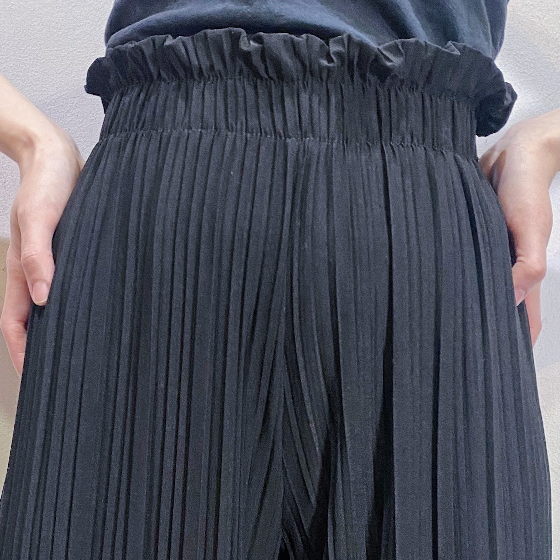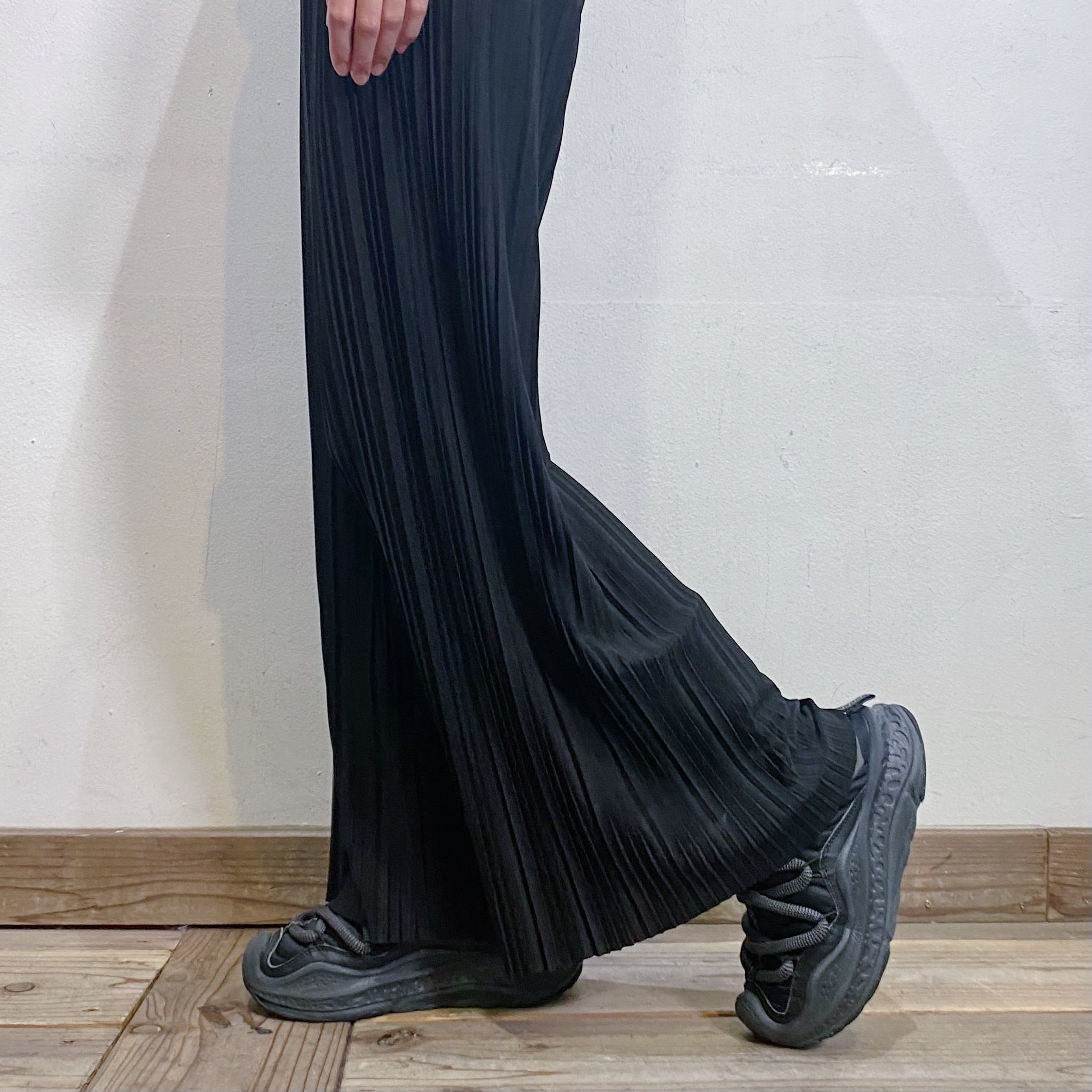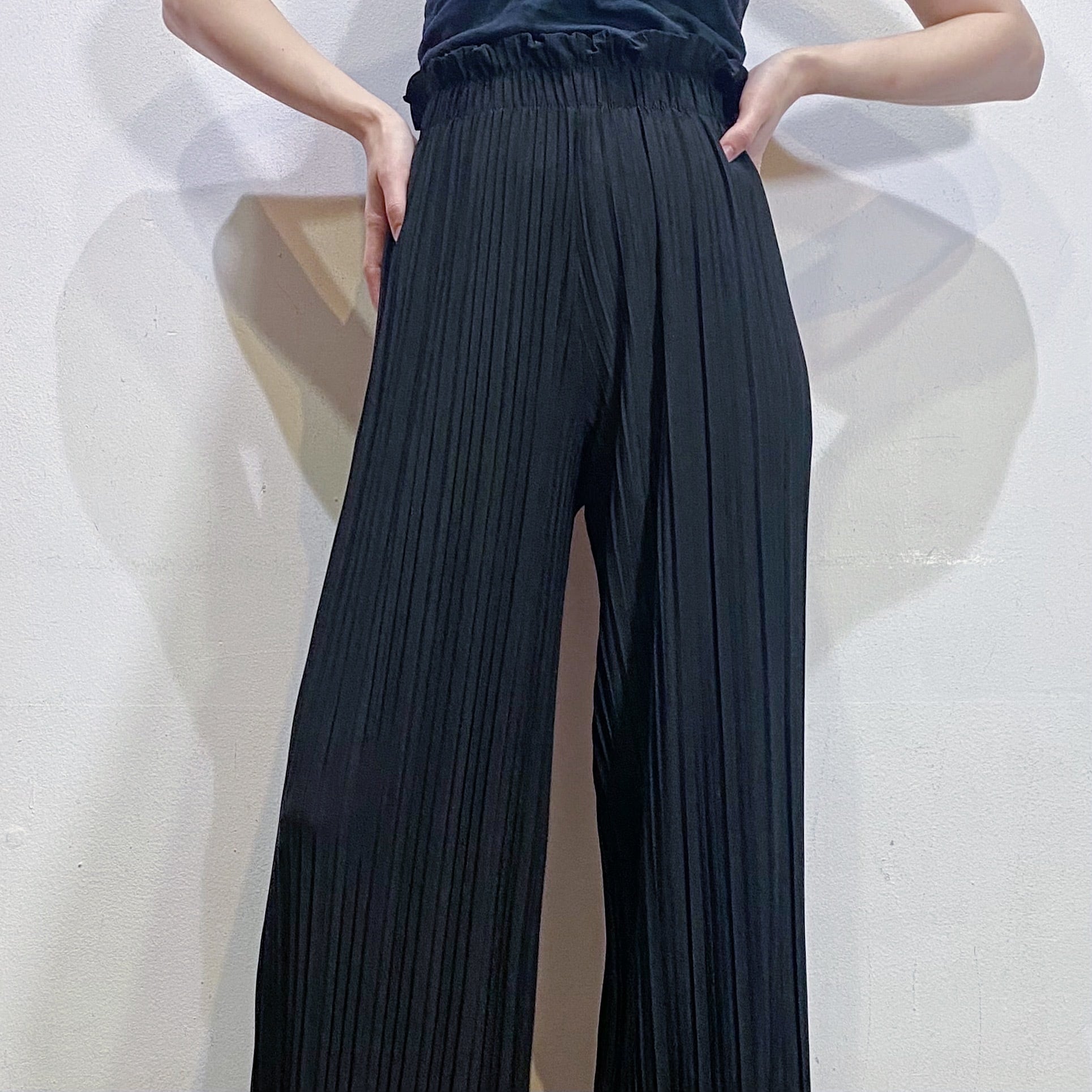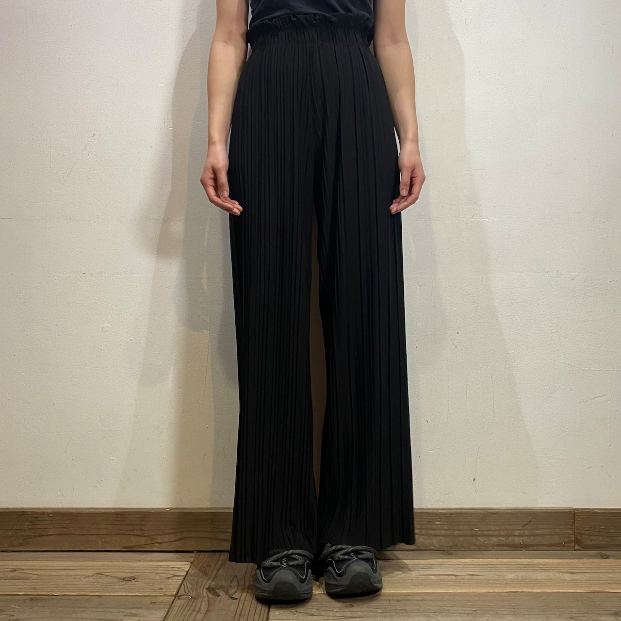 細かいプリーツ加工が施された、伸縮性のある素材感のワイドパンツです。