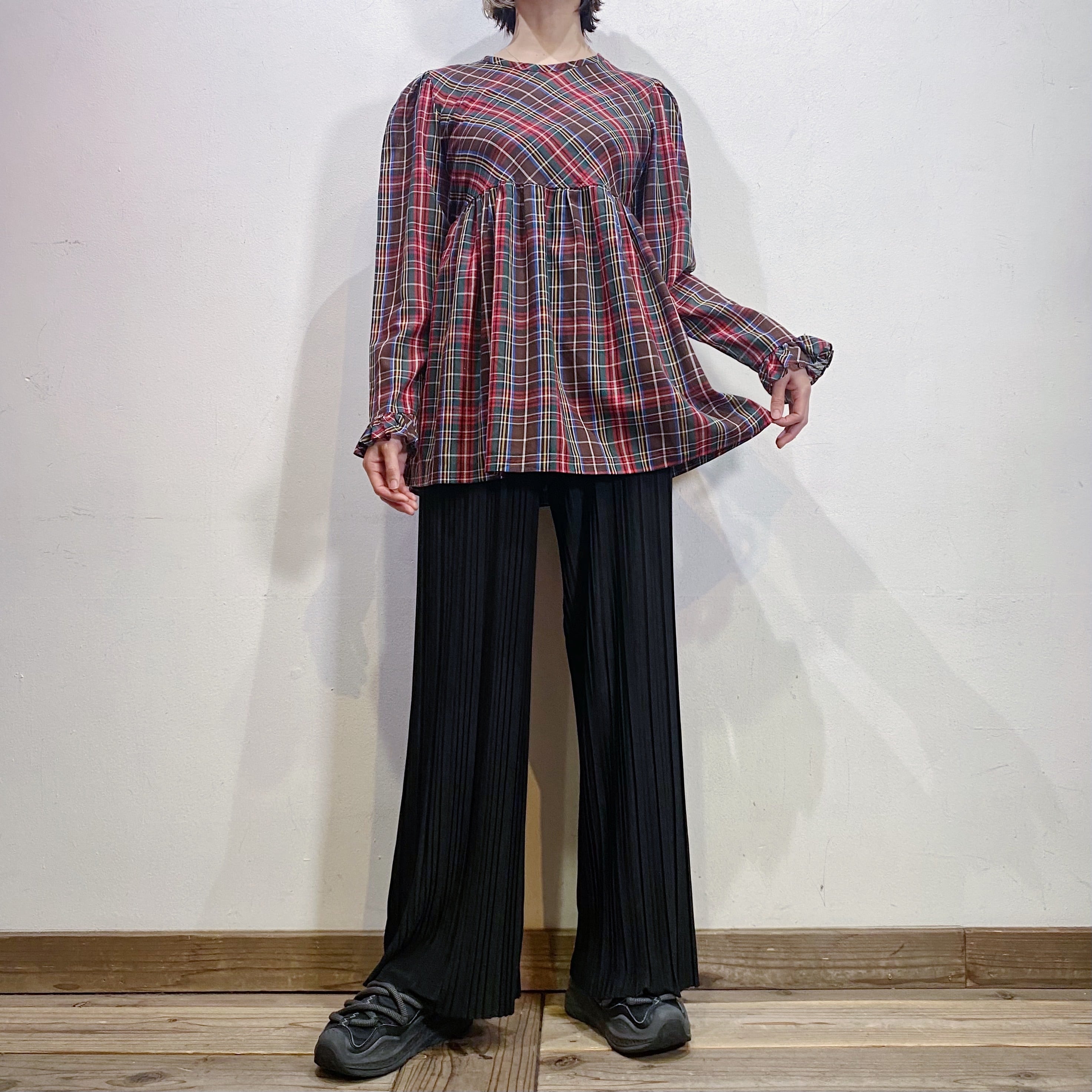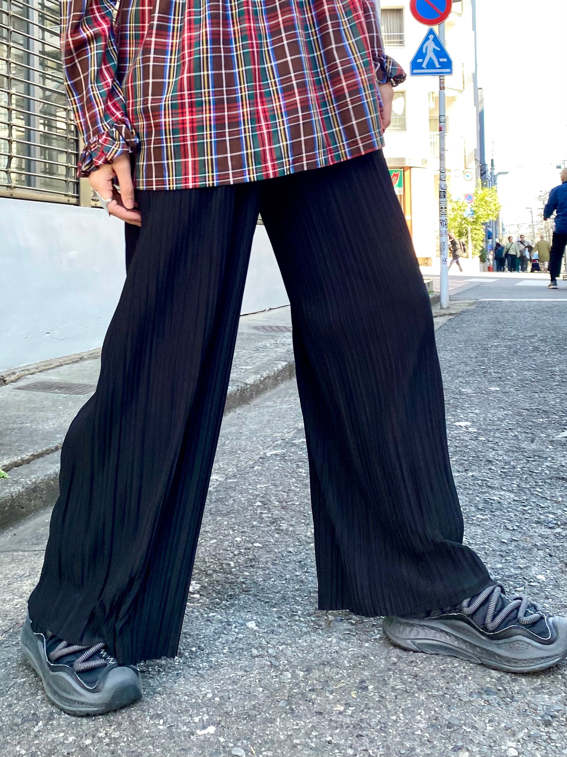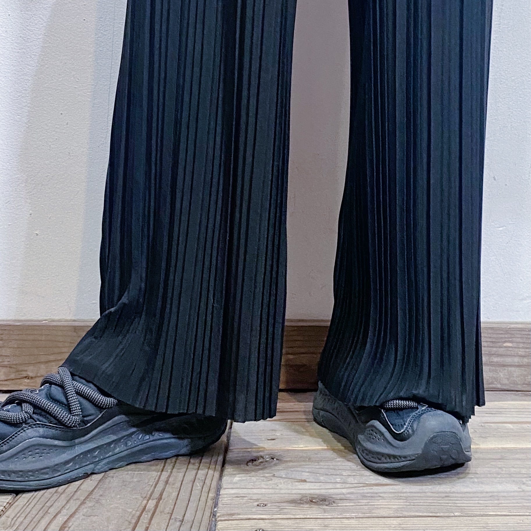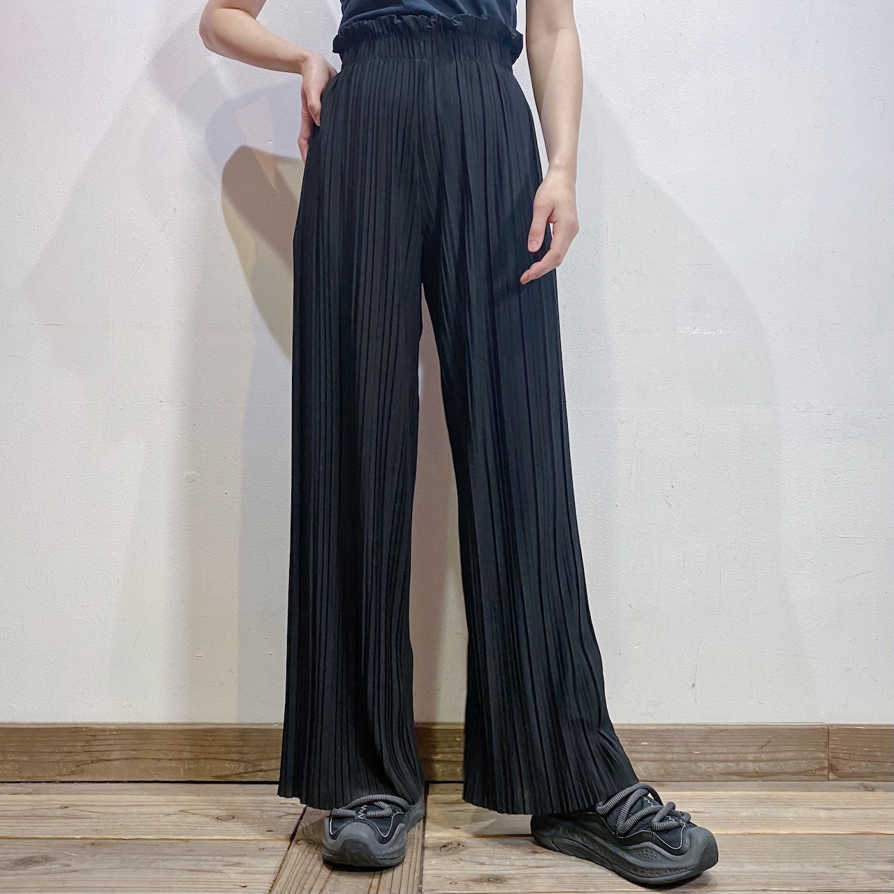 細かいプリーツ加工が施された、伸縮性のある素材感のワイドパンツです。